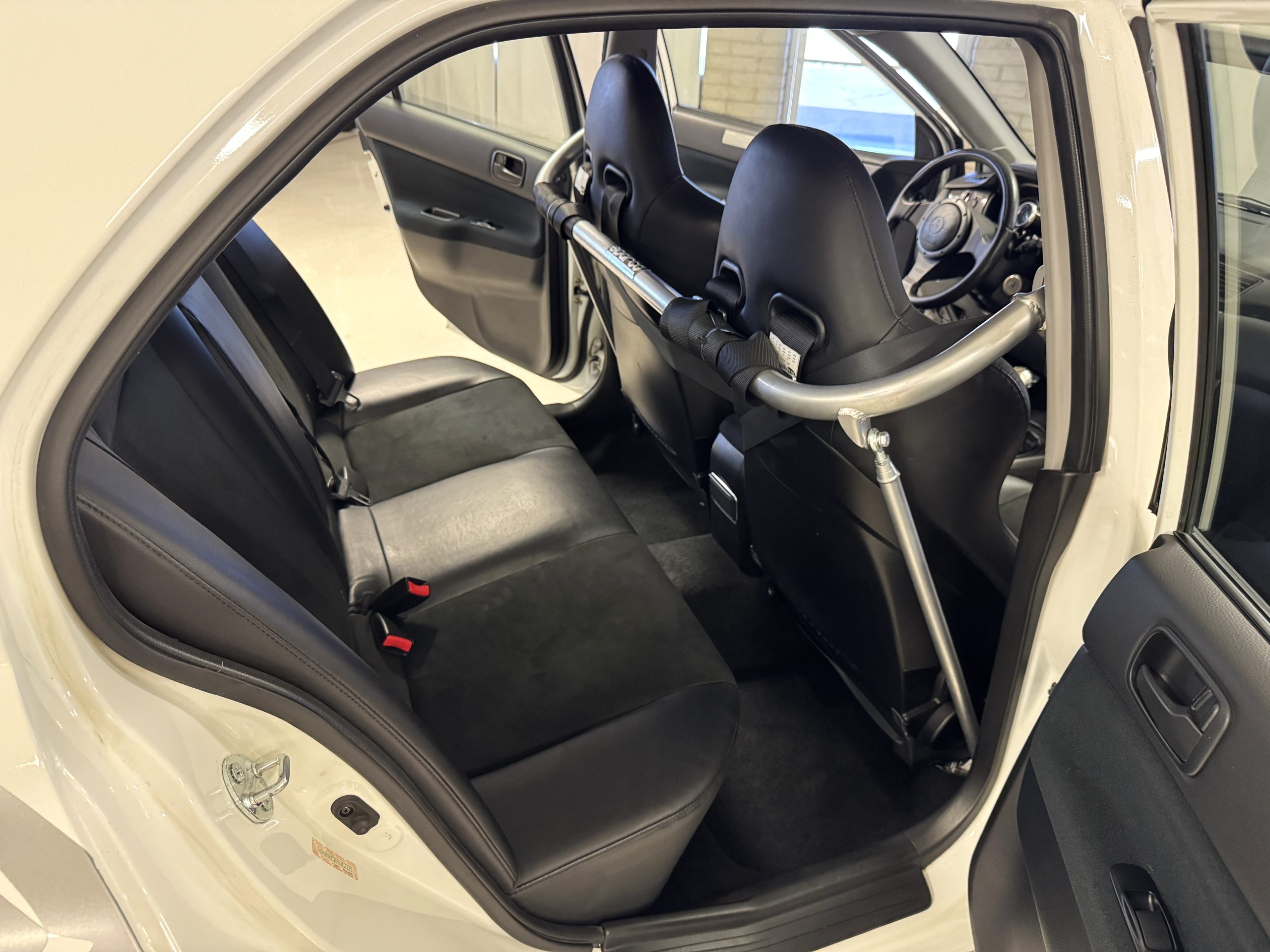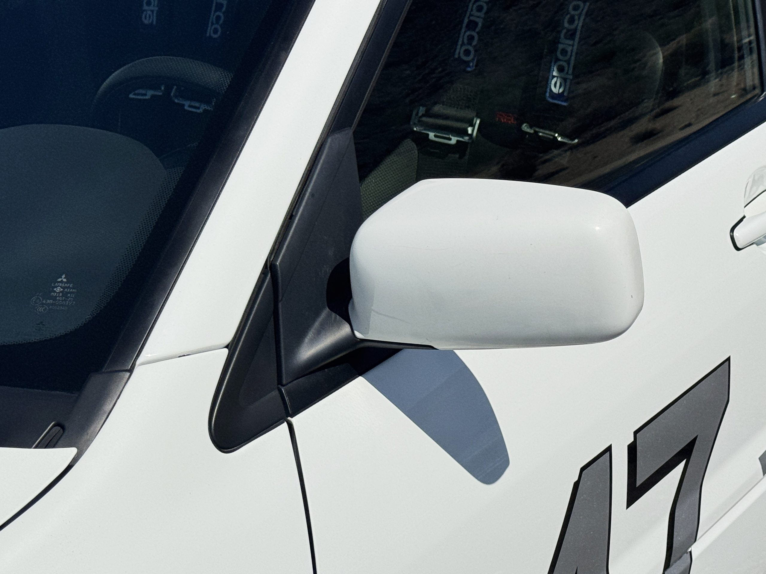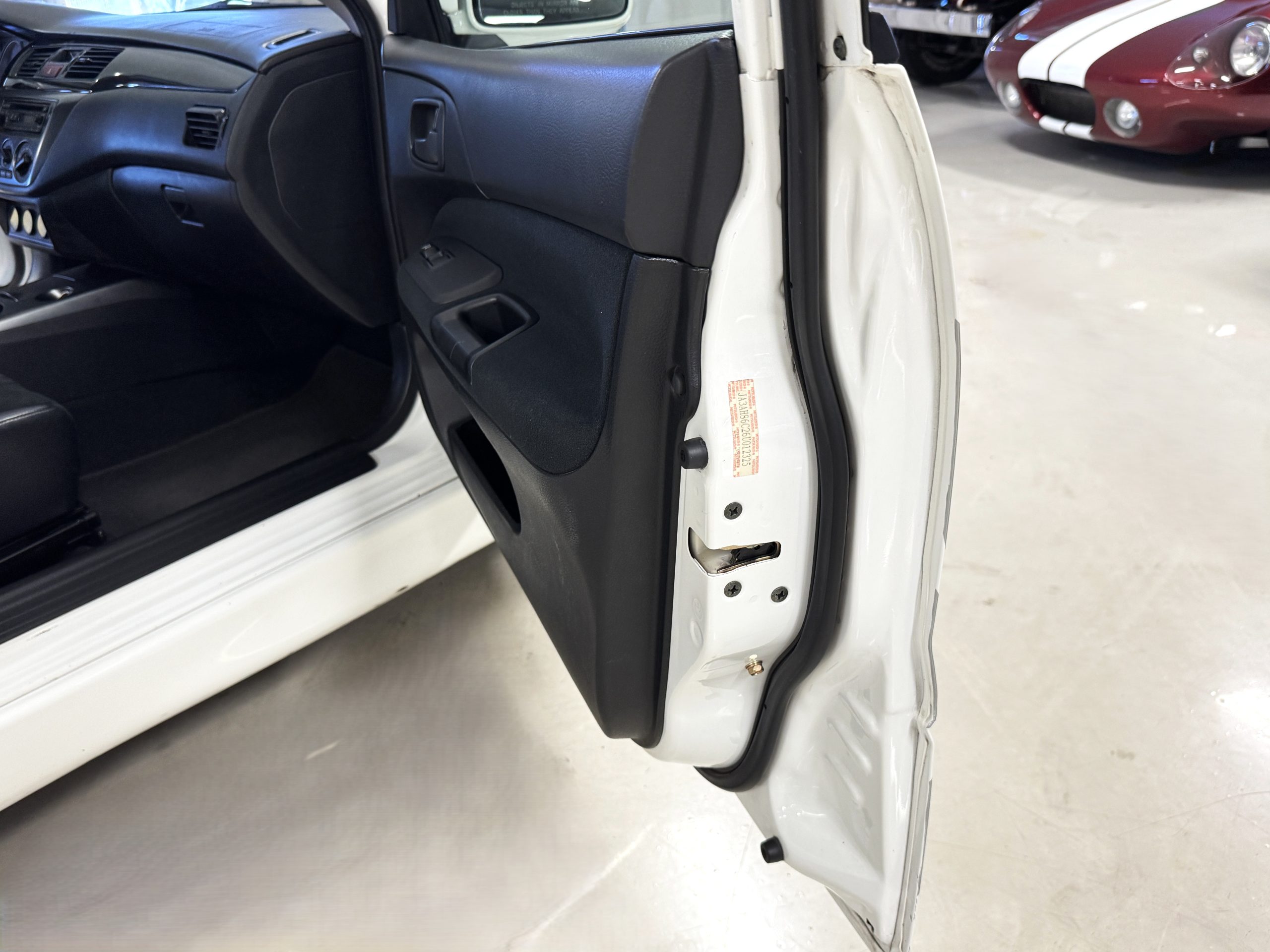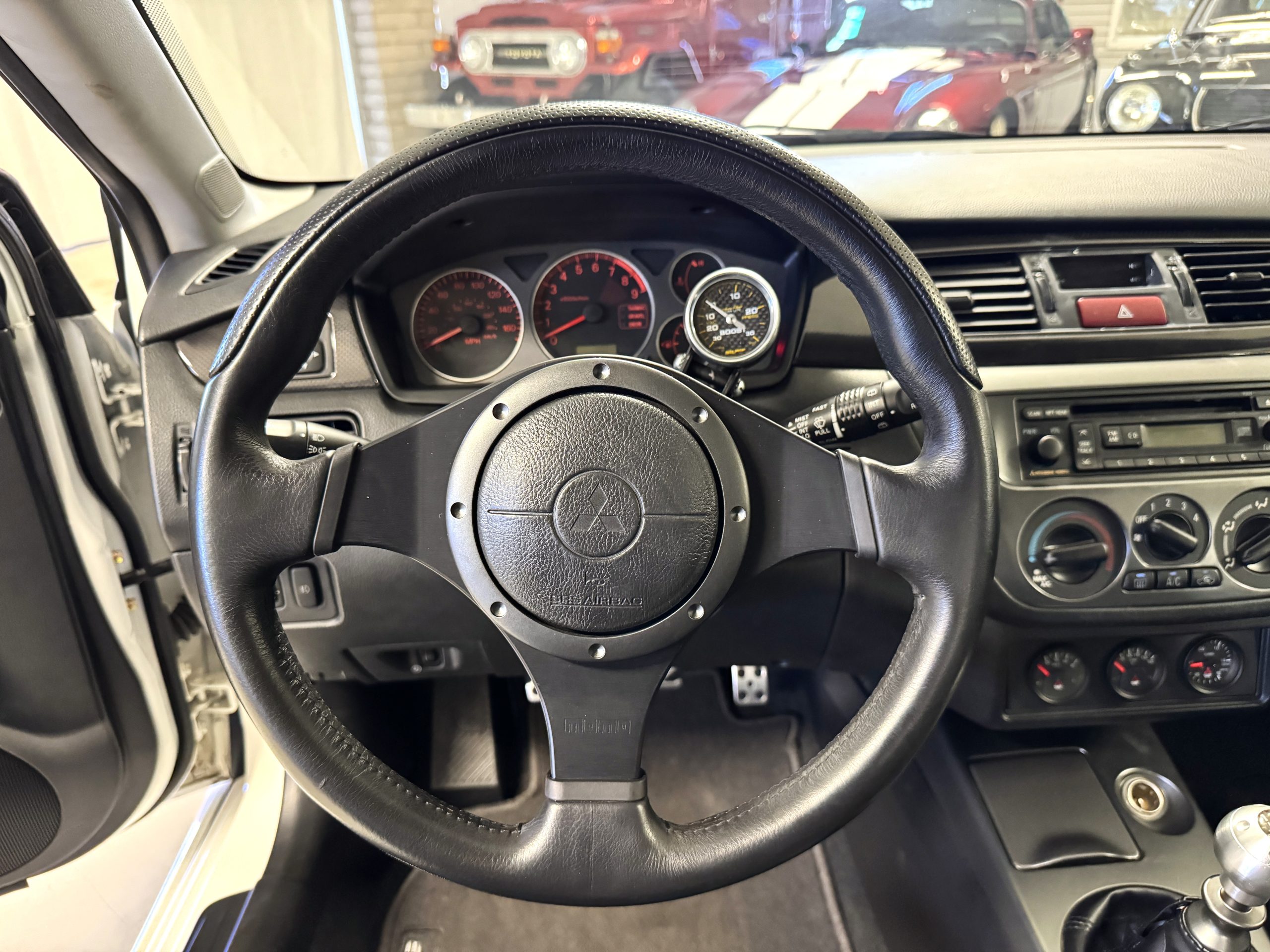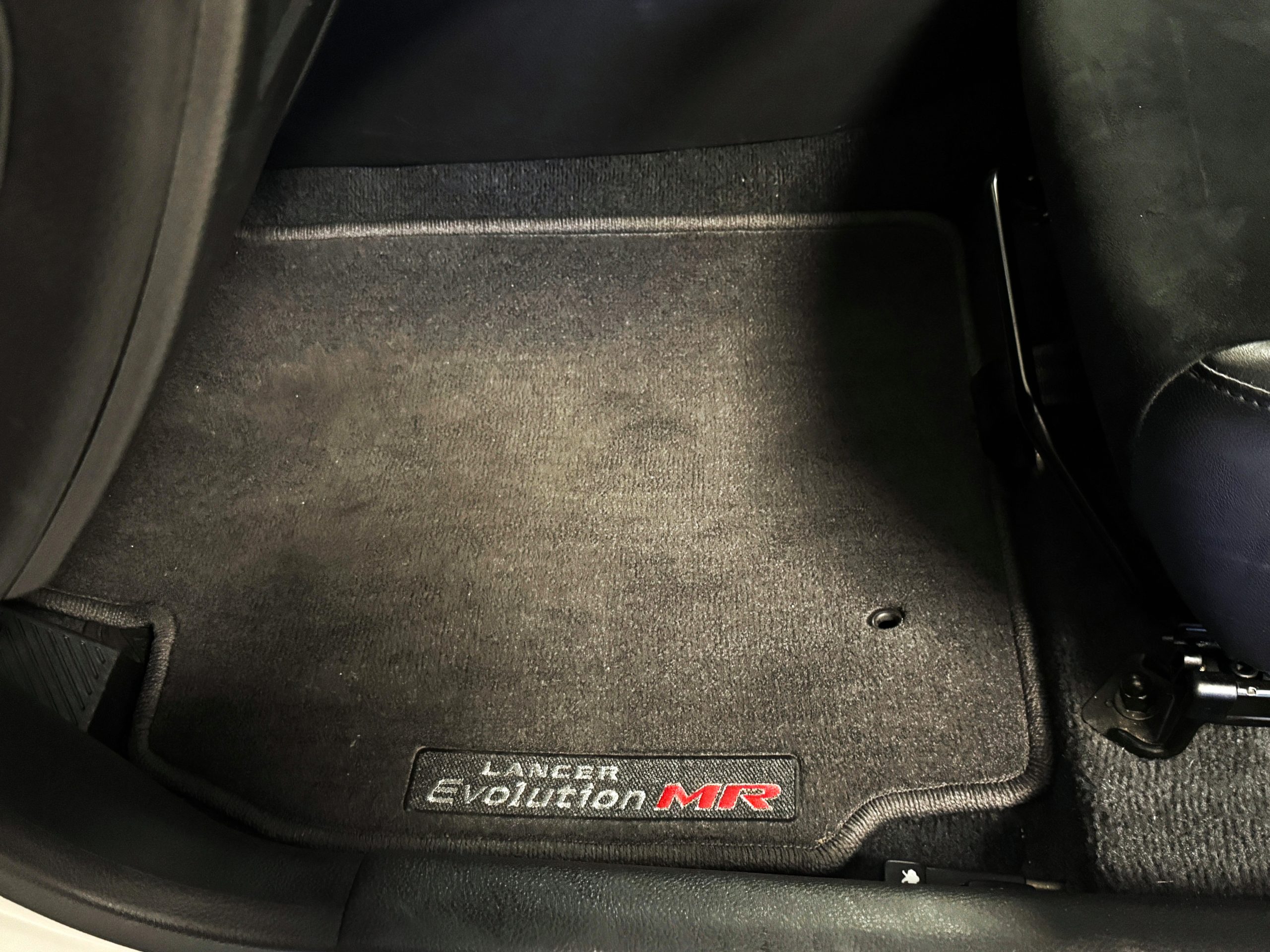 The exterior of the Lancer Evolution remains in its original Wicked White finish, with gray feather pattern racing stripes and a distinctive block shadow “47” accents, presenting in very good overall condition with minimal wear consistent with careful use. The power windows, locks and mirrors with remote keyless entry system add modern usability to this model. Notable enhancements include a carbon fiber front lip, vortex generator, boost gauge kit and zero lift kit, paired with 17-inch BBS forged alloy wheels mounted with fresh tires. The paint, trim, and carbon fiber components are in excellent order, and the car retains its aggressive, purposeful appearance while maintaining roadworthiness.