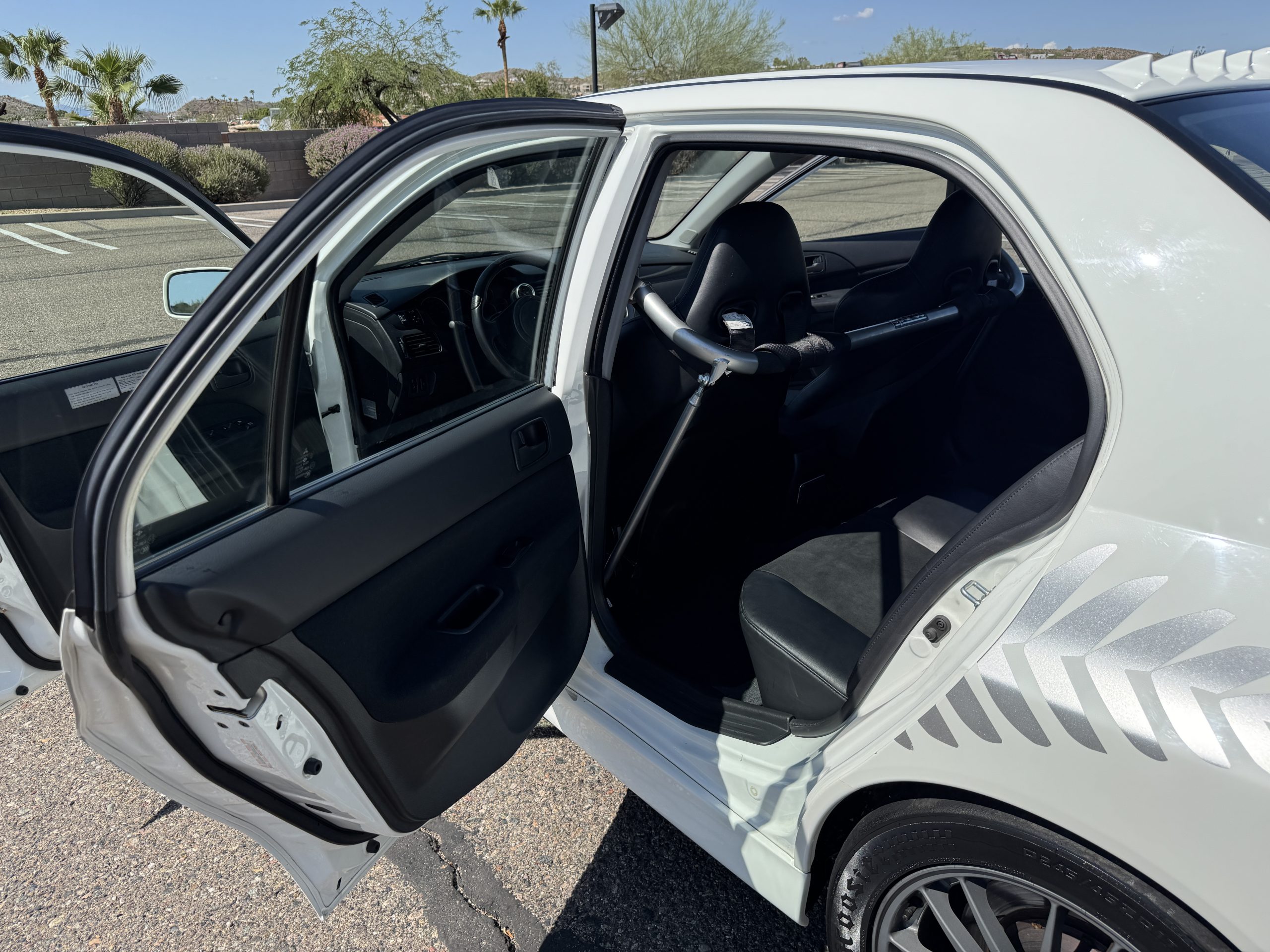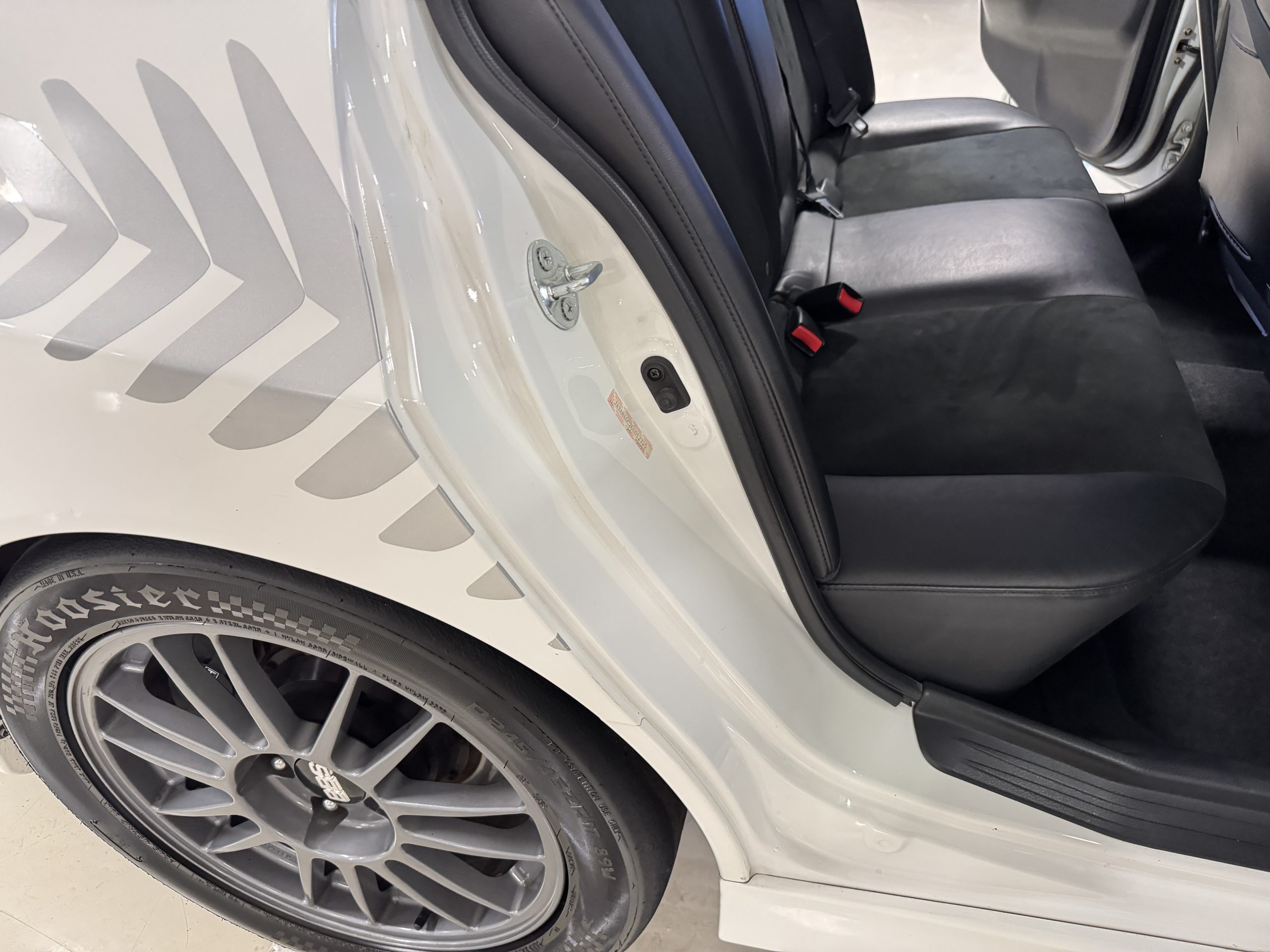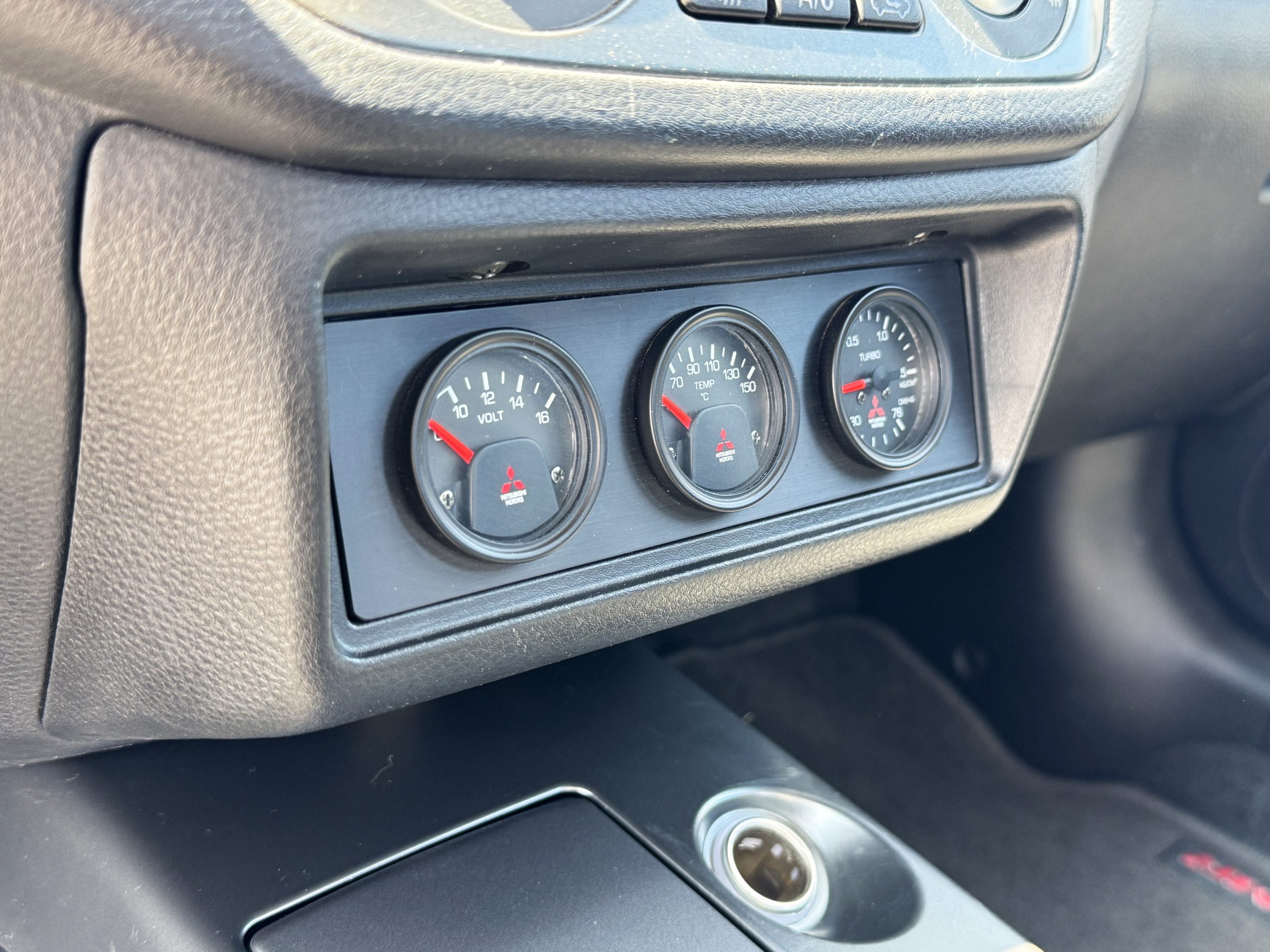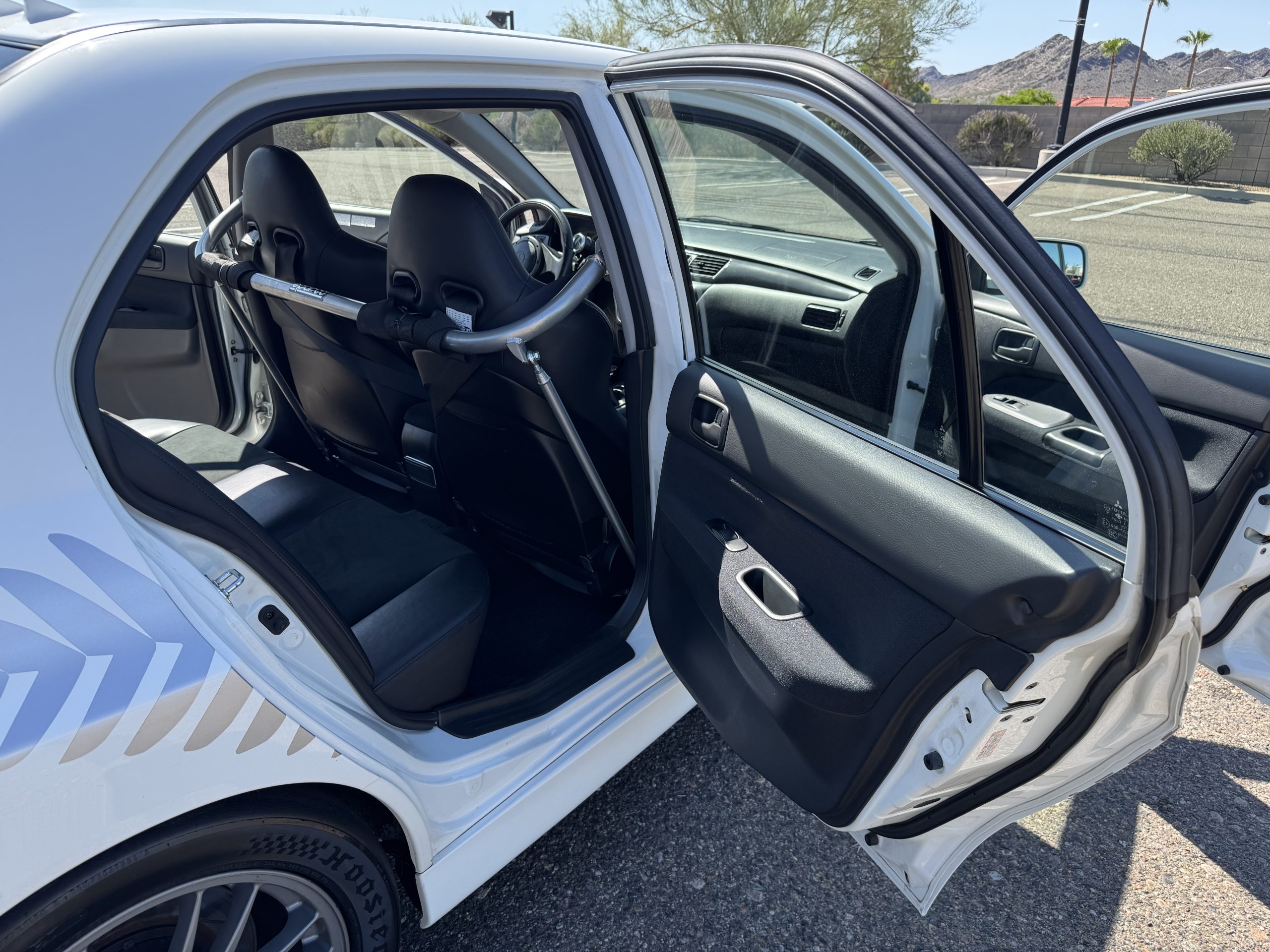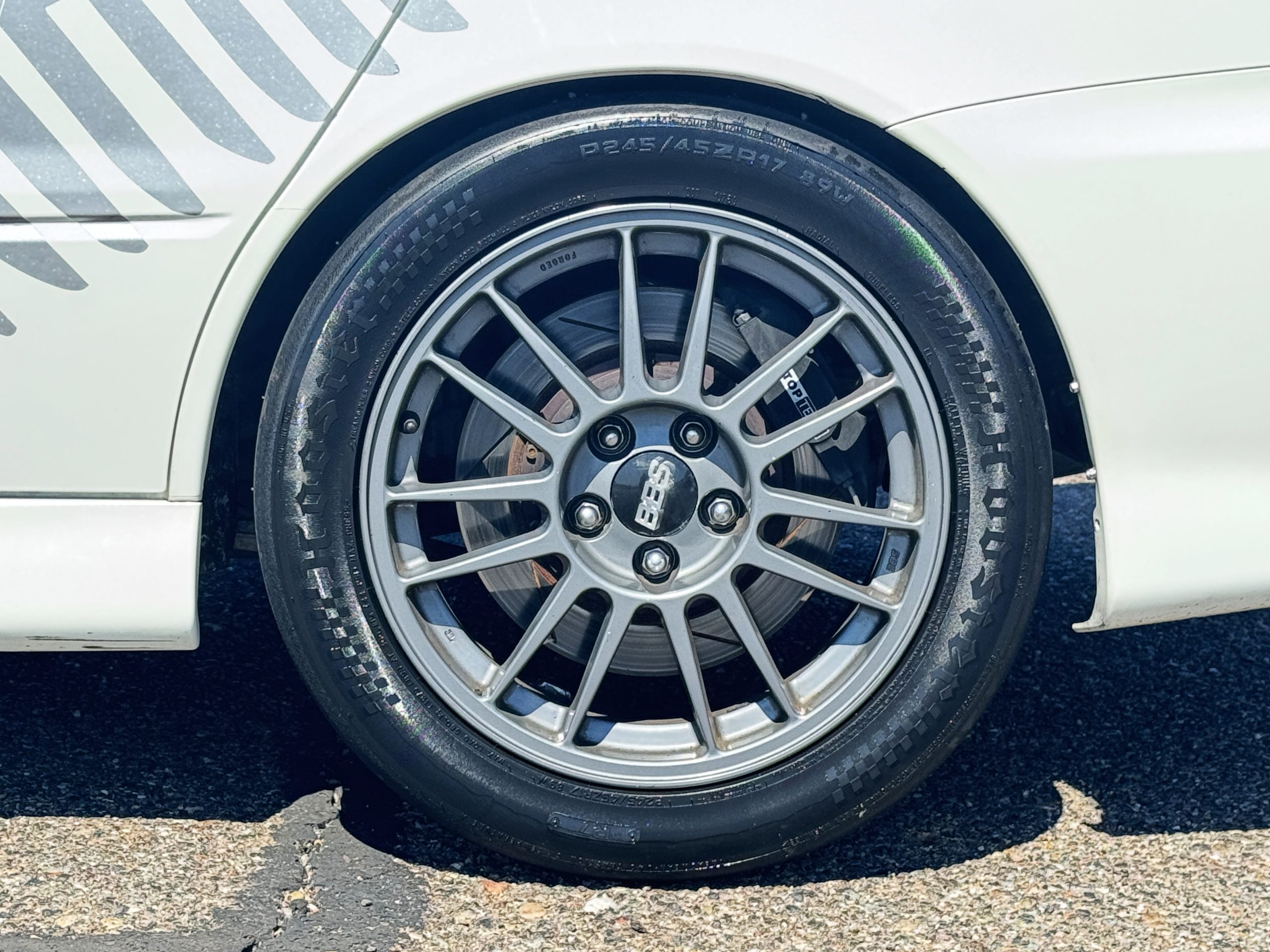 The exterior of the Lancer Evolution remains in its original Wicked White finish, with gray feather pattern racing stripes and a distinctive block shadow “47” accents, presenting in very good overall condition with minimal wear consistent with careful use. The power windows, locks and mirrors with remote keyless entry system add modern usability to this model. Notable enhancements include a carbon fiber front lip, vortex generator, boost gauge kit and zero lift kit, paired with 17-inch BBS forged alloy wheels mounted with fresh tires. The paint, trim, and carbon fiber components are in excellent order, and the car retains its aggressive, purposeful appearance while maintaining roadworthiness.