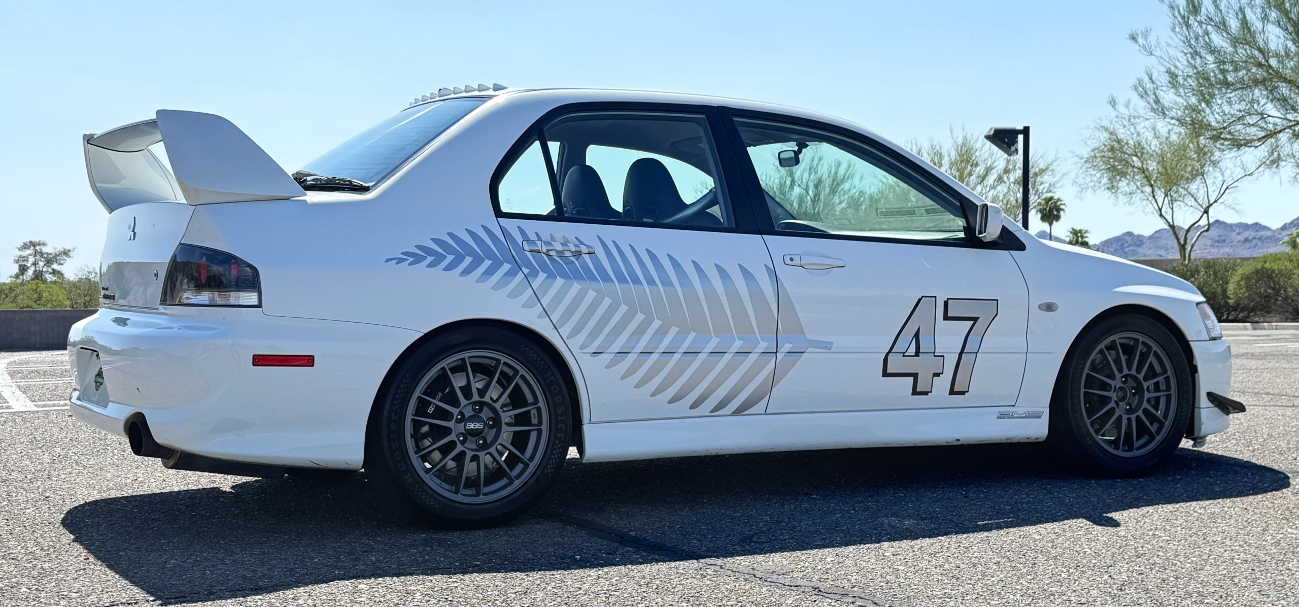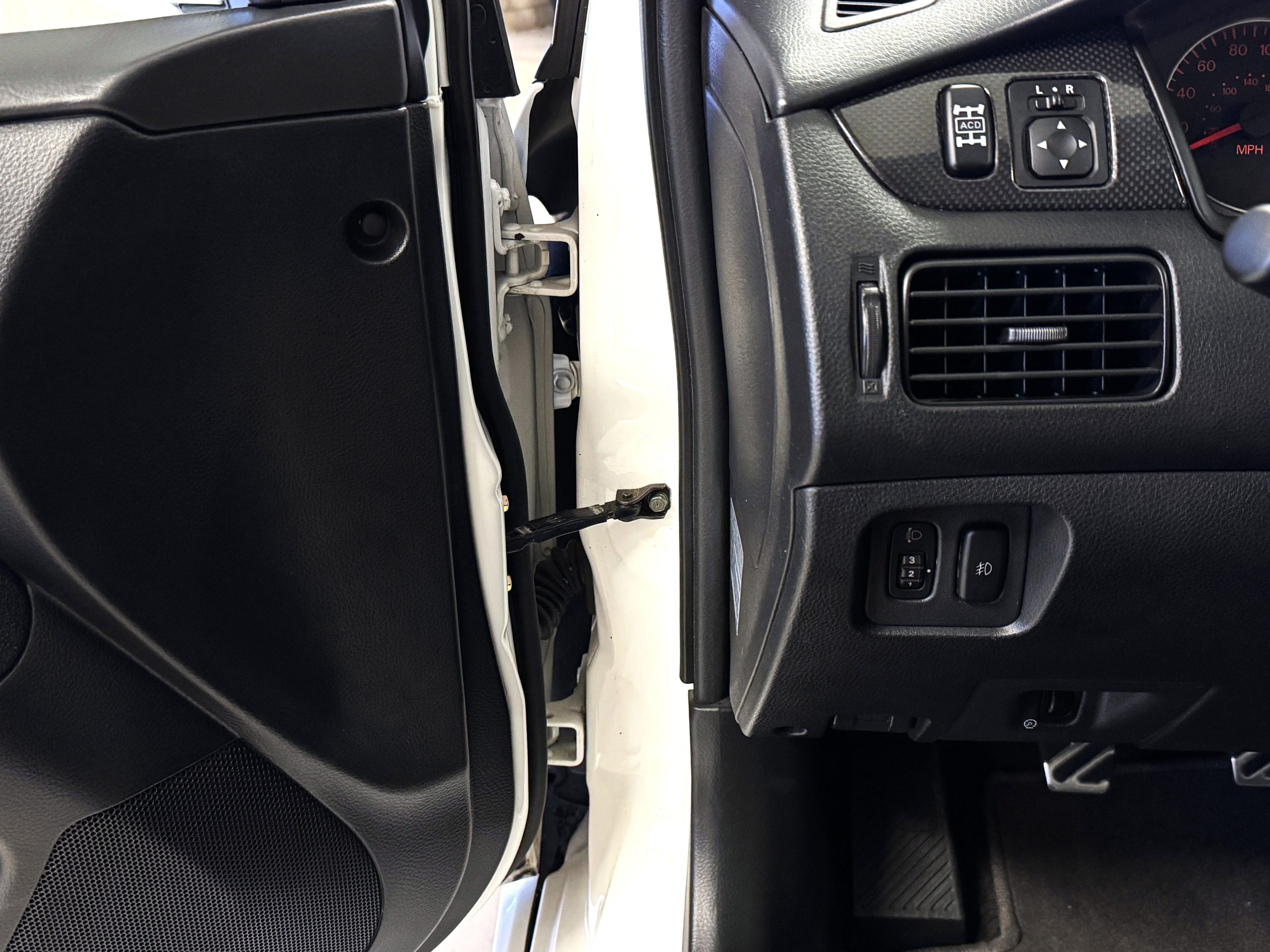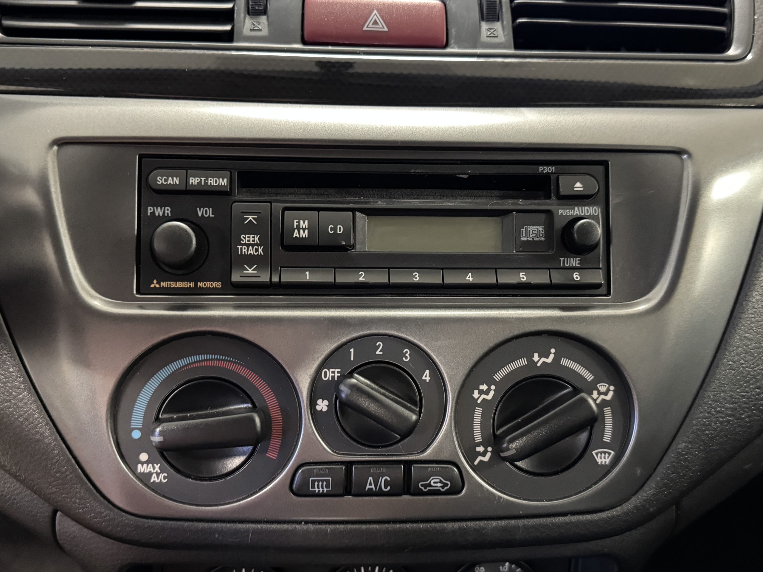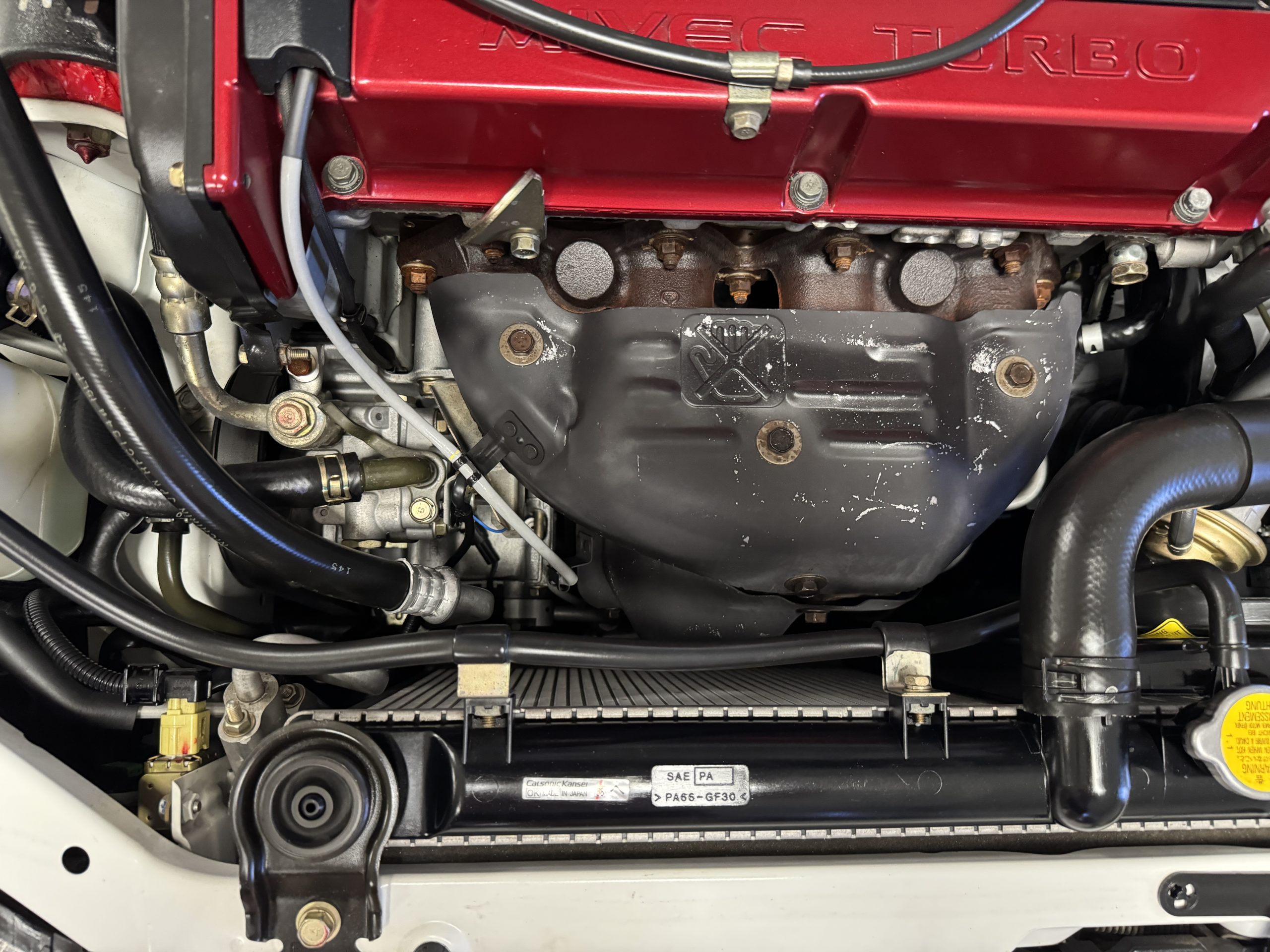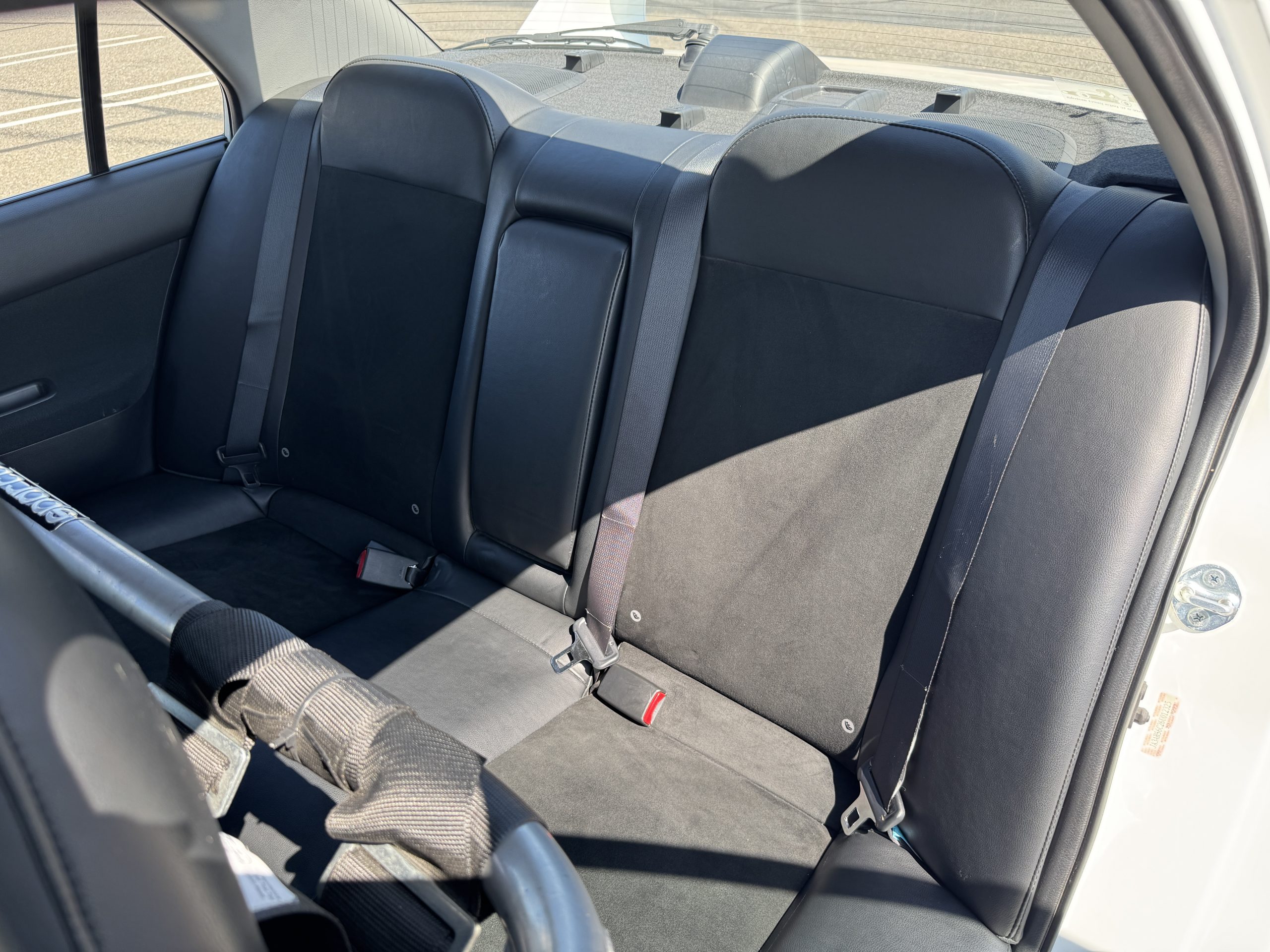 The exterior of the Lancer Evolution remains in its original Wicked White finish, with gray feather pattern racing stripes and a distinctive block shadow “47” accents, presenting in very good overall condition with minimal wear consistent with careful use. The power windows, locks and mirrors with remote keyless entry system add modern usability to this model. Notable enhancements include a carbon fiber front lip, vortex generator, boost gauge kit and zero lift kit, paired with 17-inch BBS forged alloy wheels mounted with fresh tires. The paint, trim, and carbon fiber components are in excellent order, and the car retains its aggressive, purposeful appearance while maintaining roadworthiness.