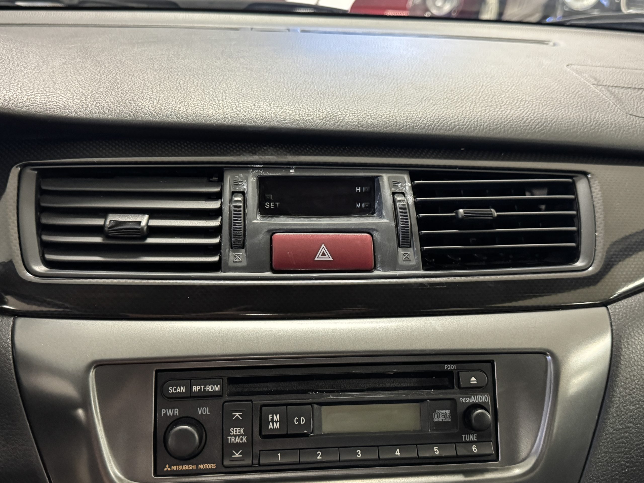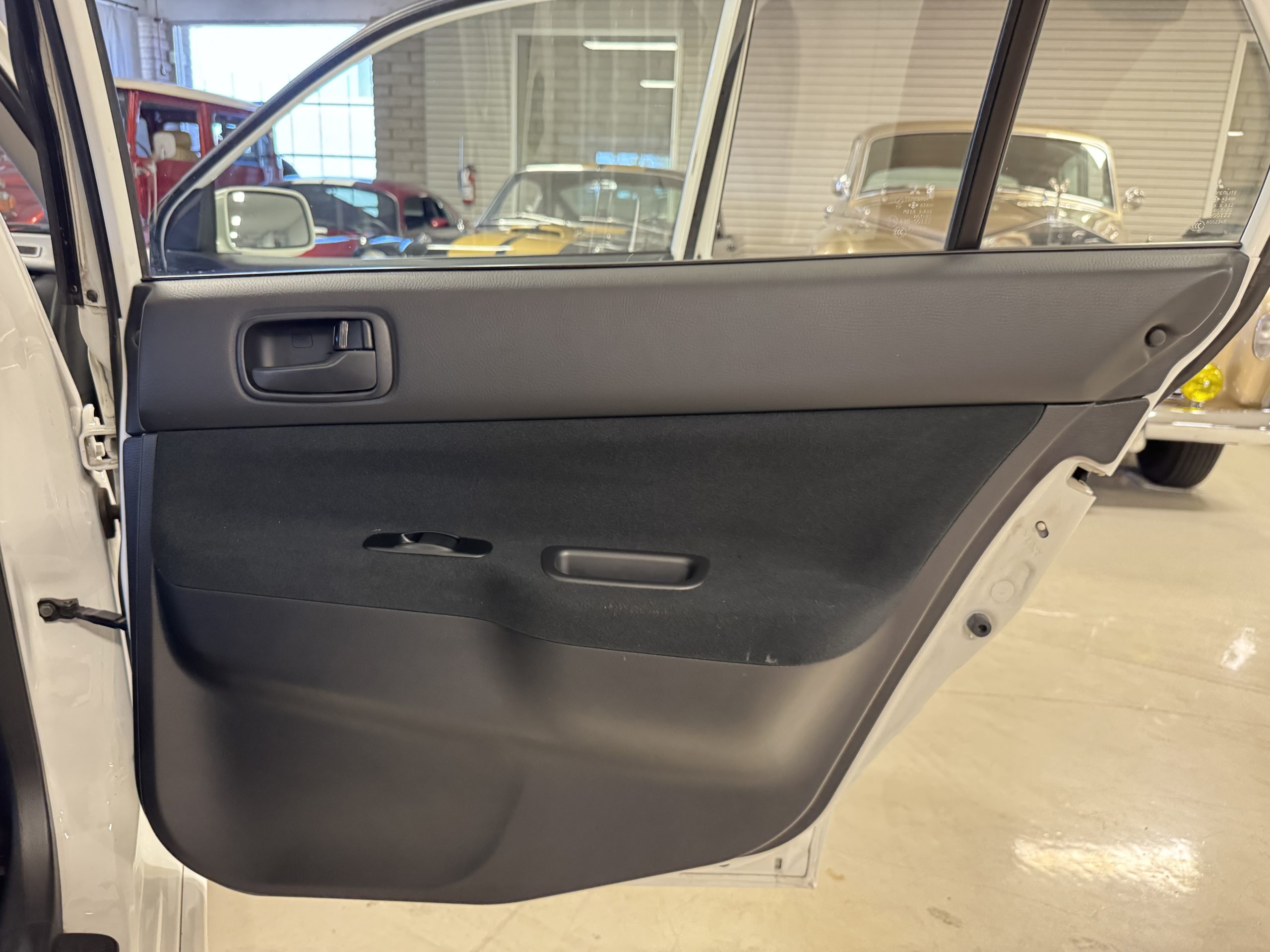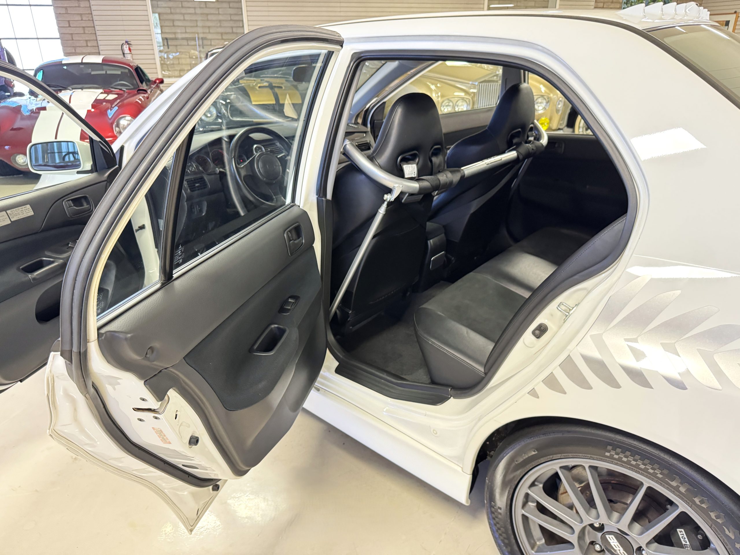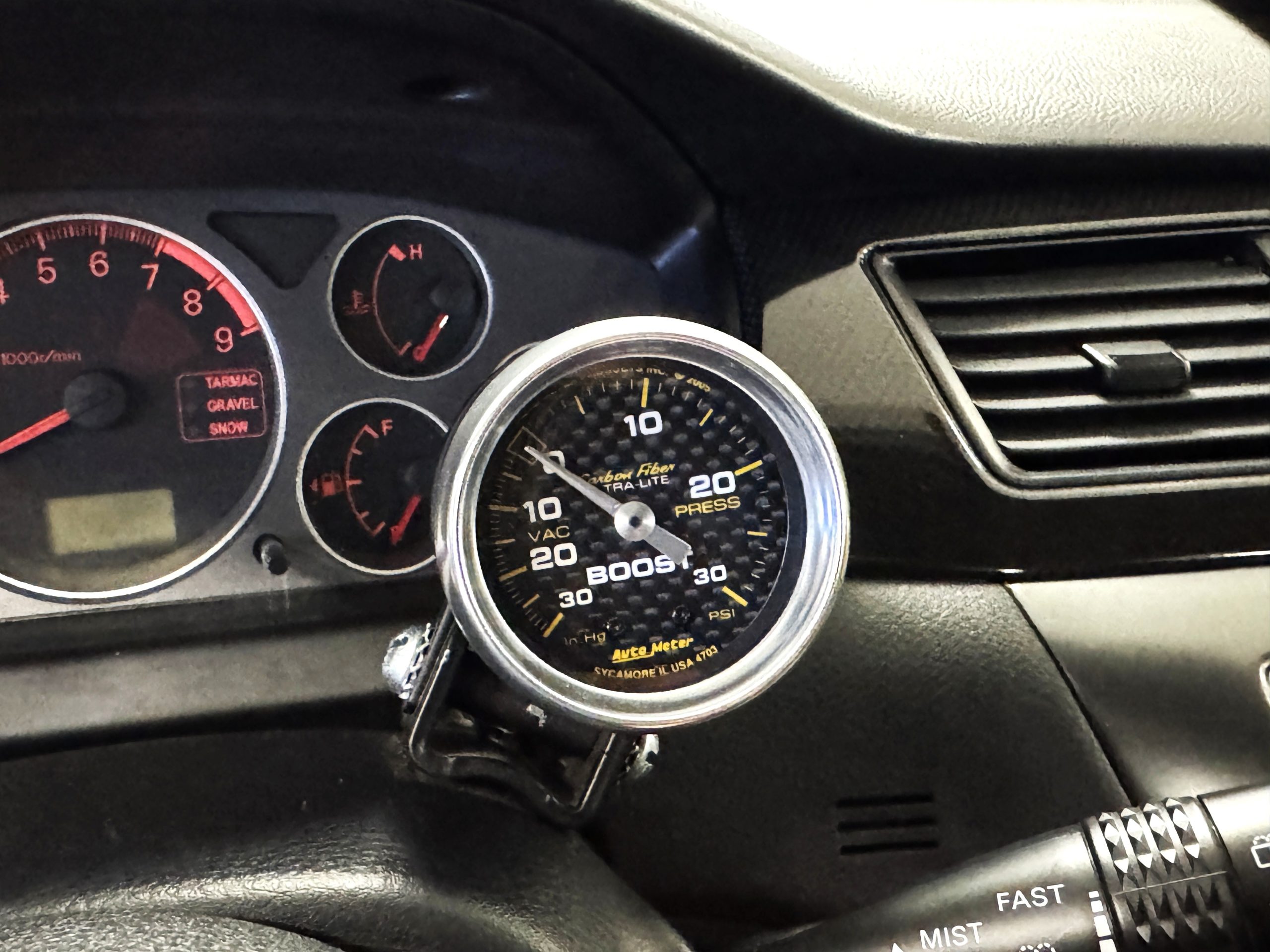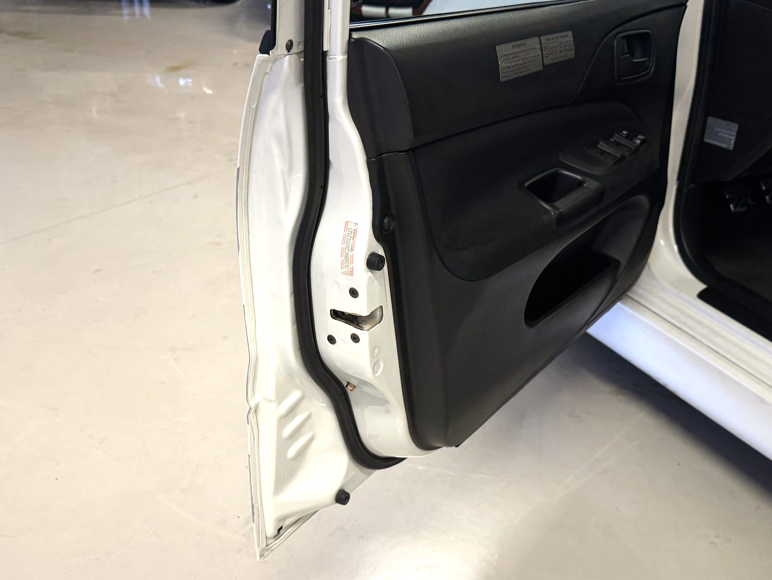 The exterior of the Lancer Evolution remains in its original Wicked White finish, with gray feather pattern racing stripes and a distinctive block shadow “47” accents, presenting in very good overall condition with minimal wear consistent with careful use. The power windows, locks and mirrors with remote keyless entry system add modern usability to this model. Notable enhancements include a carbon fiber front lip, vortex generator, boost gauge kit and zero lift kit, paired with 17-inch BBS forged alloy wheels mounted with fresh tires. The paint, trim, and carbon fiber components are in excellent order, and the car retains its aggressive, purposeful appearance while maintaining roadworthiness.
