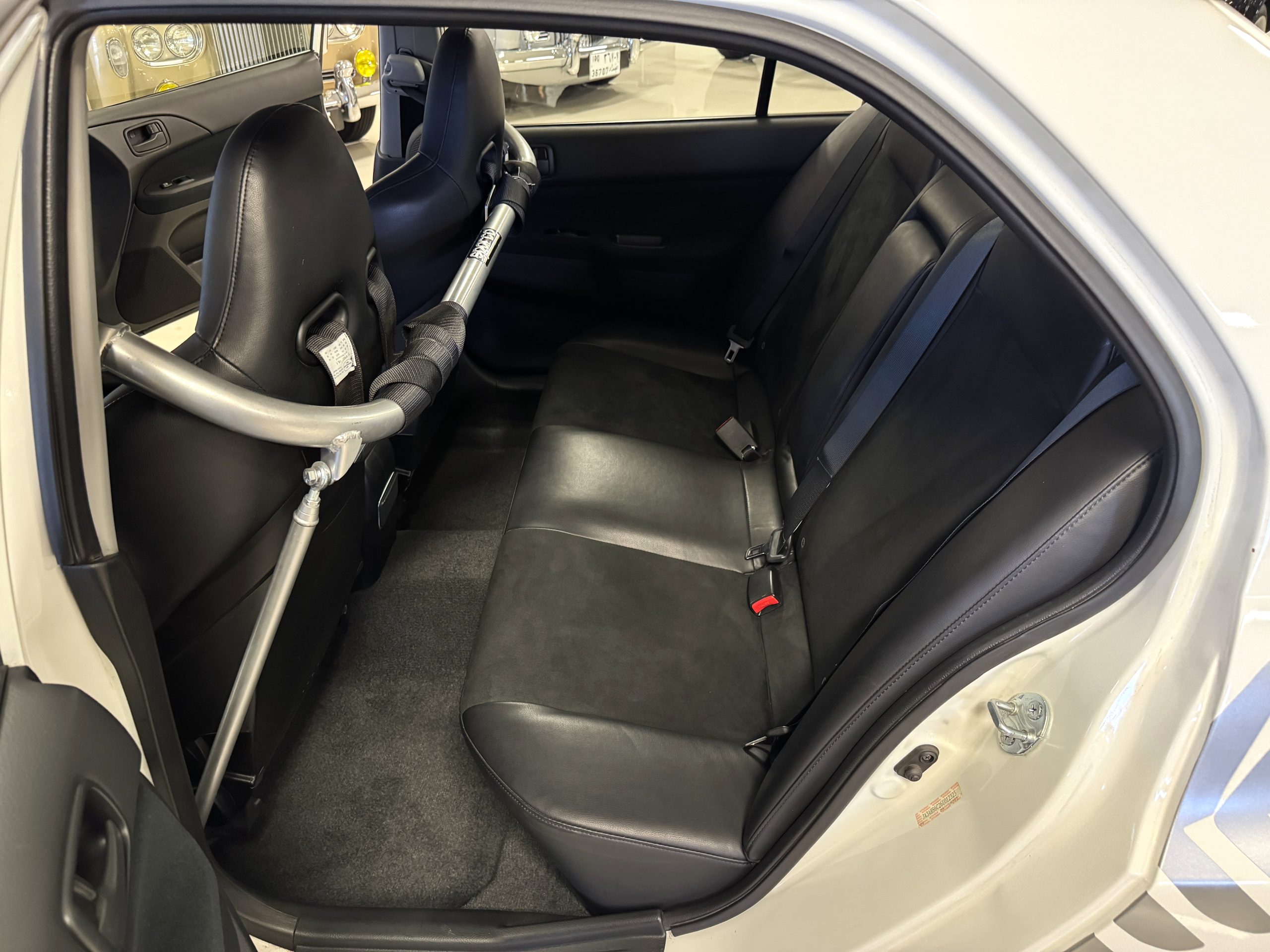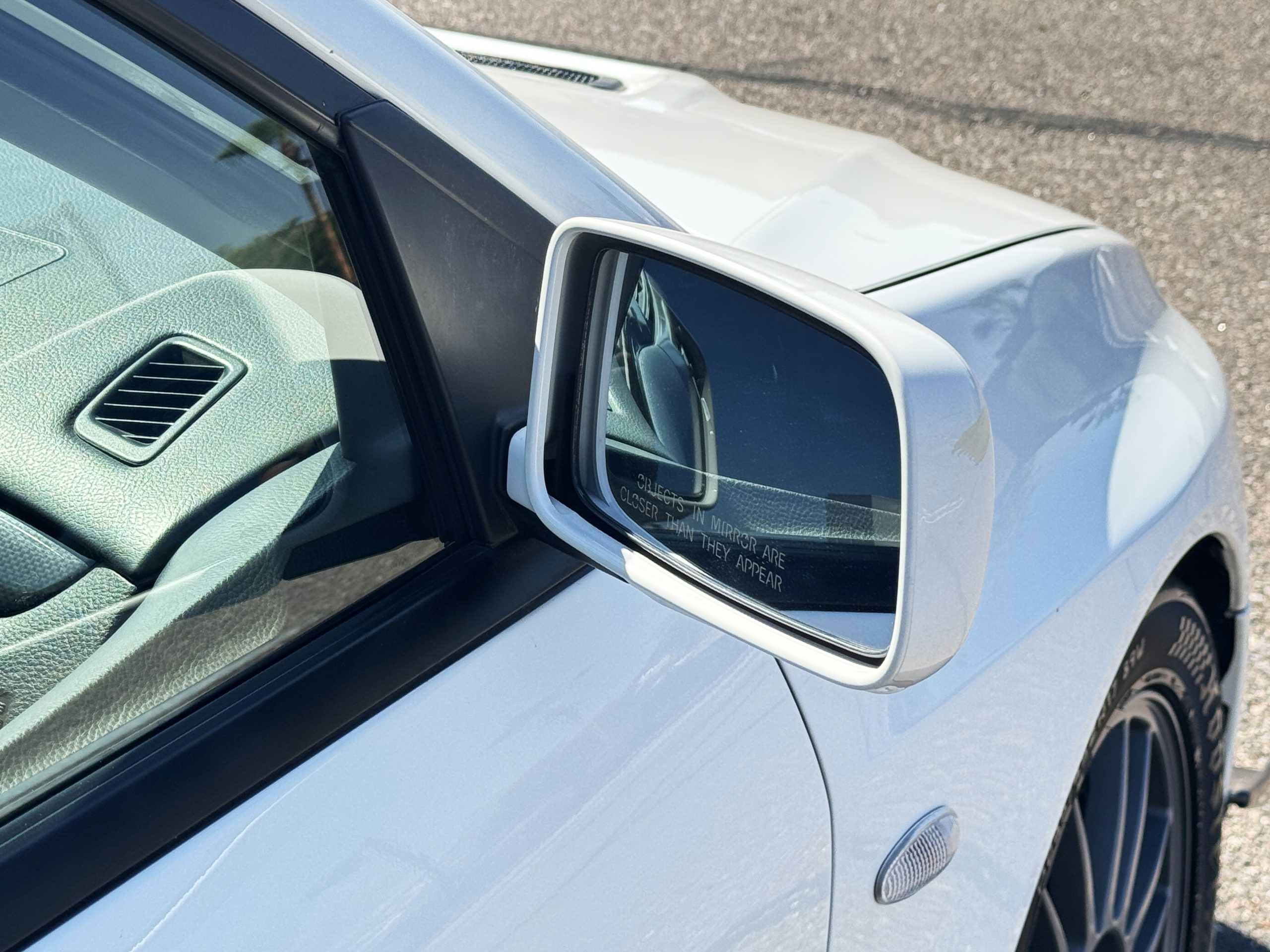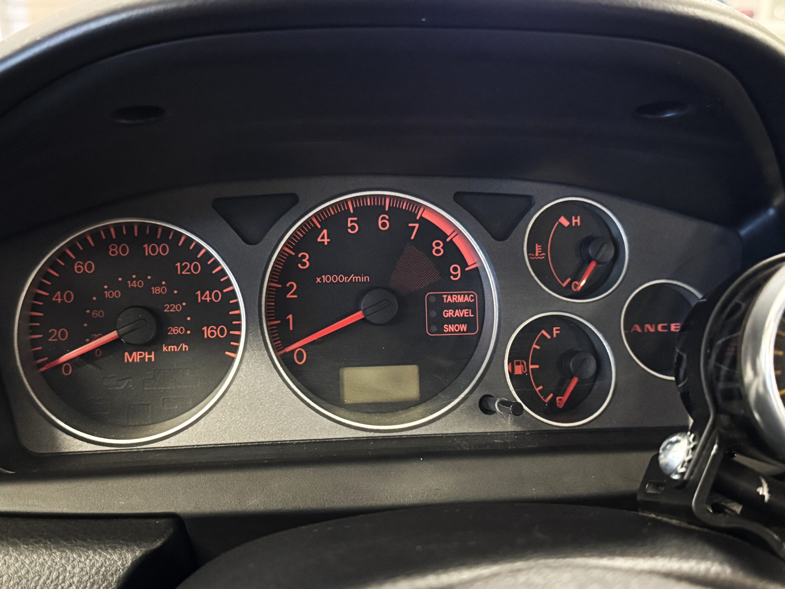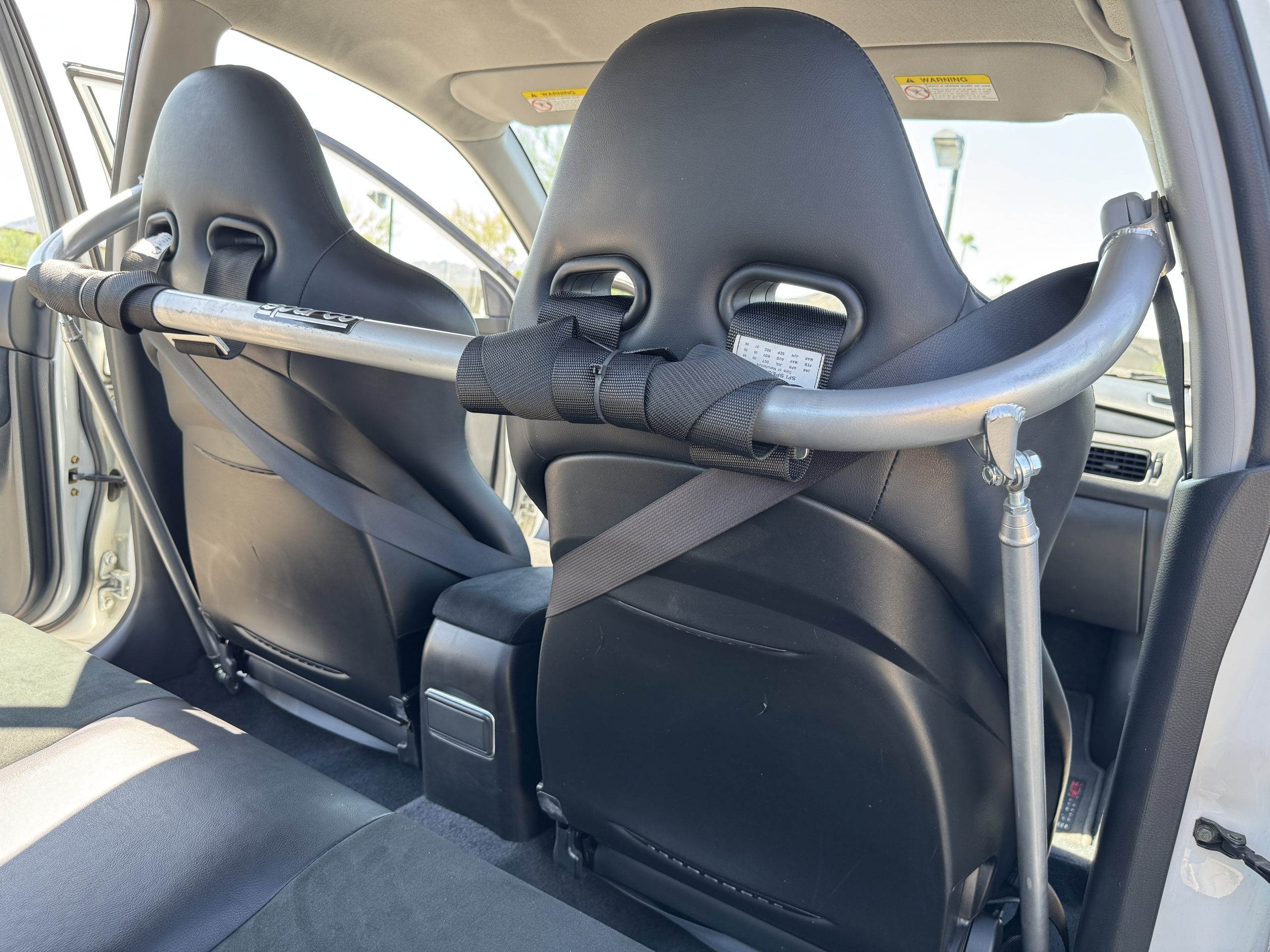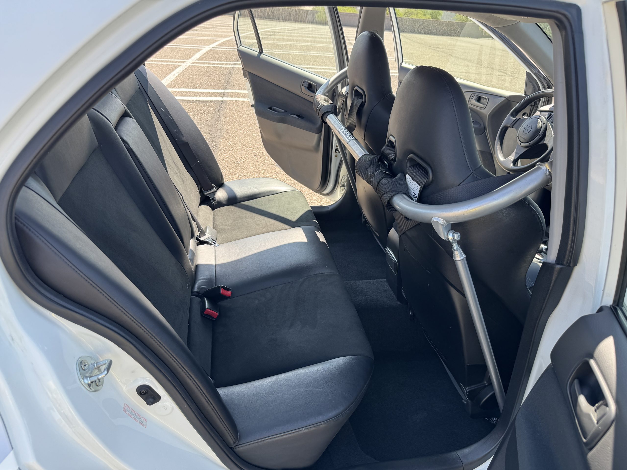 The exterior of the Lancer Evolution remains in its original Wicked White finish, with gray feather pattern racing stripes and a distinctive block shadow “47” accents, presenting in very good overall condition with minimal wear consistent with careful use. The power windows, locks and mirrors with remote keyless entry system add modern usability to this model. Notable enhancements include a carbon fiber front lip, vortex generator, boost gauge kit and zero lift kit, paired with 17-inch BBS forged alloy wheels mounted with fresh tires. The paint, trim, and carbon fiber components are in excellent order, and the car retains its aggressive, purposeful appearance while maintaining roadworthiness.