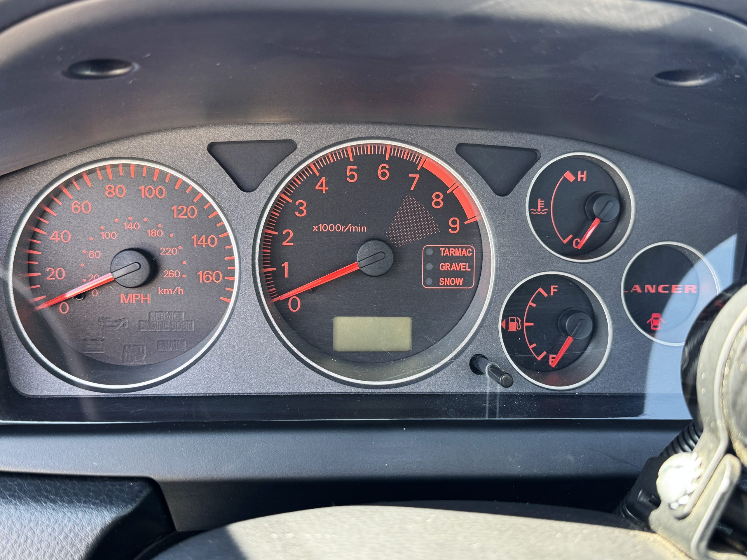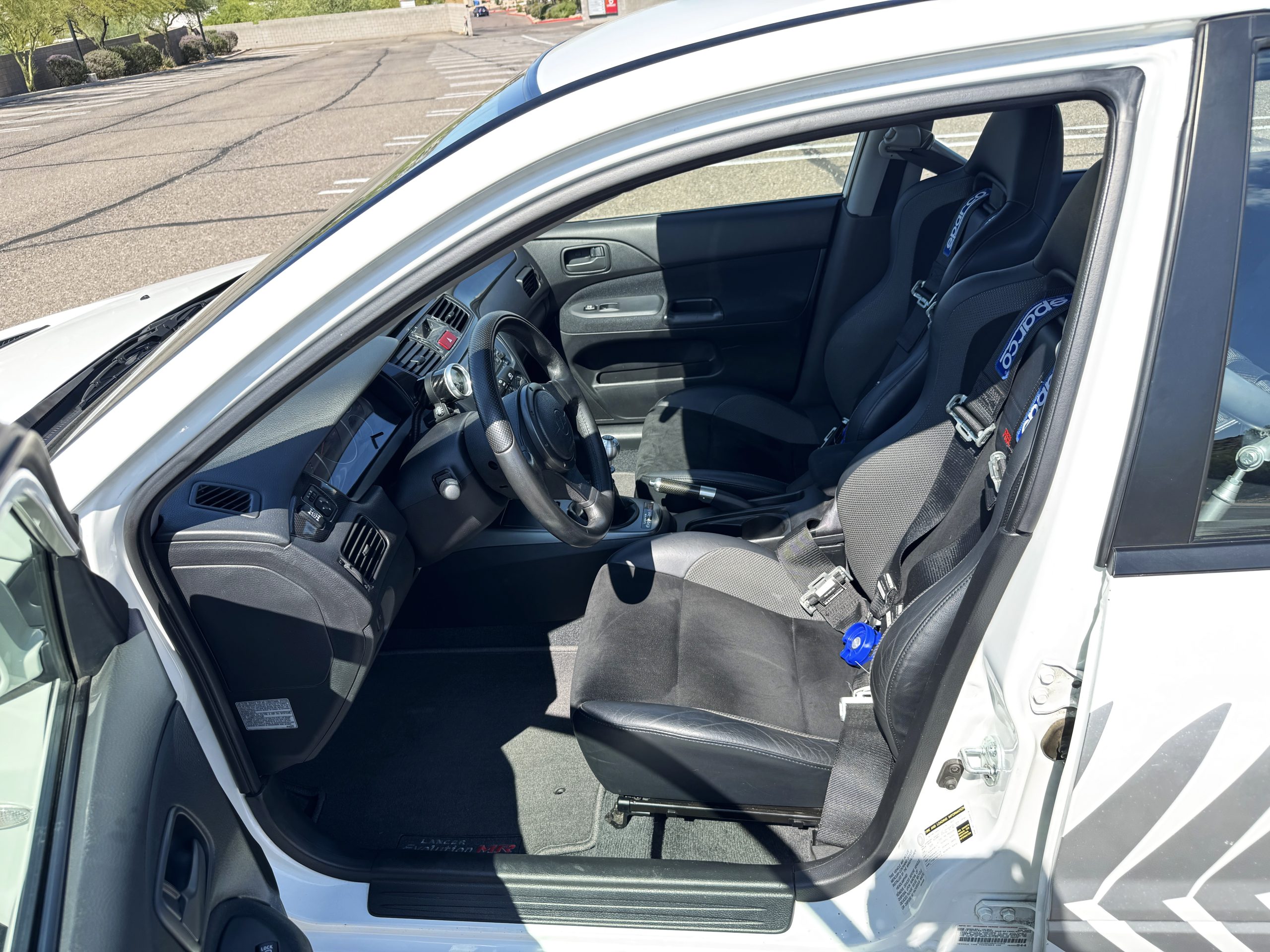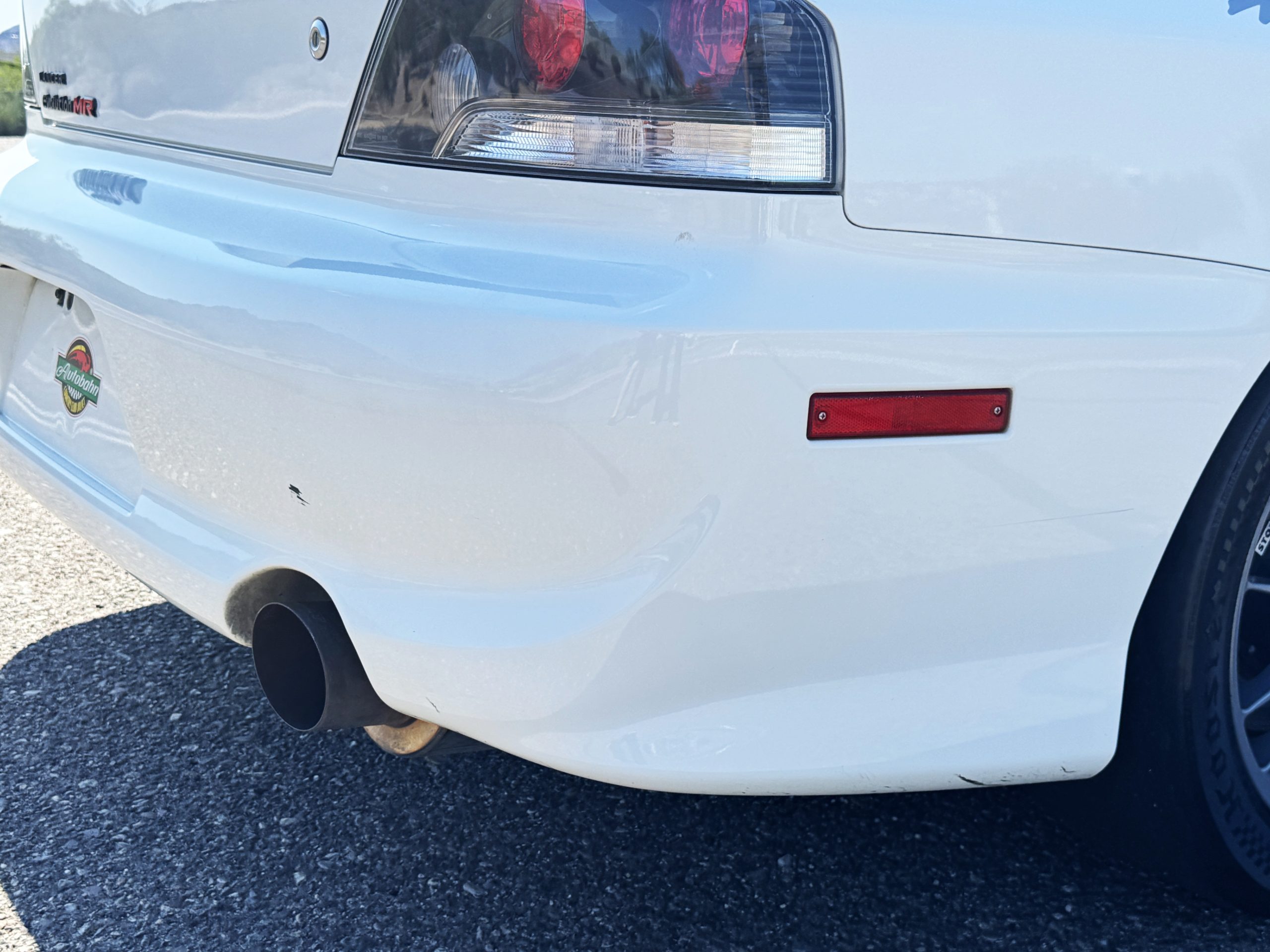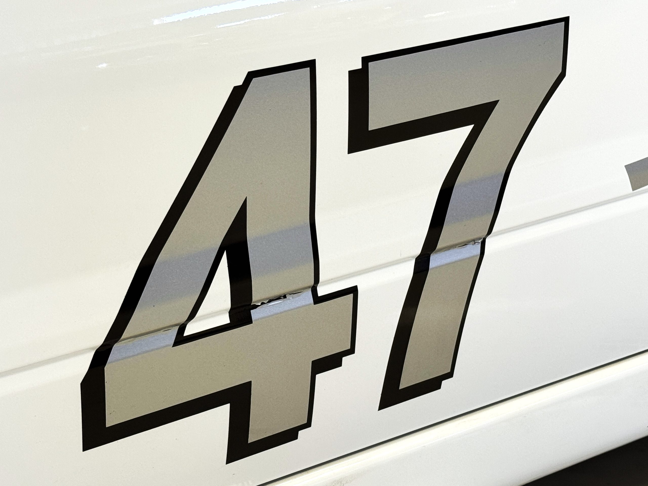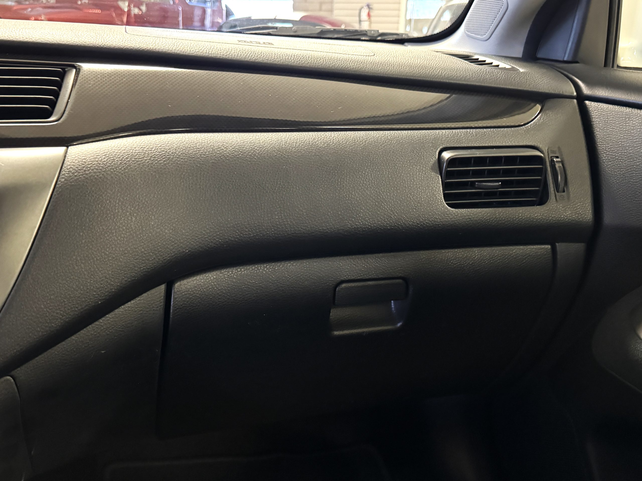 The exterior of the Lancer Evolution remains in its original Wicked White finish, with gray feather pattern racing stripes and a distinctive block shadow “47” accents, presenting in very good overall condition with minimal wear consistent with careful use. The power windows, locks and mirrors with remote keyless entry system add modern usability to this model. Notable enhancements include a carbon fiber front lip, vortex generator, boost gauge kit and zero lift kit, paired with 17-inch BBS forged alloy wheels mounted with fresh tires. The paint, trim, and carbon fiber components are in excellent order, and the car retains its aggressive, purposeful appearance while maintaining roadworthiness.