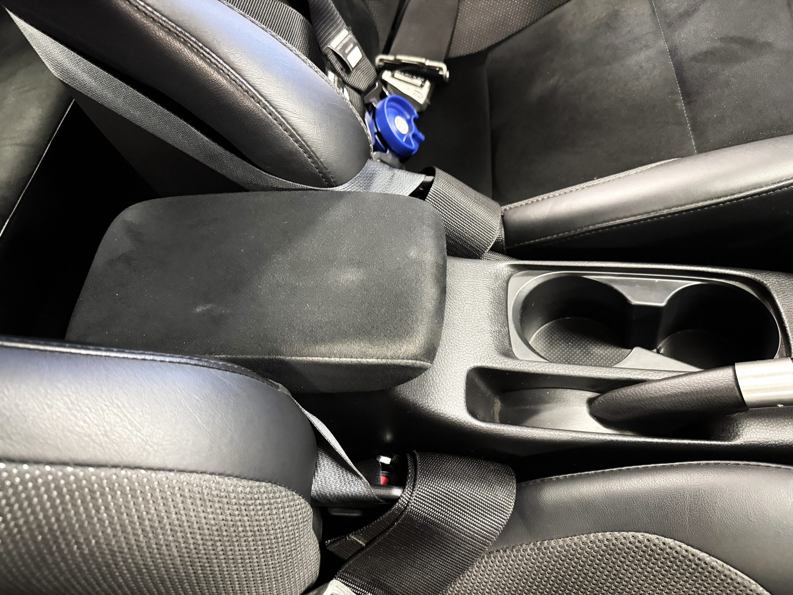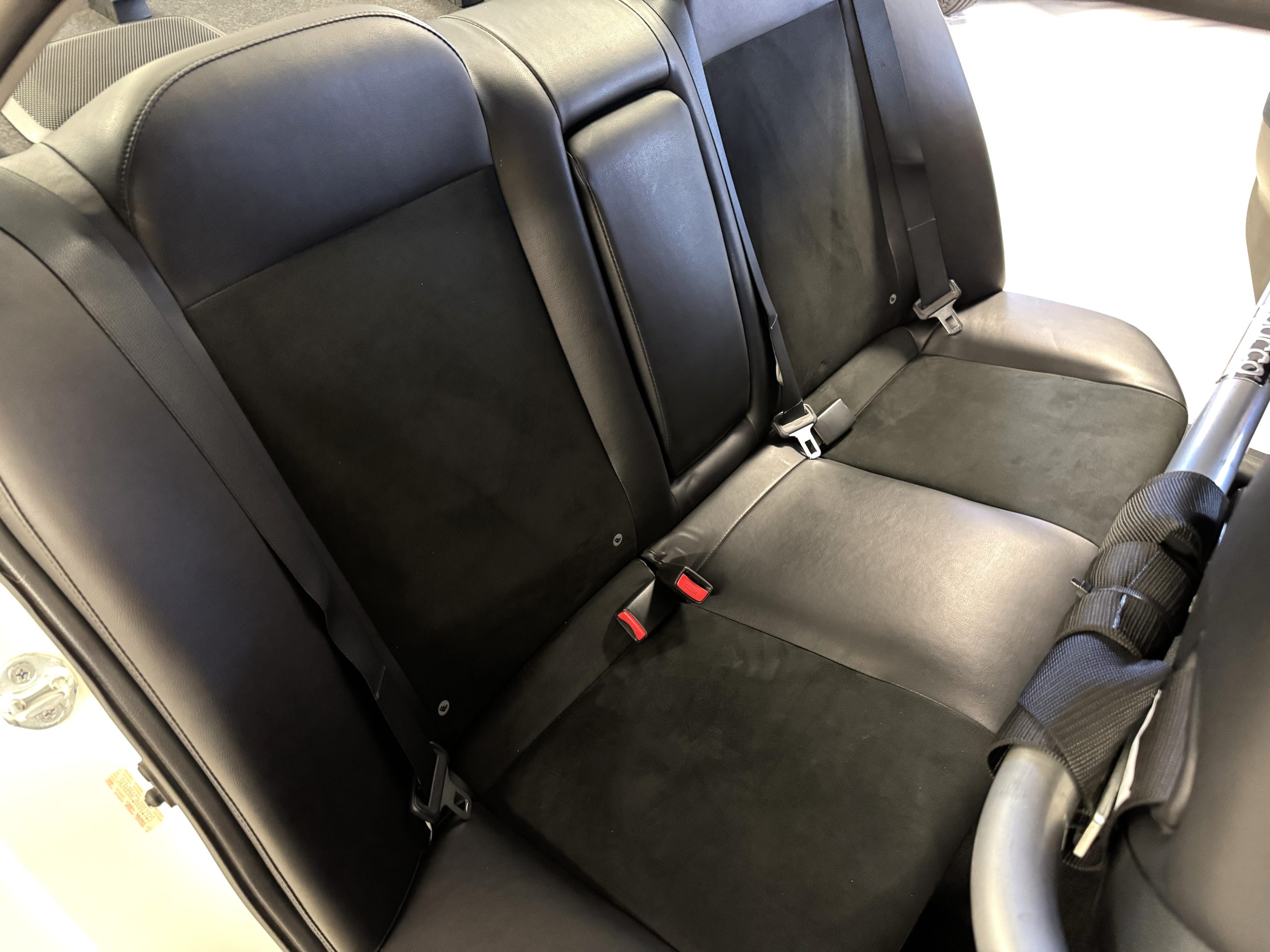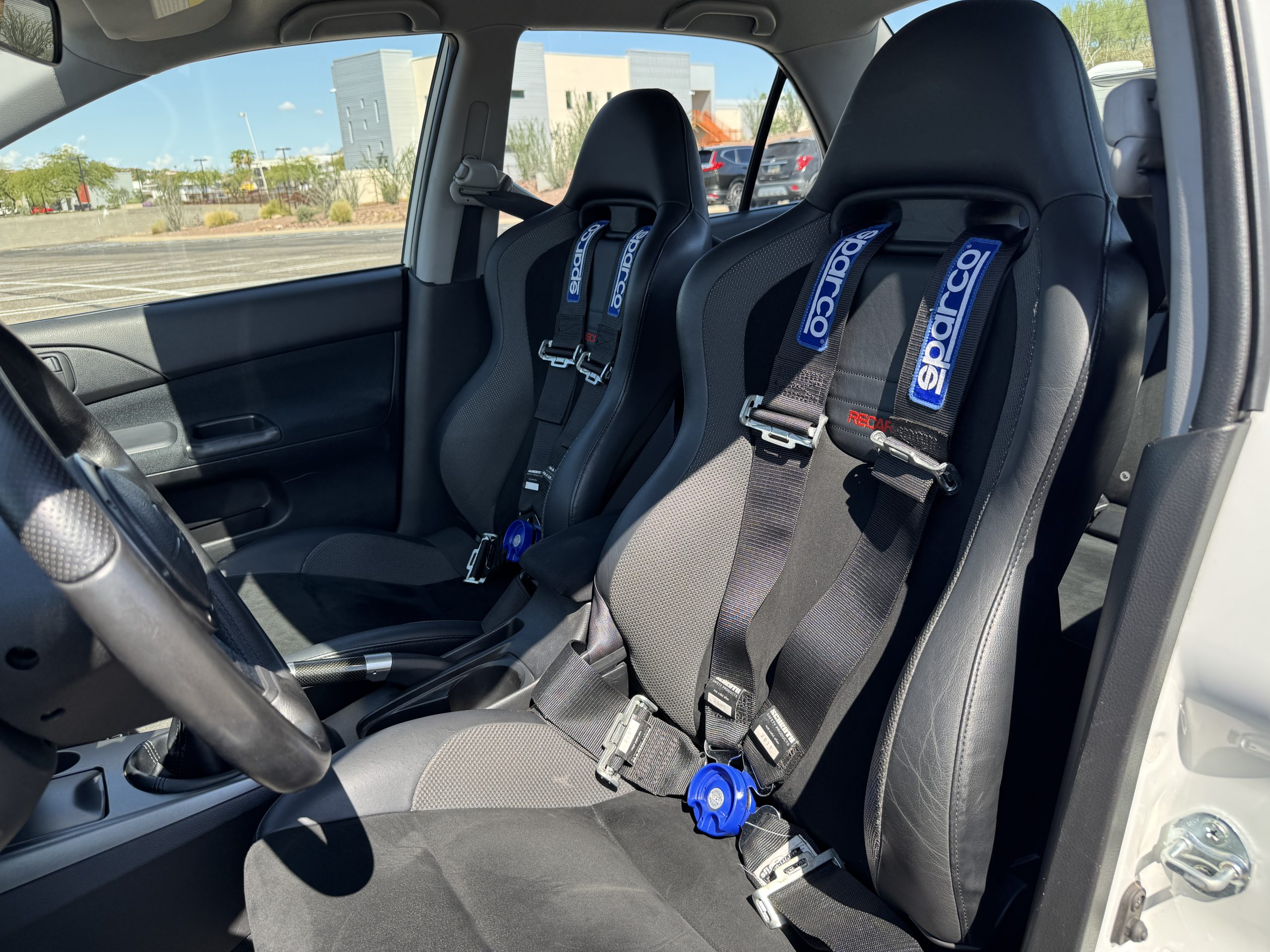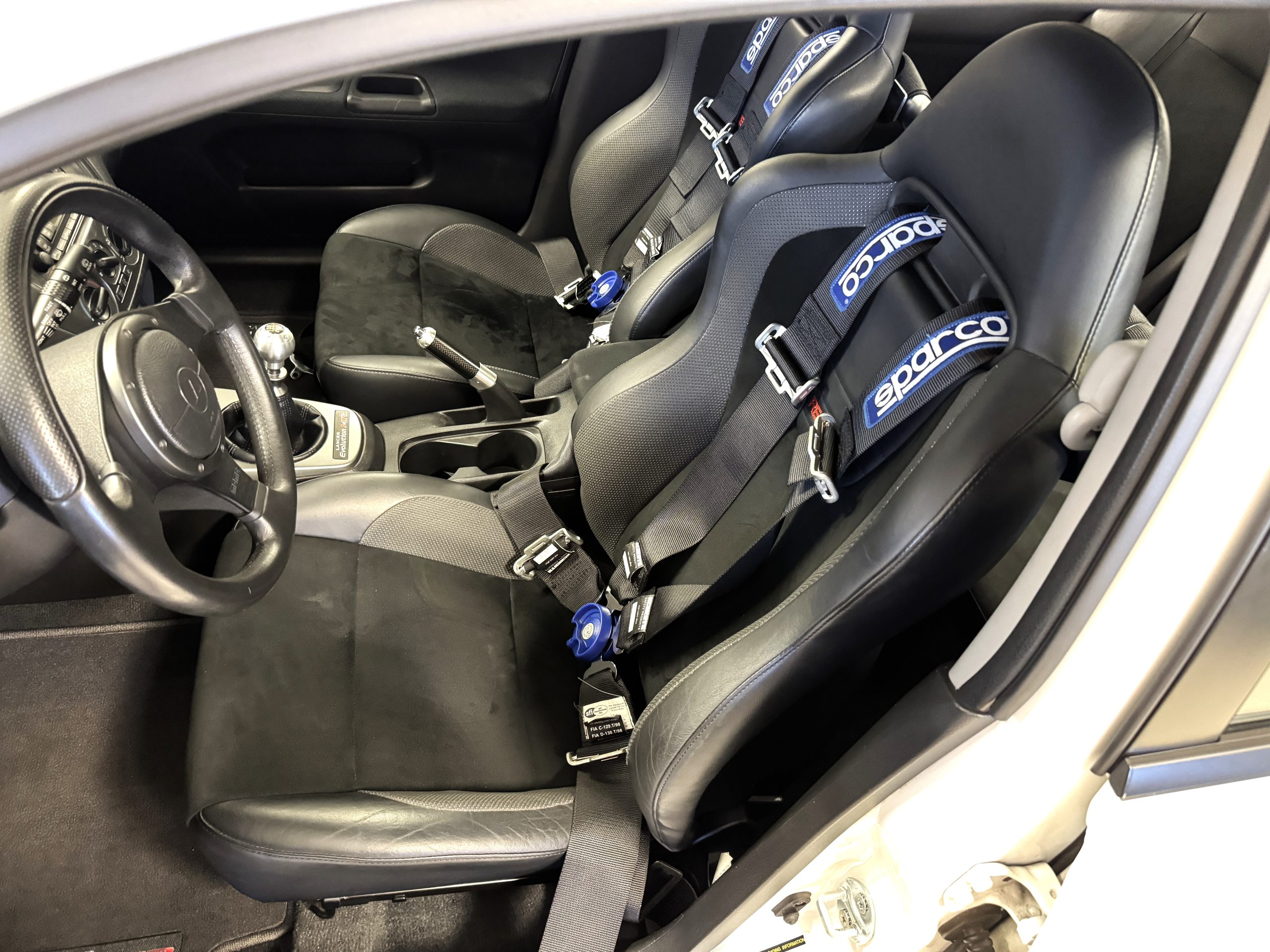 The interior of the Evo IX MR is exceptionally well-preserved, featuring factory Recaro sport bucket seats in black leather with gray Alcantara inserts and red stitching, complemented by a four-point Sparco harness system. The seats, carpets, and trim present with minimal wear, reflecting the car’s sparing use. The MR-specific gloss black dash inserts, aluminum scuff protectors, and Momo leather-wrapped steering wheel highlight the model’s distinctive details. Functionality is complete, with Mitsubishi climate control, audio/CD system with 6 speakers, and original instrumentation all in proper working condition. The interior underscores the duality of this Evo IX as both a track-capable performer and a well-appointed modern classic.
