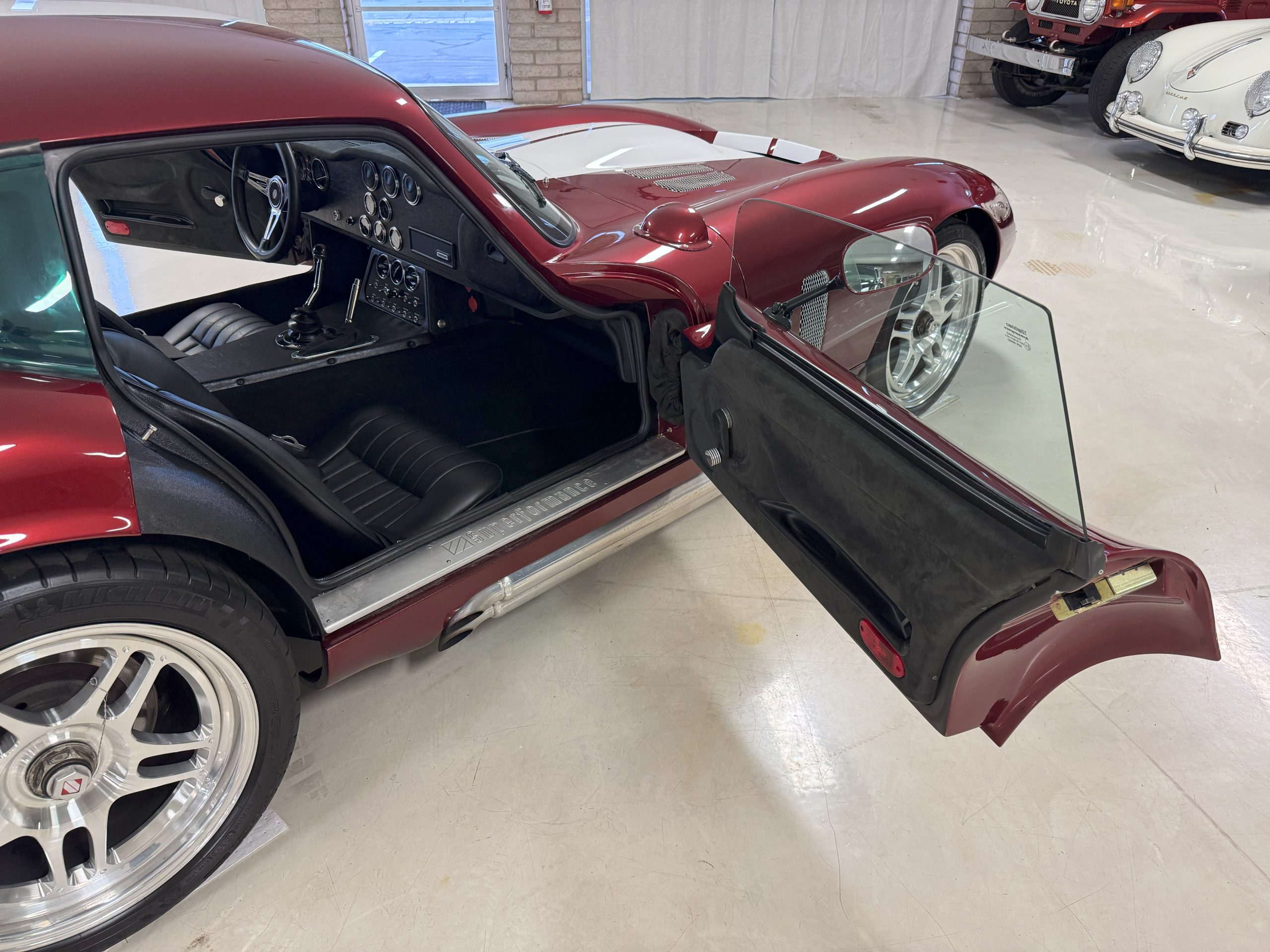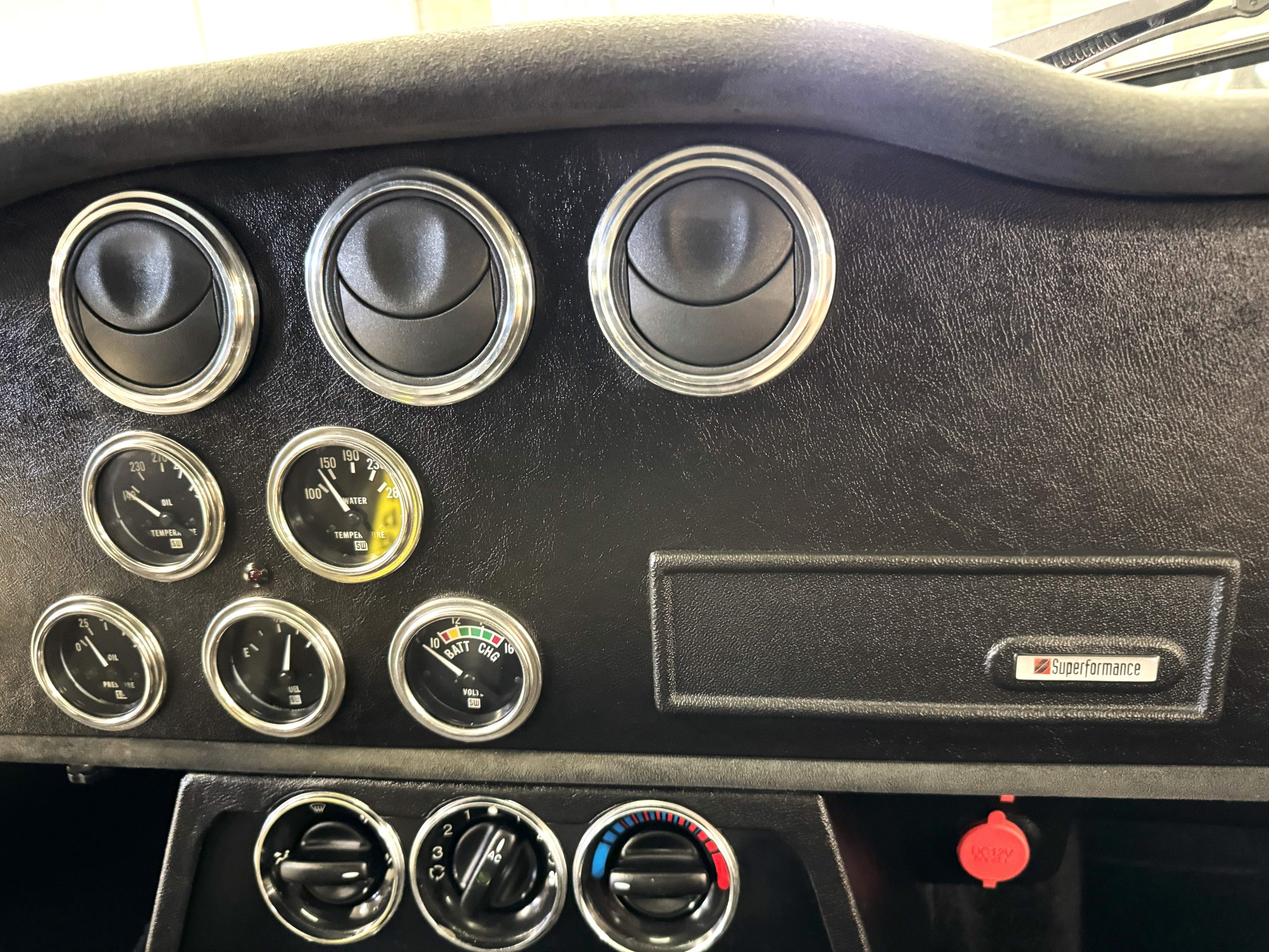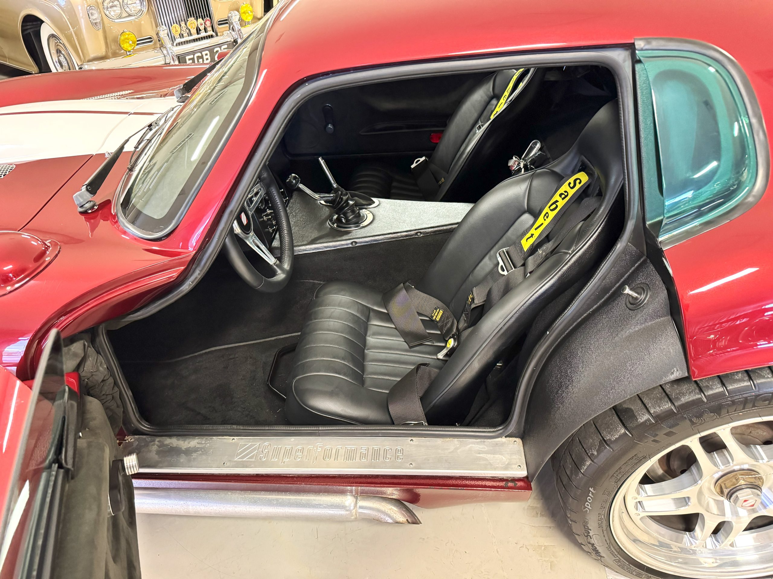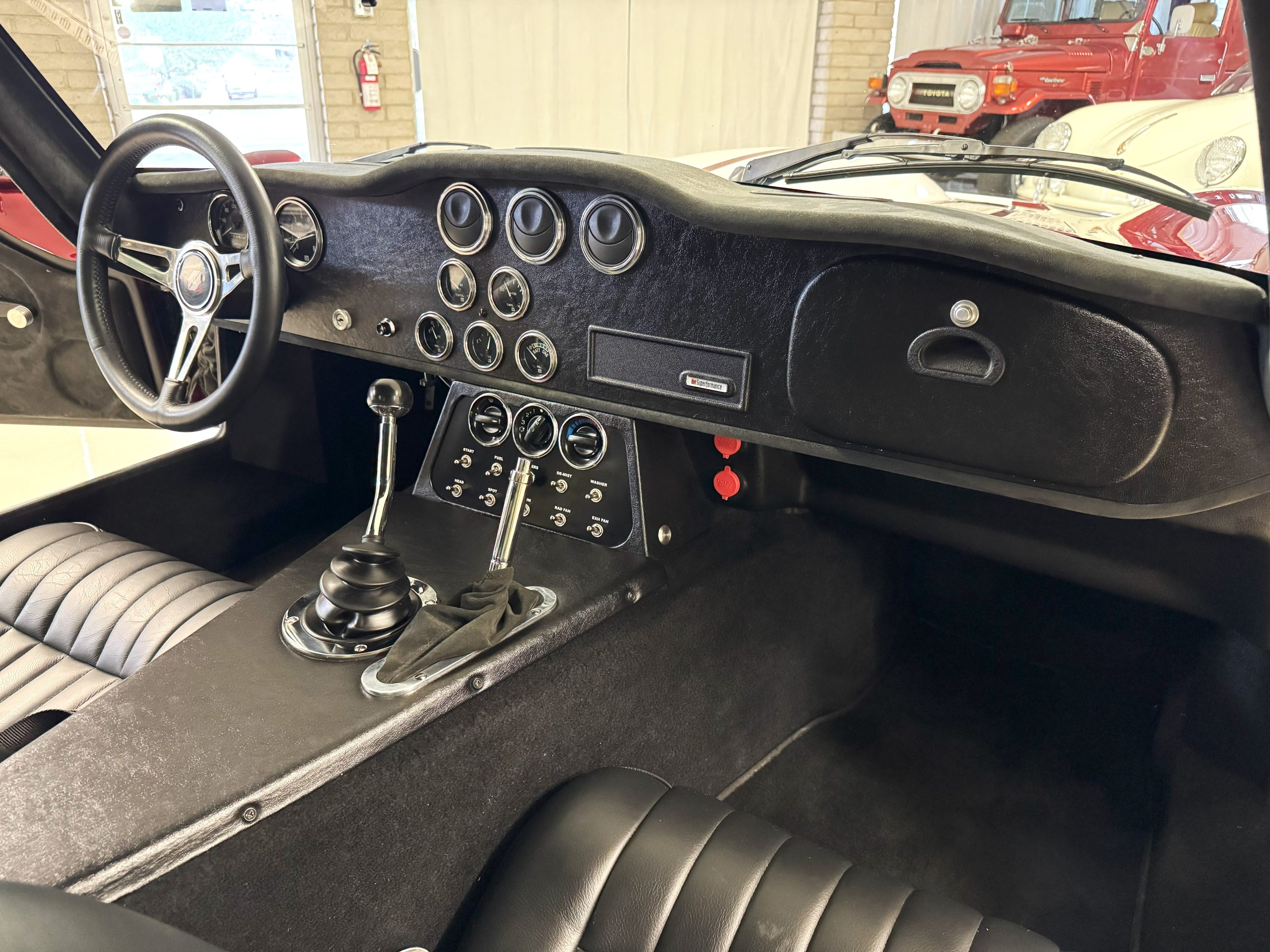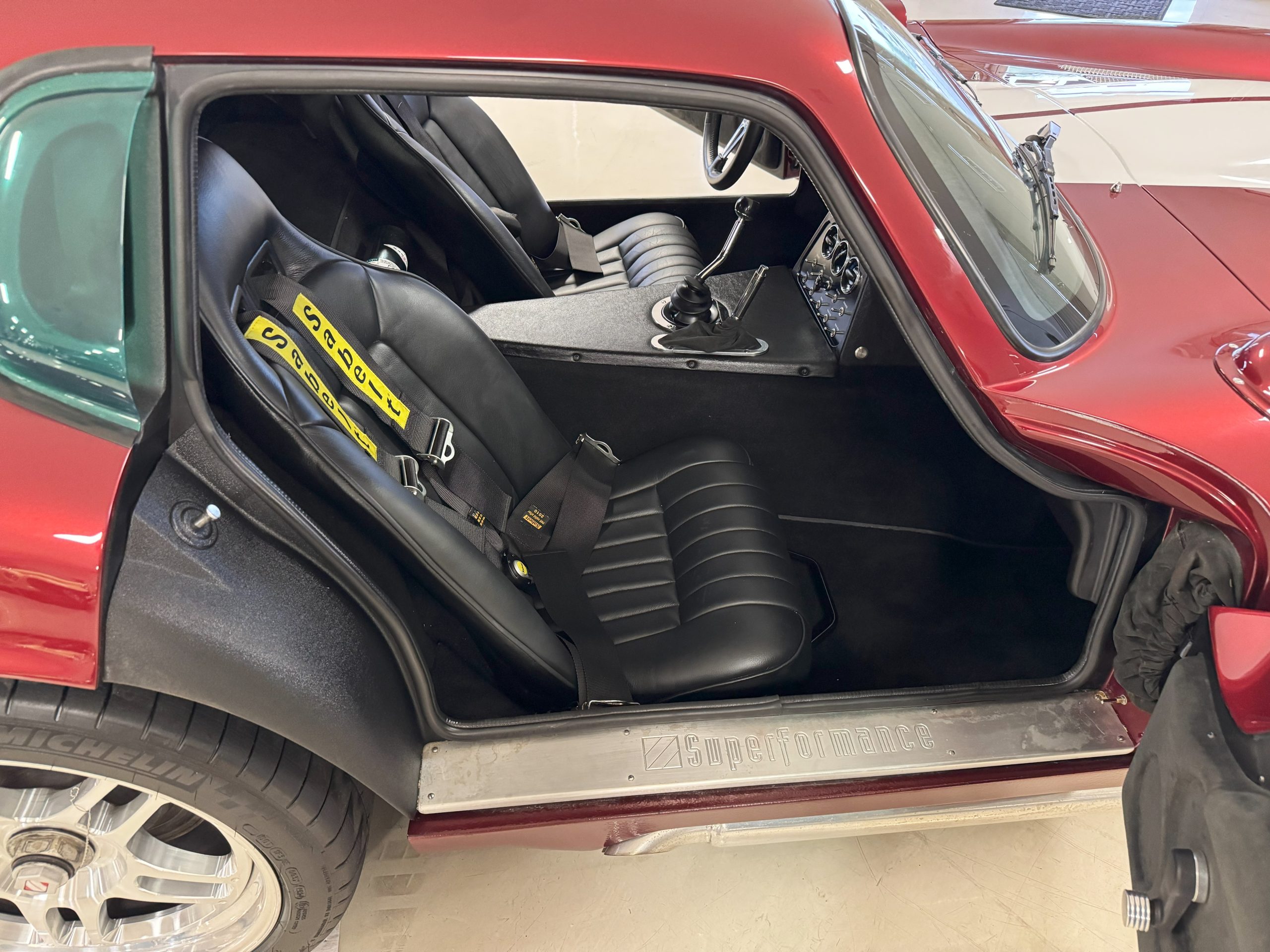 The interior is in excellent condition, reflecting careful use and climate-controlled storage. The interior features black leather sport seats with five-point harnesses, suede-like trim, dash fitted with chrome-rimmed Stewart Warner gauges and a three-spoke chrome steering wheel. All instruments are in working order. Air conditioning, recharged in September 2025, ensures comfort during extended road tours. The attention to detail throughout the cabin underscores the balance of authenticity and modern usability that defines the Superformance Coupe.
