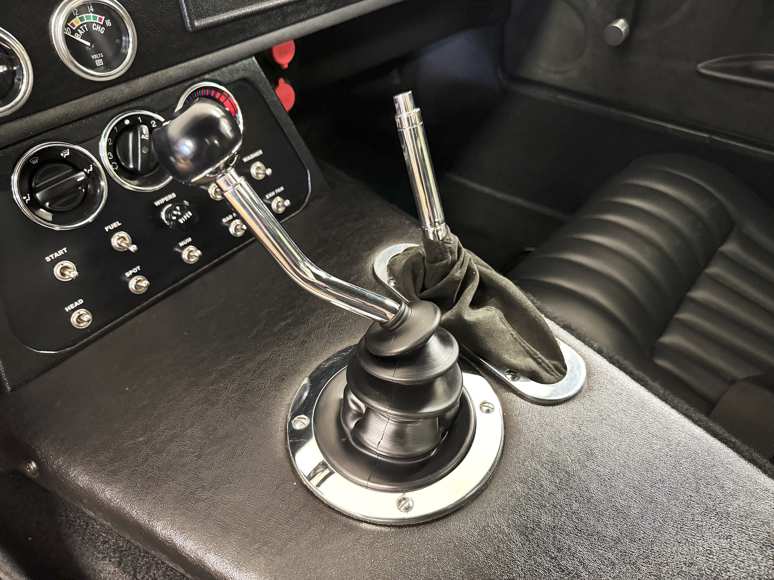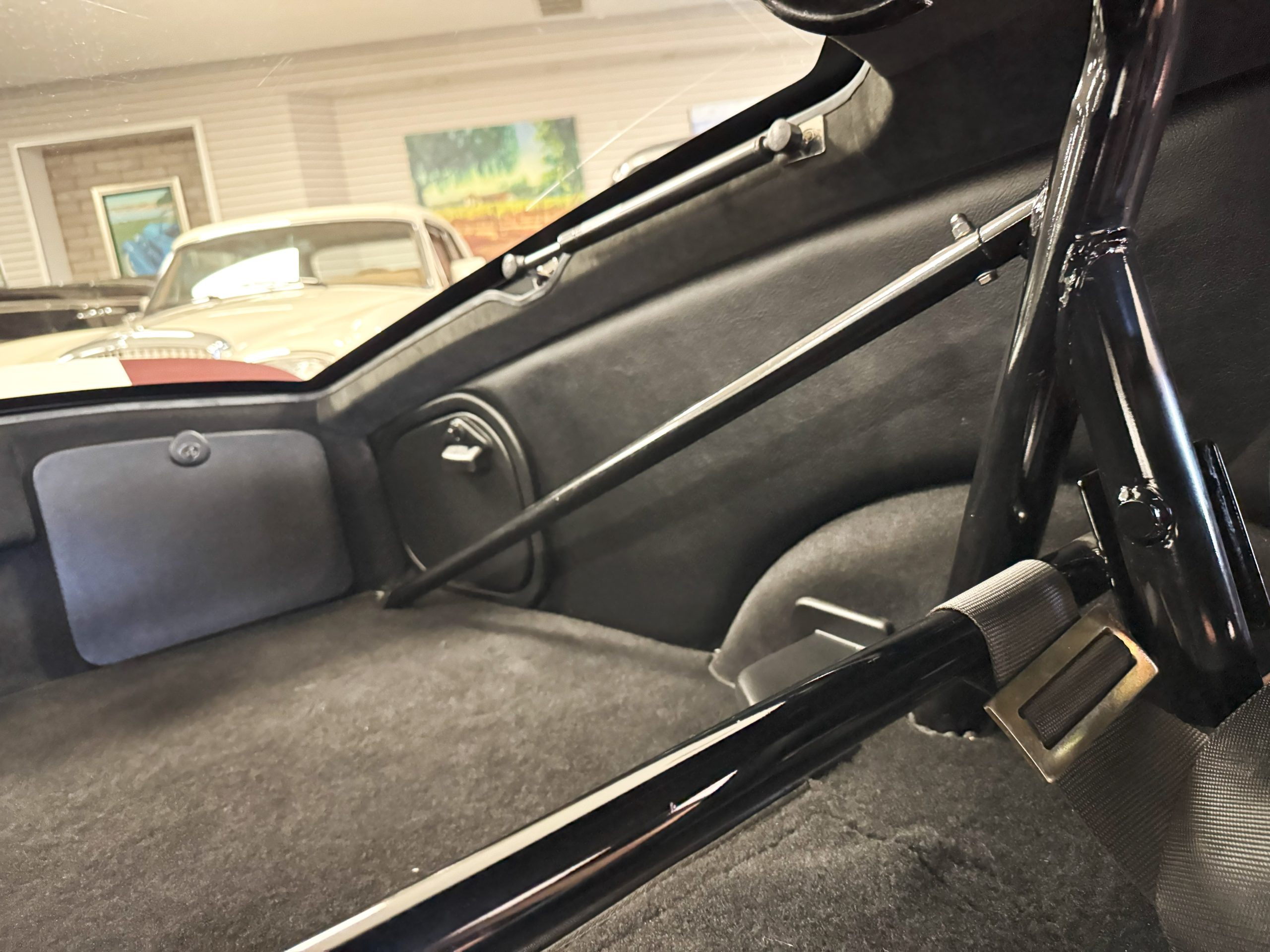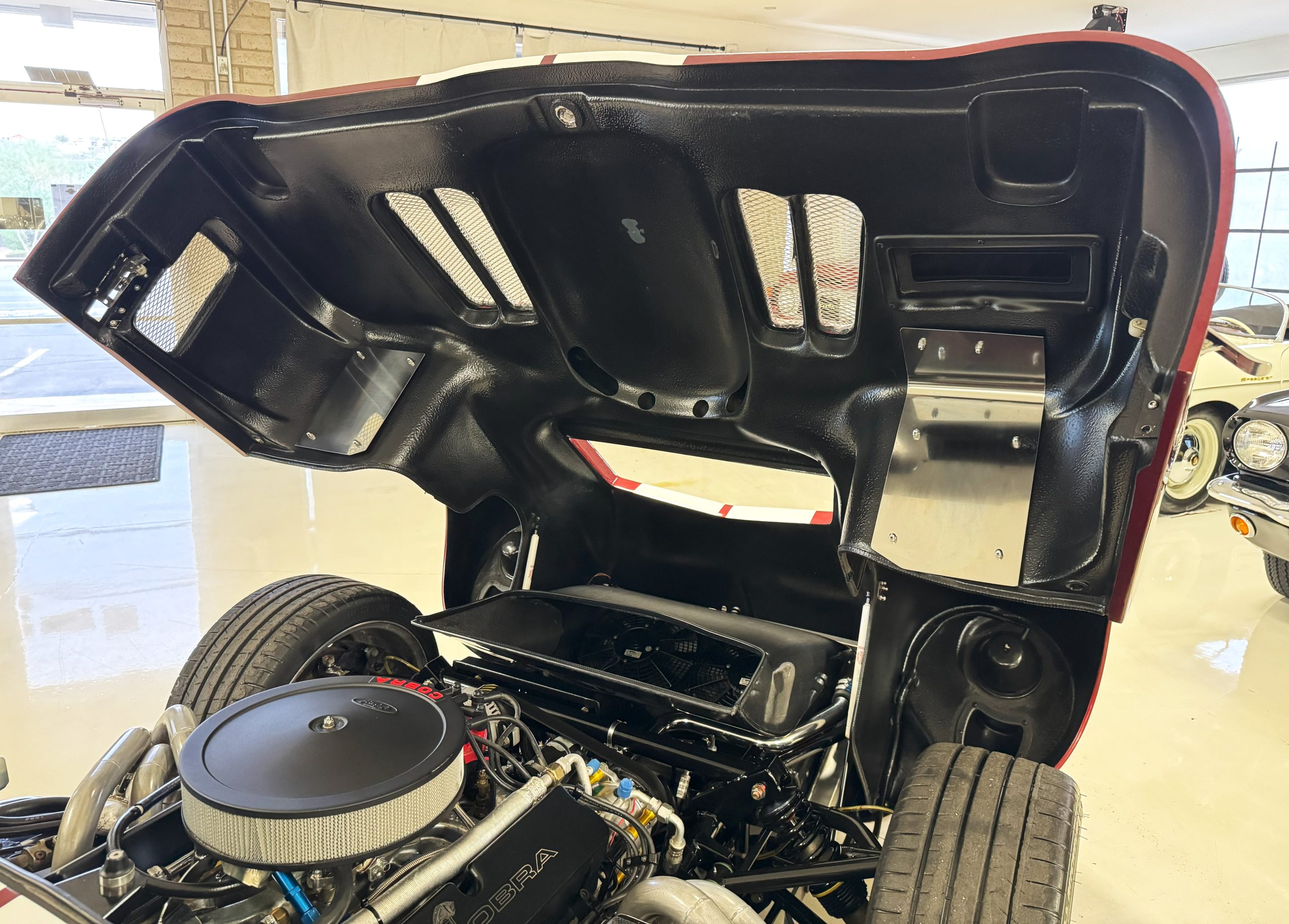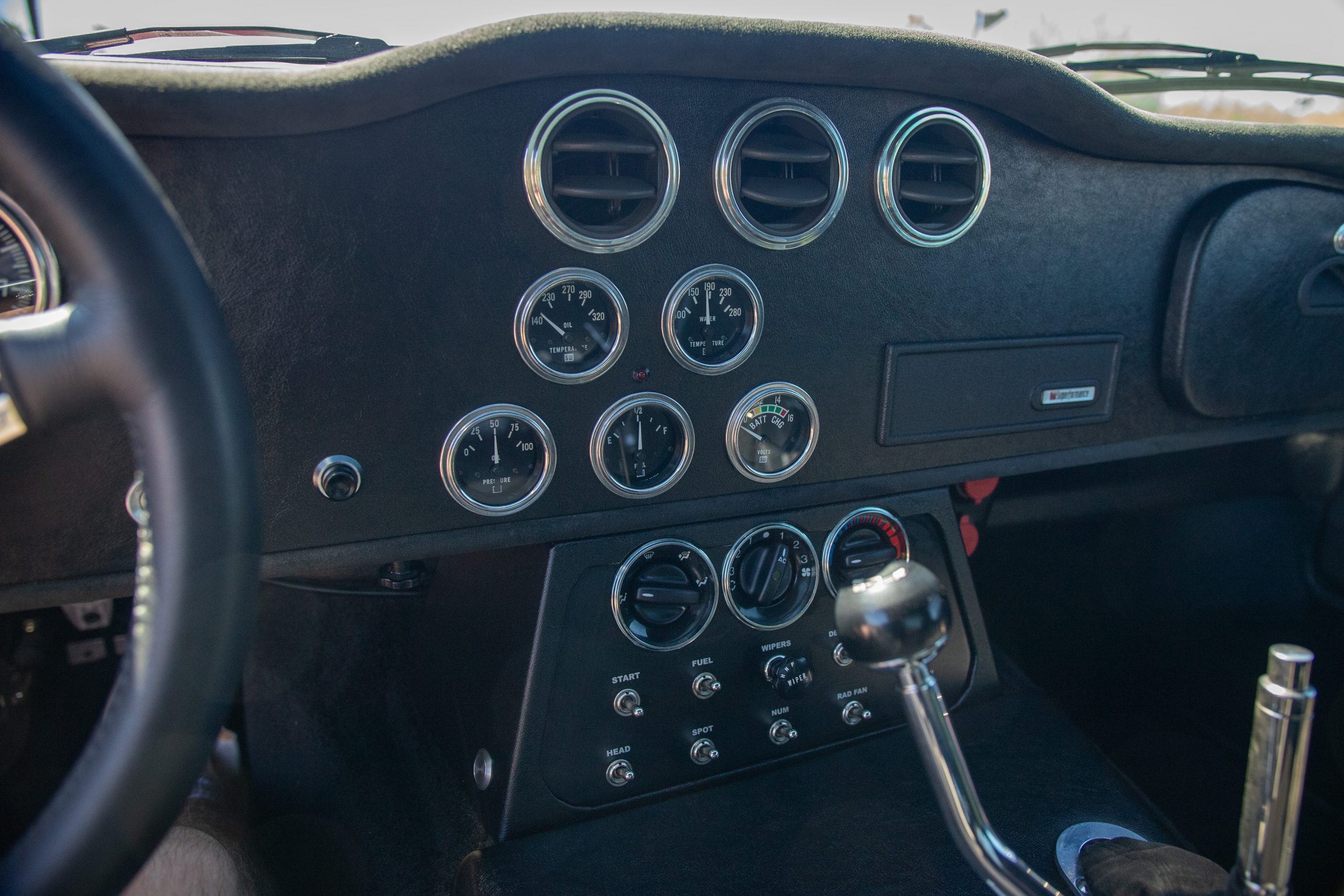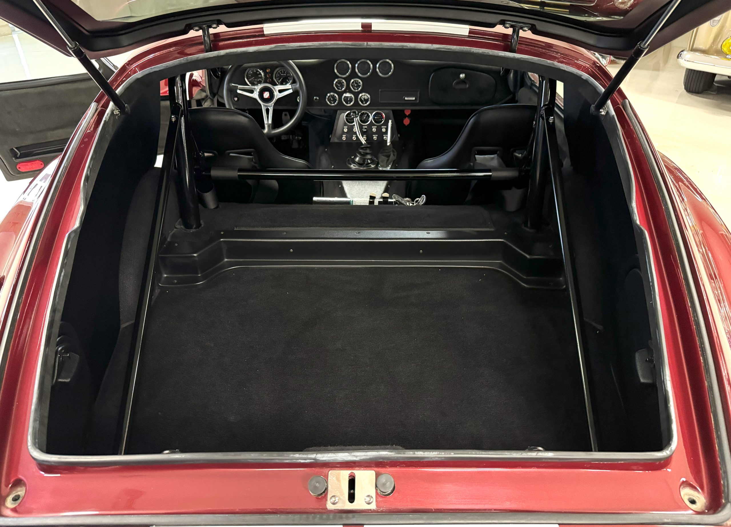 The interior is in excellent condition, reflecting careful use and climate-controlled storage. The interior features black leather sport seats with five-point harnesses, suede-like trim, dash fitted with chrome-rimmed Stewart Warner gauges and a three-spoke chrome steering wheel. All instruments are in working order. Air conditioning, recharged in September 2025, ensures comfort during extended road tours. The attention to detail throughout the cabin underscores the balance of authenticity and modern usability that defines the Superformance Coupe.