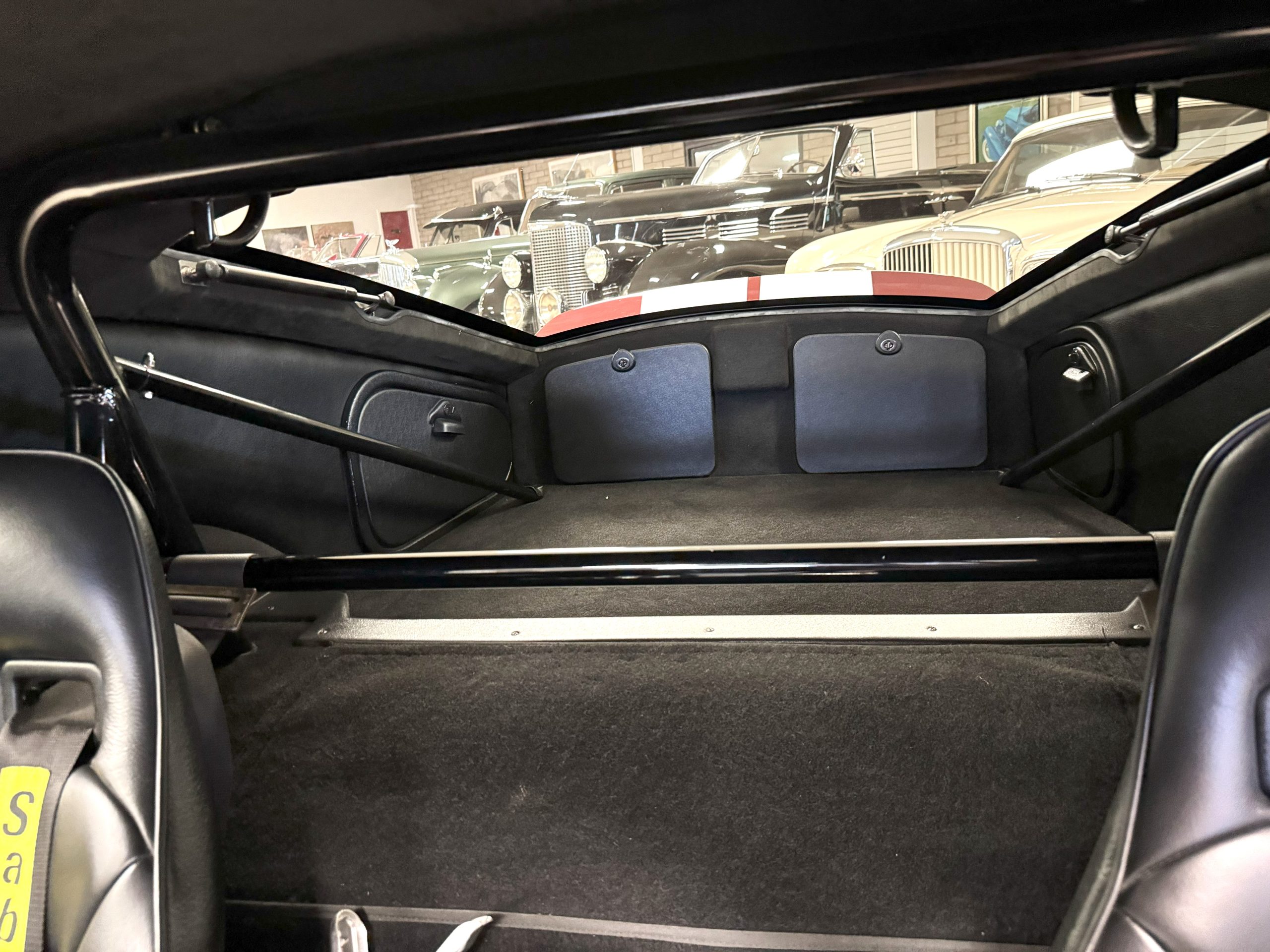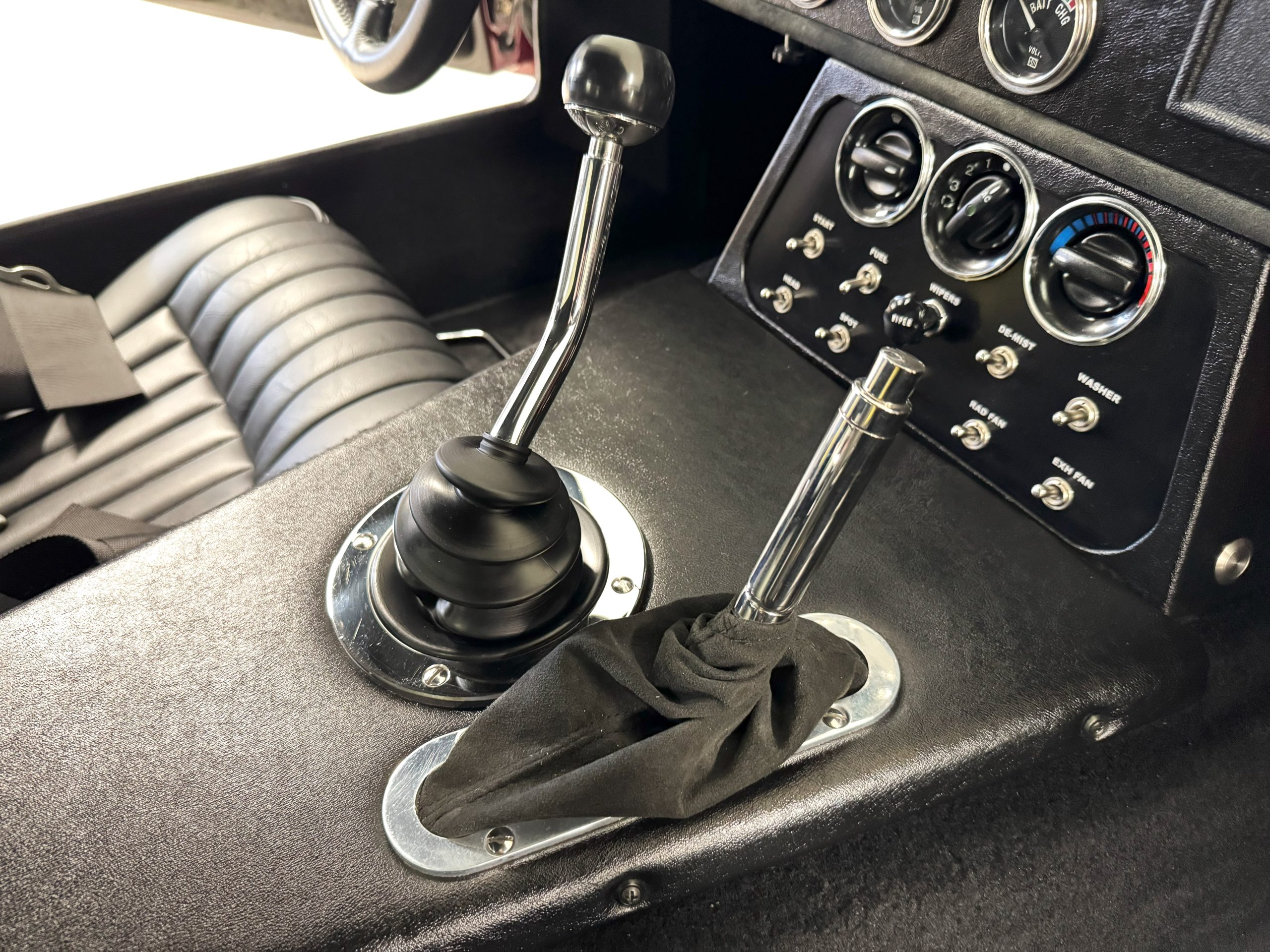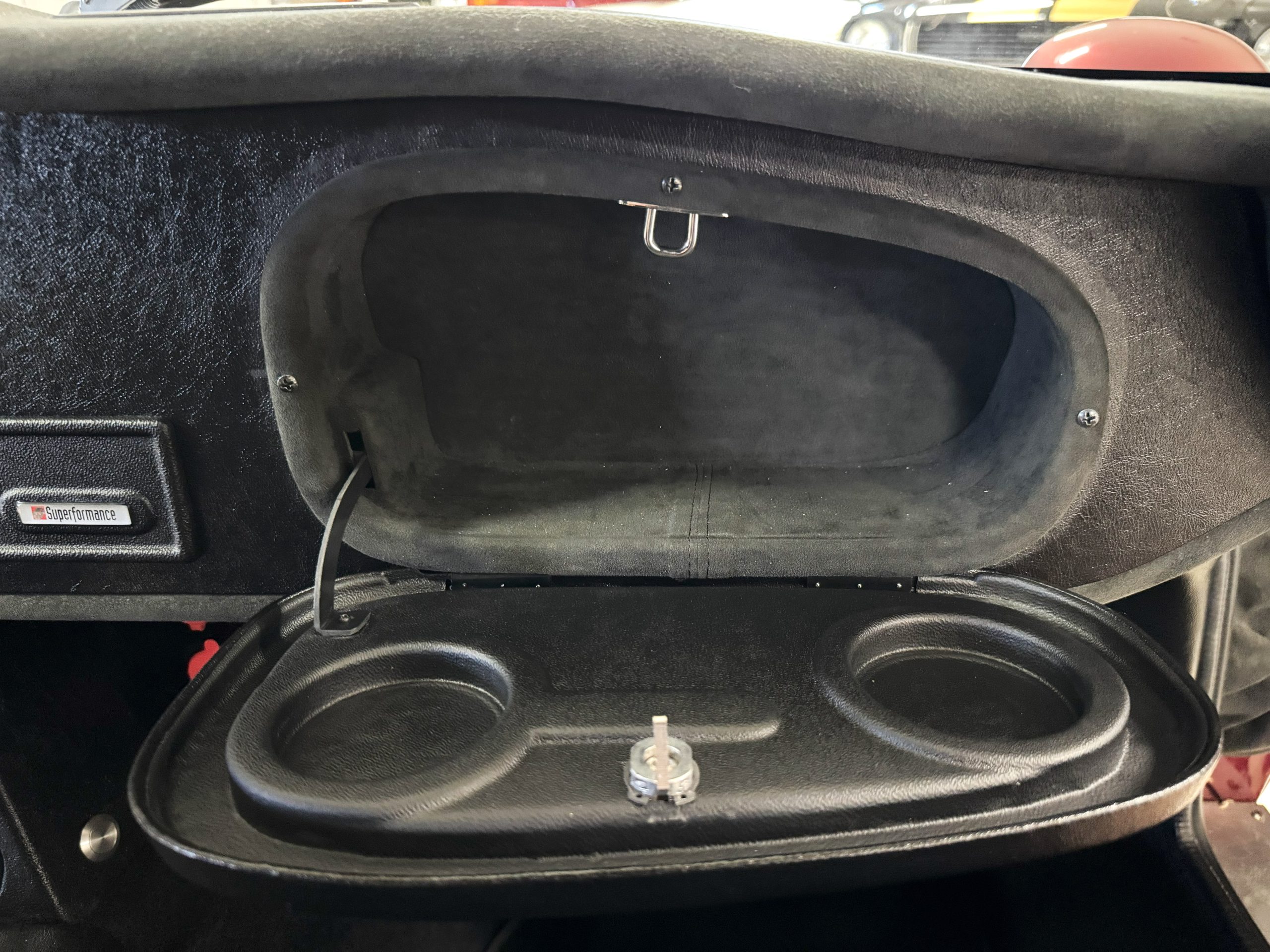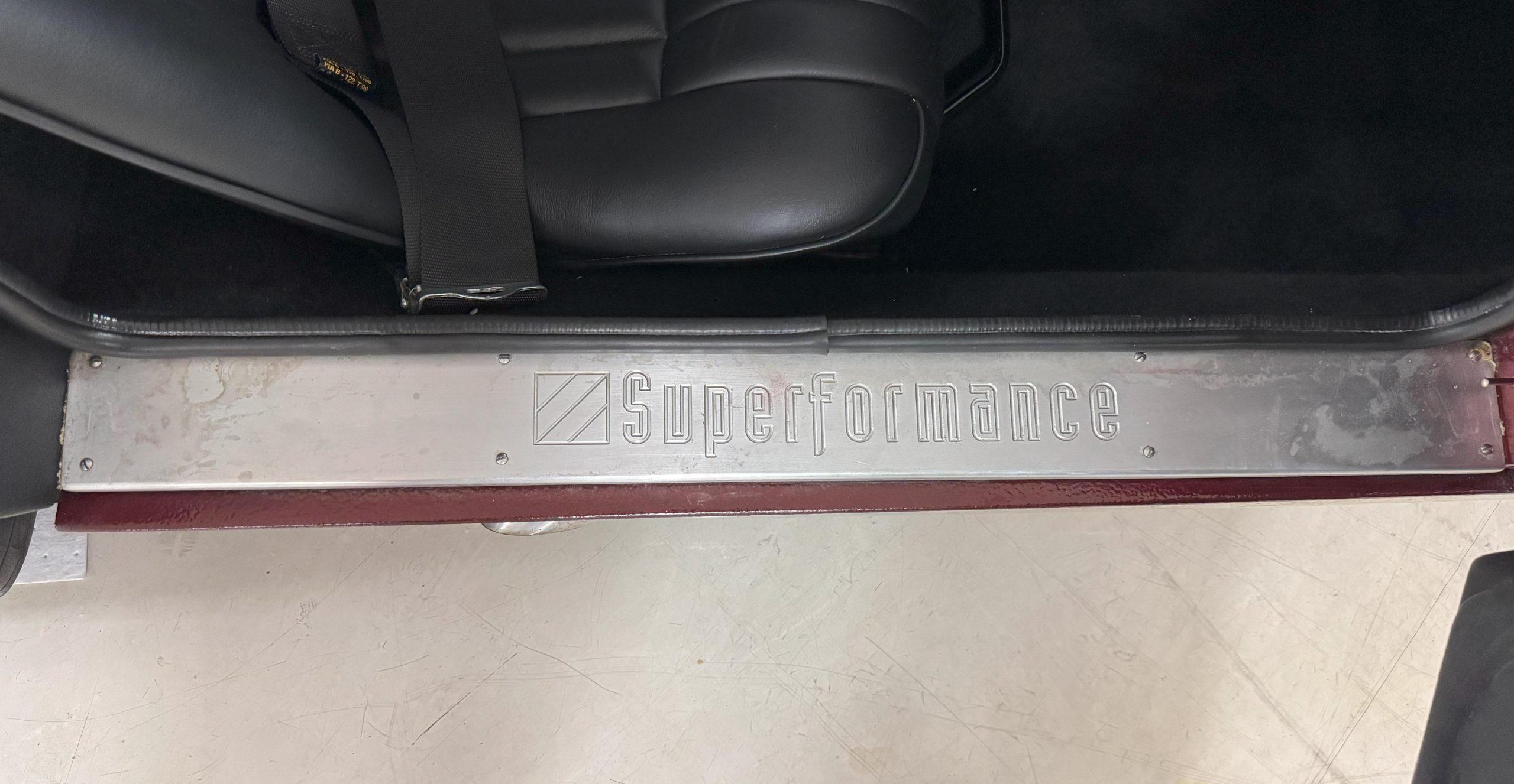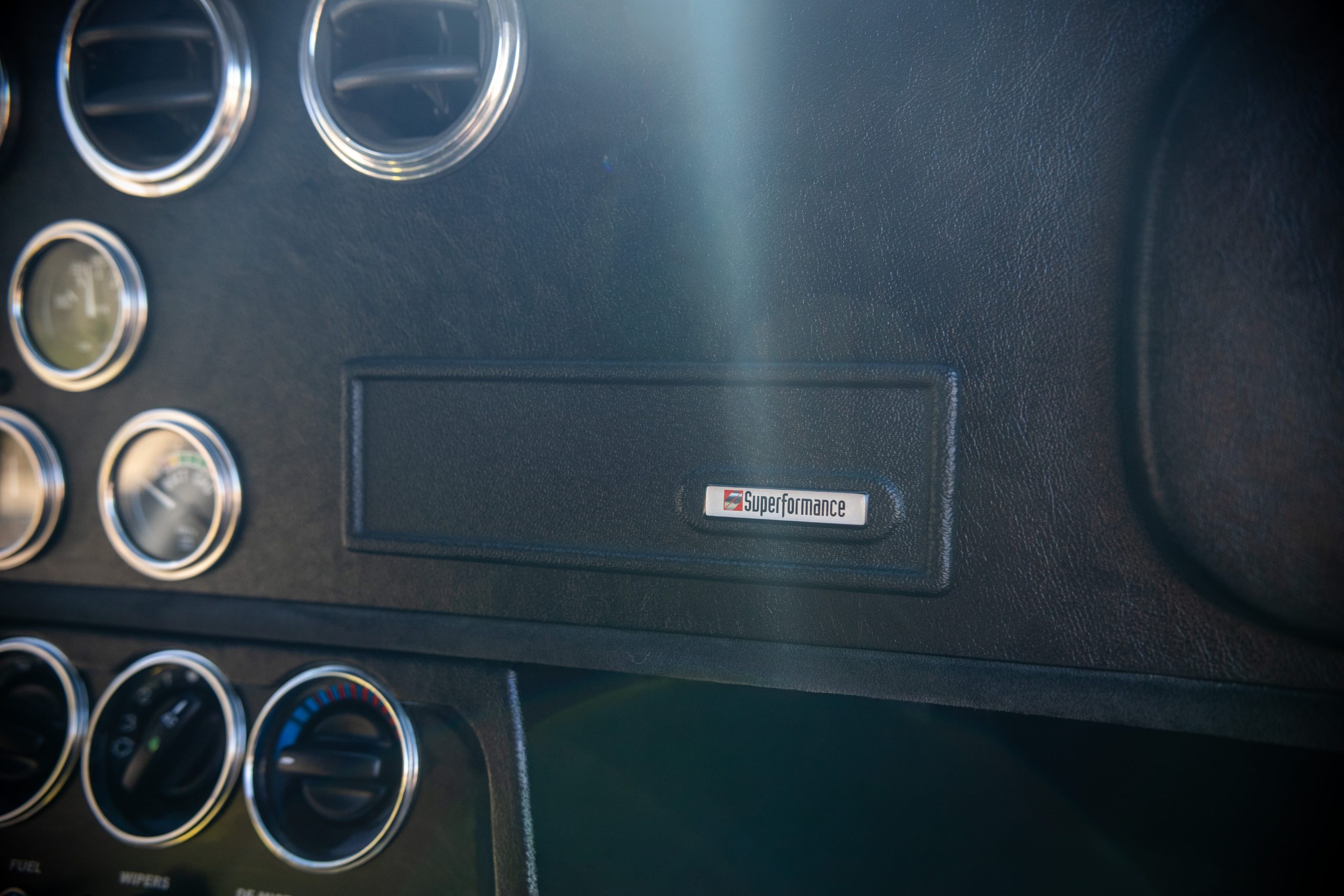 The interior is in excellent condition, reflecting careful use and climate-controlled storage. The interior features black leather sport seats with five-point harnesses, suede-like trim, dash fitted with chrome-rimmed Stewart Warner gauges and a three-spoke chrome steering wheel. All instruments are in working order. Air conditioning, recharged in September 2025, ensures comfort during extended road tours. The attention to detail throughout the cabin underscores the balance of authenticity and modern usability that defines the Superformance Coupe.