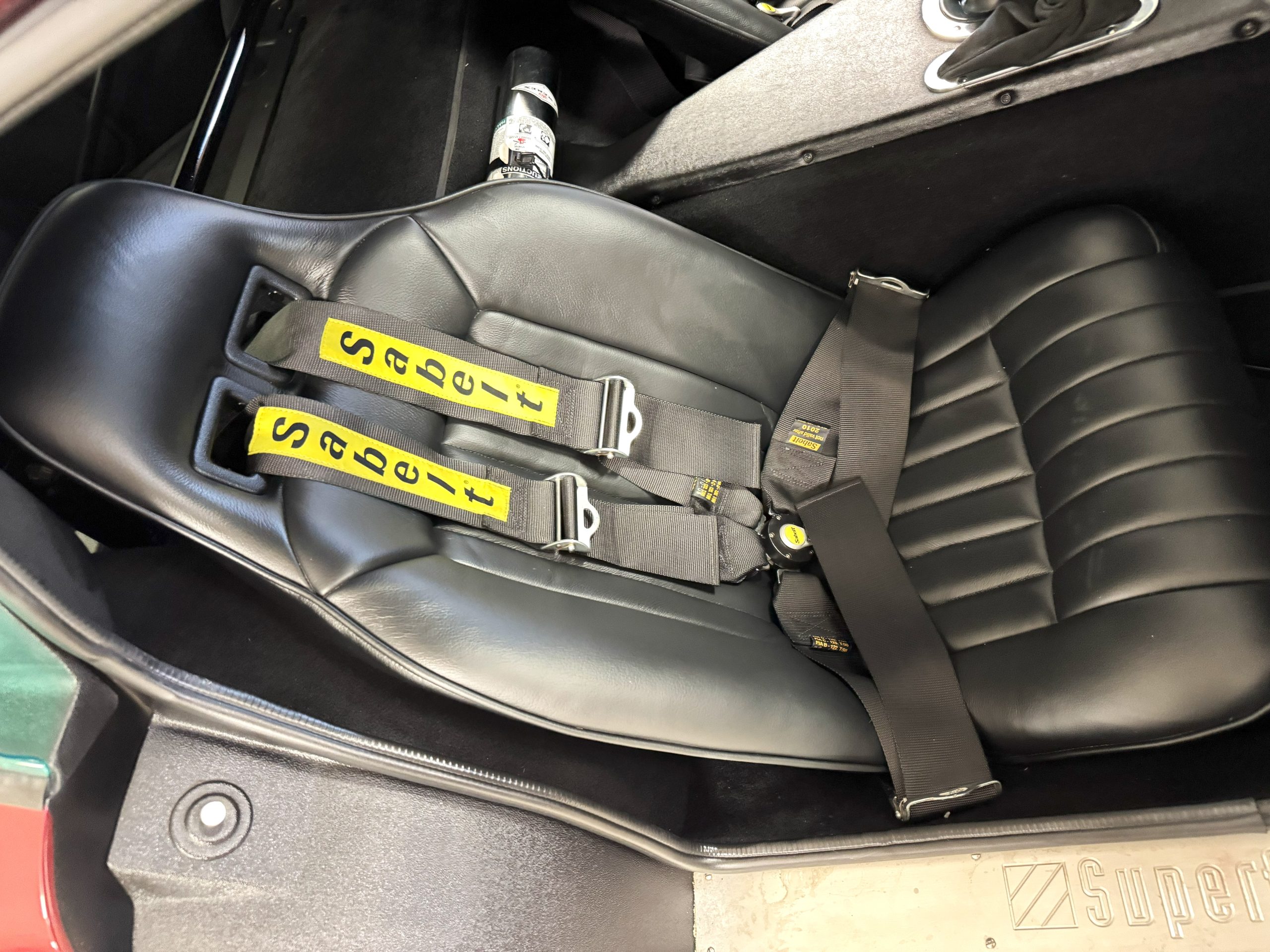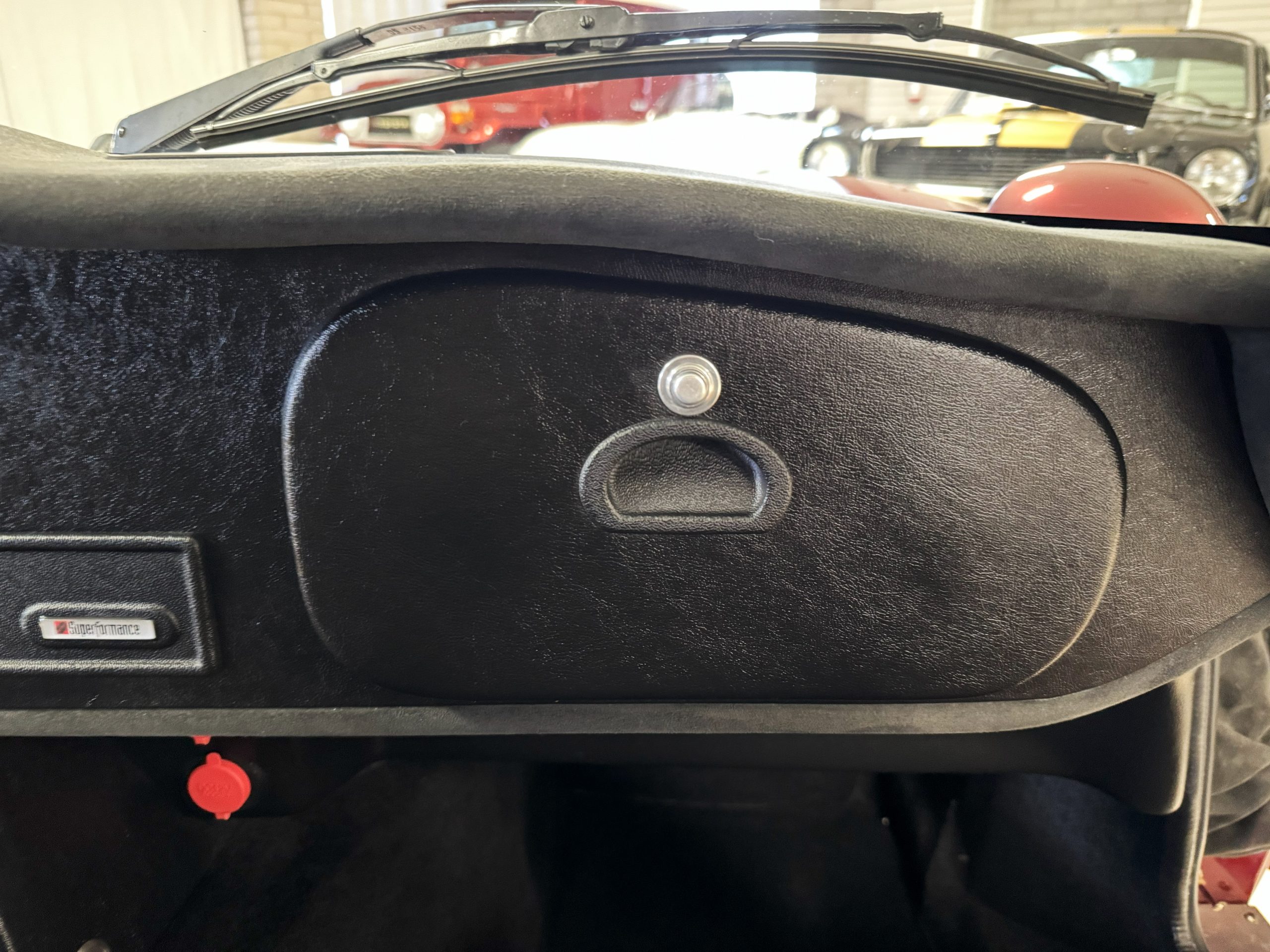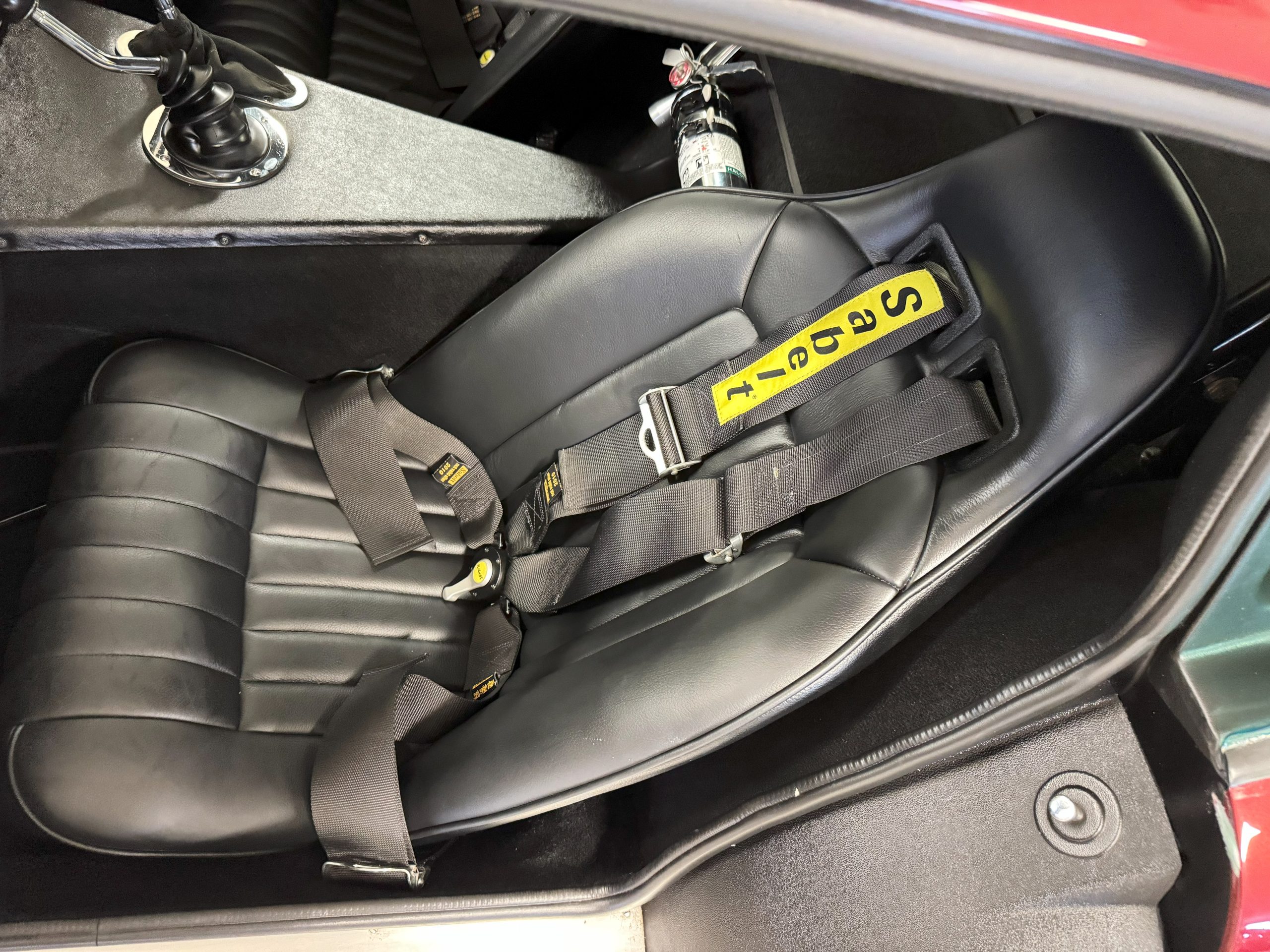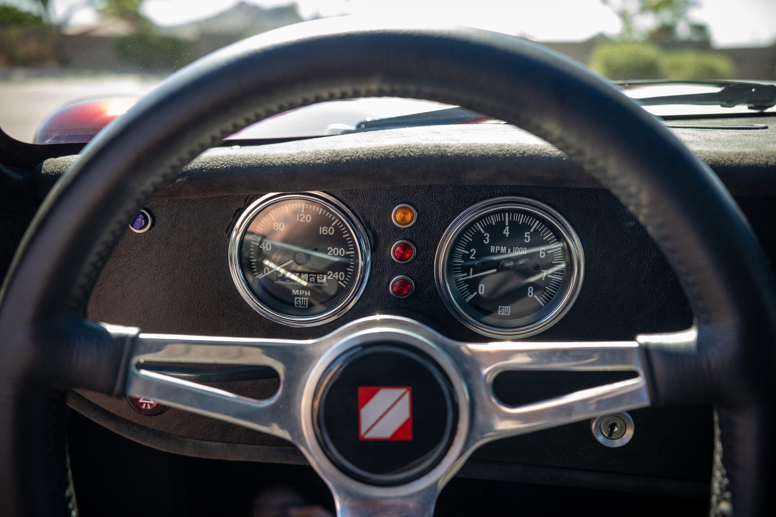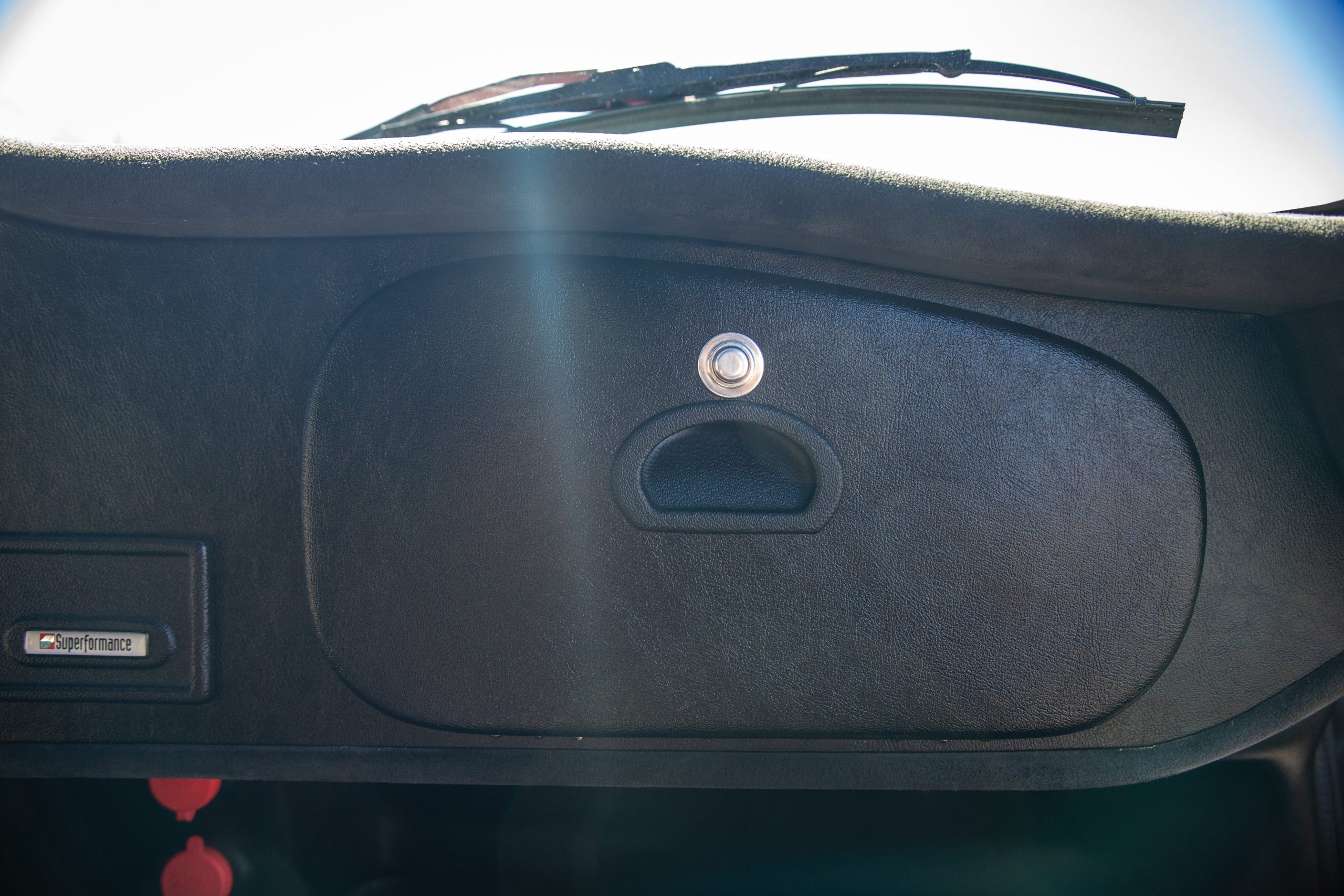 The interior is in excellent condition, reflecting careful use and climate-controlled storage. The interior features black leather sport seats with five-point harnesses, suede-like trim, dash fitted with chrome-rimmed Stewart Warner gauges and a three-spoke chrome steering wheel. All instruments are in working order. Air conditioning, recharged in September 2025, ensures comfort during extended road tours. The attention to detail throughout the cabin underscores the balance of authenticity and modern usability that defines the Superformance Coupe.