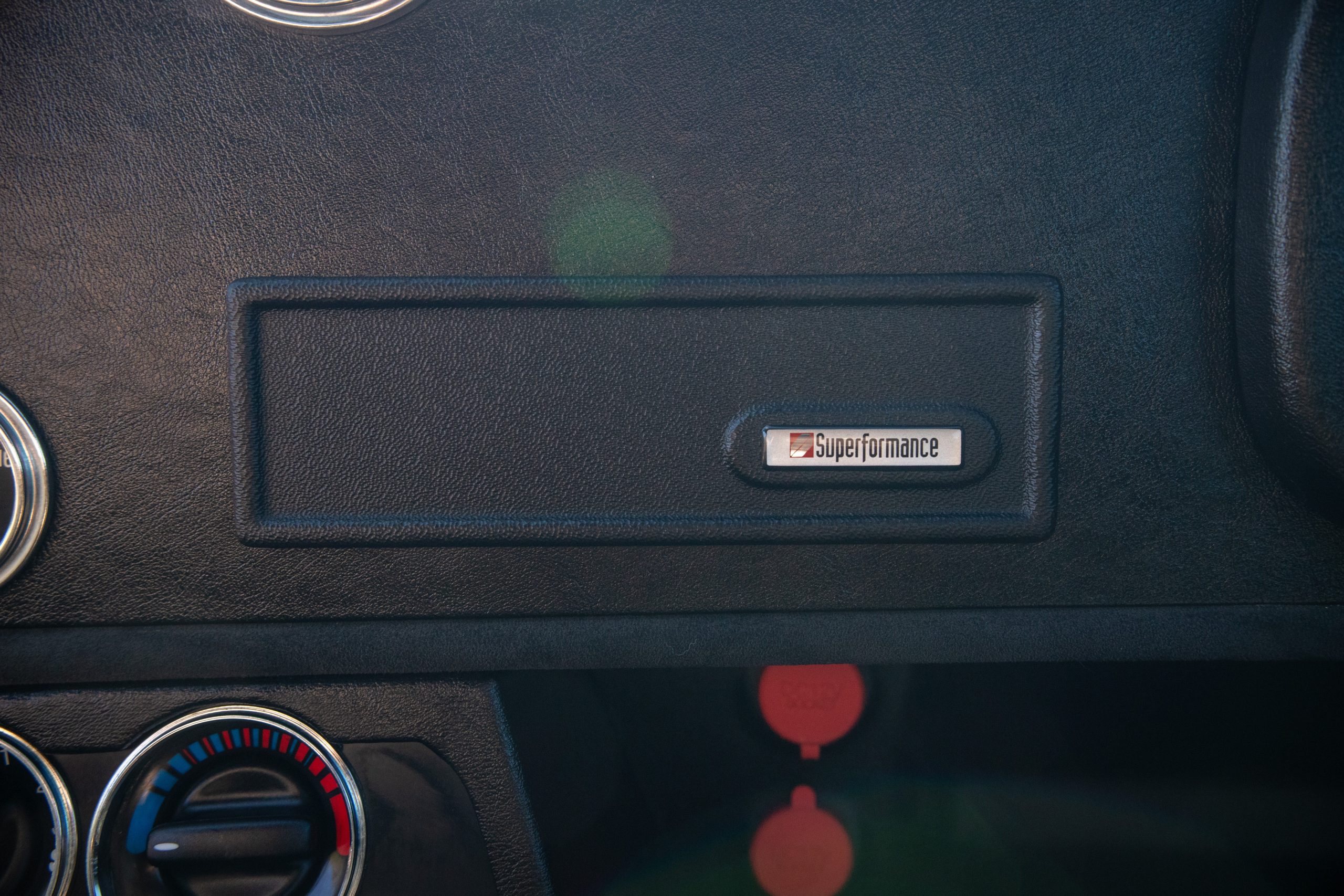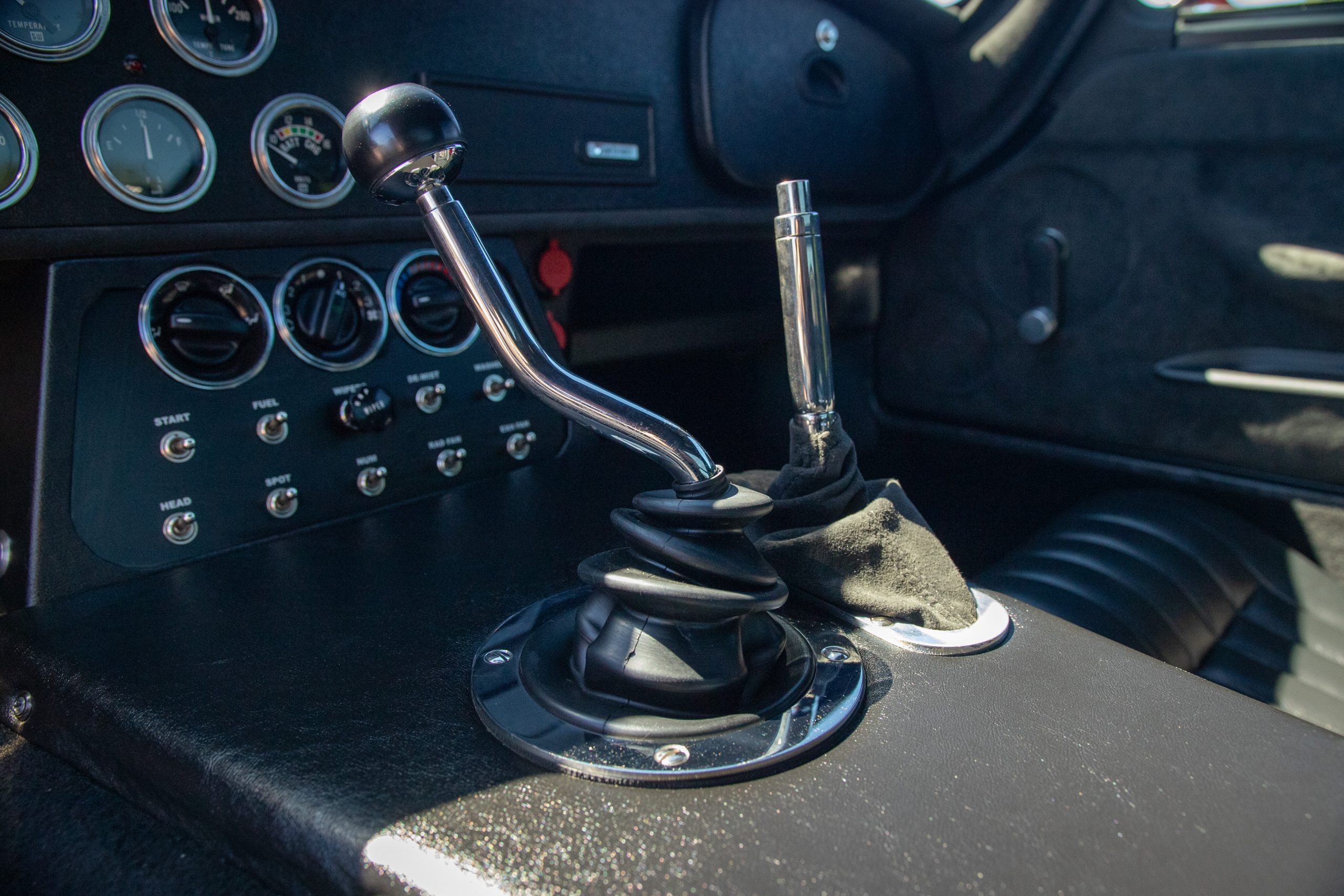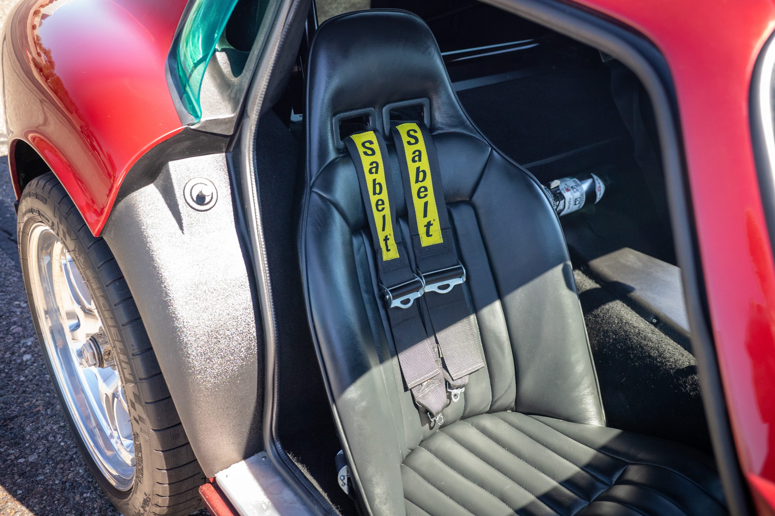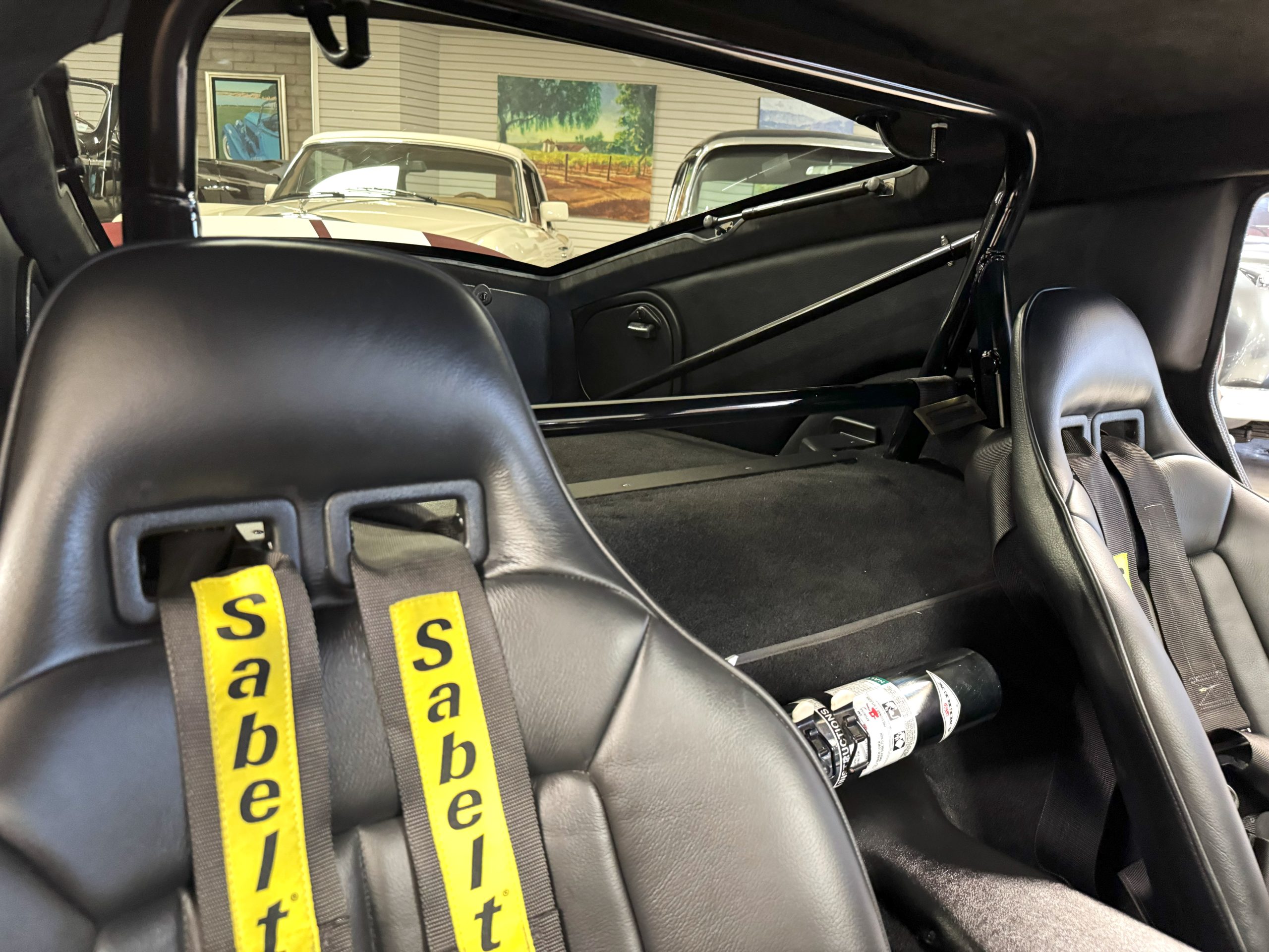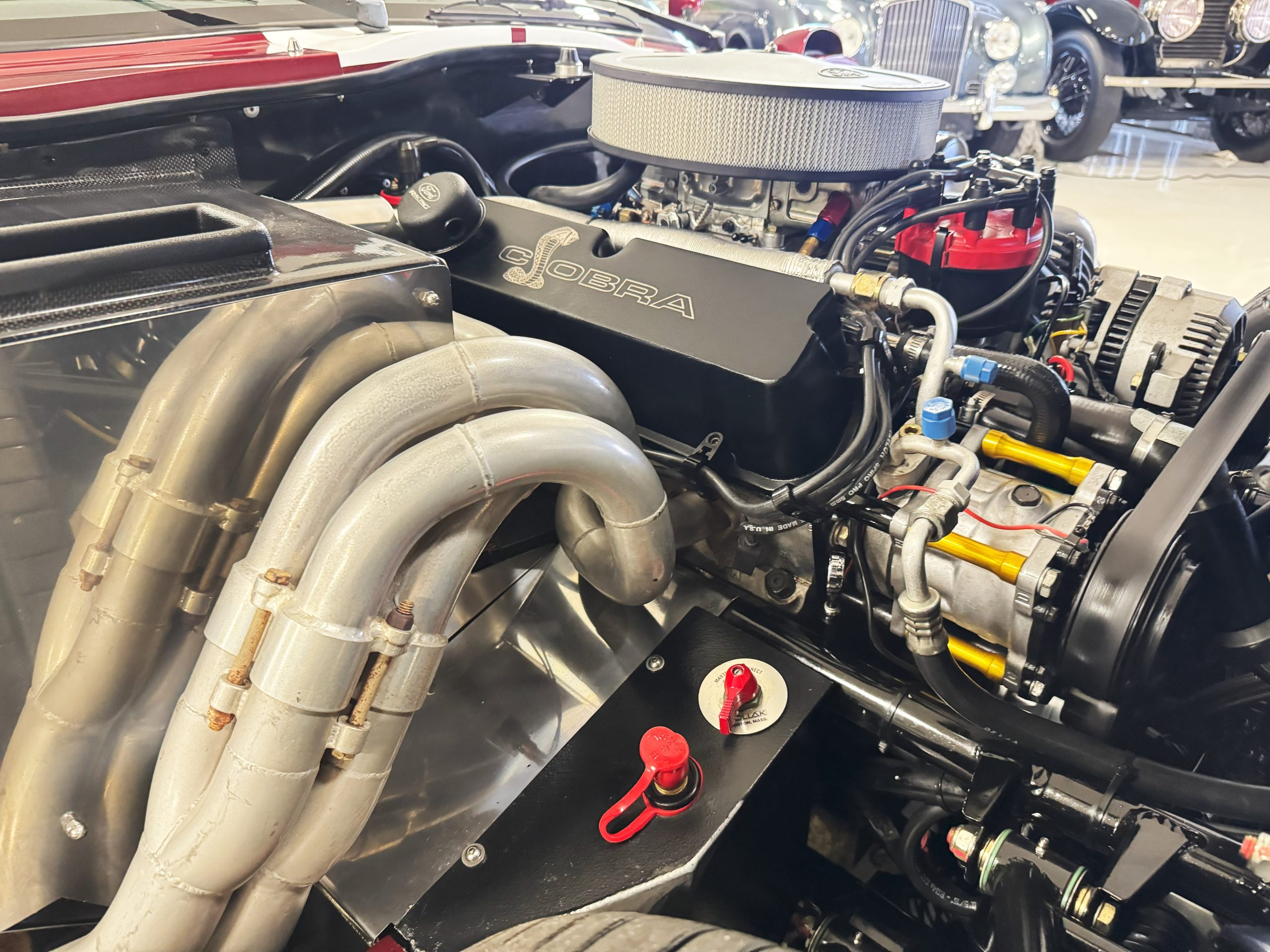 The interior is in excellent condition, reflecting careful use and climate-controlled storage. The interior features black leather sport seats with five-point harnesses, suede-like trim, dash fitted with chrome-rimmed Stewart Warner gauges and a three-spoke chrome steering wheel. All instruments are in working order. Air conditioning, recharged in September 2025, ensures comfort during extended road tours. The attention to detail throughout the cabin underscores the balance of authenticity and modern usability that defines the Superformance Coupe.
