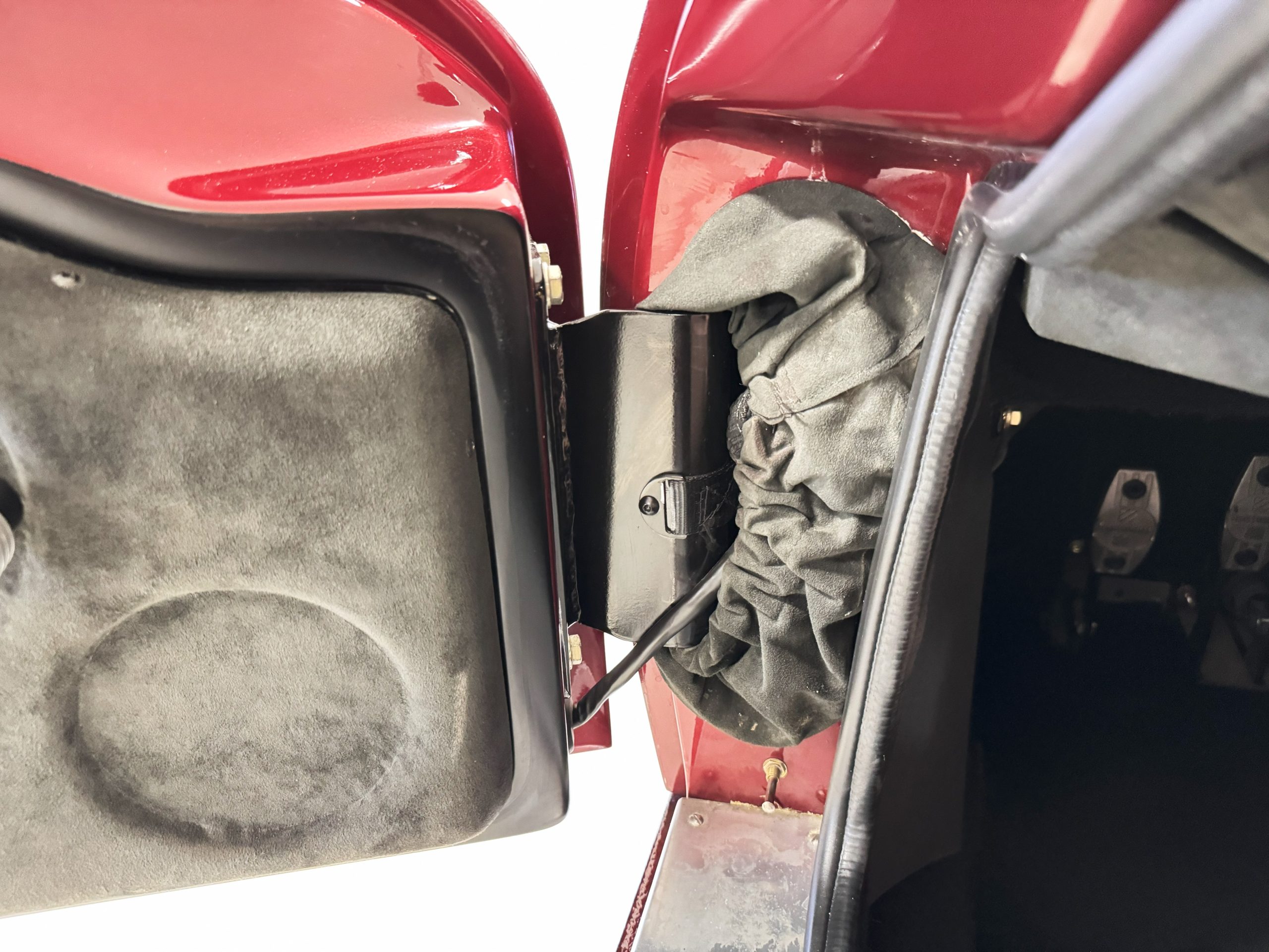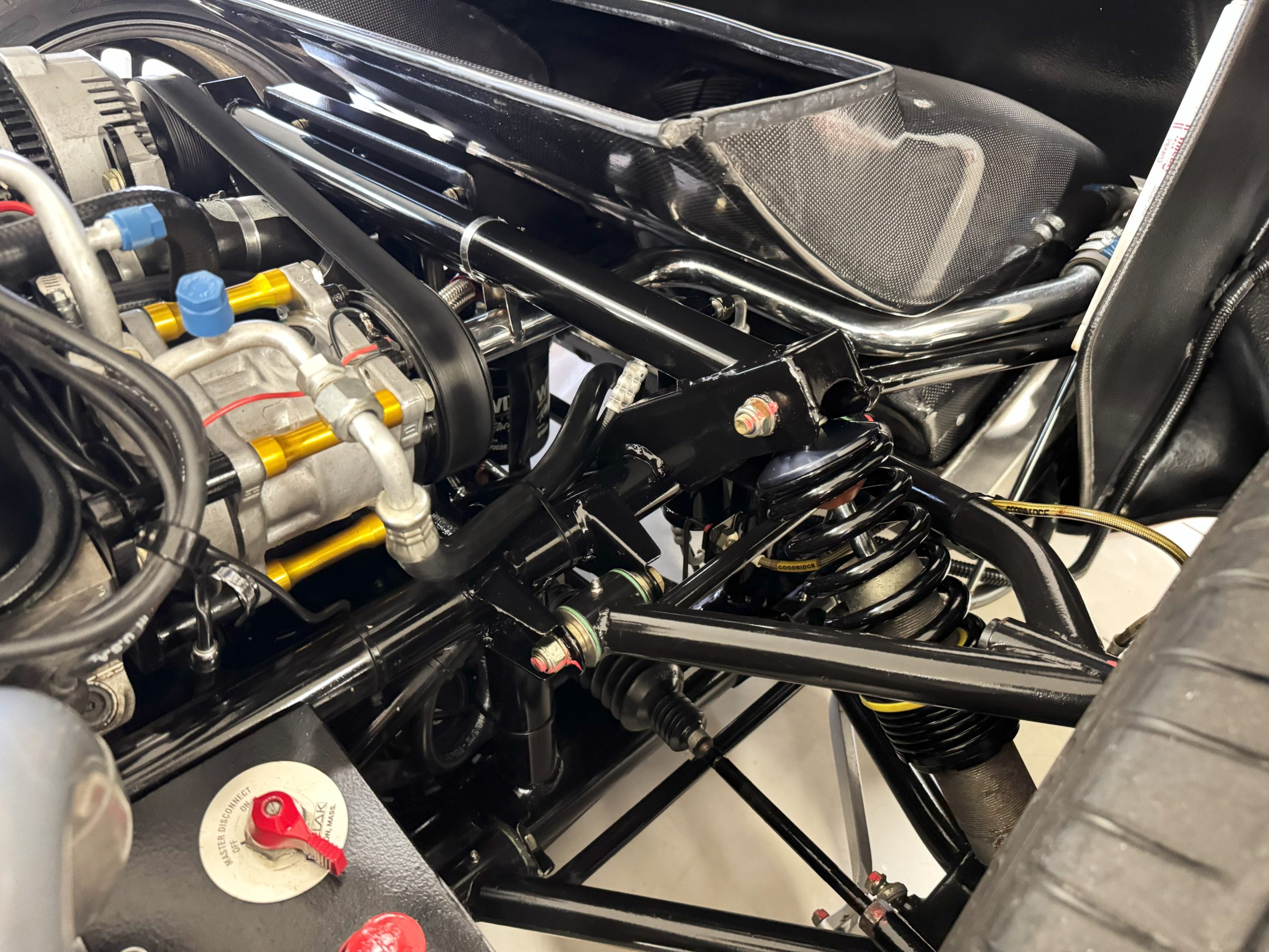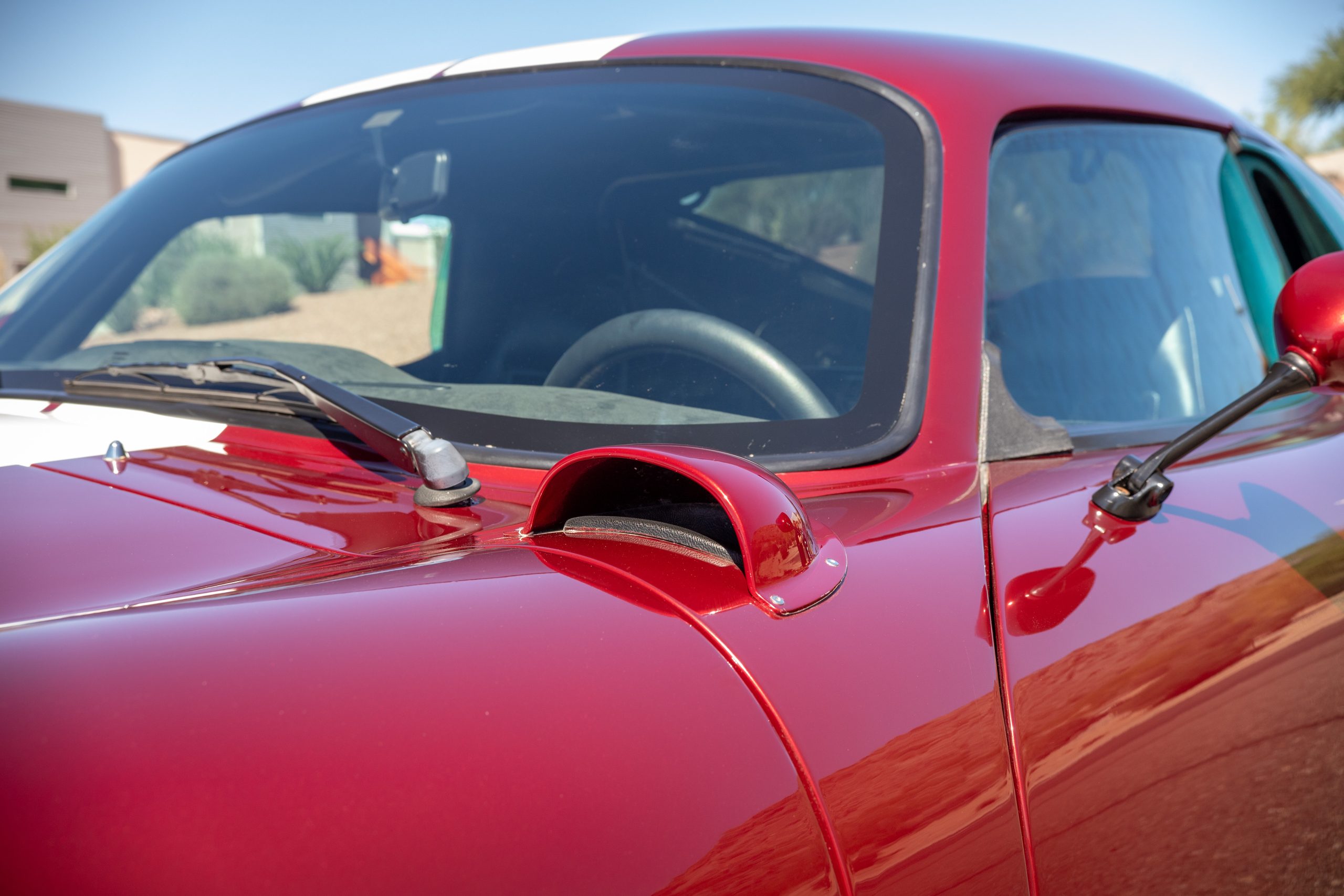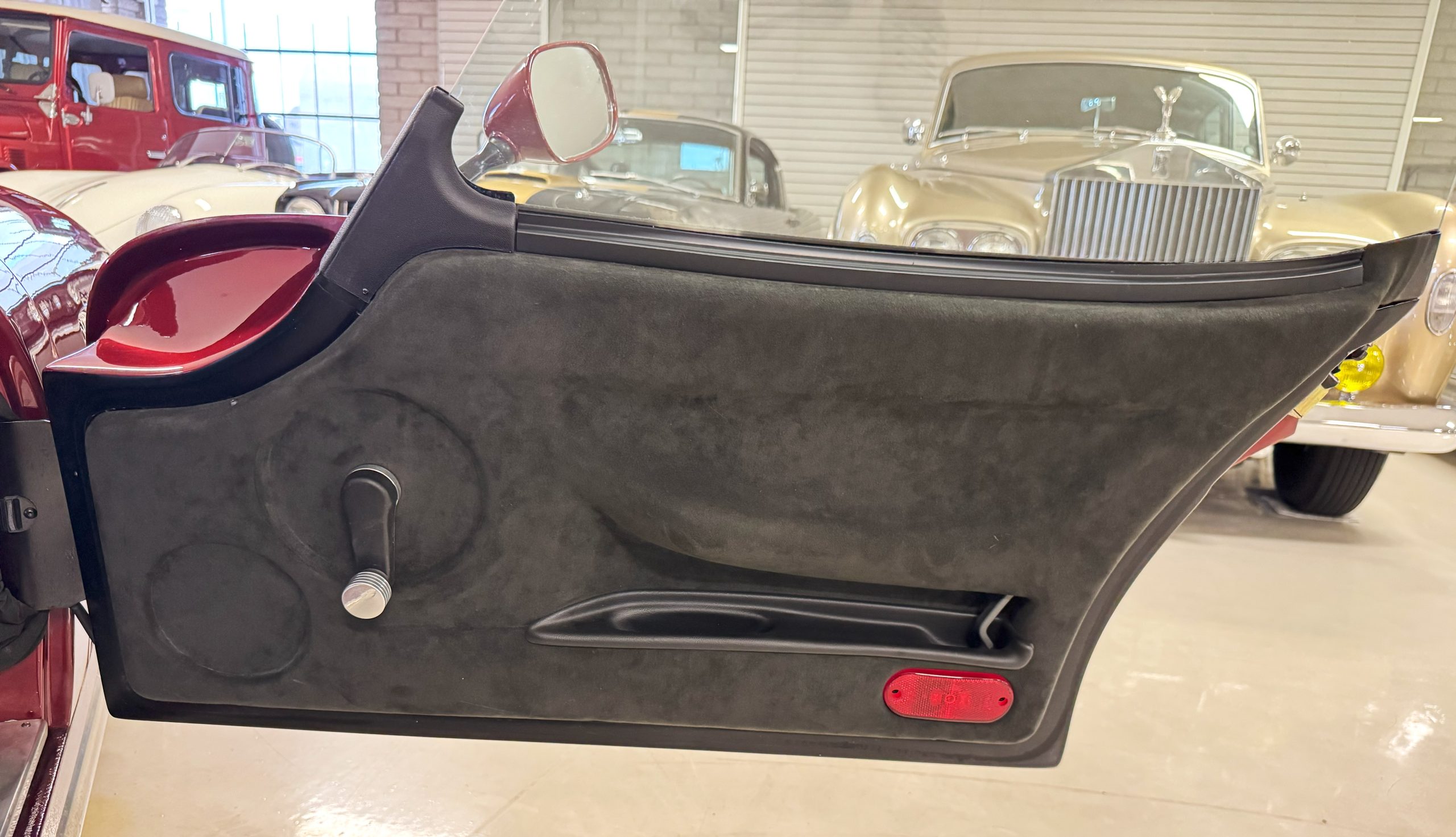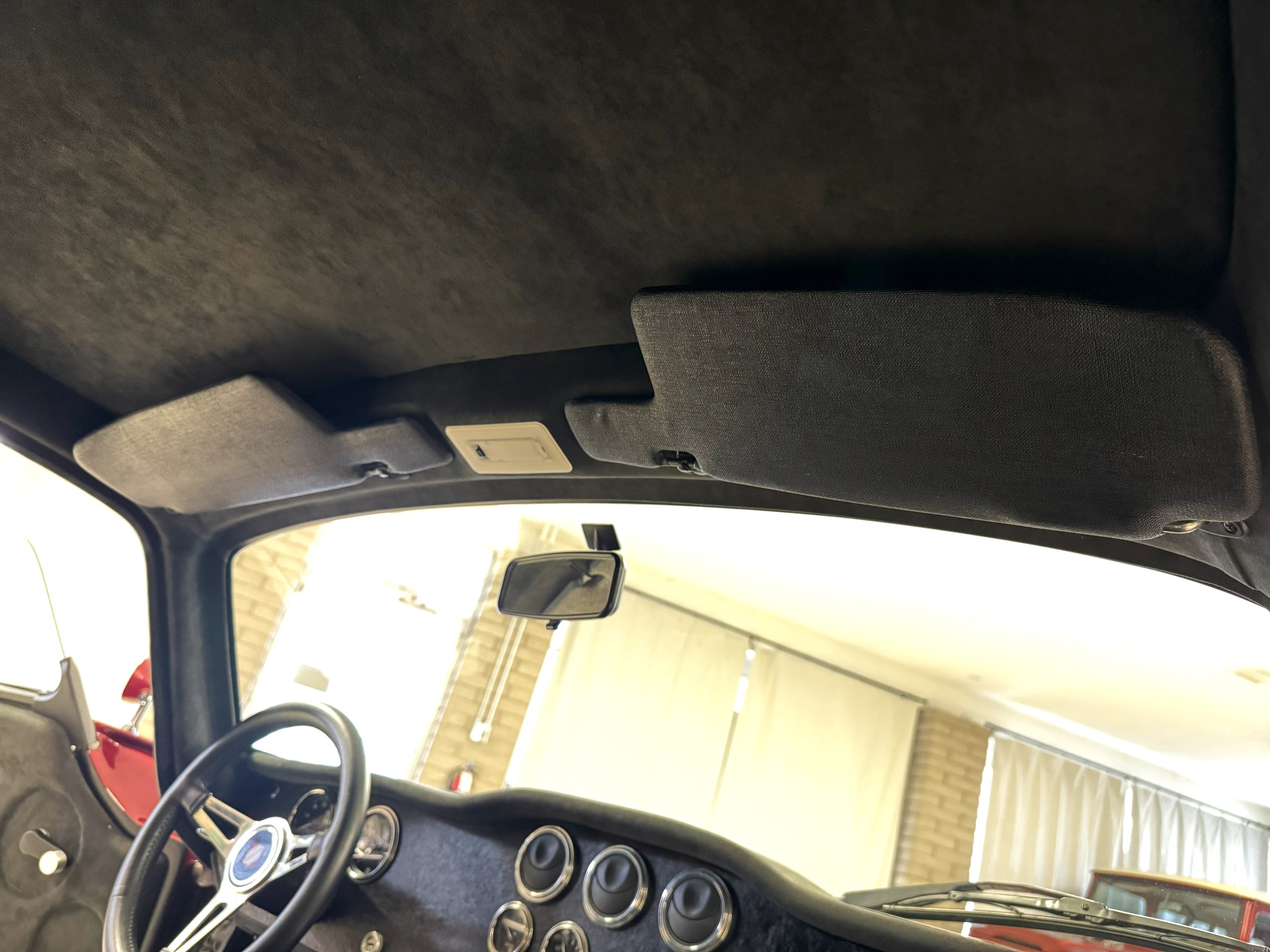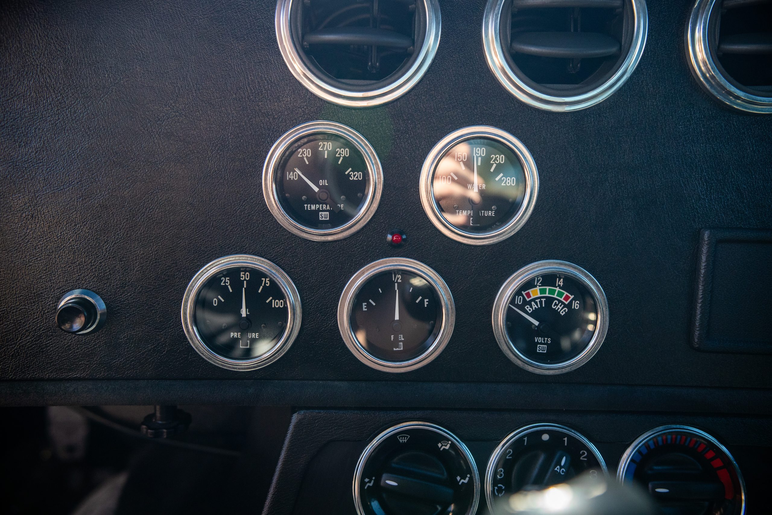 The interior is in excellent condition, reflecting careful use and climate-controlled storage. The interior features black leather sport seats with five-point harnesses, suede-like trim, dash fitted with chrome-rimmed Stewart Warner gauges and a three-spoke chrome steering wheel. All instruments are in working order. Air conditioning, recharged in September 2025, ensures comfort during extended road tours. The attention to detail throughout the cabin underscores the balance of authenticity and modern usability that defines the Superformance Coupe.