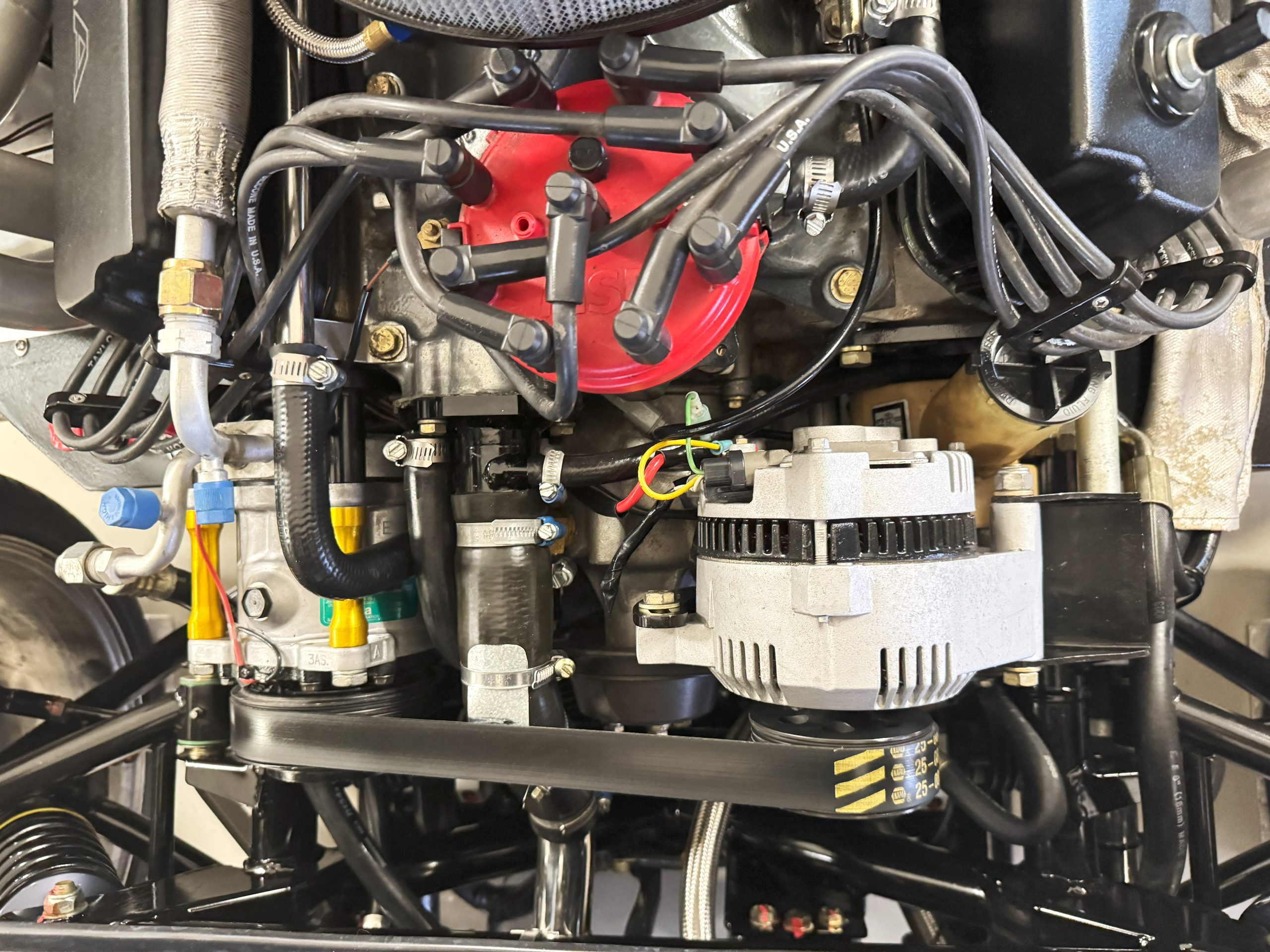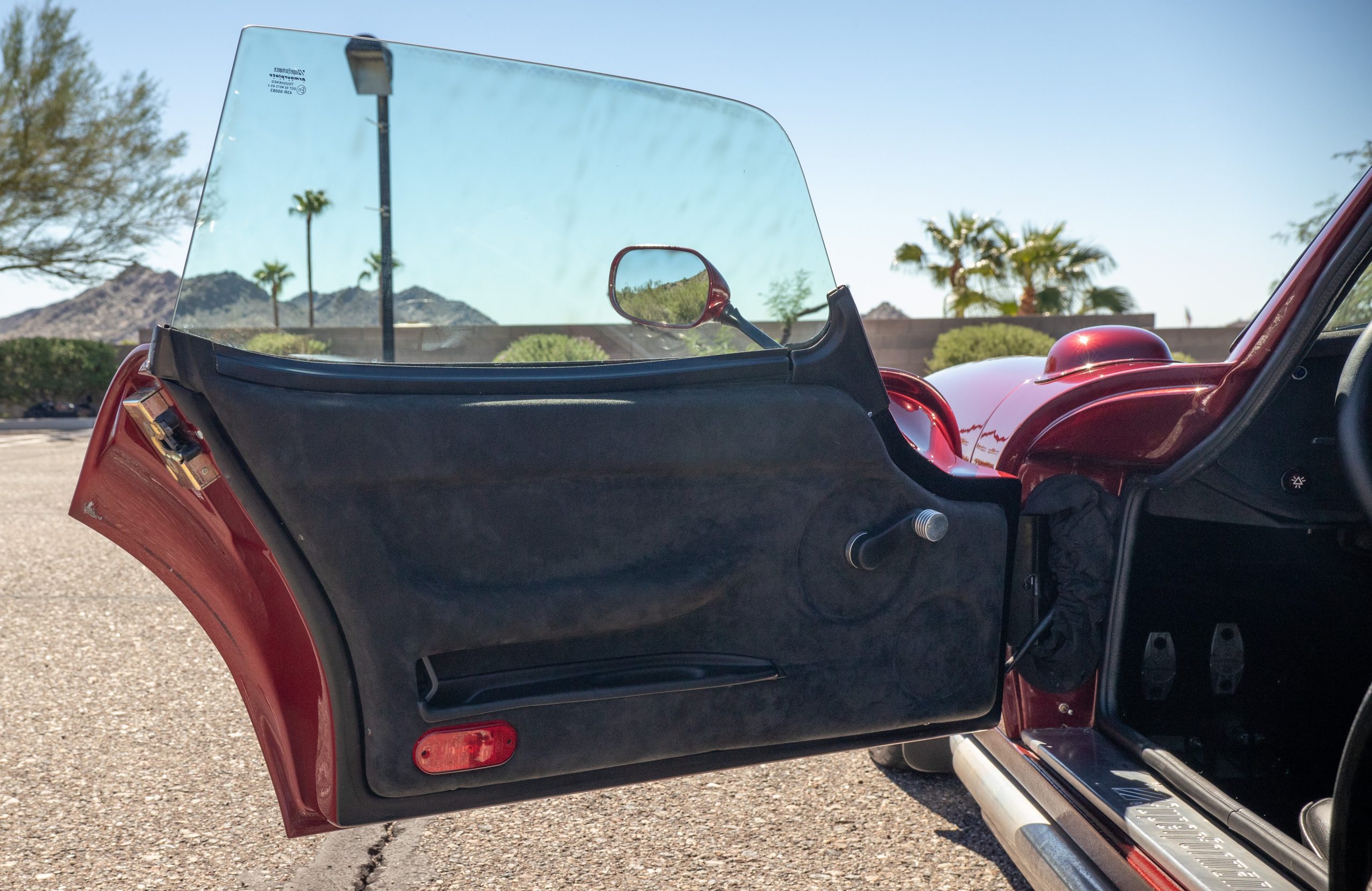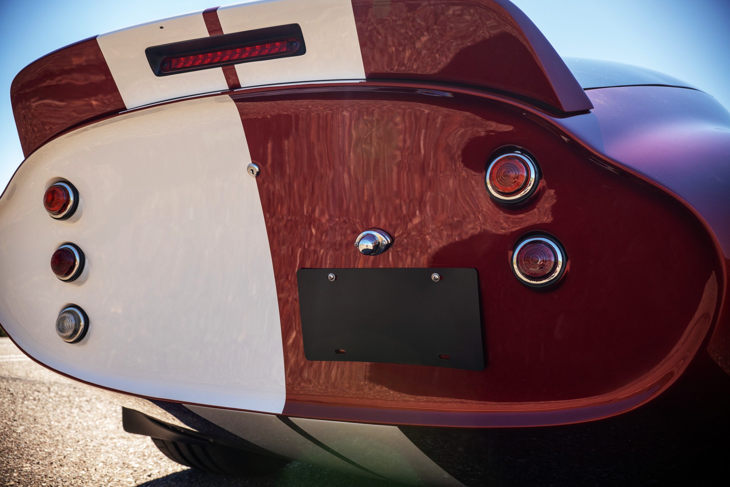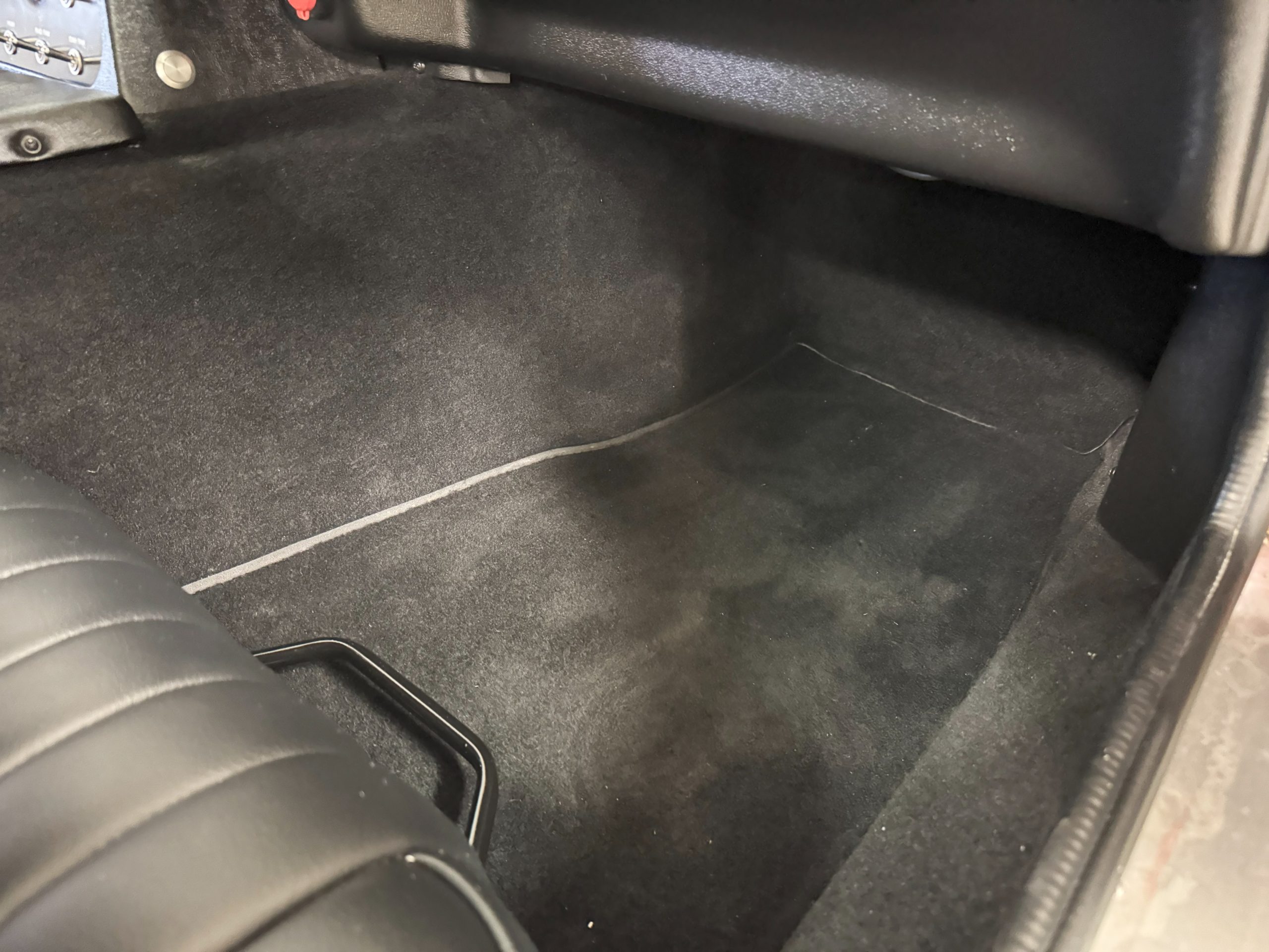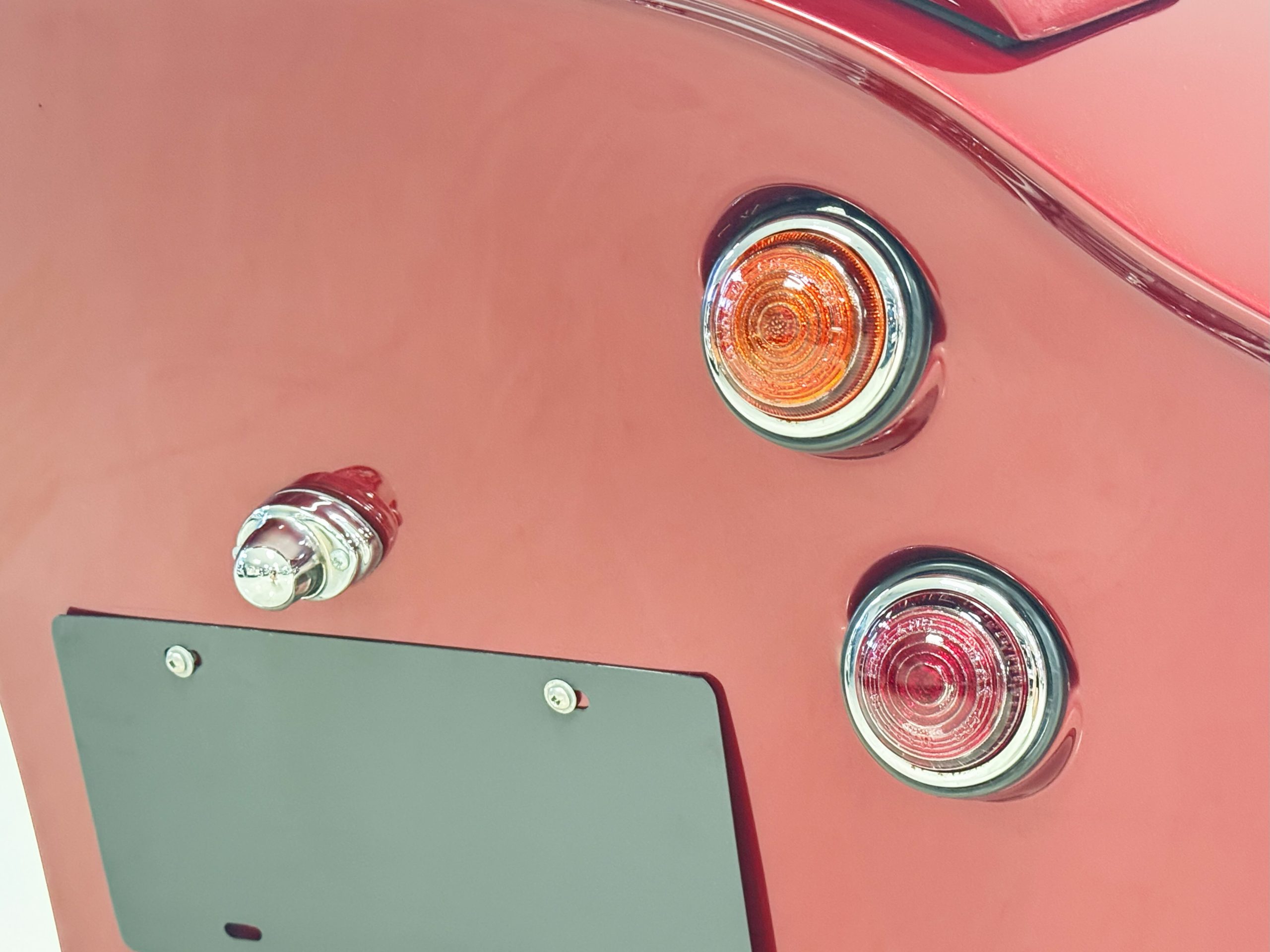 The interior is in excellent condition, reflecting careful use and climate-controlled storage. The interior features black leather sport seats with five-point harnesses, suede-like trim, dash fitted with chrome-rimmed Stewart Warner gauges and a three-spoke chrome steering wheel. All instruments are in working order. Air conditioning, recharged in September 2025, ensures comfort during extended road tours. The attention to detail throughout the cabin underscores the balance of authenticity and modern usability that defines the Superformance Coupe.