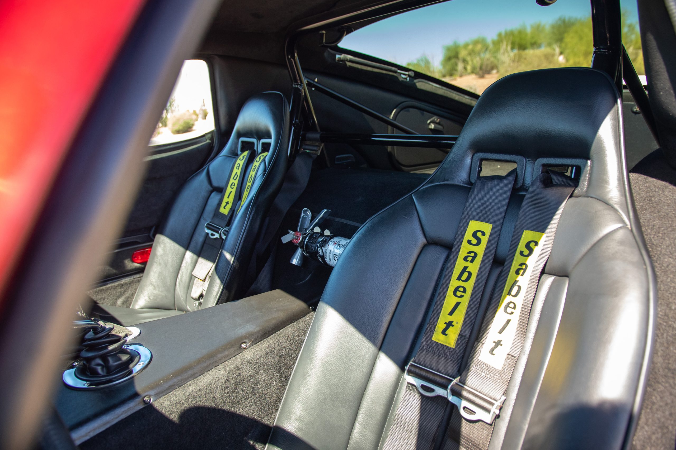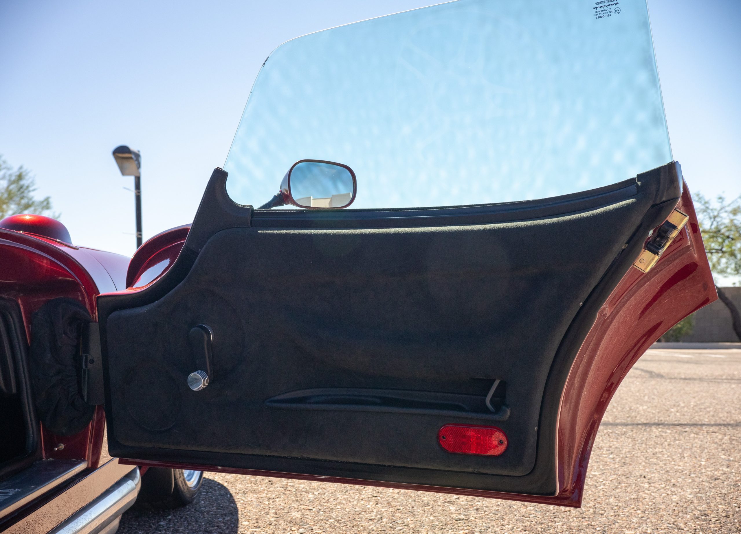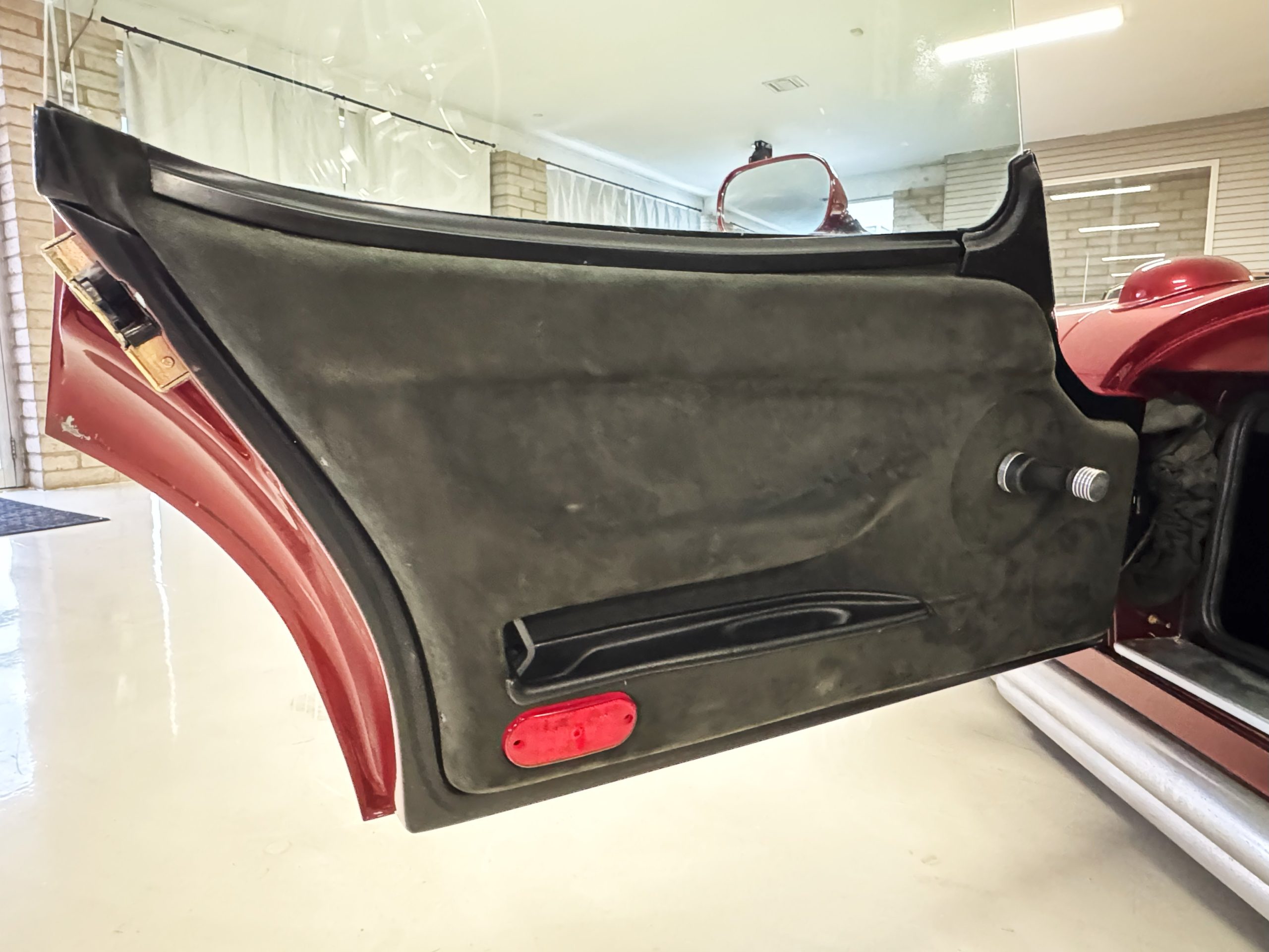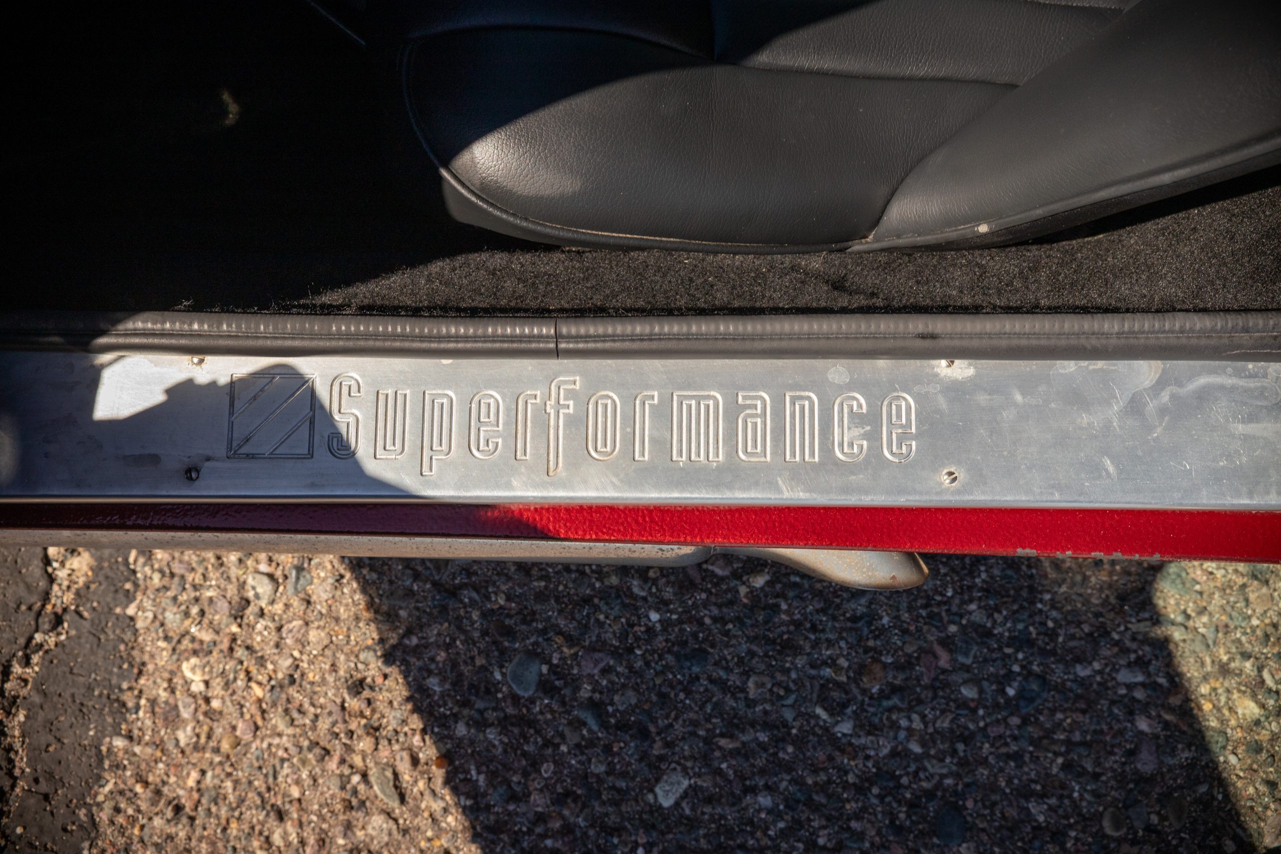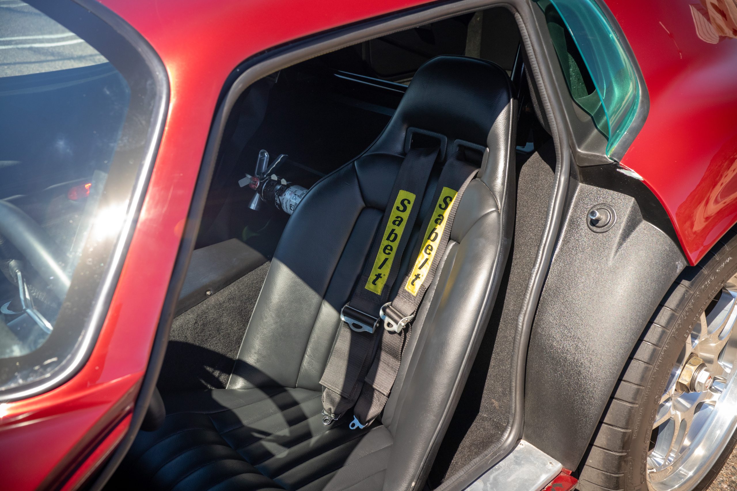 The interior is in excellent condition, reflecting careful use and climate-controlled storage. The interior features black leather sport seats with five-point harnesses, suede-like trim, dash fitted with chrome-rimmed Stewart Warner gauges and a three-spoke chrome steering wheel. All instruments are in working order. Air conditioning, recharged in September 2025, ensures comfort during extended road tours. The attention to detail throughout the cabin underscores the balance of authenticity and modern usability that defines the Superformance Coupe.