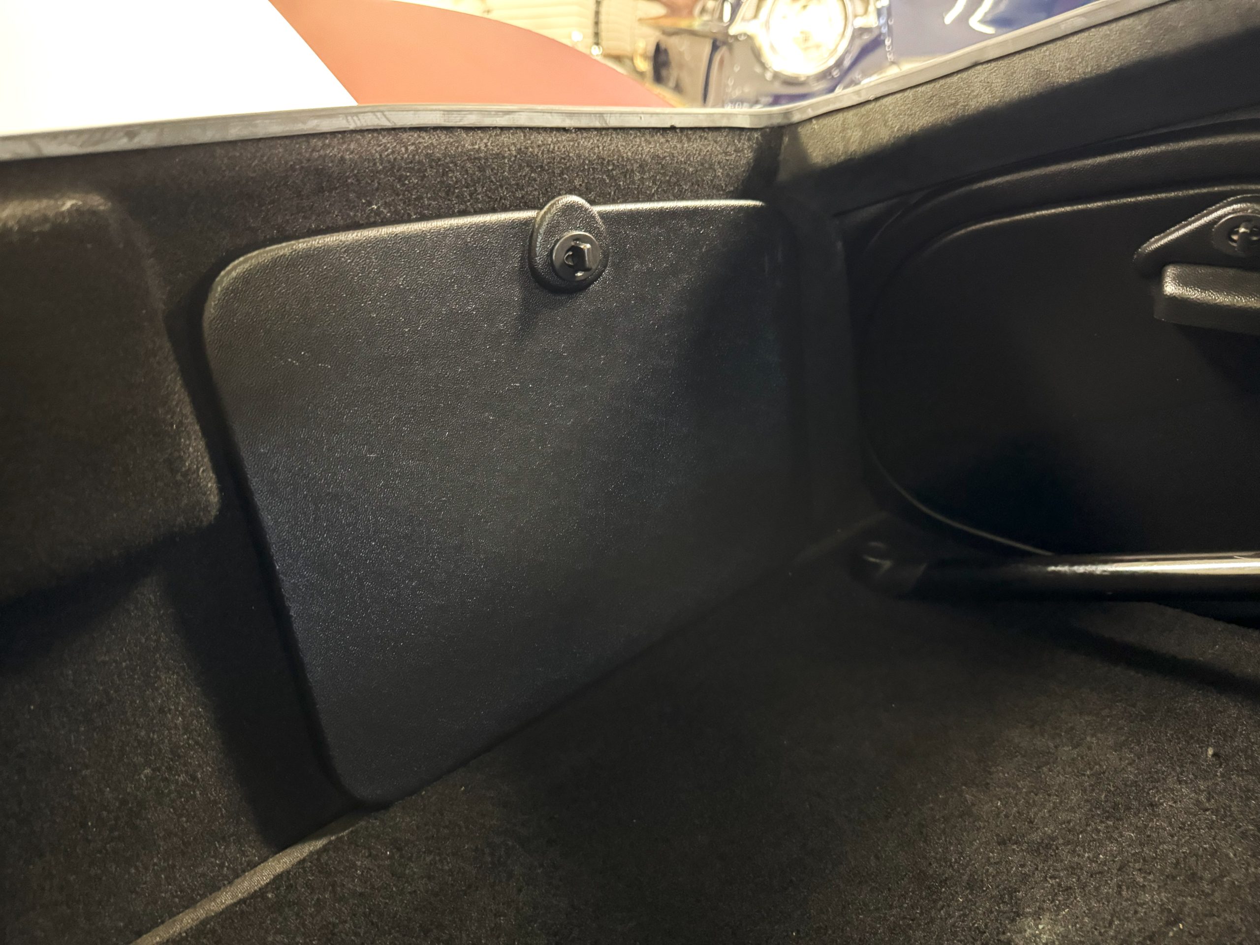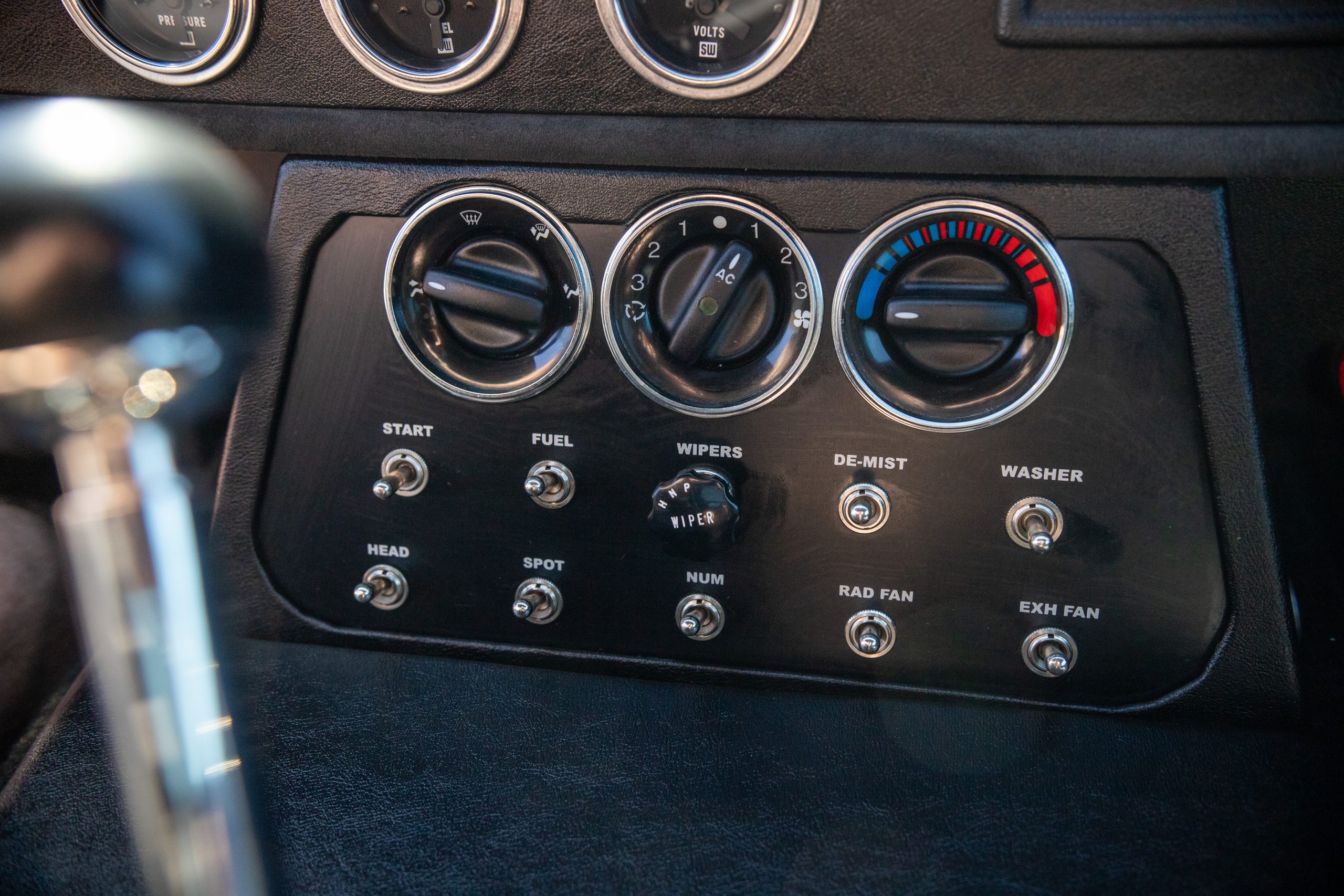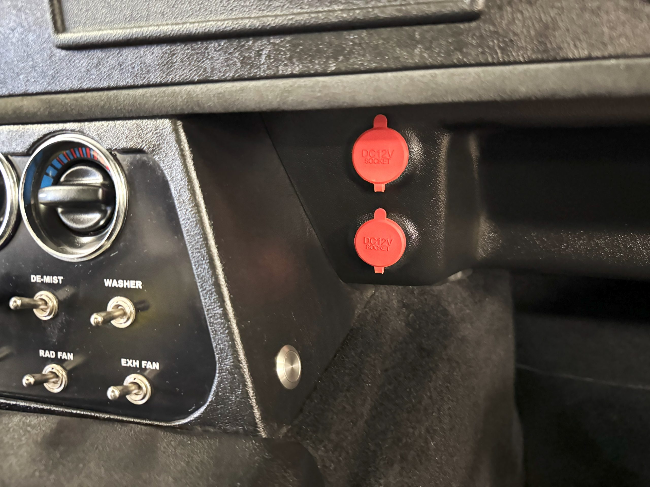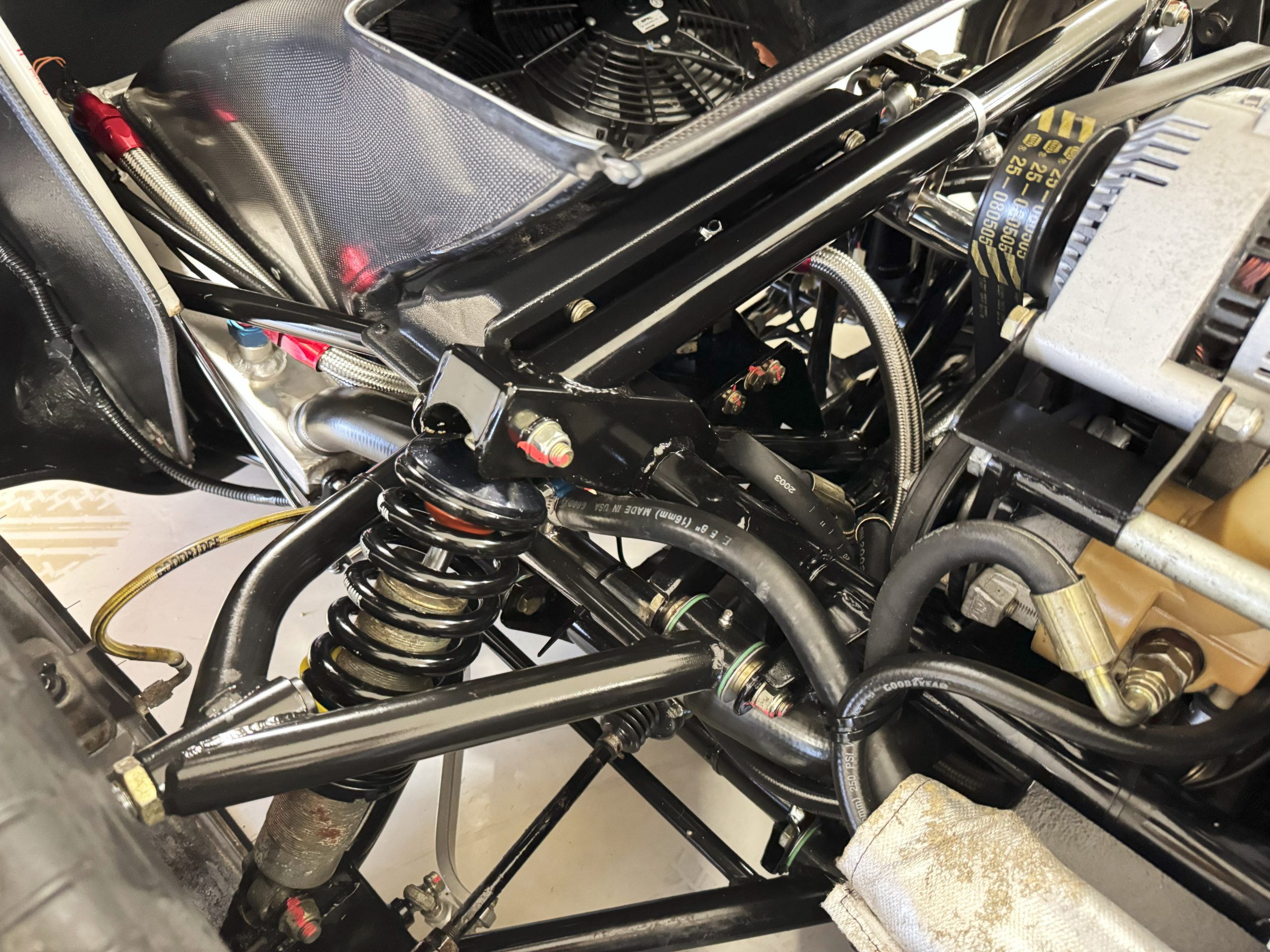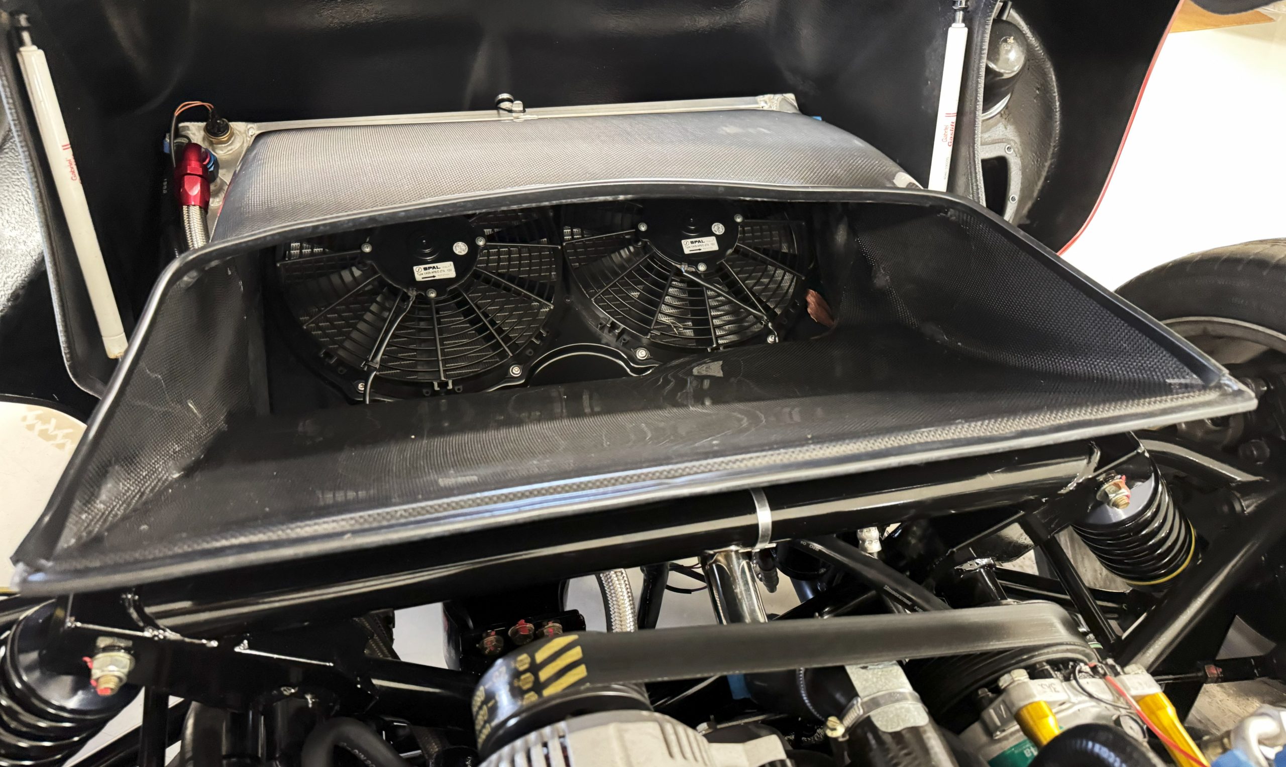 The interior is in excellent condition, reflecting careful use and climate-controlled storage. The interior features black leather sport seats with five-point harnesses, suede-like trim, dash fitted with chrome-rimmed Stewart Warner gauges and a three-spoke chrome steering wheel. All instruments are in working order. Air conditioning, recharged in September 2025, ensures comfort during extended road tours. The attention to detail throughout the cabin underscores the balance of authenticity and modern usability that defines the Superformance Coupe.