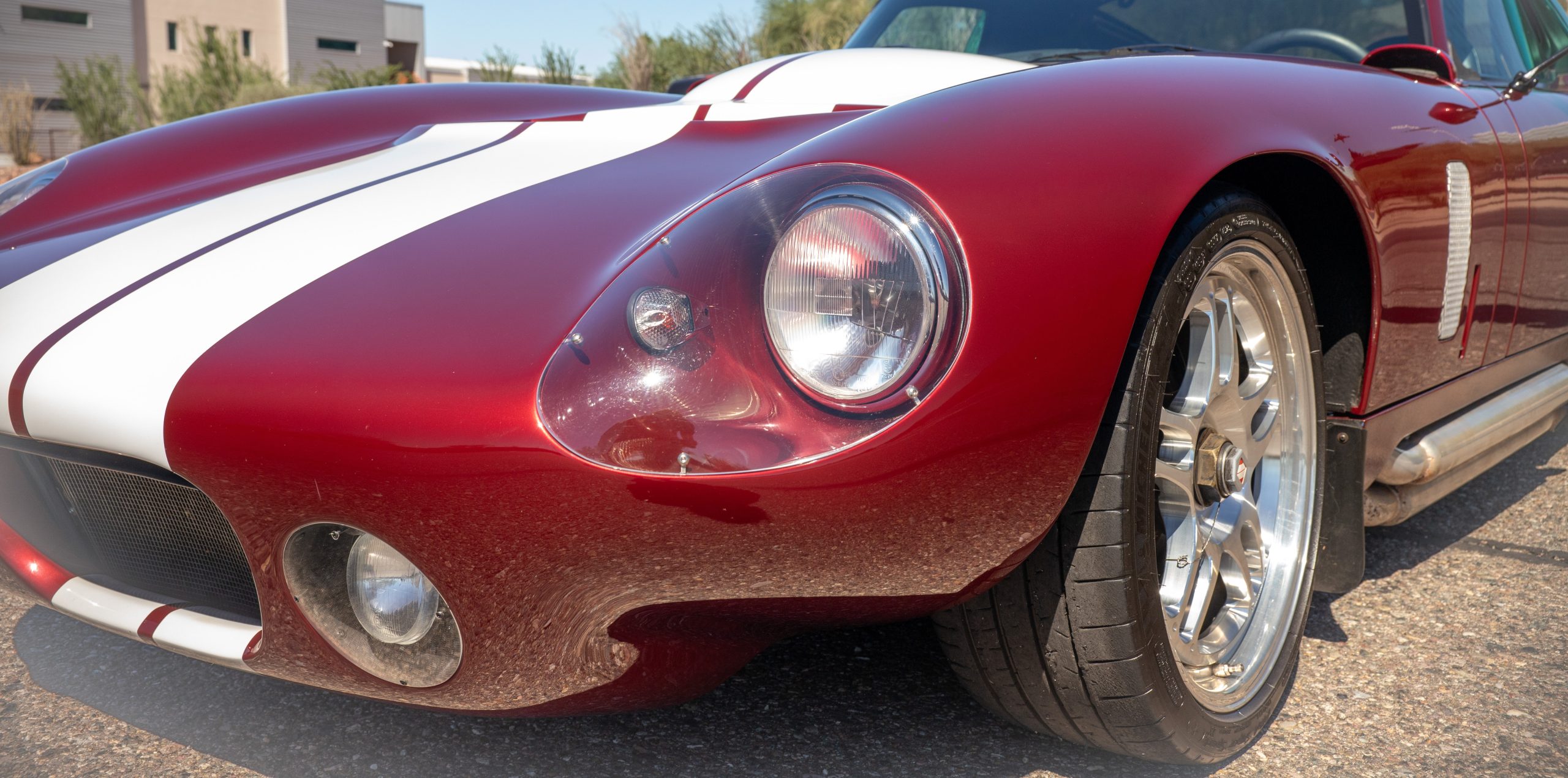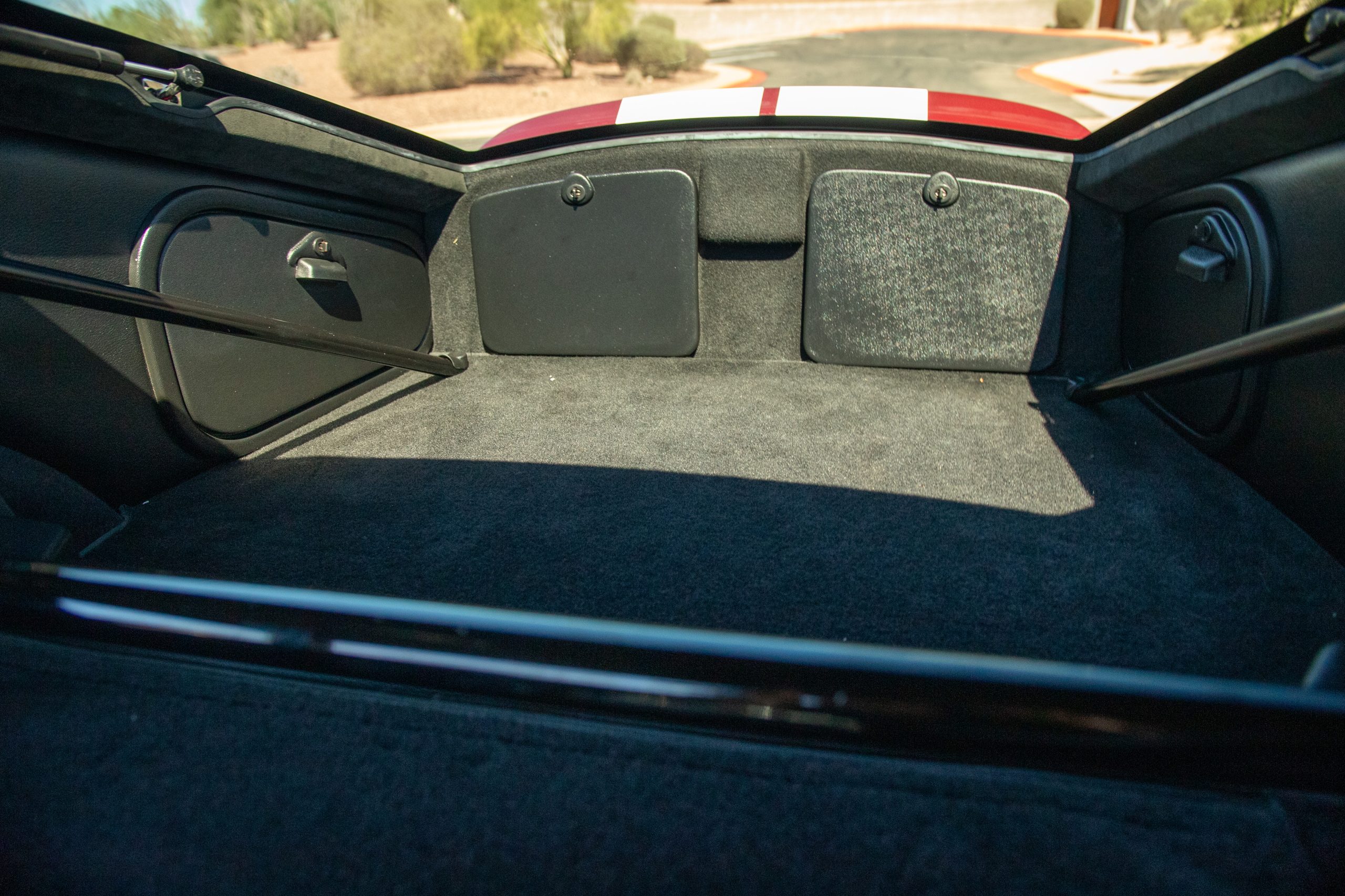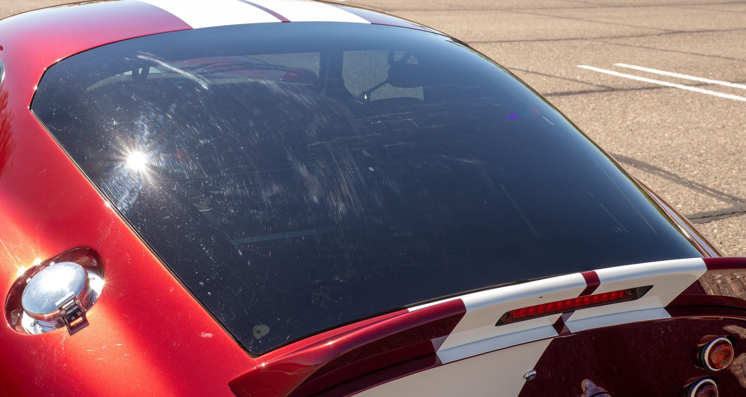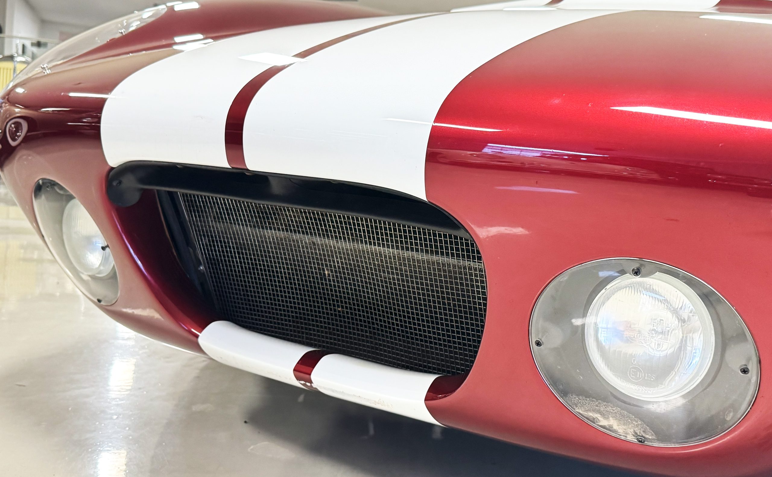 The exterior finish of Sunset Red with double white stripes is in overall great condition, presenting with a deep, high-gloss luster befitting a low-mileage example. The trim, chrome and glass are in excellent overall condition. This Coupe has many BRE upgrades including 18-inch front and rear wheels, spare wheel kit, Cobra Daytona mirrors, headlights, and polycarbonate rear window kit, and headlight and driving light lens kit. The Daytona is accompanied by its original wheels, knock-off hubs and Superformance car cover.