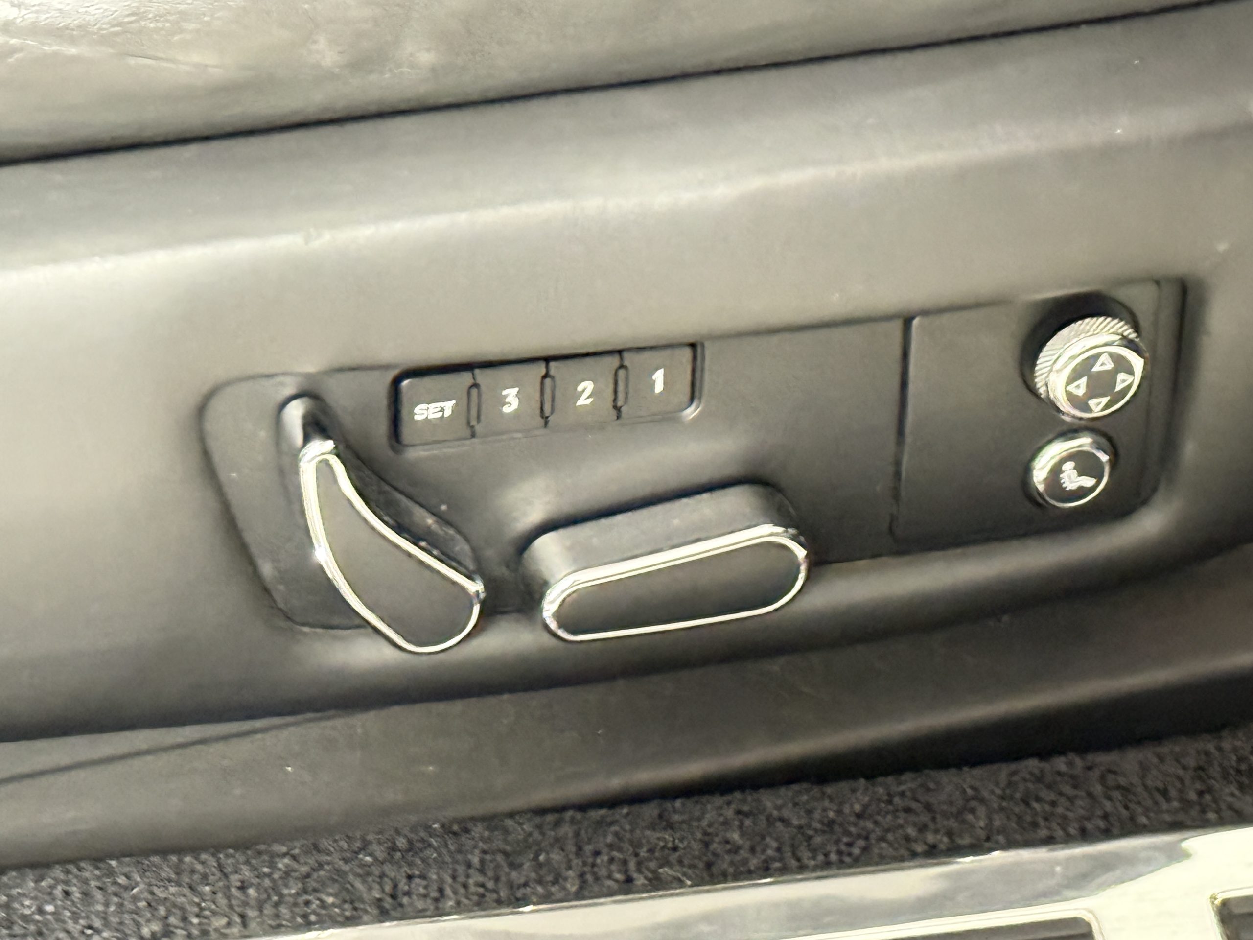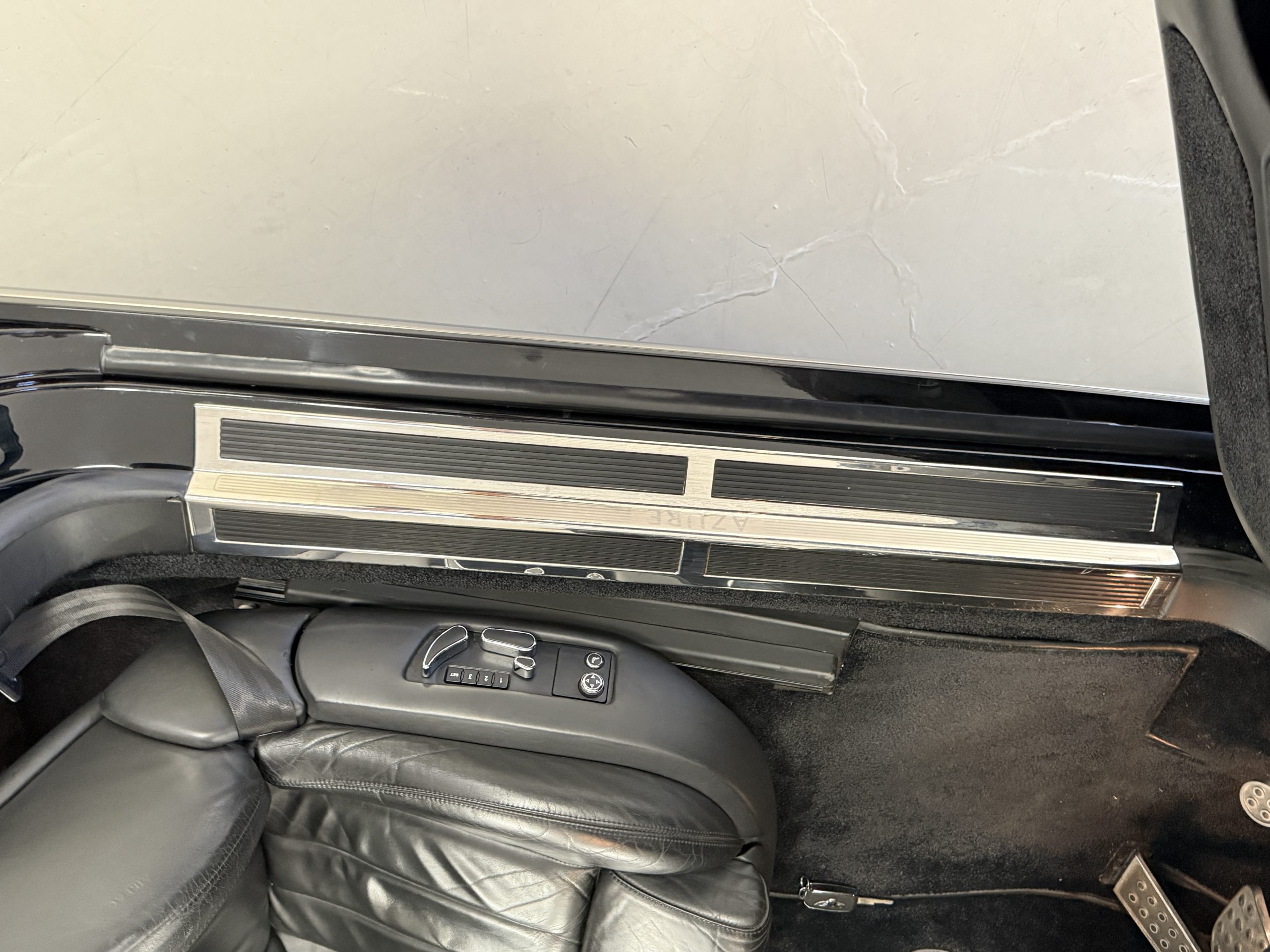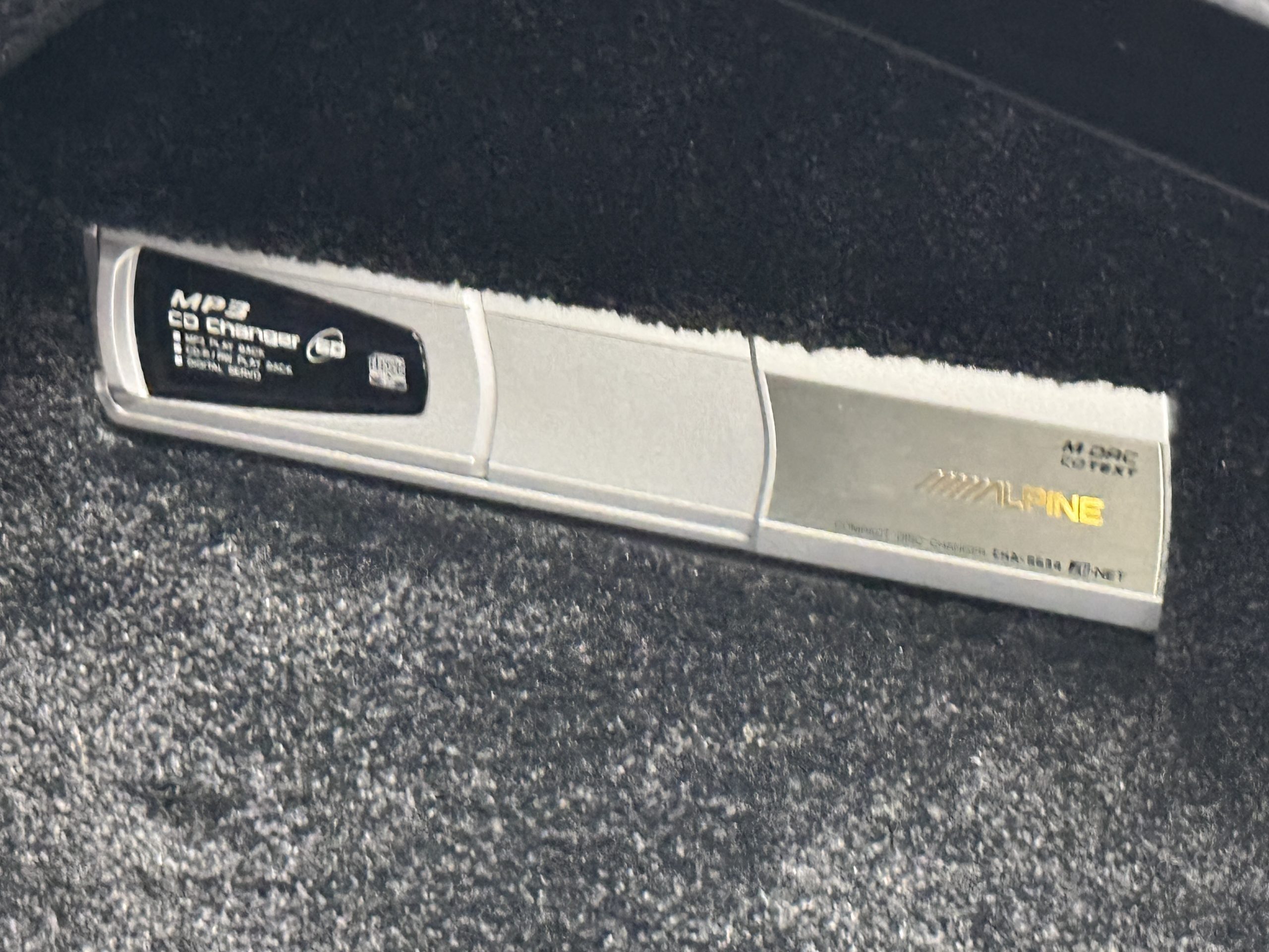 Beluga leather trims the seats and extends to the dashboard, armrests, and door panel inserts, while burl walnut wood veneers accent the cabin. The heated, massaging, and 14-way power-adjustable front seats have three-way position memory settings, and appointments include multi-zone climate control, cruise control, drilled aluminum foot pedals, a pop-up navigation screen, and an Alpine high-end sound system consisting of a head unit linked to a trunk-mounted six-disc CD changer and a subwoofer with a multi-channel amplifier.