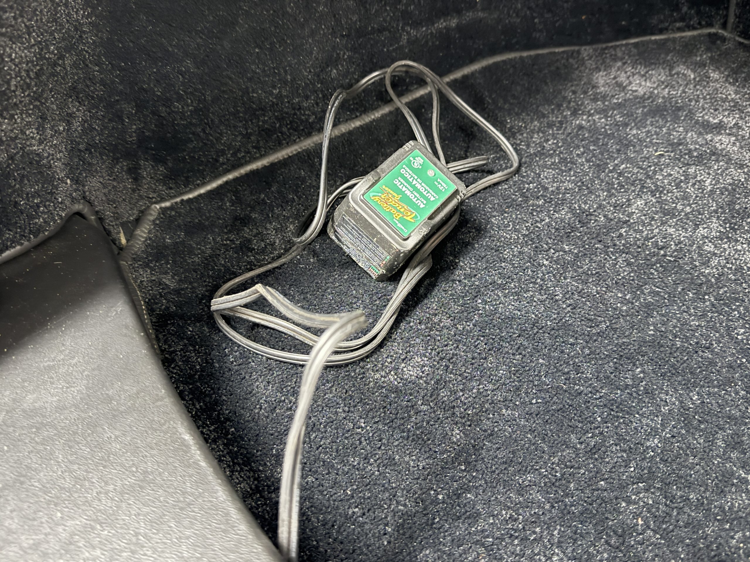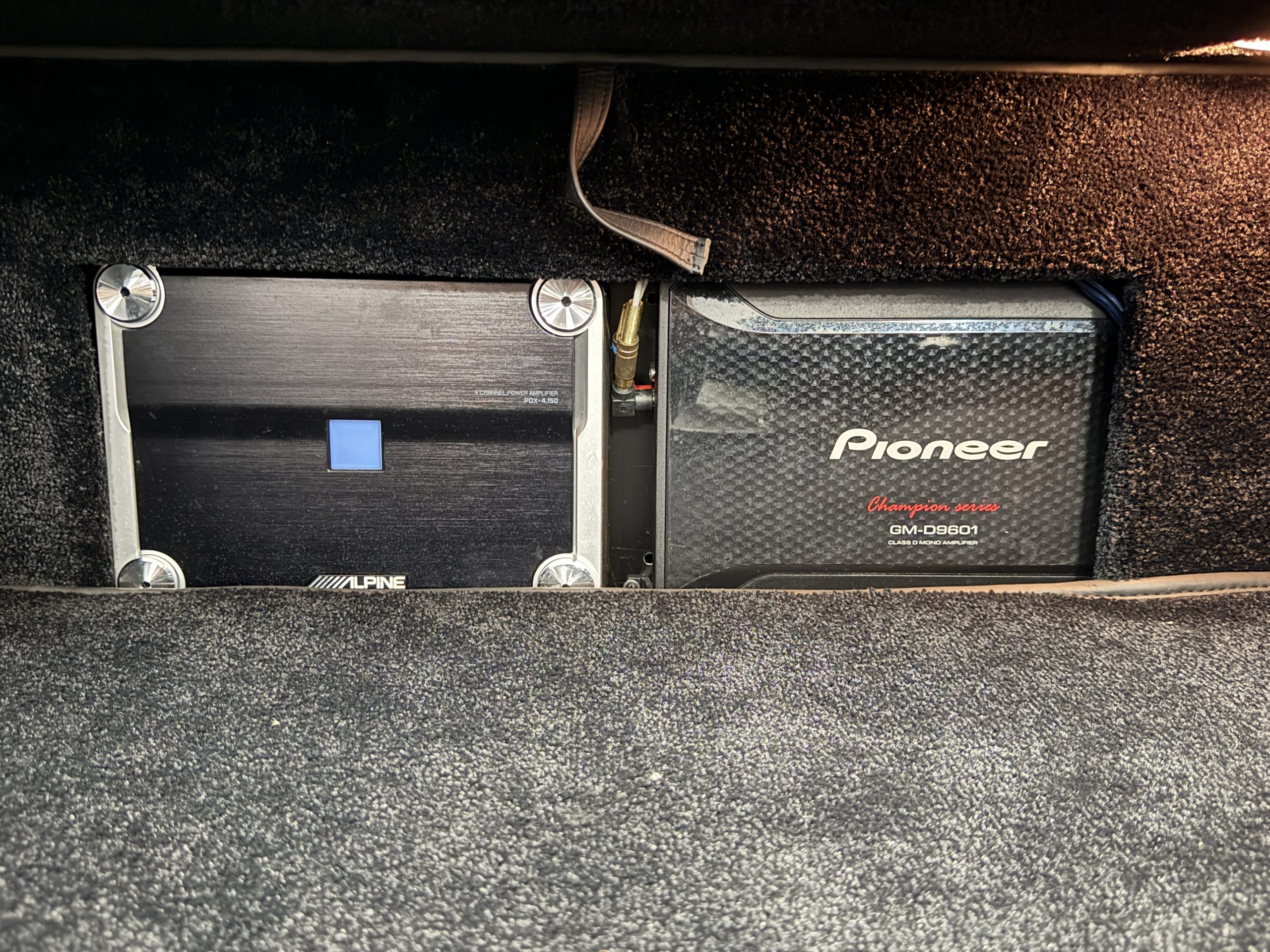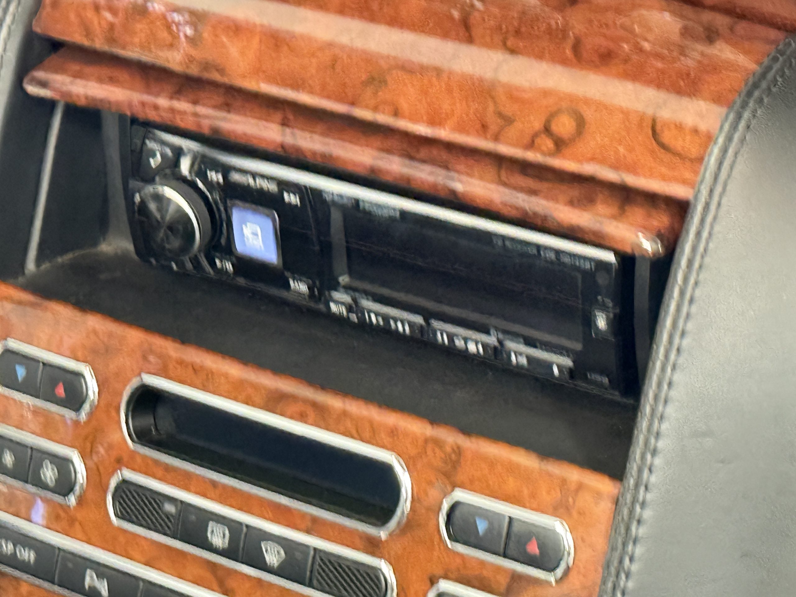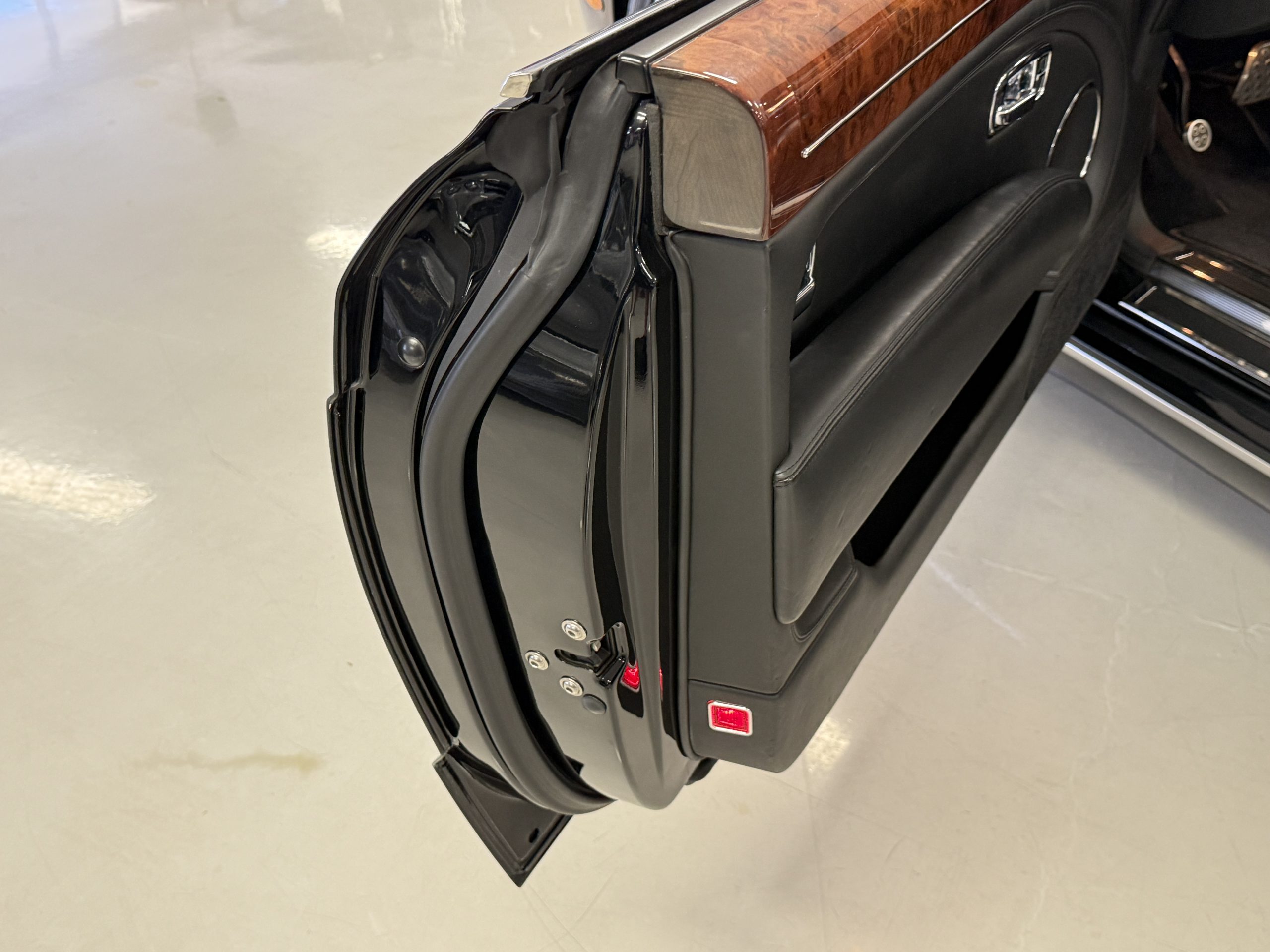 Beluga leather trims the seats and extends to the dashboard, armrests, and door panel inserts, while burl walnut wood veneers accent the cabin. The heated, massaging, and 14-way power-adjustable front seats have three-way position memory settings, and appointments include multi-zone climate control, cruise control, drilled aluminum foot pedals, a pop-up navigation screen, and an Alpine high-end sound system consisting of a head unit linked to a trunk-mounted six-disc CD changer and a subwoofer with a multi-channel amplifier.