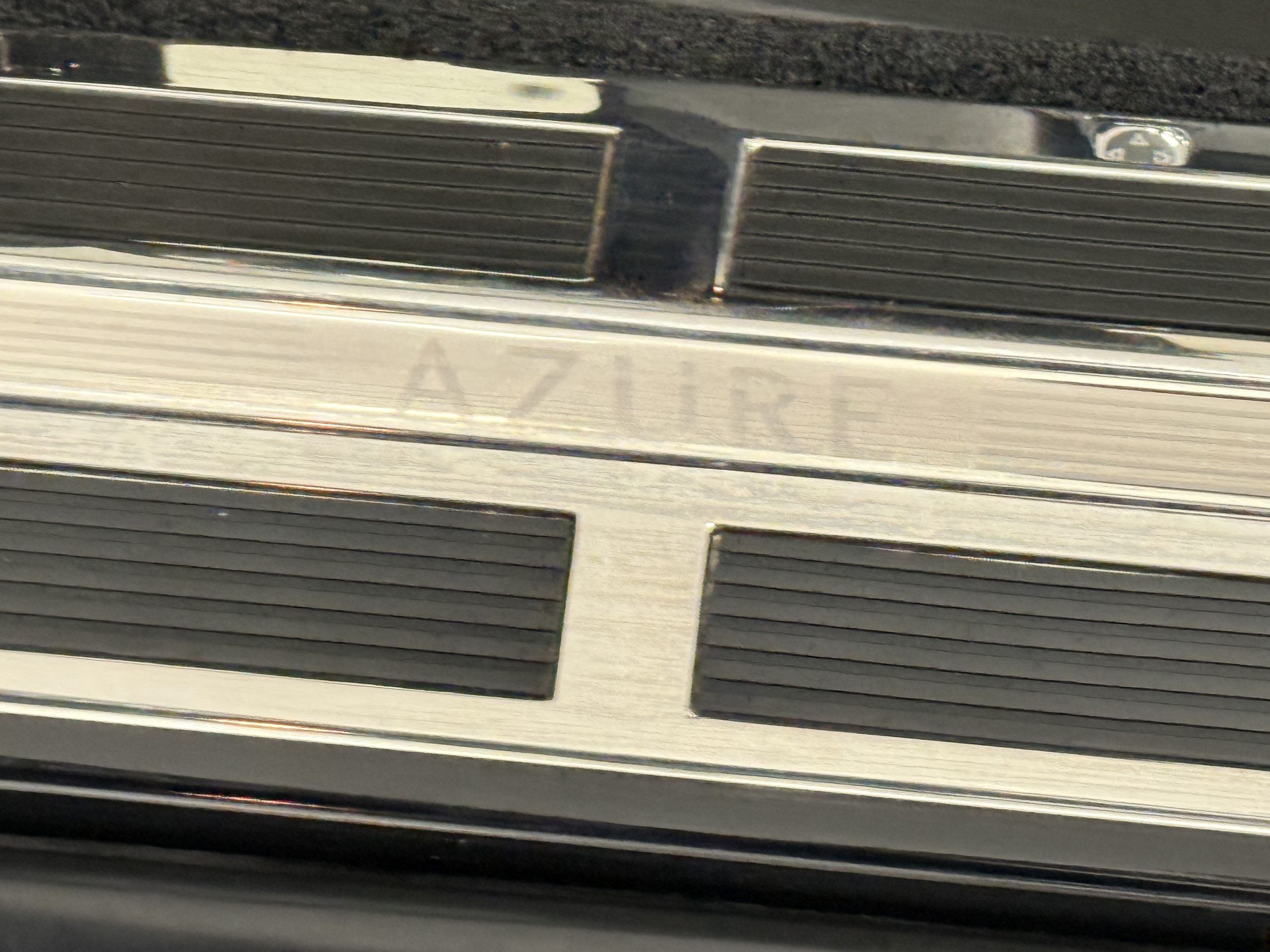 Chrome-finished 19″ 12-spoke alloy wheels are mounted with 255/45 Pirelli P Zero Asimmetrico tires. The car rides on an electronically controlled adaptive suspension, and braking is provided by ventilated discs at all four corners.
