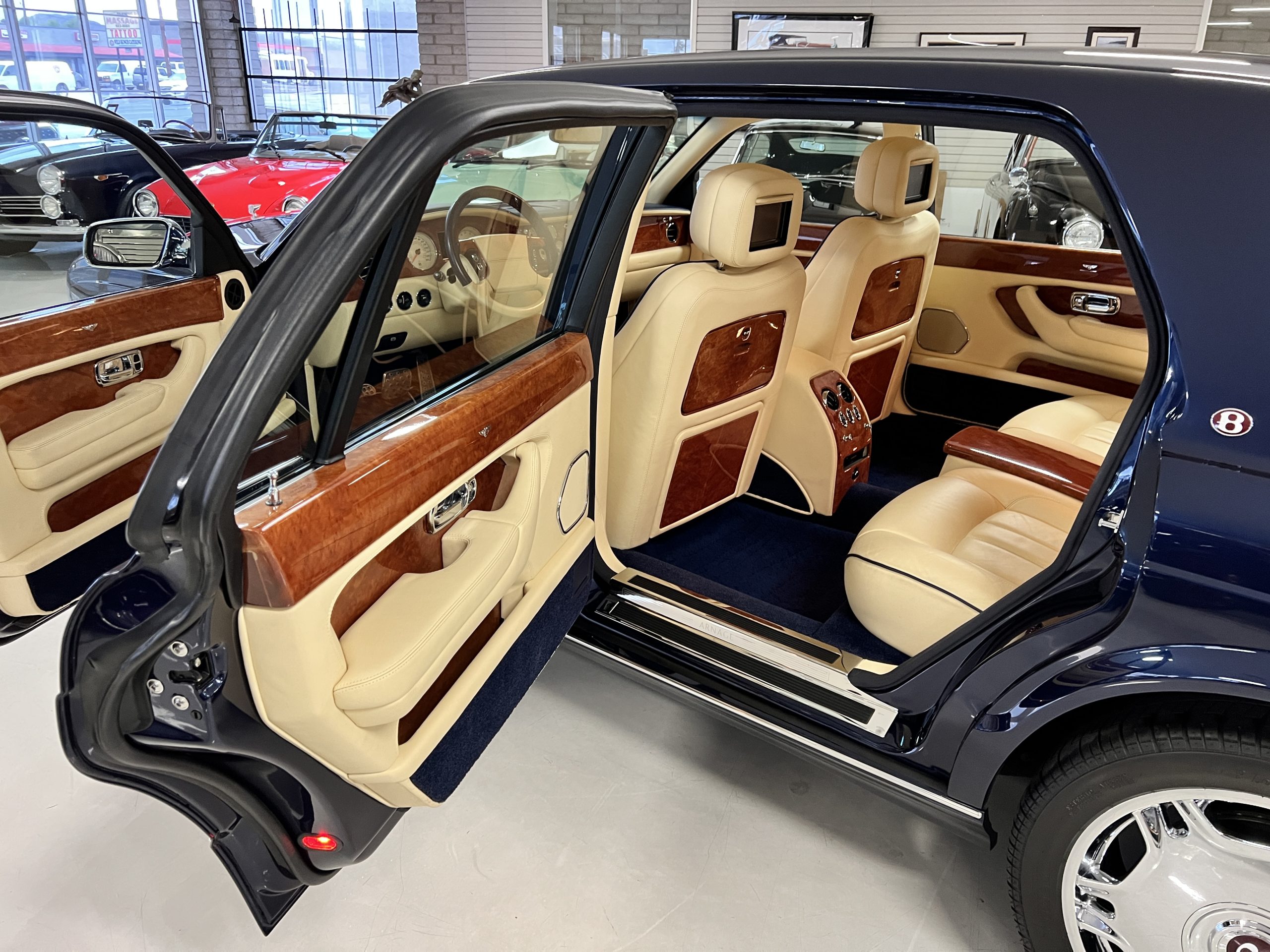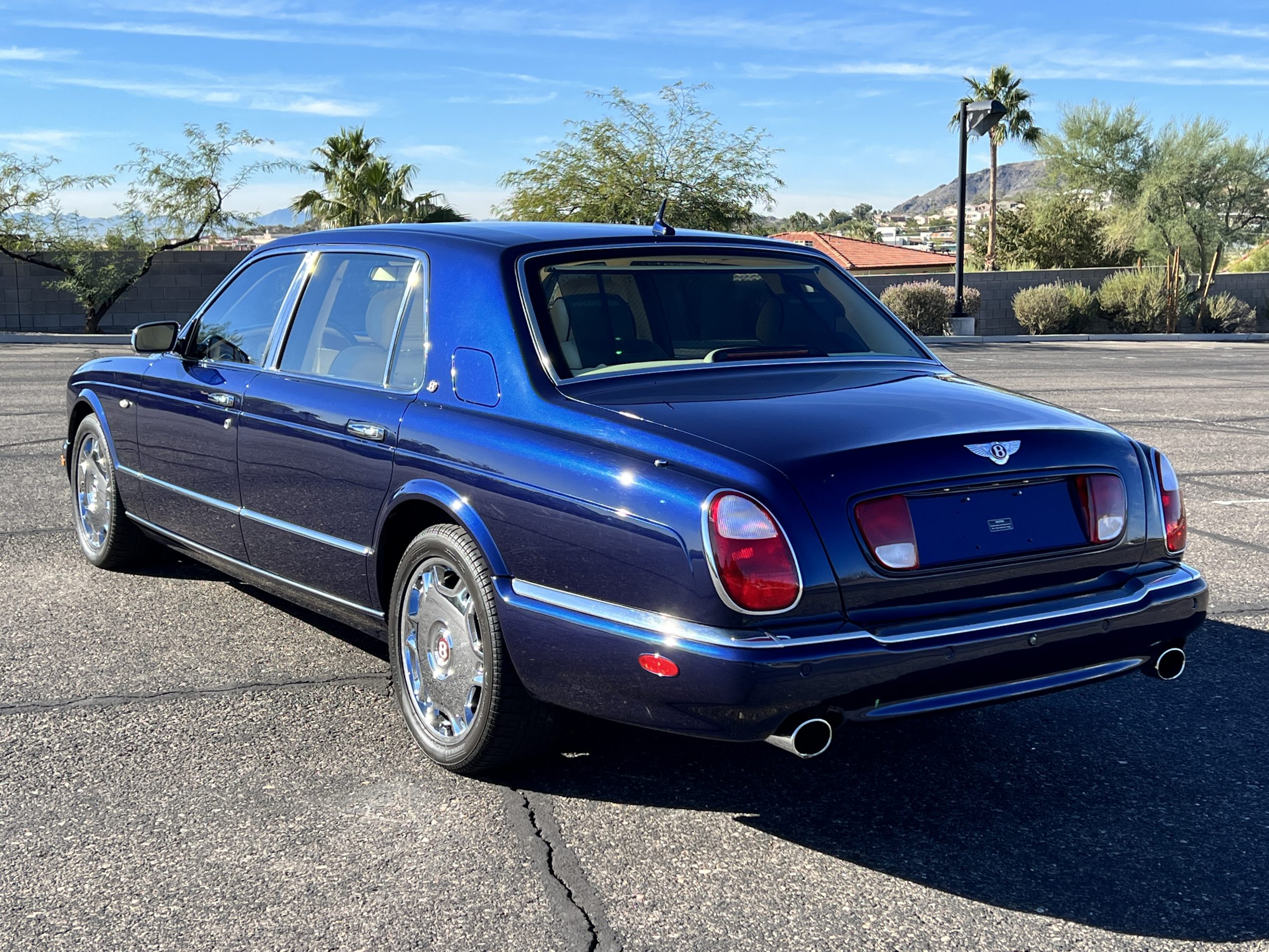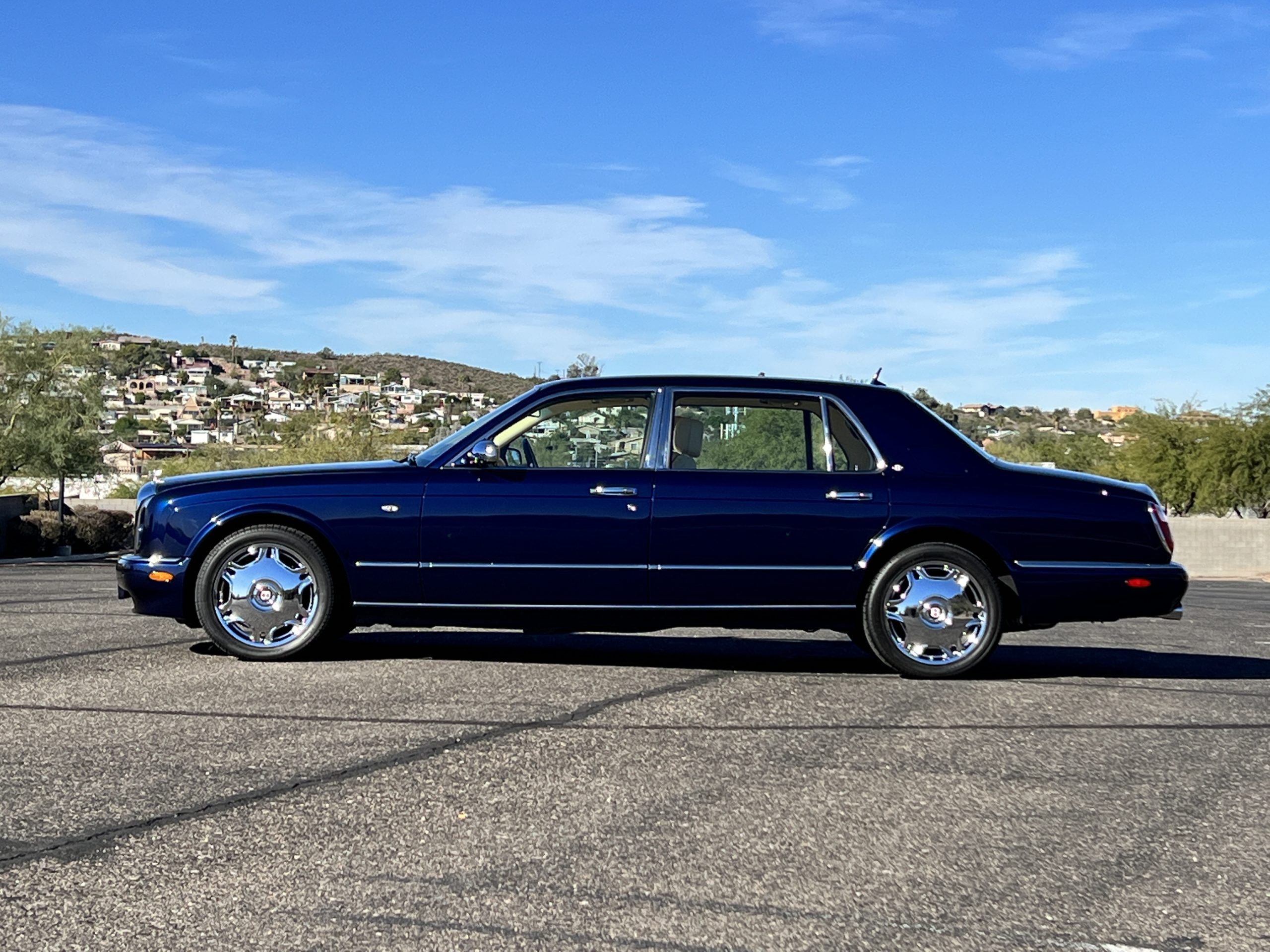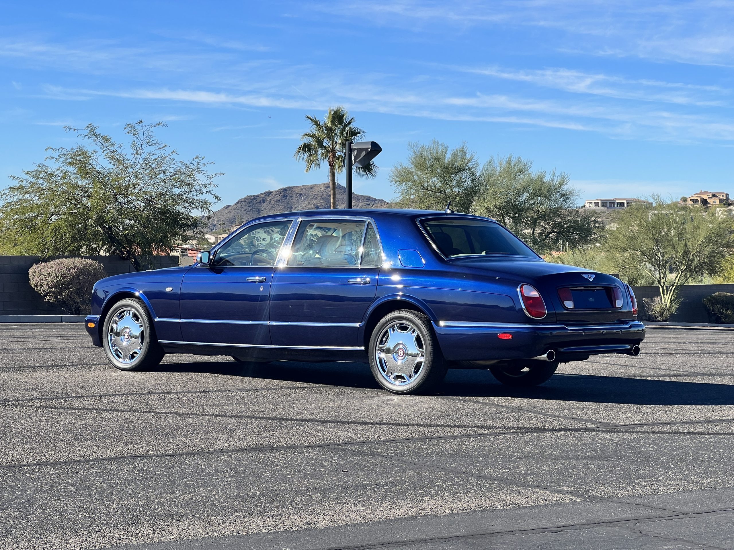 Featured in Peacock Blue (Paint Code 146506) livery, this Bentley is stunning with its 19” chrome wheels and chrome grill surround, matrix grill inserts and the Flying B mascot. The paint is in gorgeous condition with no noticed defects. The RL (LWB) Arnages were about 10 inches longer than a standard Arnage and the extra length was added in the front door, rear door and C-pillar to provide the same proportions overall as an Arnage. The look is absolutely fabulous.