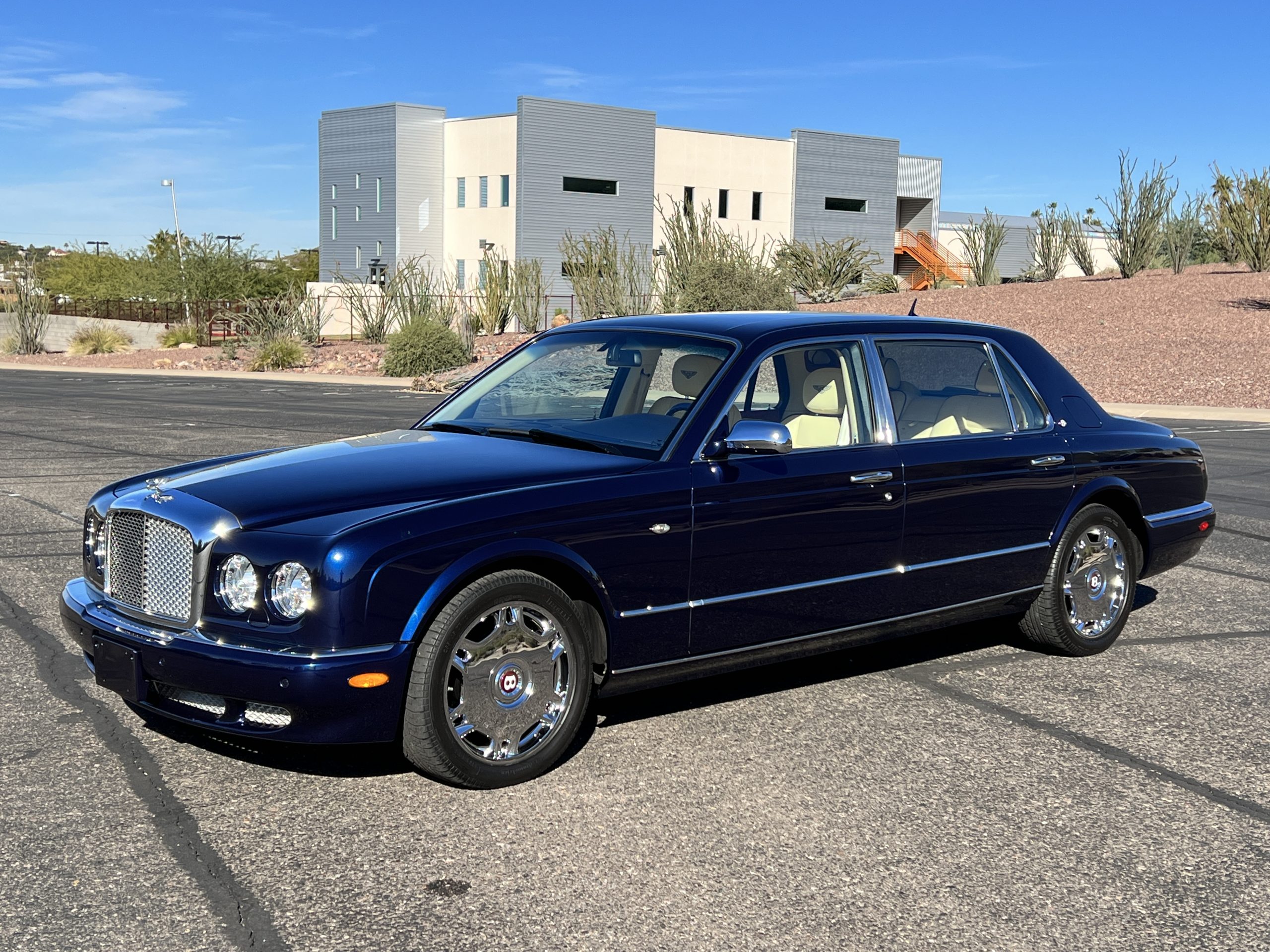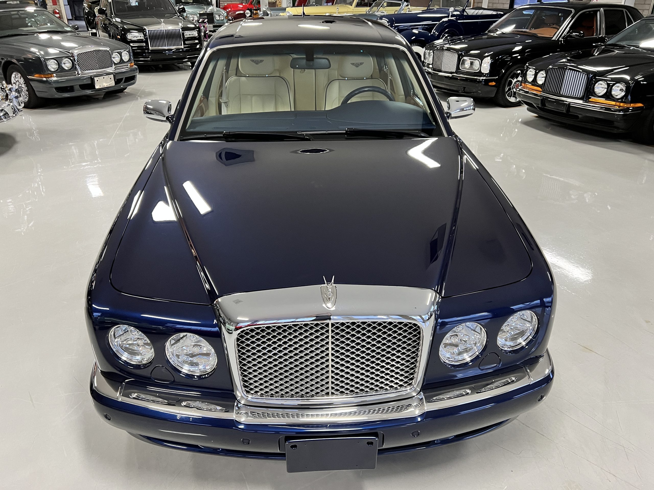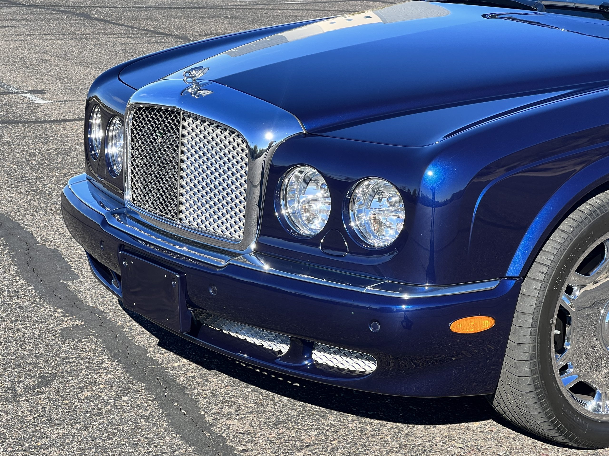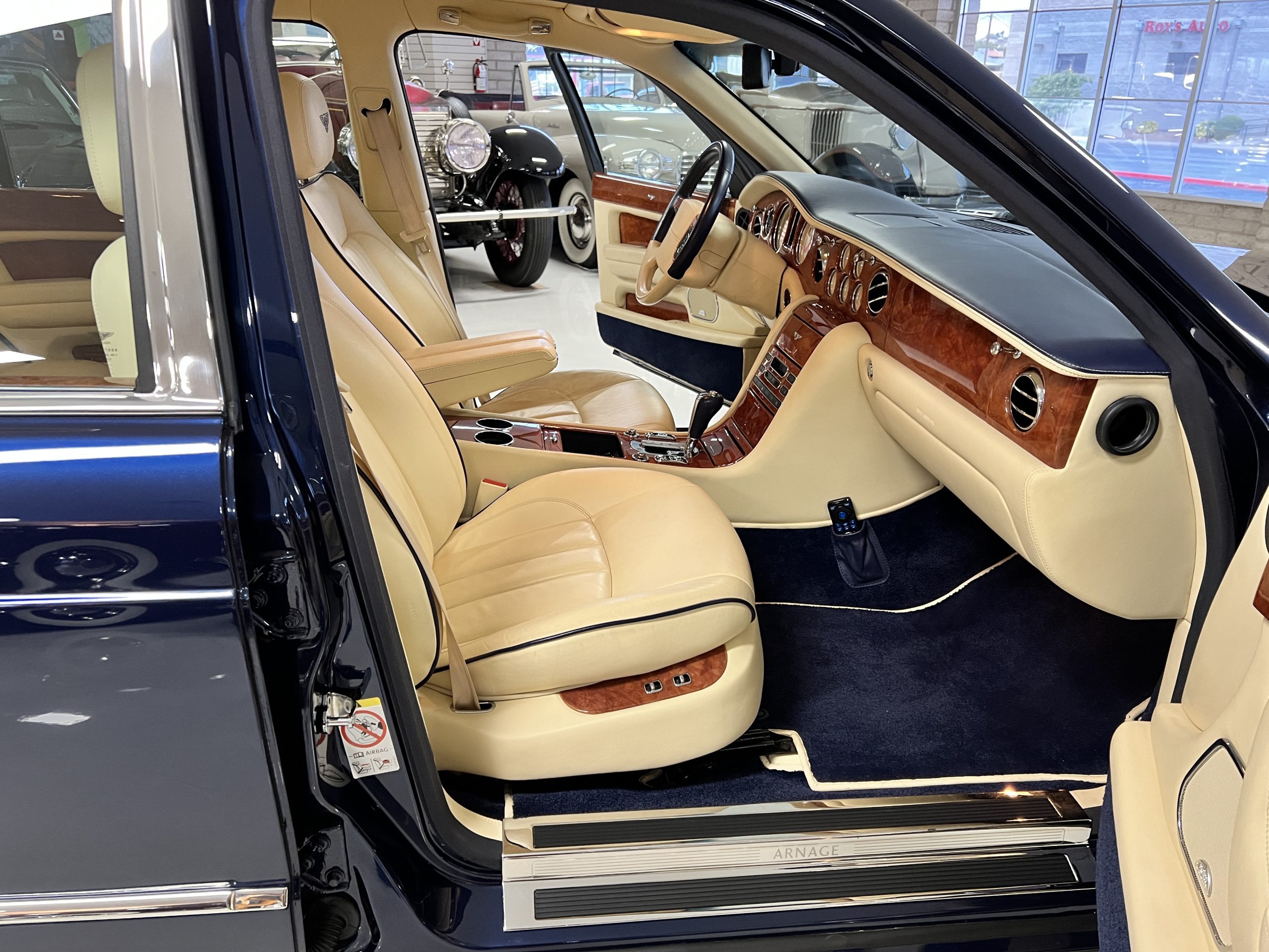 Featured in Peacock Blue (Paint Code 146506) livery, this Bentley is stunning with its 19” chrome wheels and chrome grill surround, matrix grill inserts and the Flying B mascot. The paint is in gorgeous condition with no noticed defects. The RL (LWB) Arnages were about 10 inches longer than a standard Arnage and the extra length was added in the front door, rear door and C-pillar to provide the same proportions overall as an Arnage. The look is absolutely fabulous.