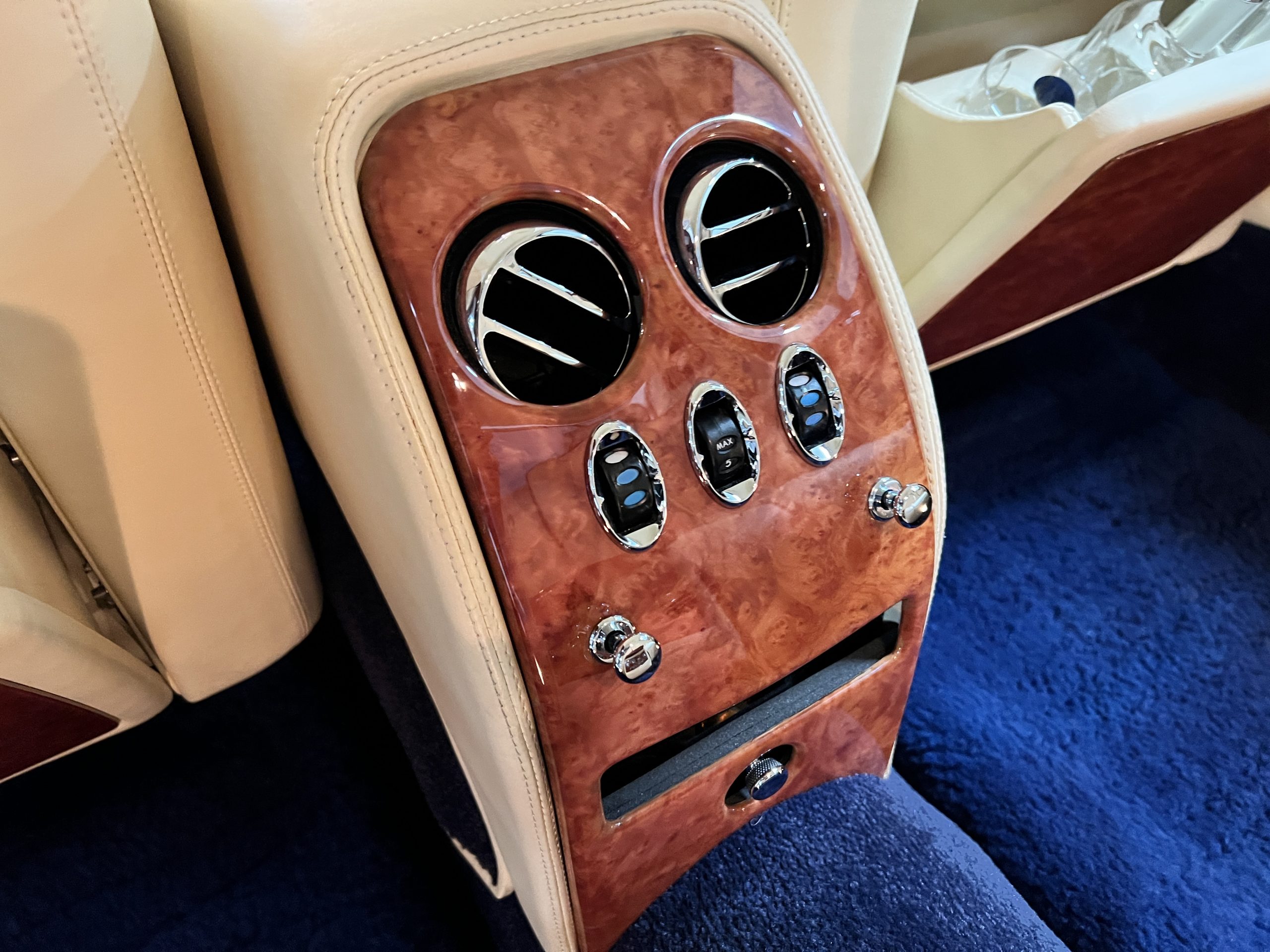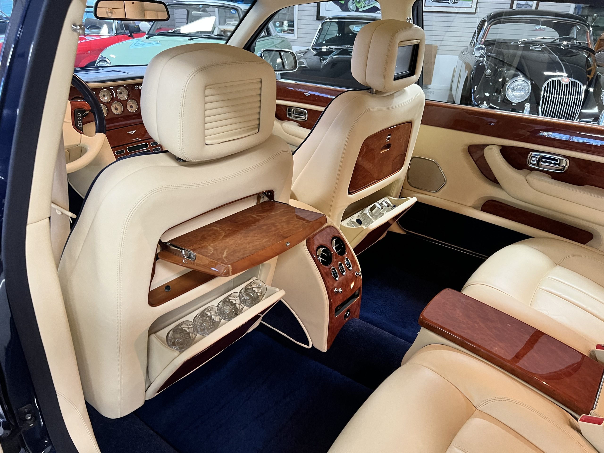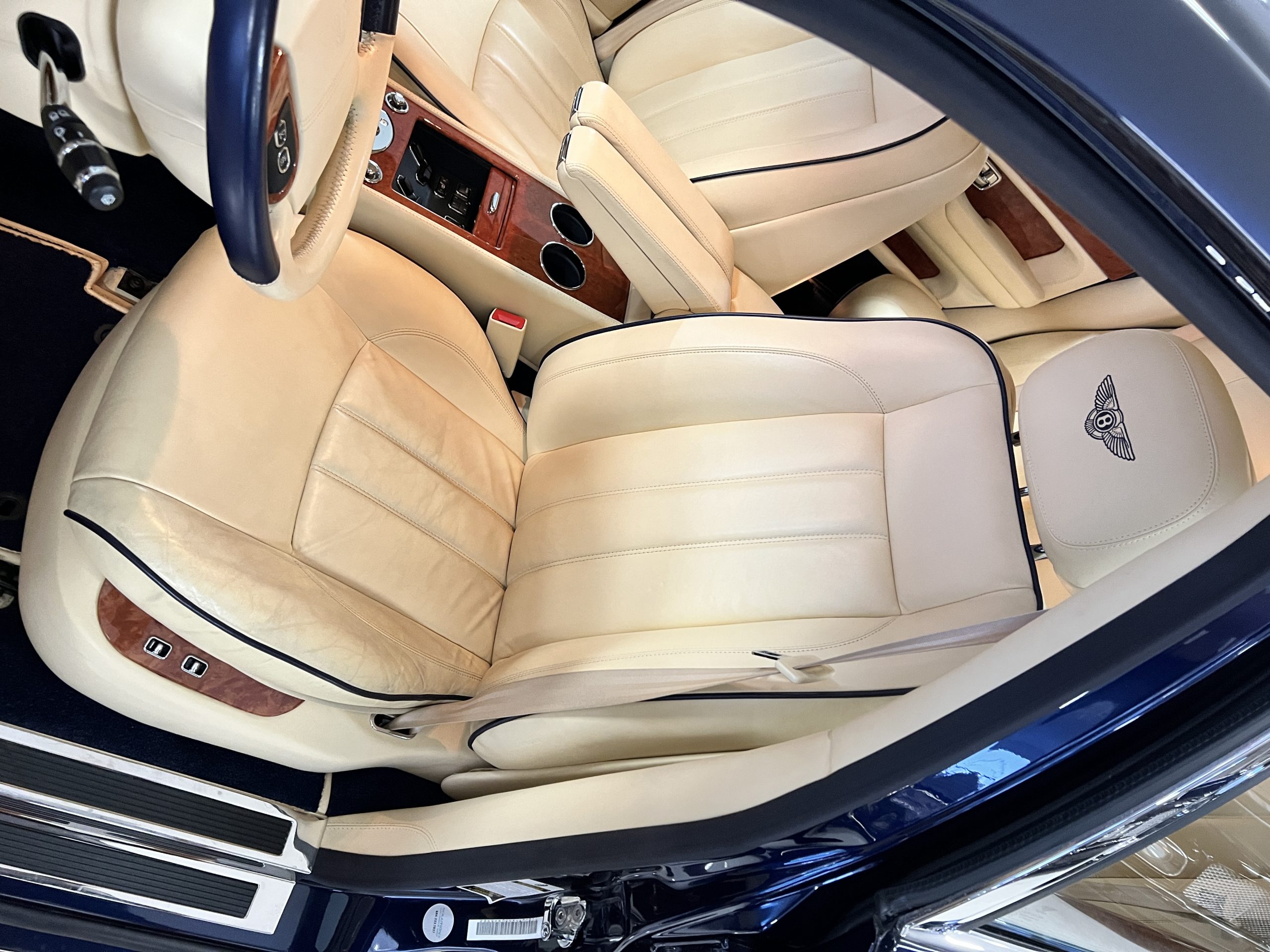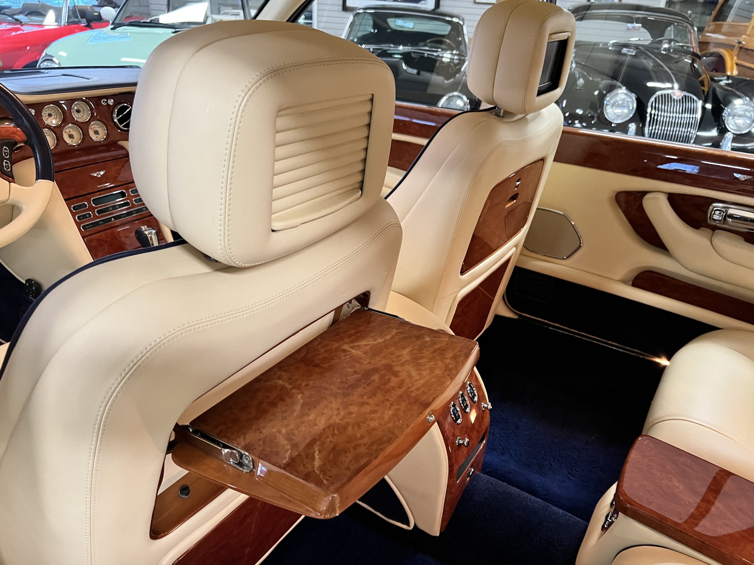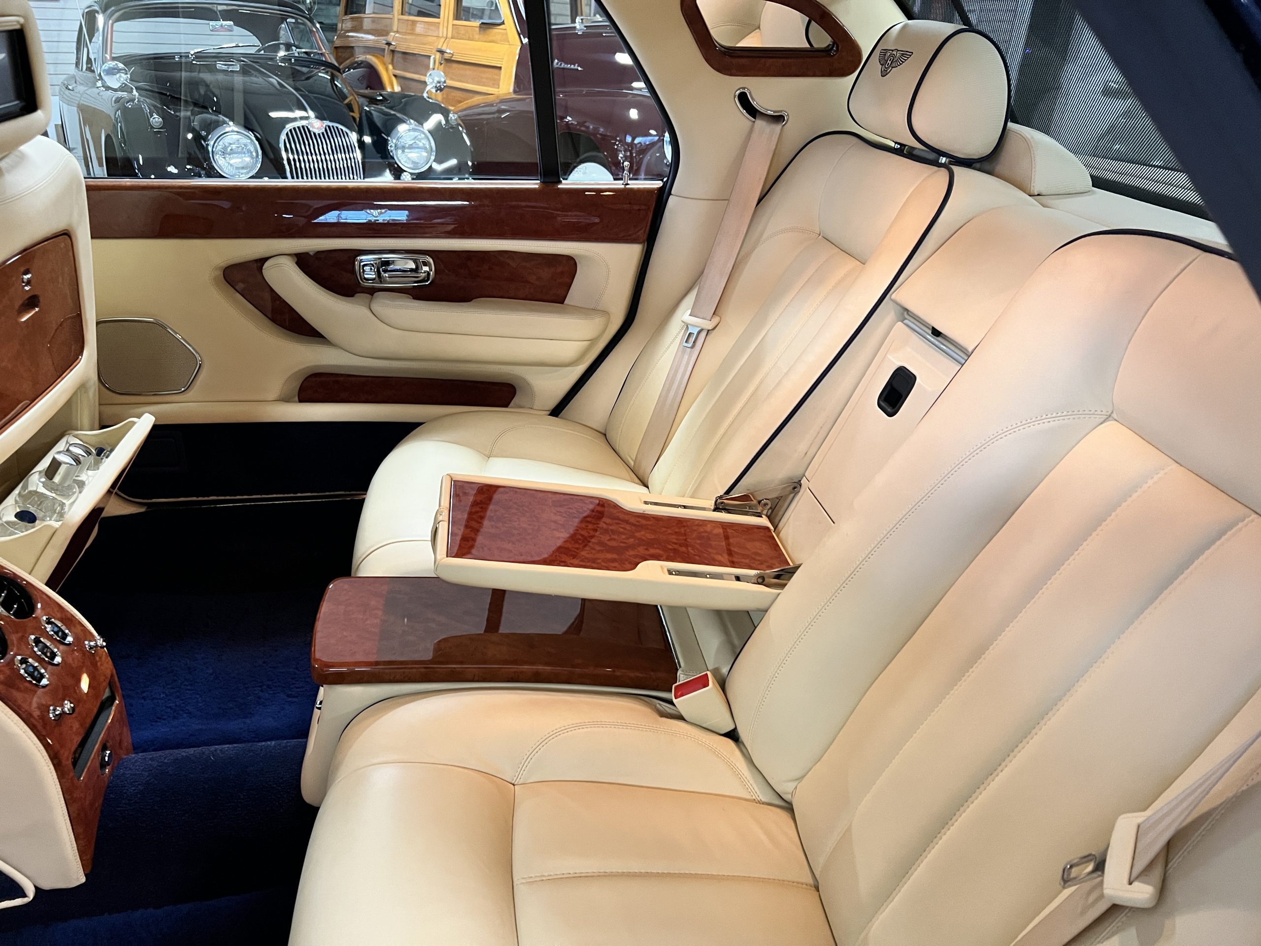 But the true magic of the RLs is its interior. The massive legroom in the rear is reminiscent of a Singapore Airlines first class cabin. Incredible legroom and crystal, Medrona wood veneer and mouton sheepskin overlays abound. The Magnolia leather (Trim Code SBT MA) seats are complimented with Peacock piping. There are picnic tables, writing tables, extra compartments for whatever one desires. The cap rails have imbedded Flying B logos and the headrests have embroidered Flying B’s sewn in. Dual umbrellas are stored in the trunk. Of course, there is an entertainment system and a premium Naim Auto system as well, featuring US TV and iPod interface. The wood veneer is perfect and only the driver’s seat shows slight wear, the rest of the interior is exceptional.