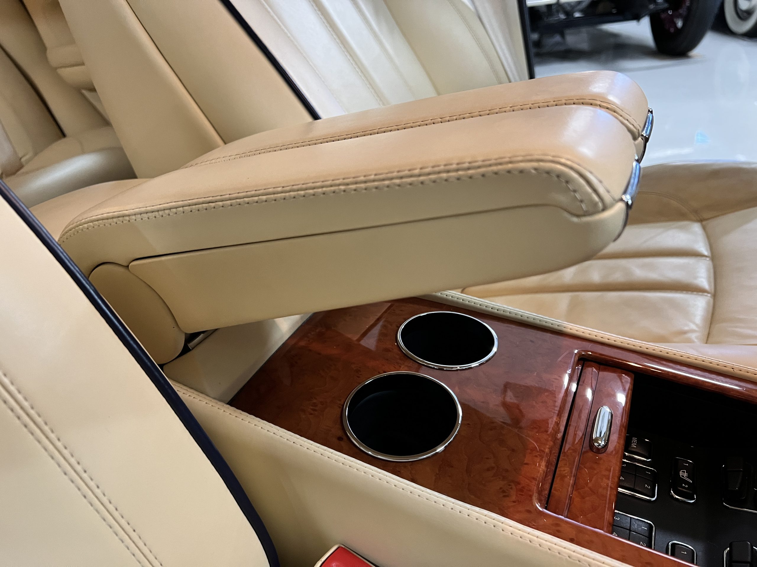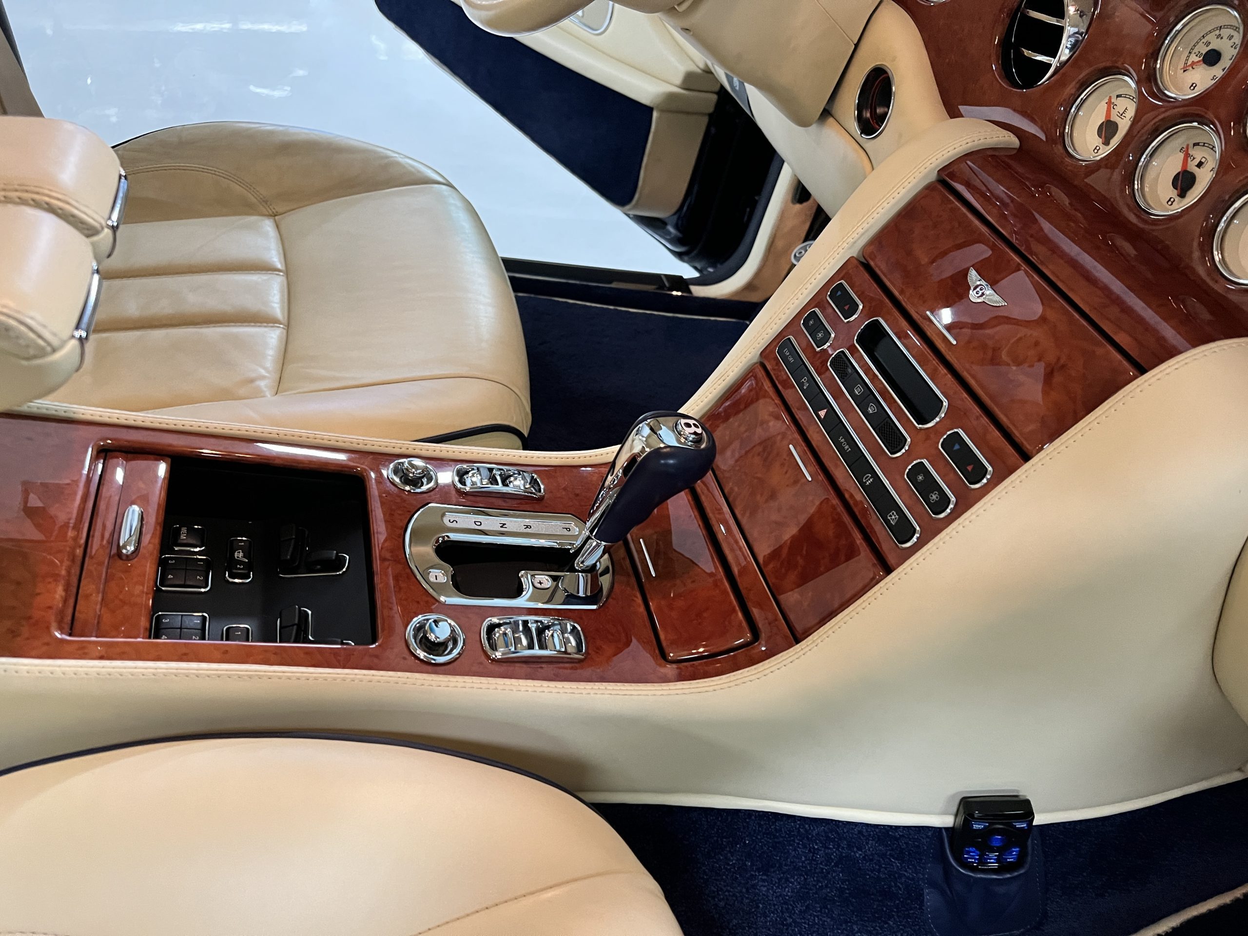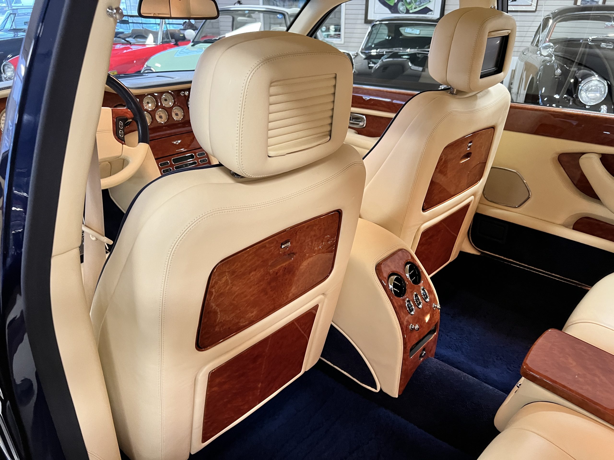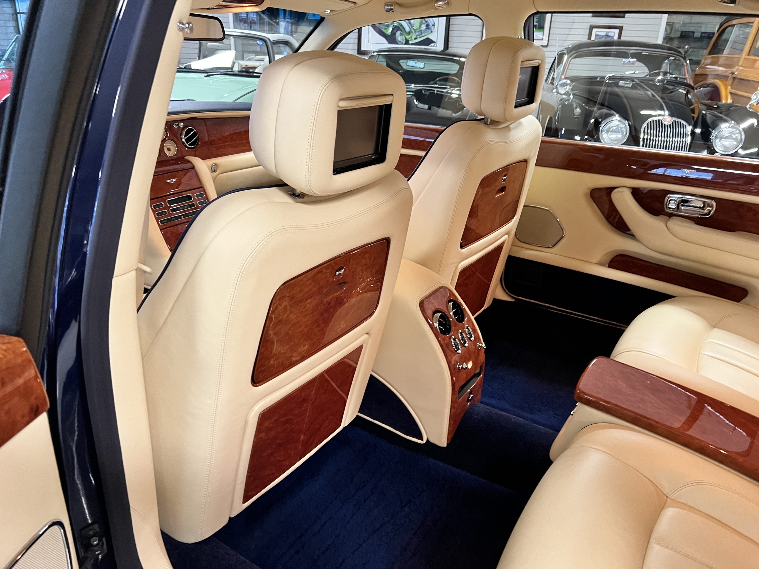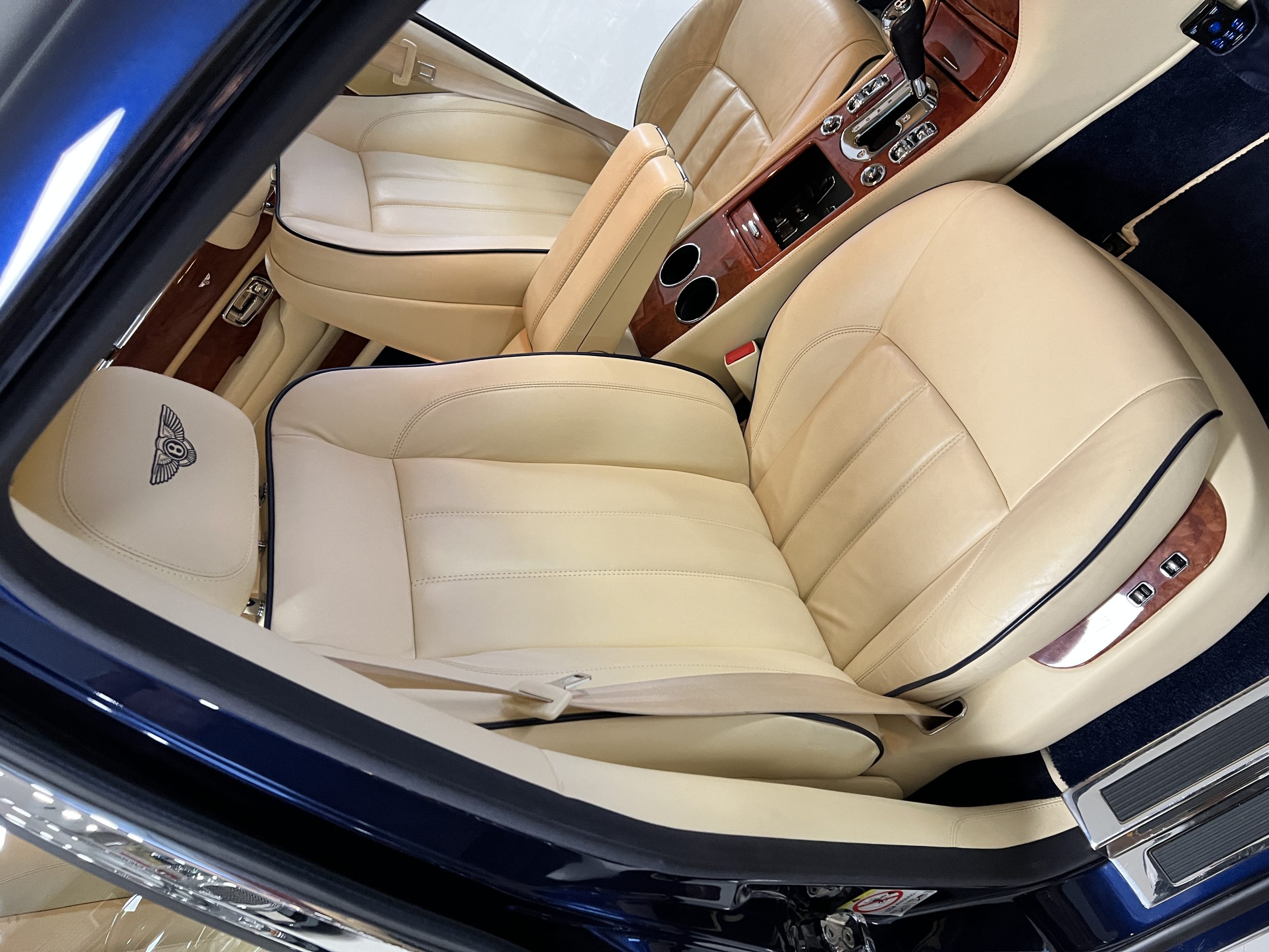 But the true magic of the RLs is its interior. The massive legroom in the rear is reminiscent of a Singapore Airlines first class cabin. Incredible legroom and crystal, Medrona wood veneer and mouton sheepskin overlays abound. The Magnolia leather (Trim Code SBT MA) seats are complimented with Peacock piping. There are picnic tables, writing tables, extra compartments for whatever one desires. The cap rails have imbedded Flying B logos and the headrests have embroidered Flying B’s sewn in. Dual umbrellas are stored in the trunk. Of course, there is an entertainment system and a premium Naim Auto system as well, featuring US TV and iPod interface. The wood veneer is perfect and only the driver’s seat shows slight wear, the rest of the interior is exceptional.