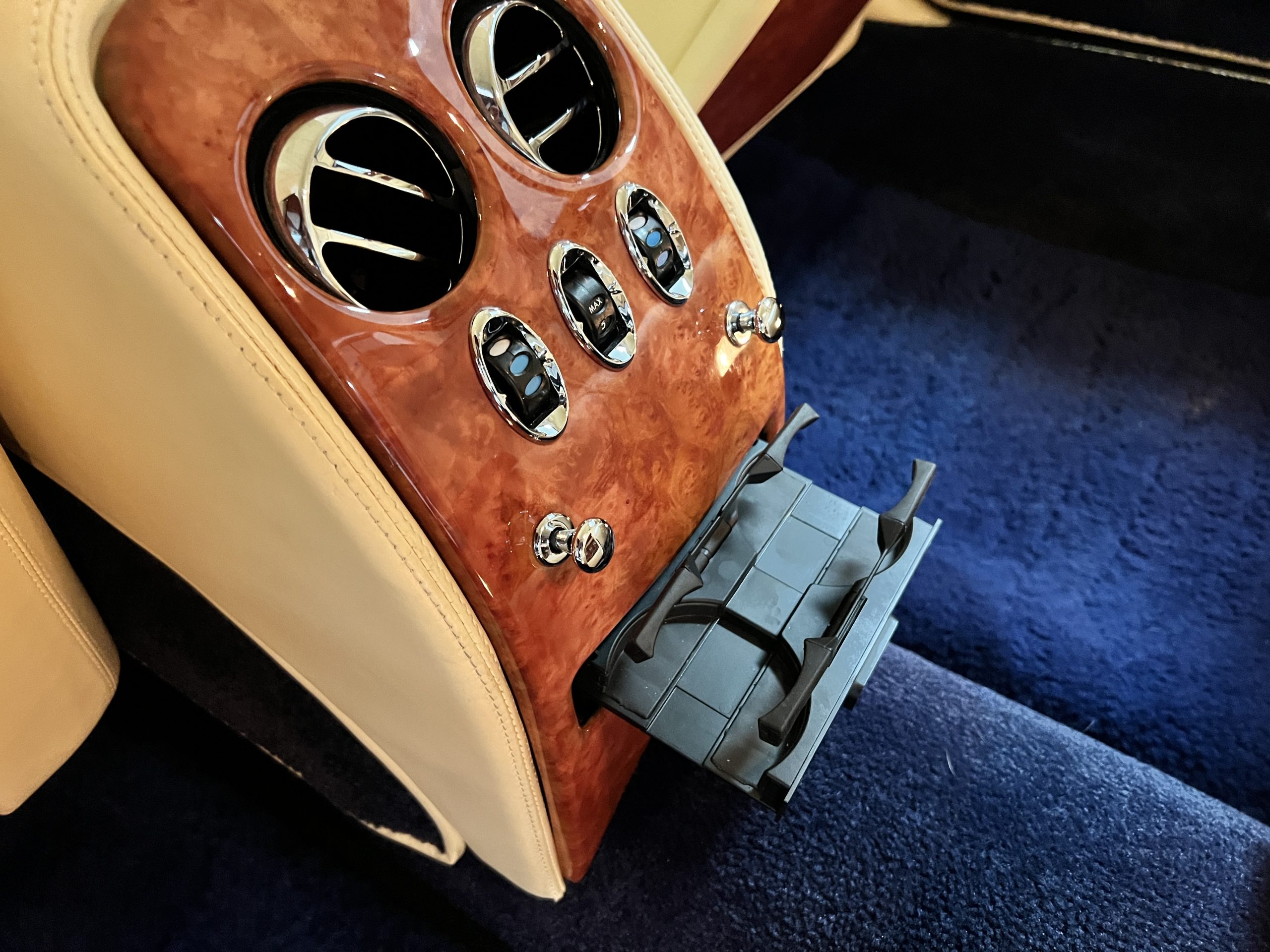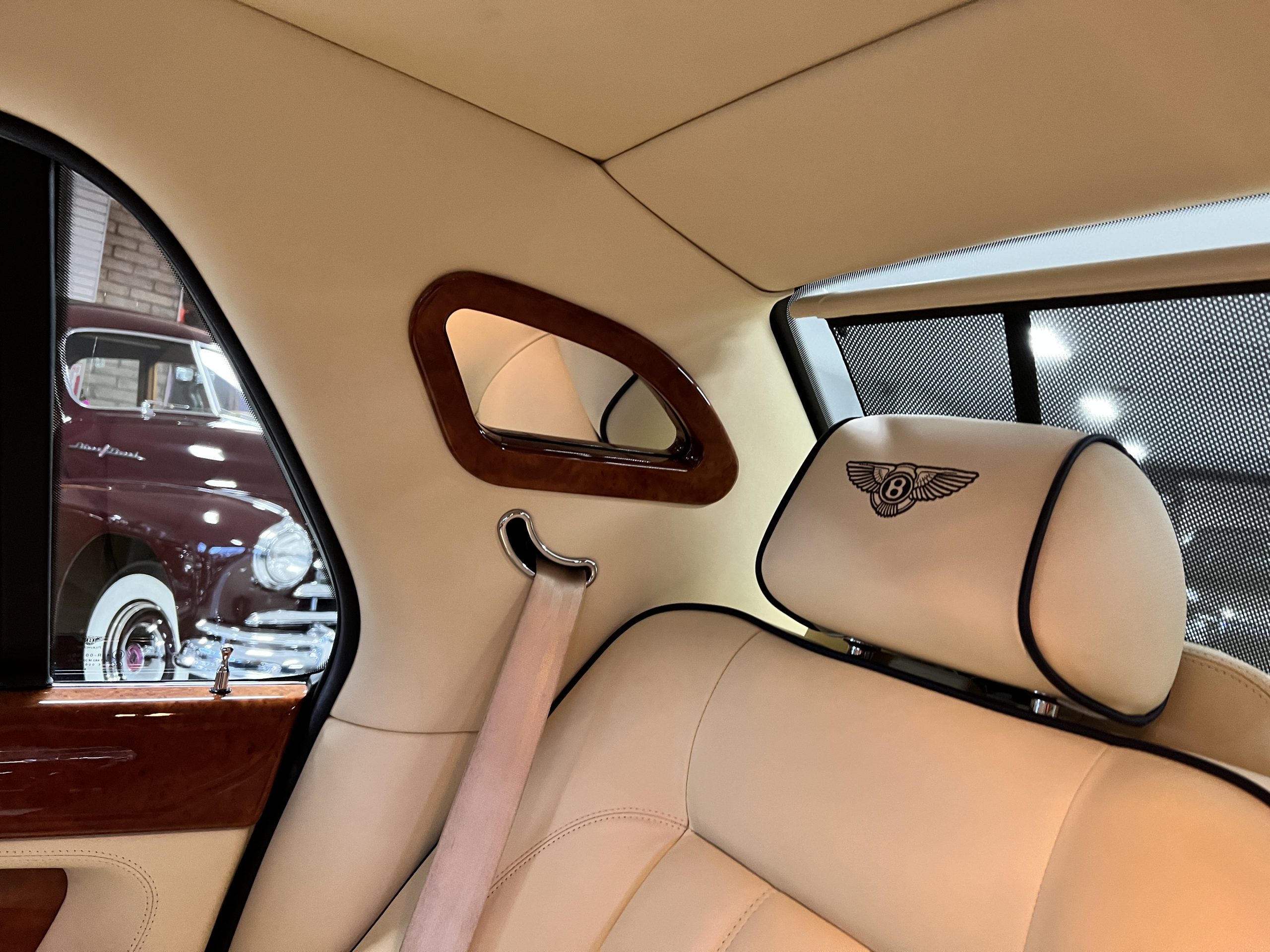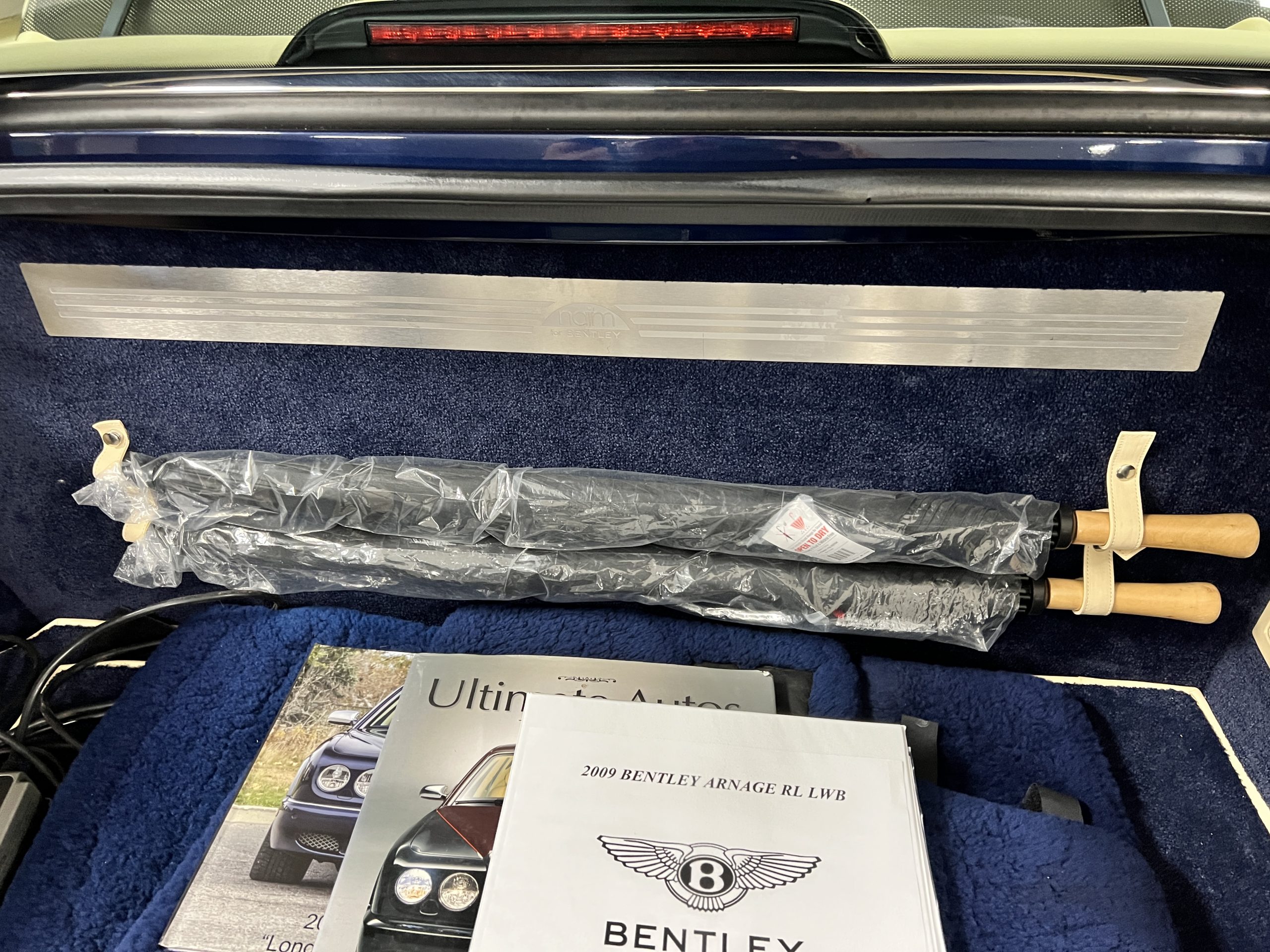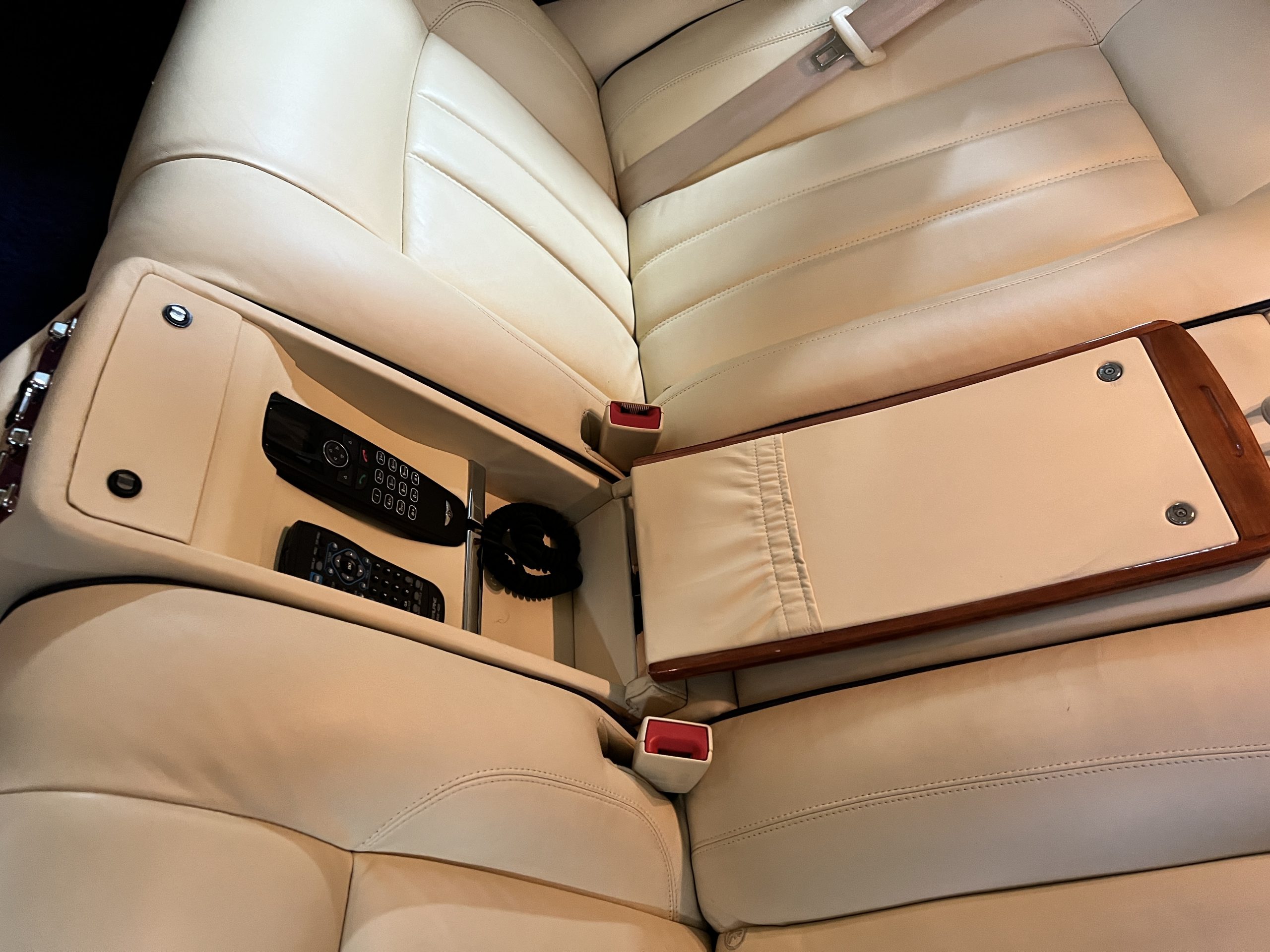 But the true magic of the RLs is its interior. The massive legroom in the rear is reminiscent of a Singapore Airlines first class cabin. Incredible legroom and crystal, Medrona wood veneer and mouton sheepskin overlays abound. The Magnolia leather (Trim Code SBT MA) seats are complimented with Peacock piping. There are picnic tables, writing tables, extra compartments for whatever one desires. The cap rails have imbedded Flying B logos and the headrests have embroidered Flying B’s sewn in. Dual umbrellas are stored in the trunk. Of course, there is an entertainment system and a premium Naim Auto system as well, featuring US TV and iPod interface. The wood veneer is perfect and only the driver’s seat shows slight wear, the rest of the interior is exceptional.