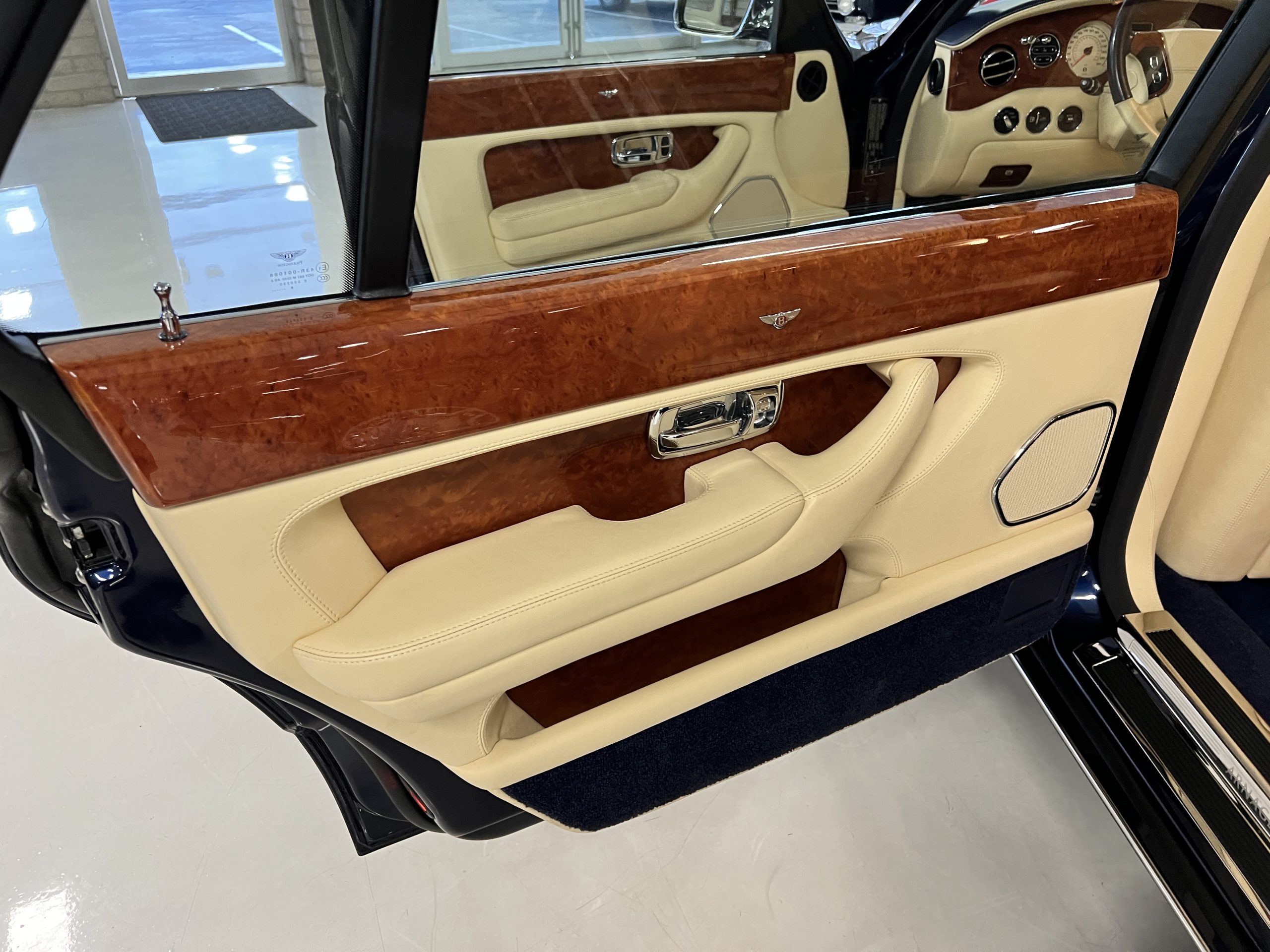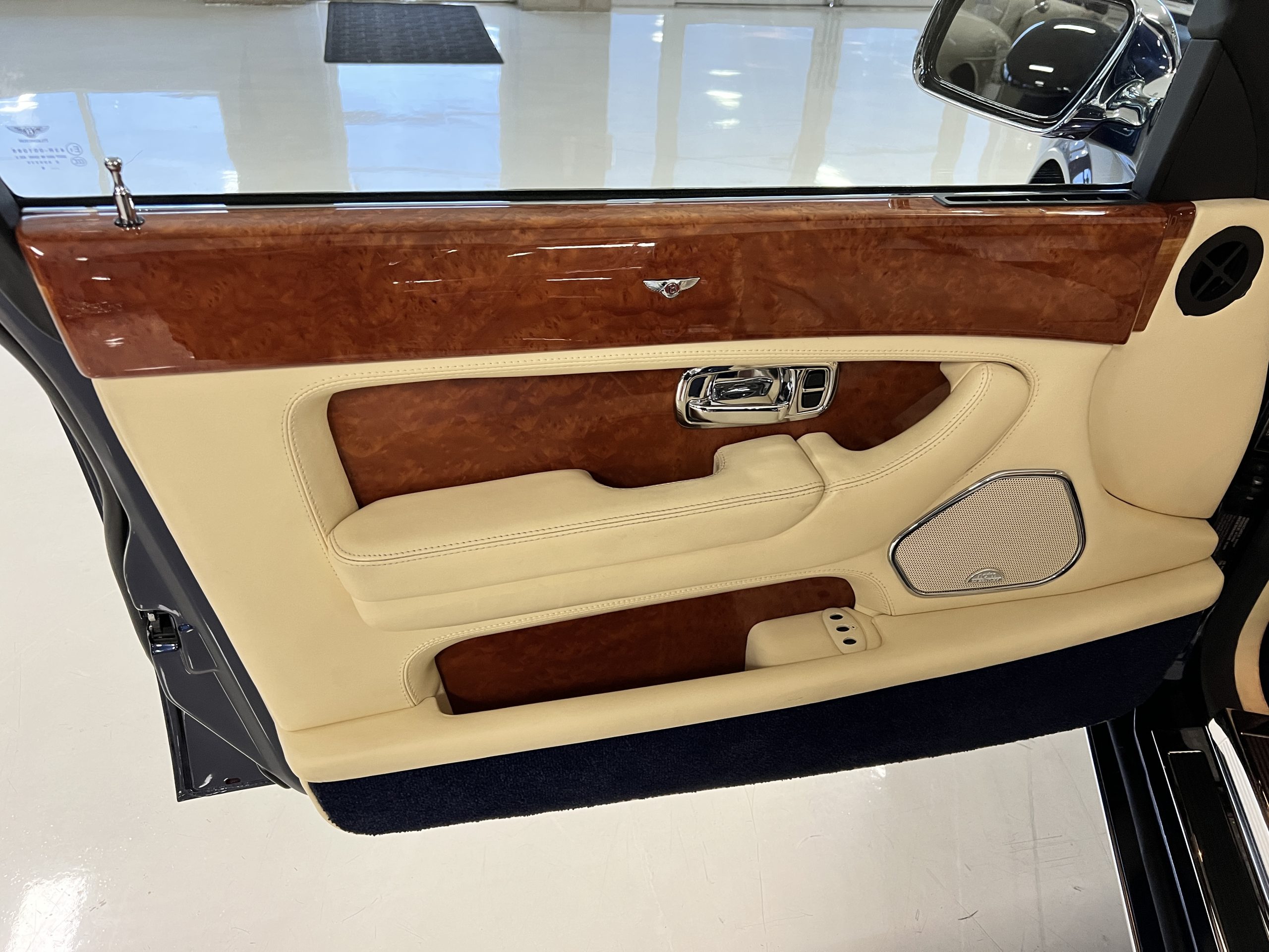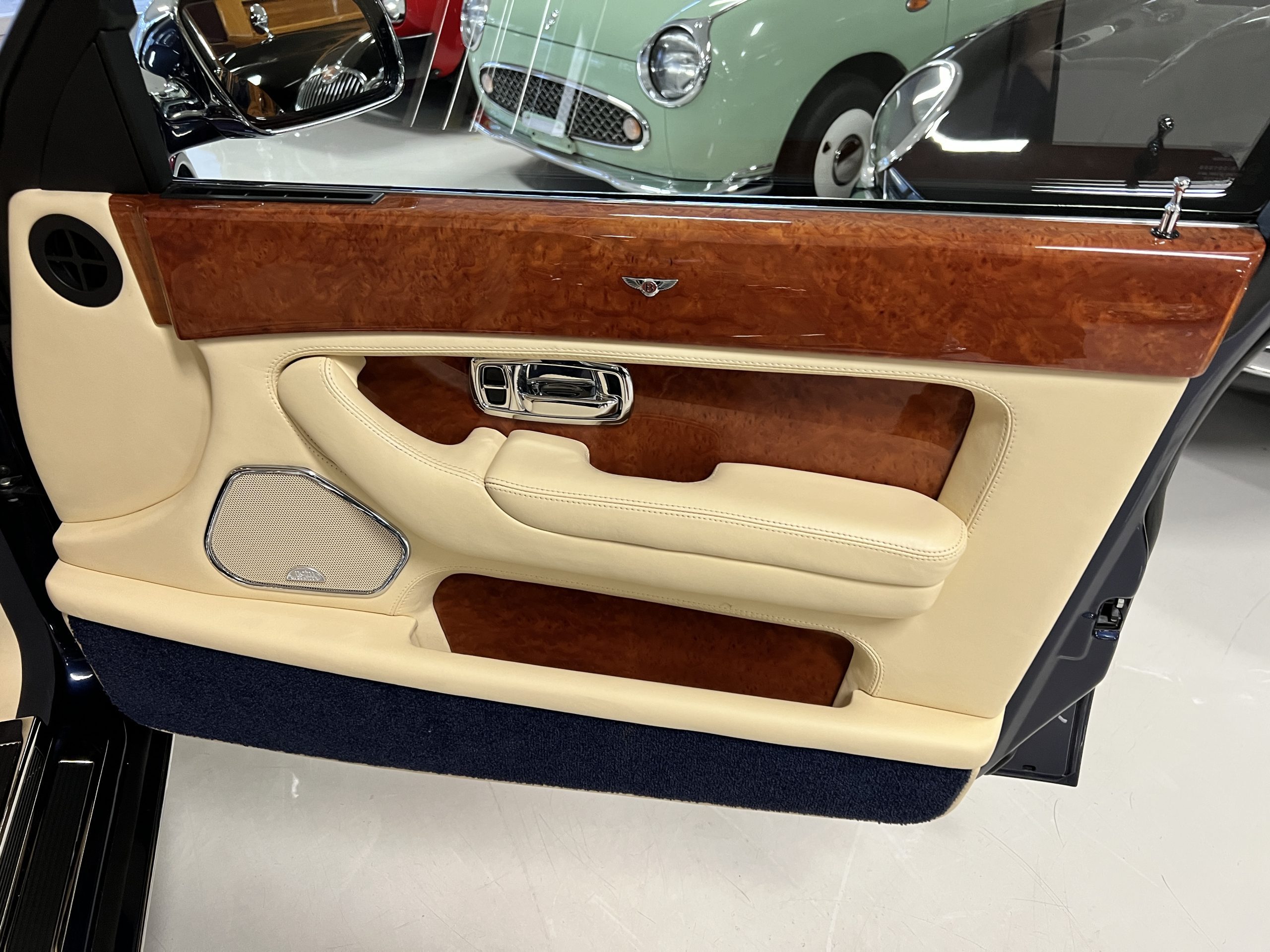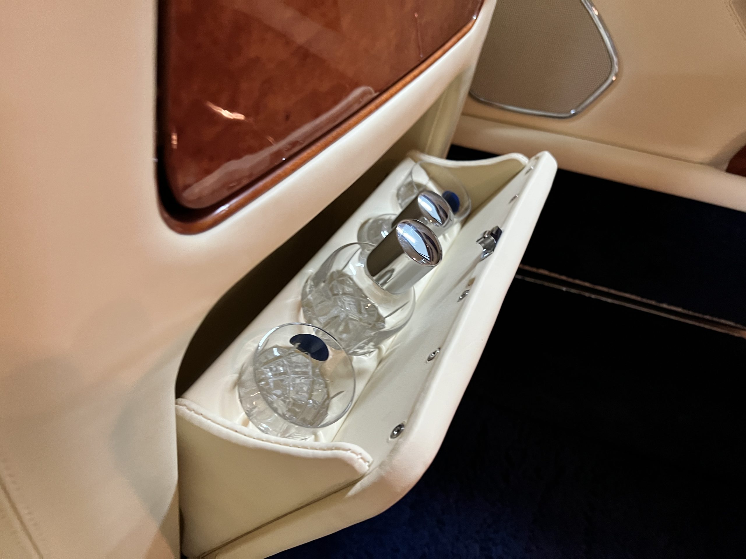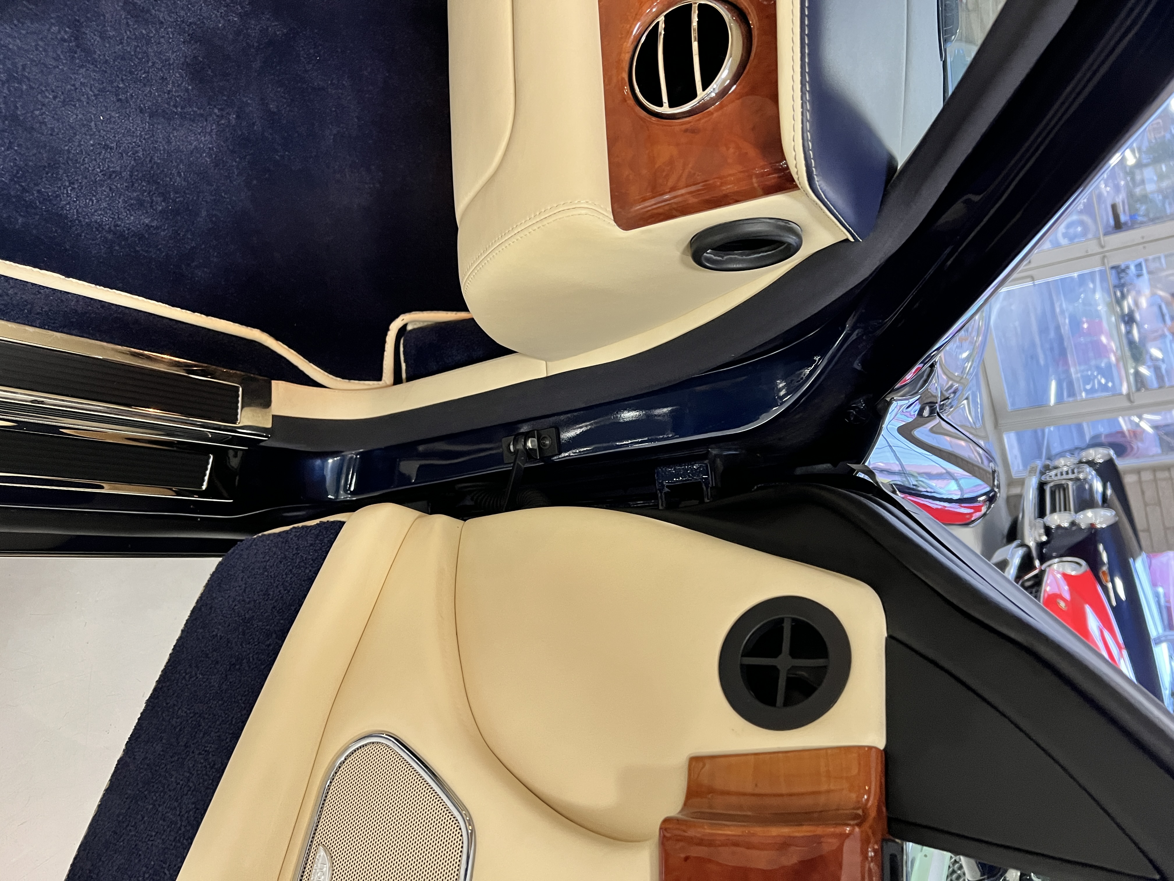 But the true magic of the RLs is its interior. The massive legroom in the rear is reminiscent of a Singapore Airlines first class cabin. Incredible legroom and crystal, Medrona wood veneer and mouton sheepskin overlays abound. The Magnolia leather (Trim Code SBT MA) seats are complimented with Peacock piping. There are picnic tables, writing tables, extra compartments for whatever one desires. The cap rails have imbedded Flying B logos and the headrests have embroidered Flying B’s sewn in. Dual umbrellas are stored in the trunk. Of course, there is an entertainment system and a premium Naim Auto system as well, featuring US TV and iPod interface. The wood veneer is perfect and only the driver’s seat shows slight wear, the rest of the interior is exceptional.