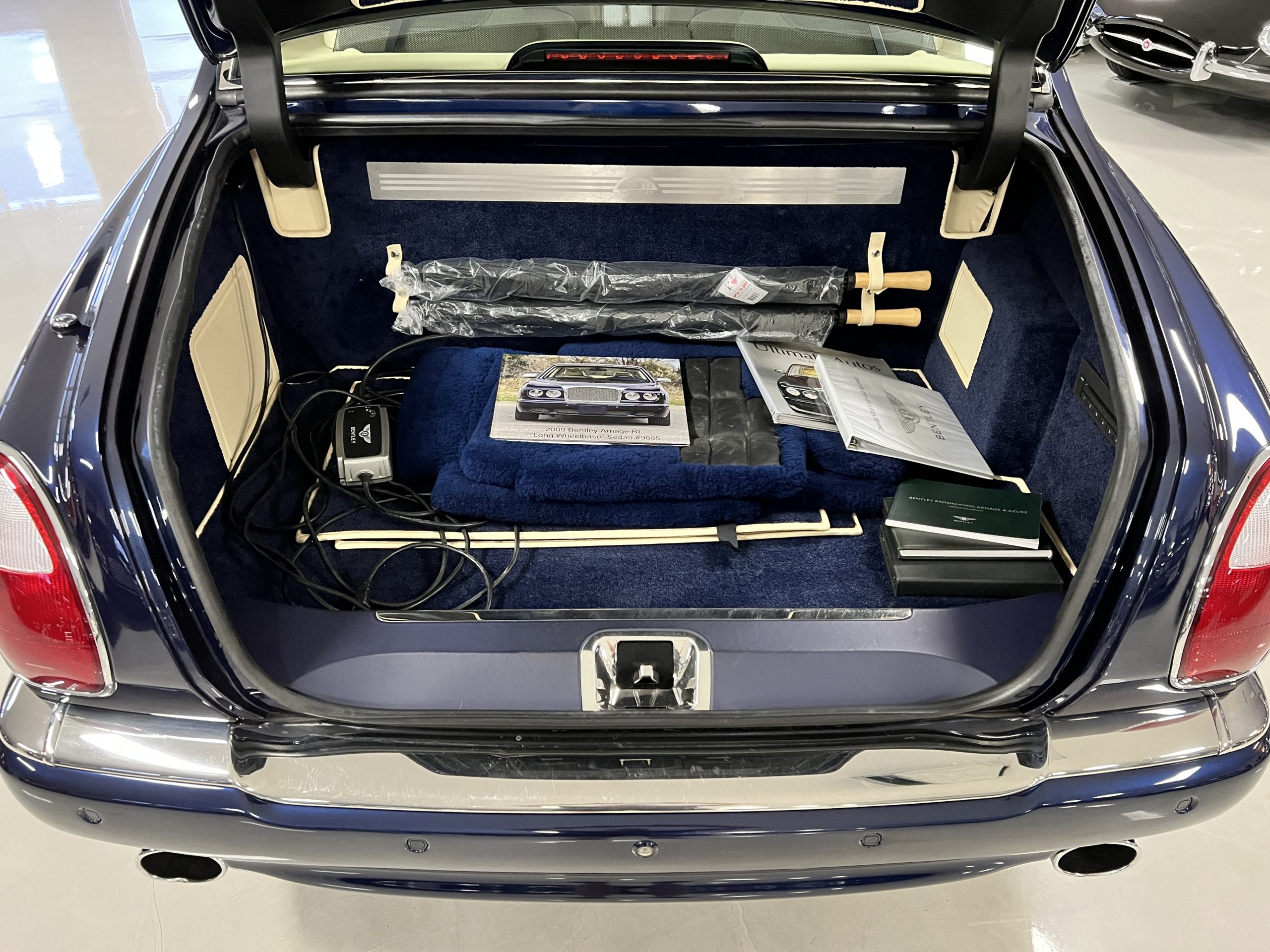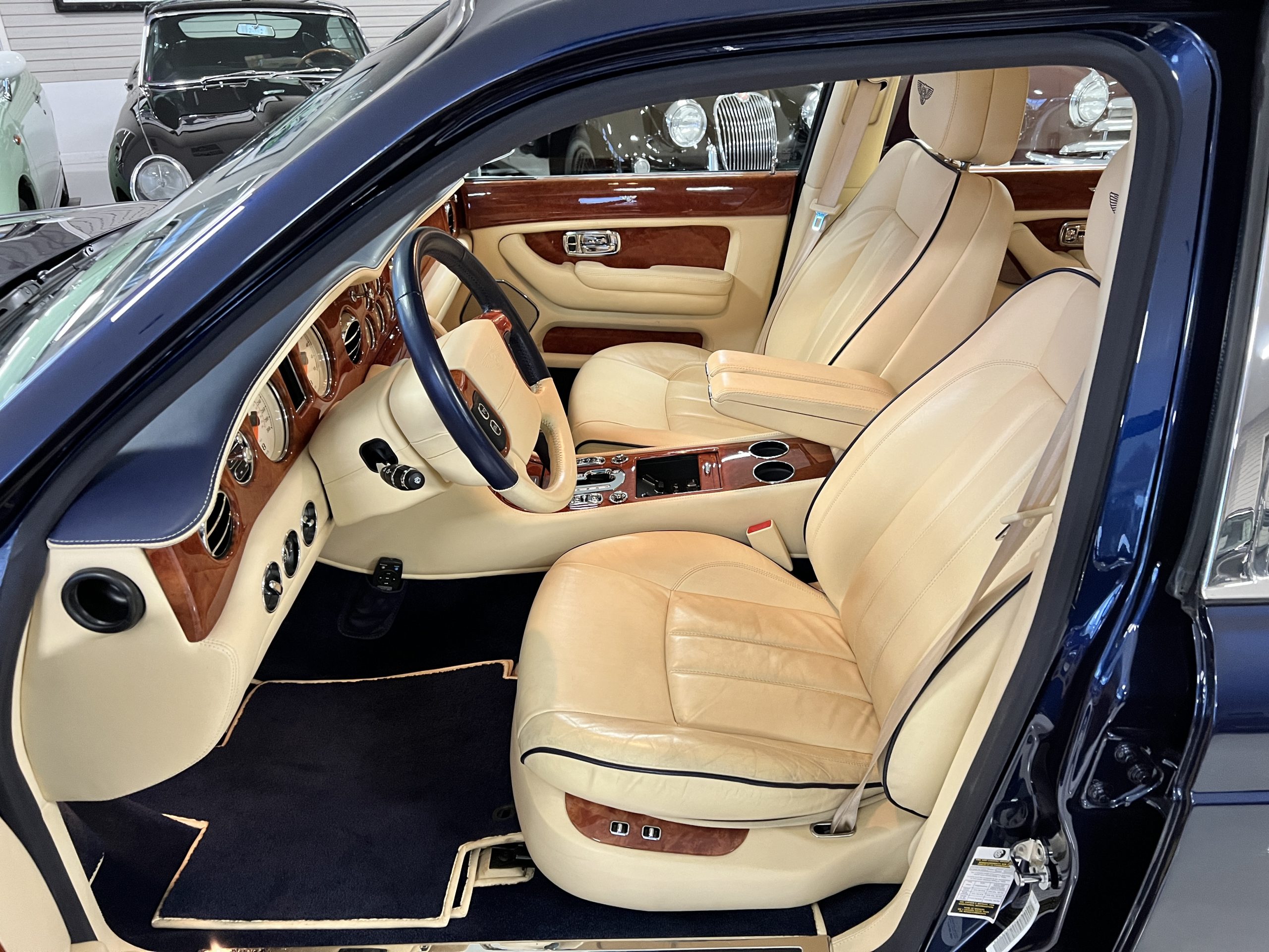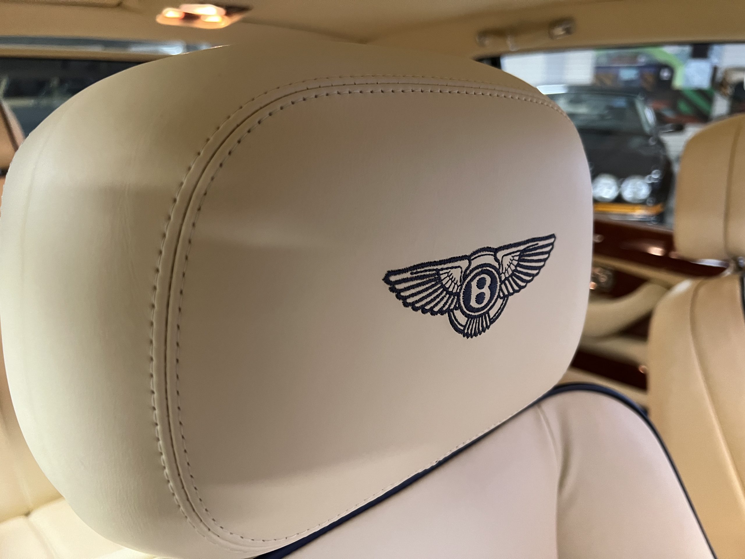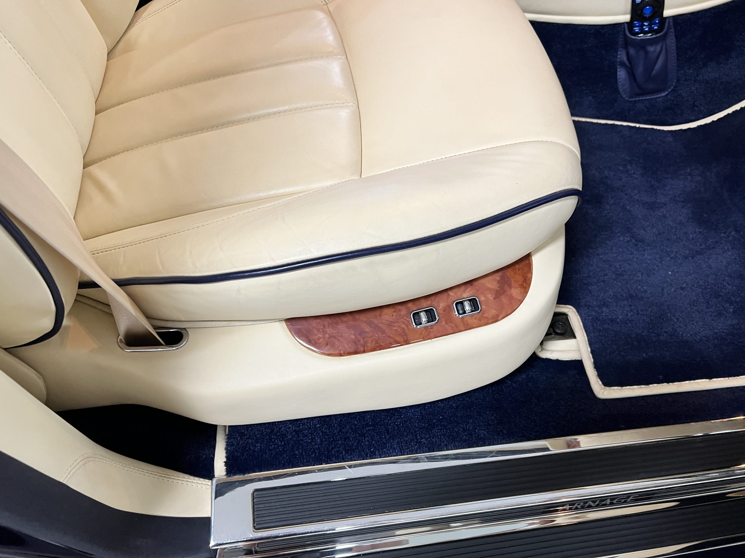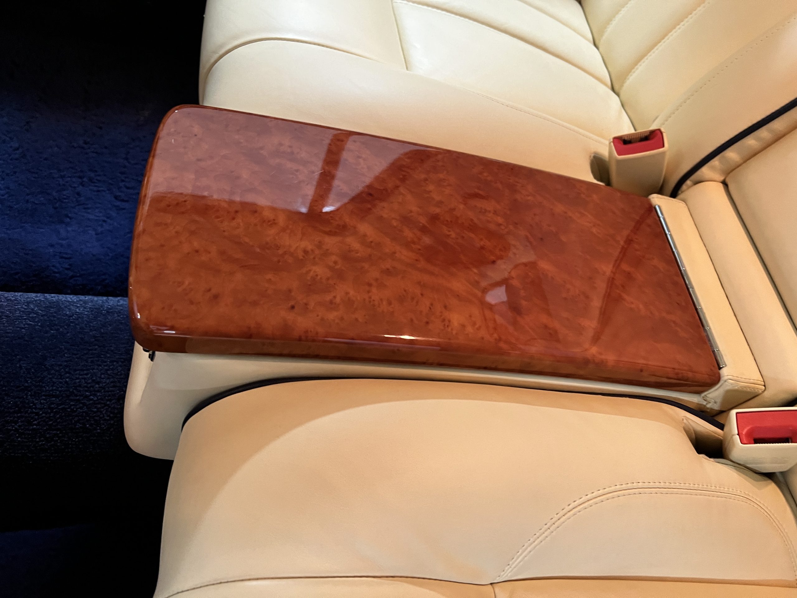 But the true magic of the RLs is its interior. The massive legroom in the rear is reminiscent of a Singapore Airlines first class cabin. Incredible legroom and crystal, Medrona wood veneer and mouton sheepskin overlays abound. The Magnolia leather (Trim Code SBT MA) seats are complimented with Peacock piping. There are picnic tables, writing tables, extra compartments for whatever one desires. The cap rails have imbedded Flying B logos and the headrests have embroidered Flying B’s sewn in. Dual umbrellas are stored in the trunk. Of course, there is an entertainment system and a premium Naim Auto system as well, featuring US TV and iPod interface. The wood veneer is perfect and only the driver’s seat shows slight wear, the rest of the interior is exceptional.