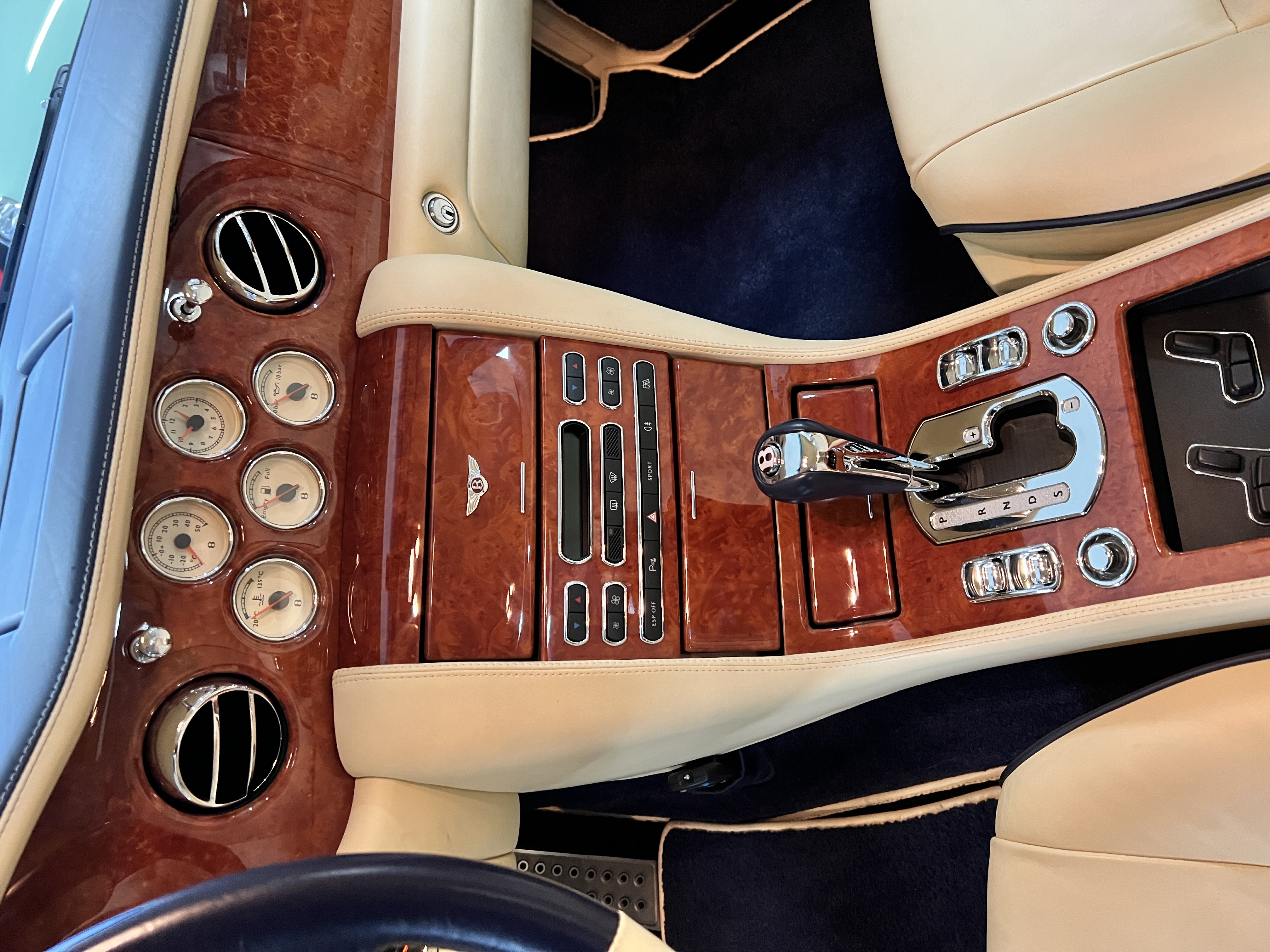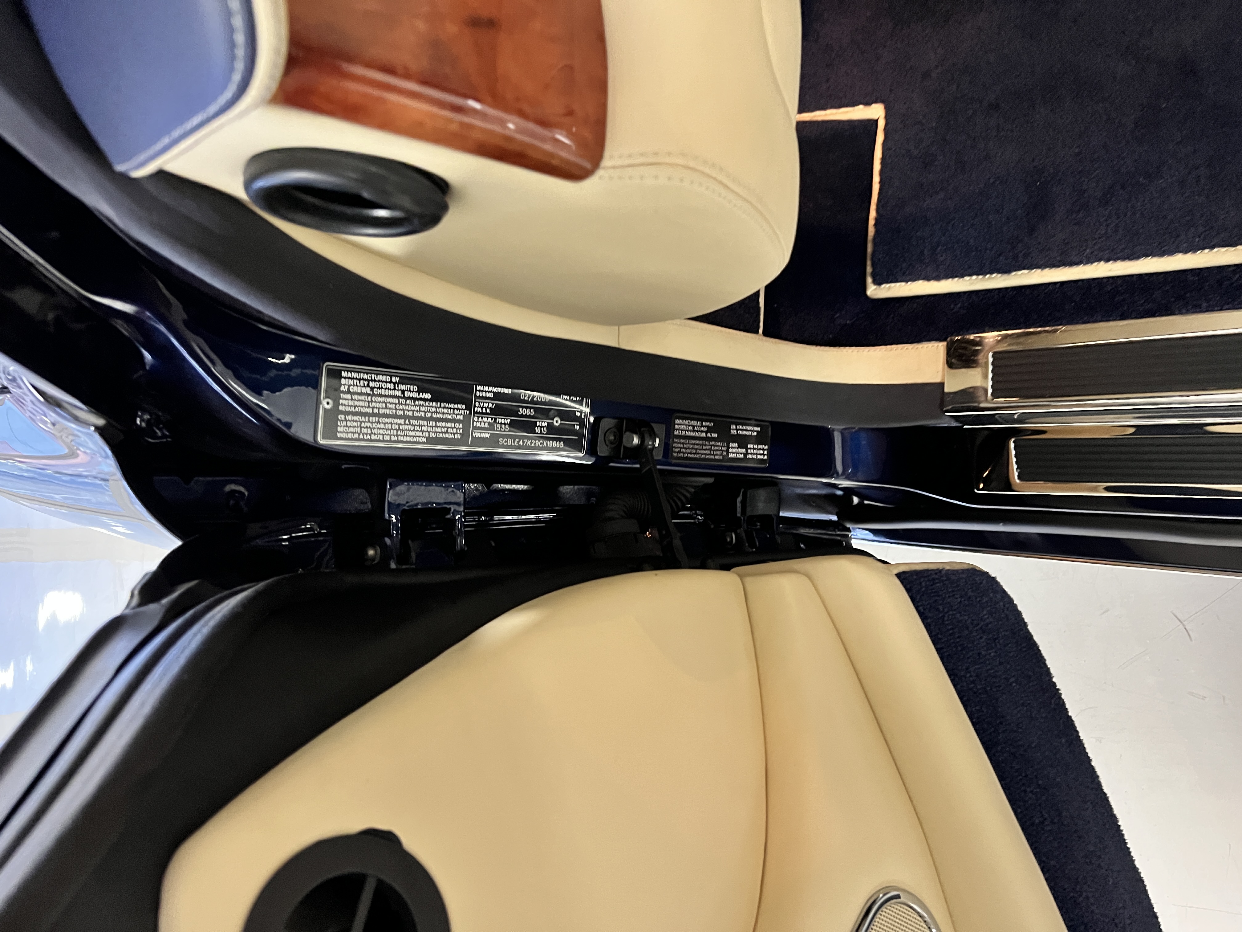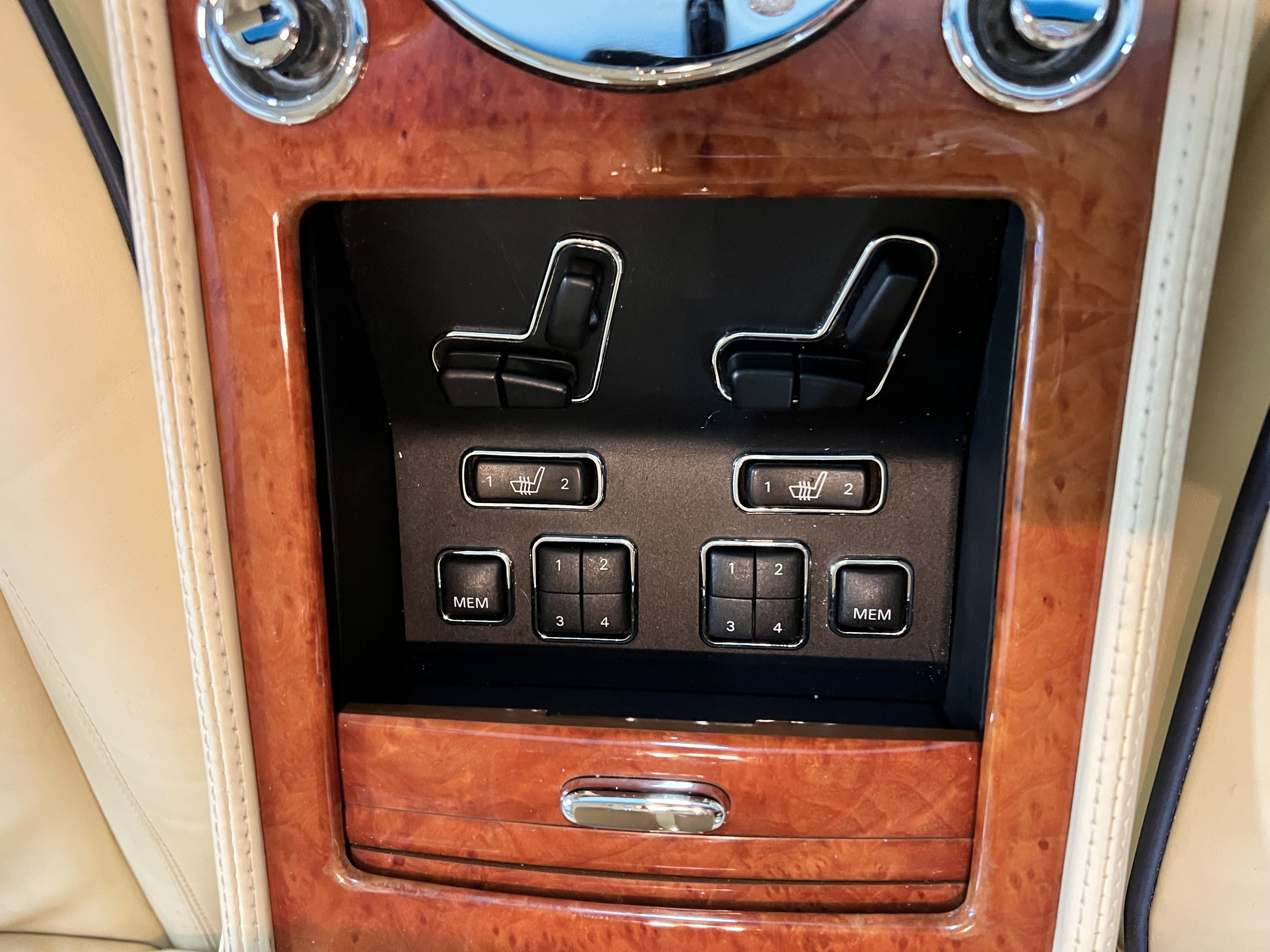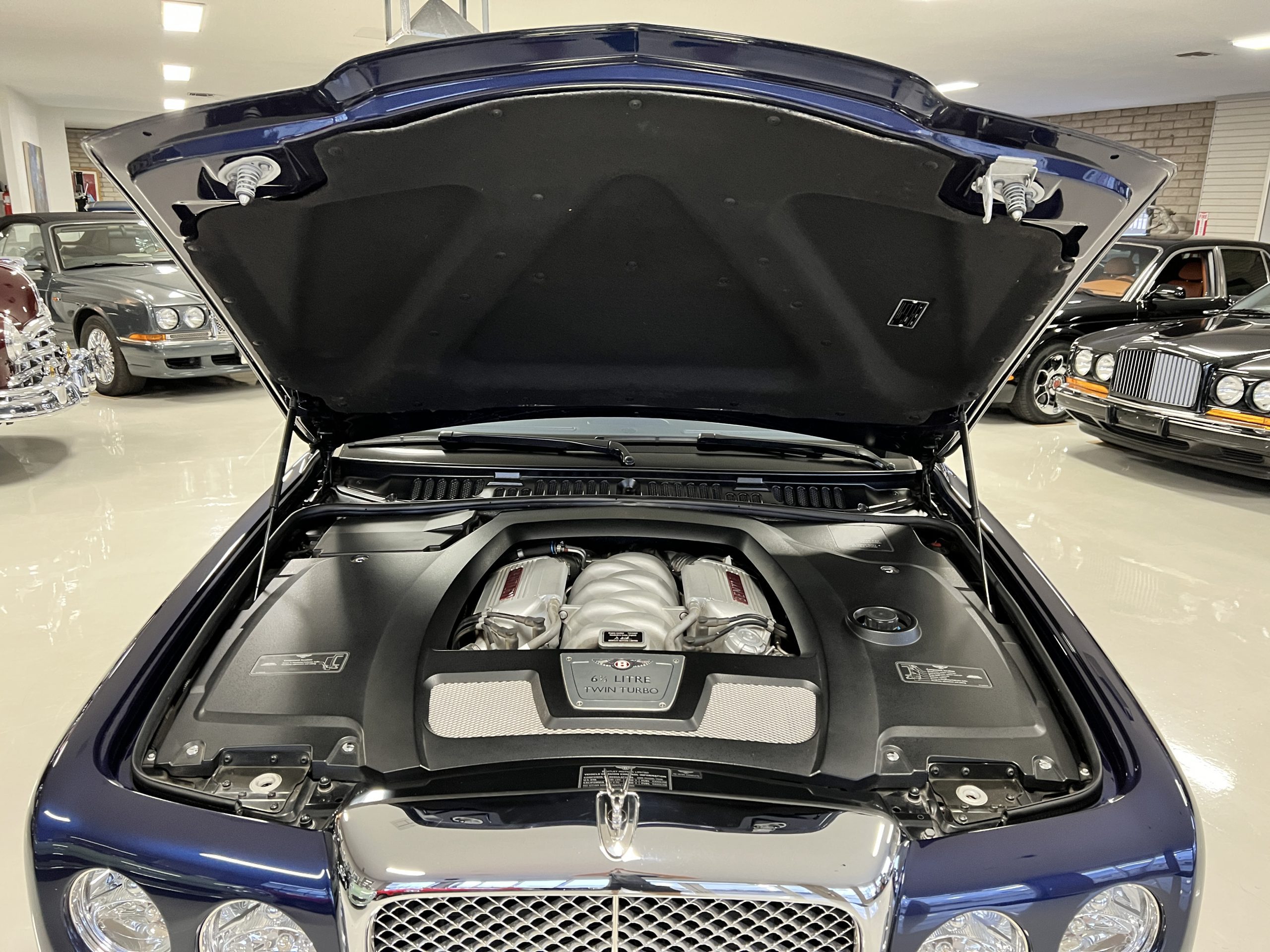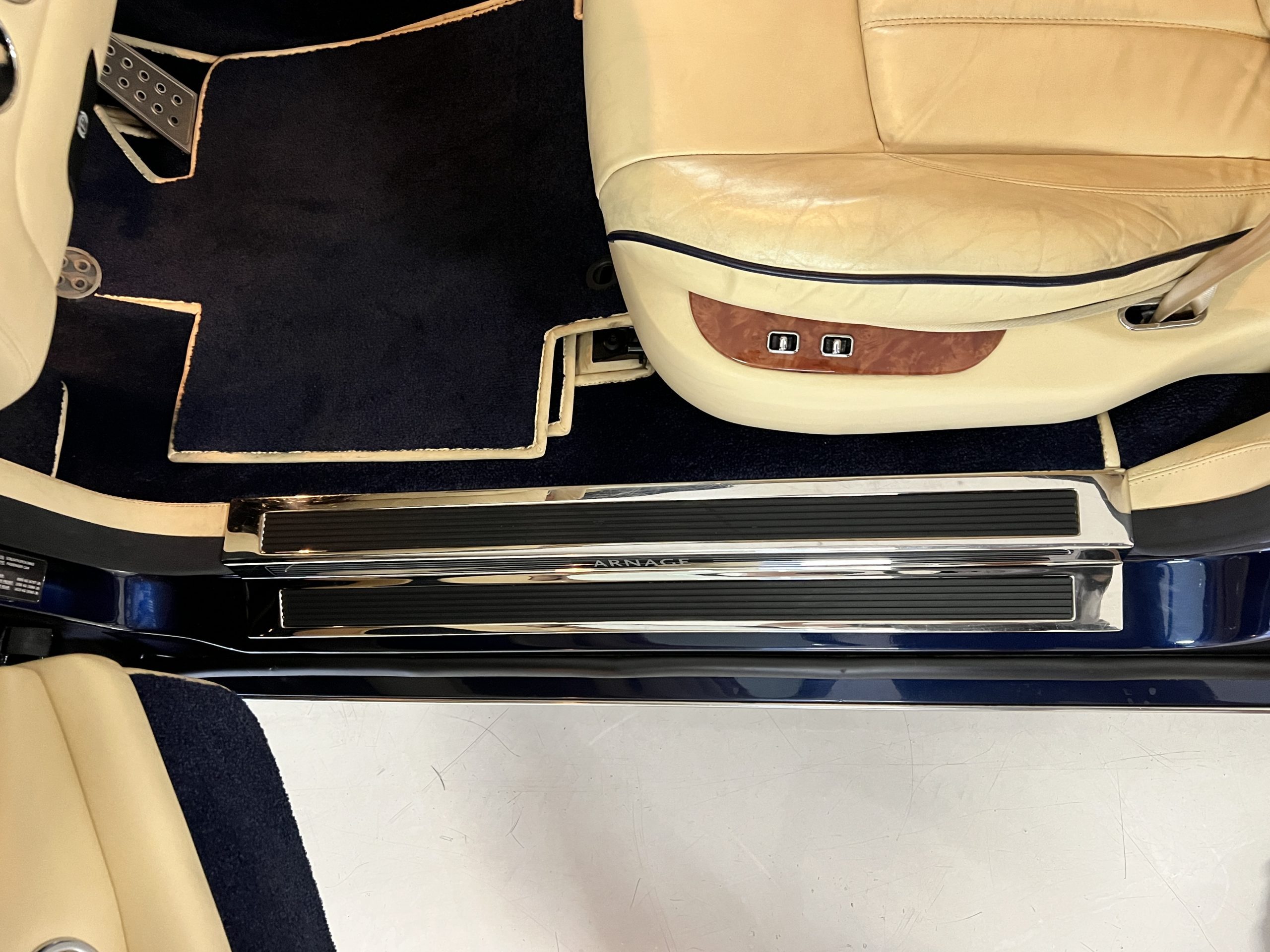 But the true magic of the RLs is its interior. The massive legroom in the rear is reminiscent of a Singapore Airlines first class cabin. Incredible legroom and crystal, Medrona wood veneer and mouton sheepskin overlays abound. The Magnolia leather (Trim Code SBT MA) seats are complimented with Peacock piping. There are picnic tables, writing tables, extra compartments for whatever one desires. The cap rails have imbedded Flying B logos and the headrests have embroidered Flying B’s sewn in. Dual umbrellas are stored in the trunk. Of course, there is an entertainment system and a premium Naim Auto system as well, featuring US TV and iPod interface. The wood veneer is perfect and only the driver’s seat shows slight wear, the rest of the interior is exceptional.