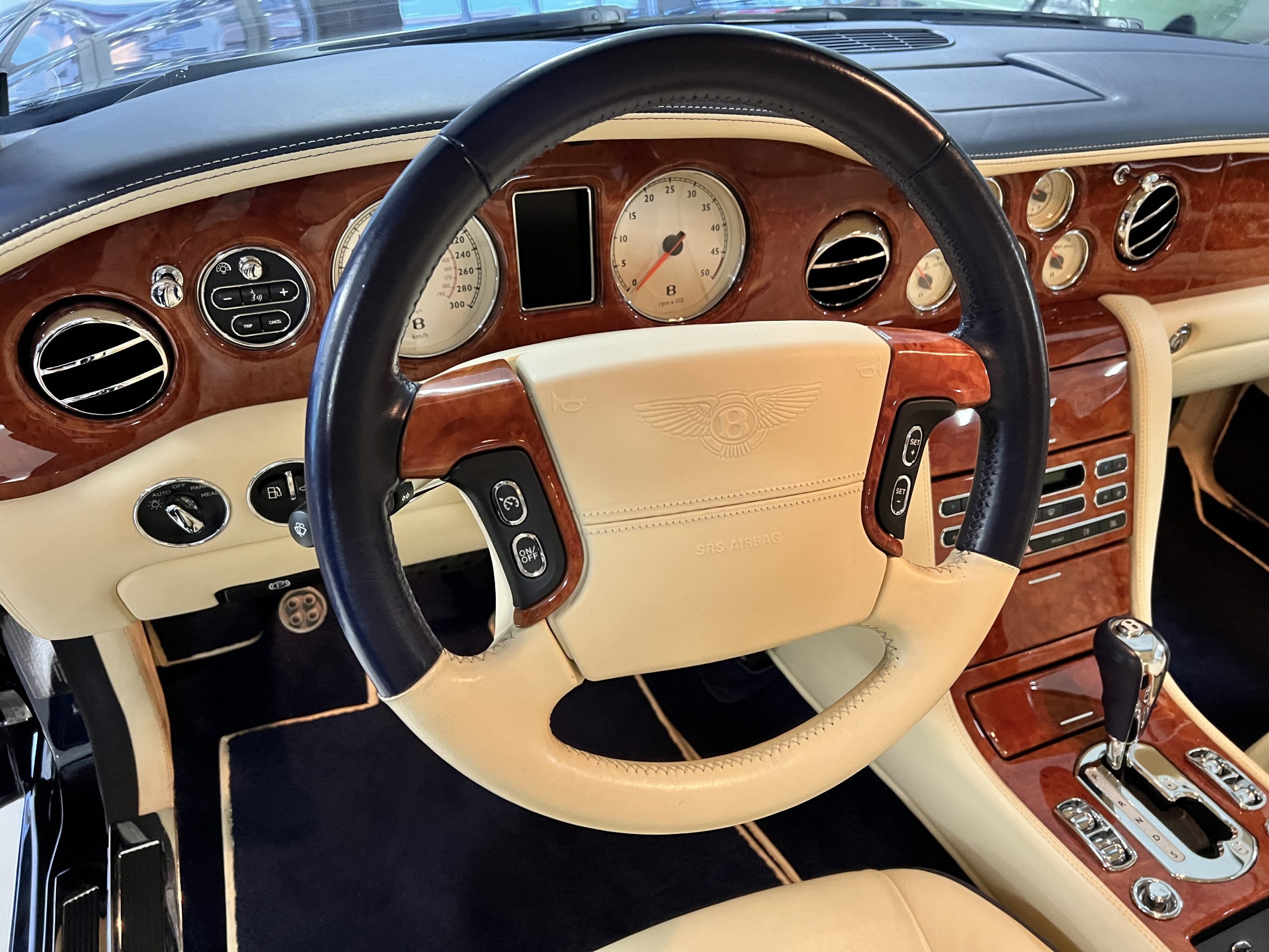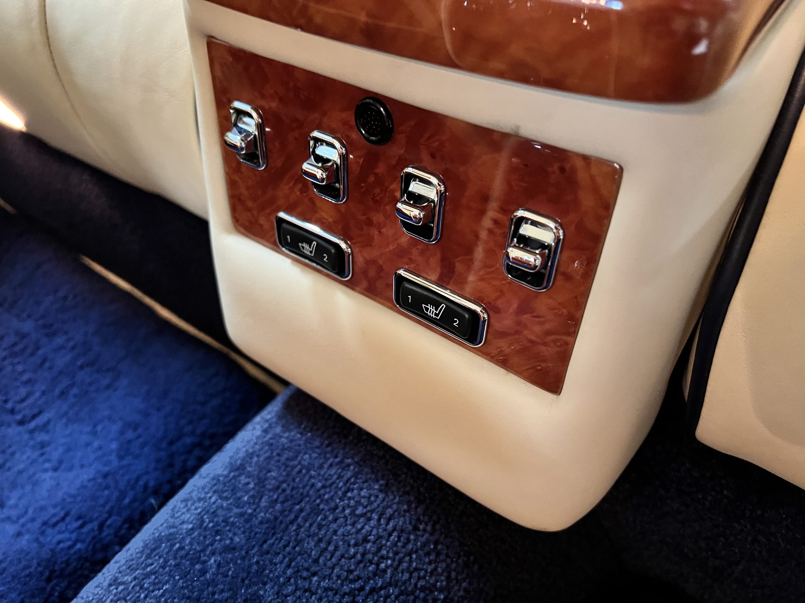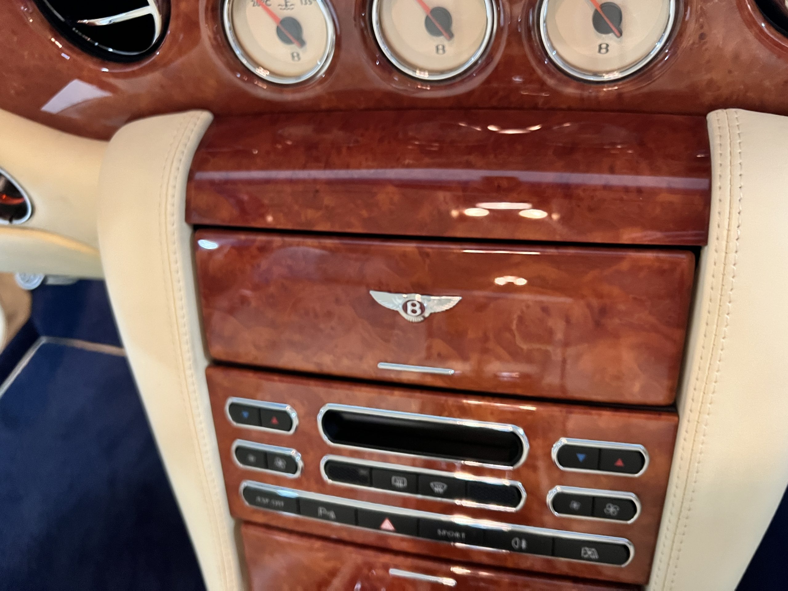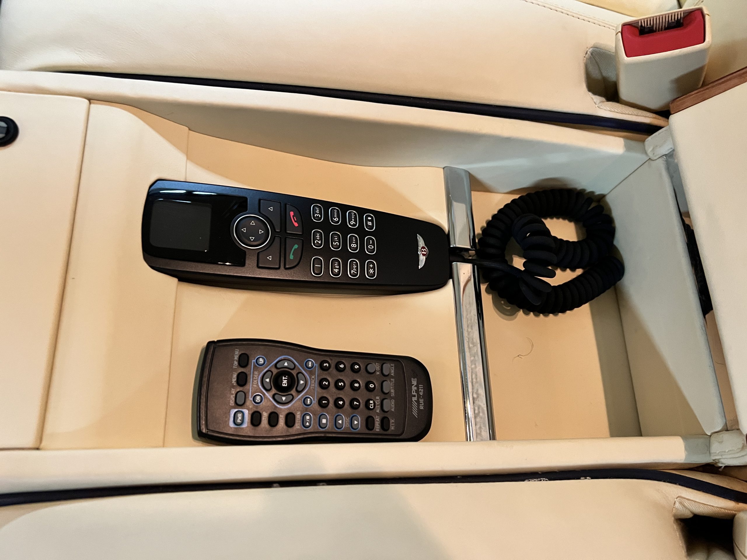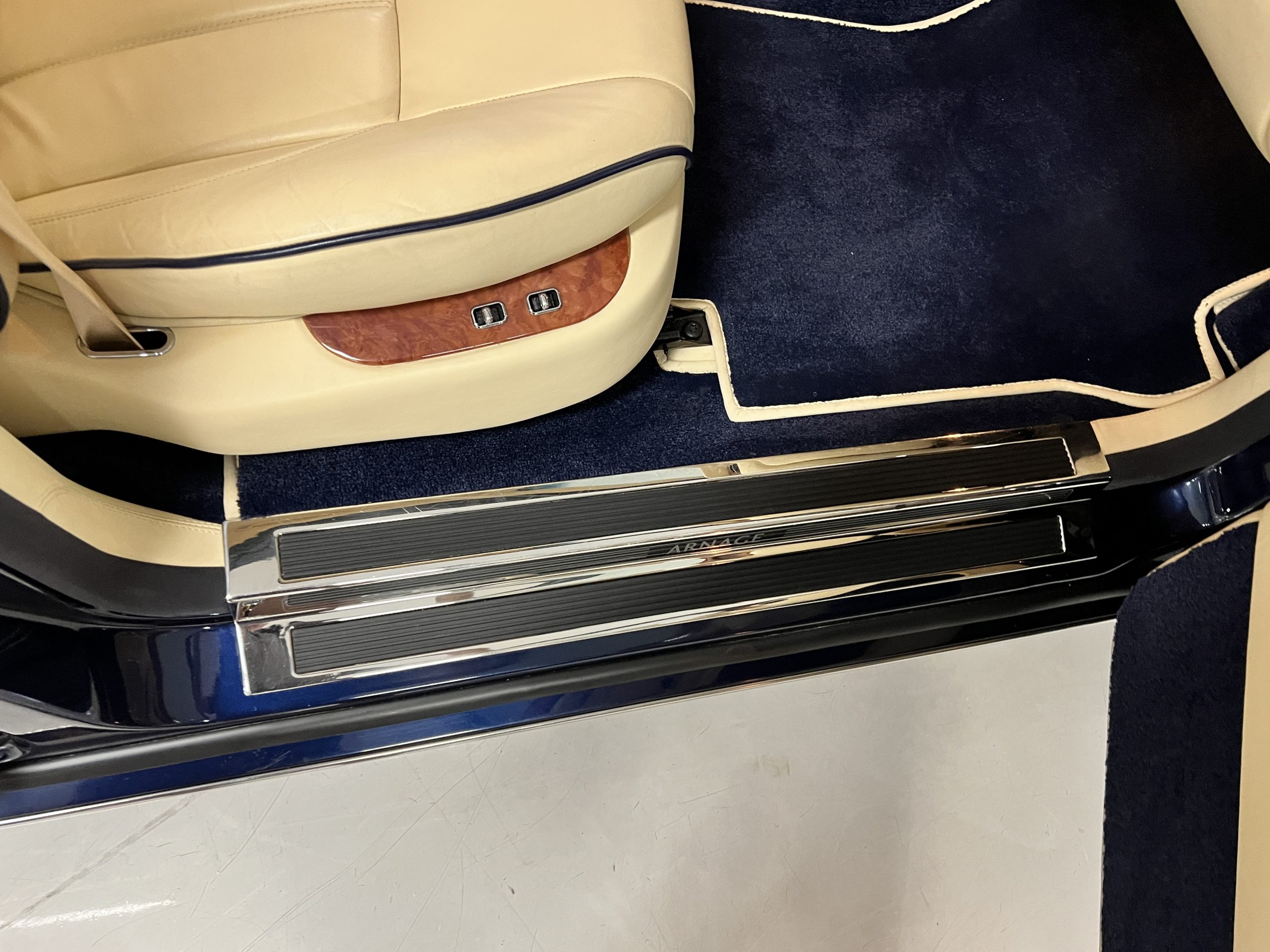 But the true magic of the RLs is its interior. The massive legroom in the rear is reminiscent of a Singapore Airlines first class cabin. Incredible legroom and crystal, Medrona wood veneer and mouton sheepskin overlays abound. The Magnolia leather (Trim Code SBT MA) seats are complimented with Peacock piping. There are picnic tables, writing tables, extra compartments for whatever one desires. The cap rails have imbedded Flying B logos and the headrests have embroidered Flying B’s sewn in. Dual umbrellas are stored in the trunk. Of course, there is an entertainment system and a premium Naim Auto system as well, featuring US TV and iPod interface. The wood veneer is perfect and only the driver’s seat shows slight wear, the rest of the interior is exceptional.