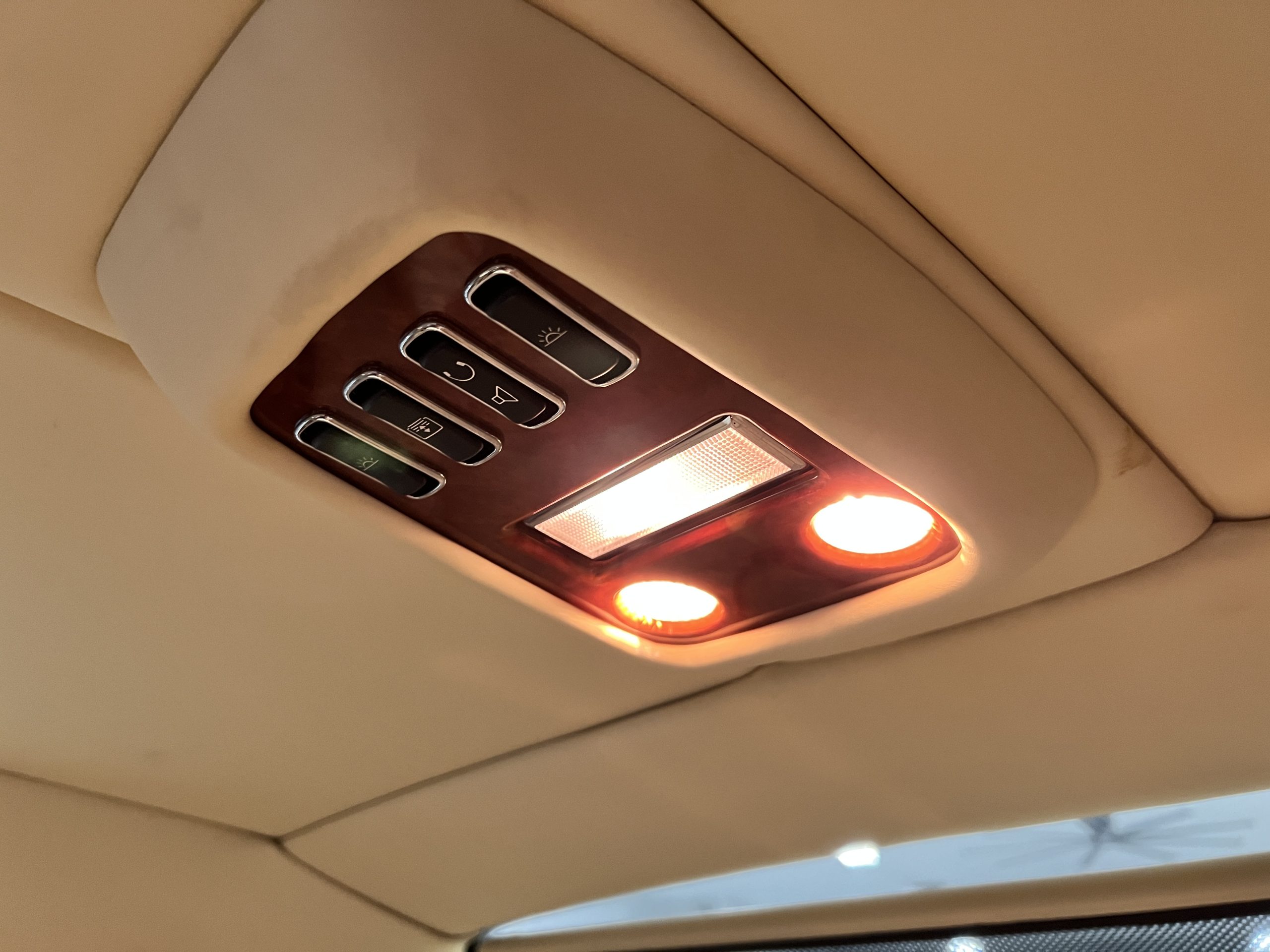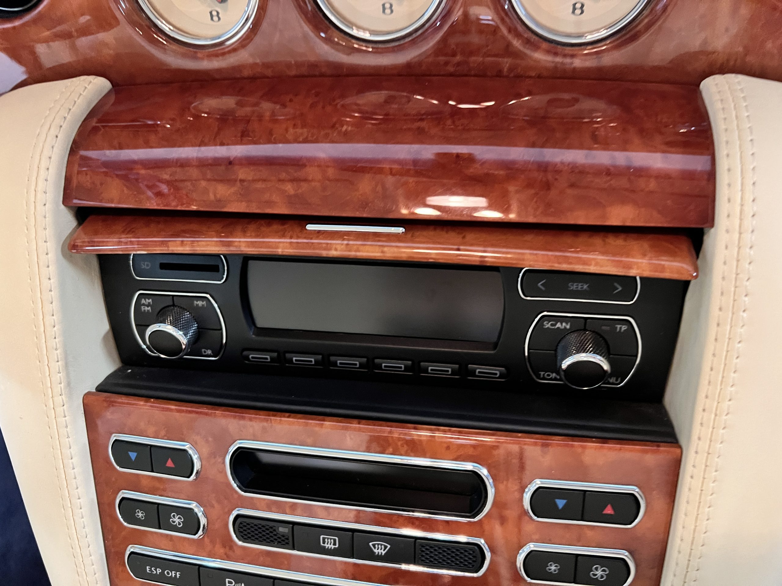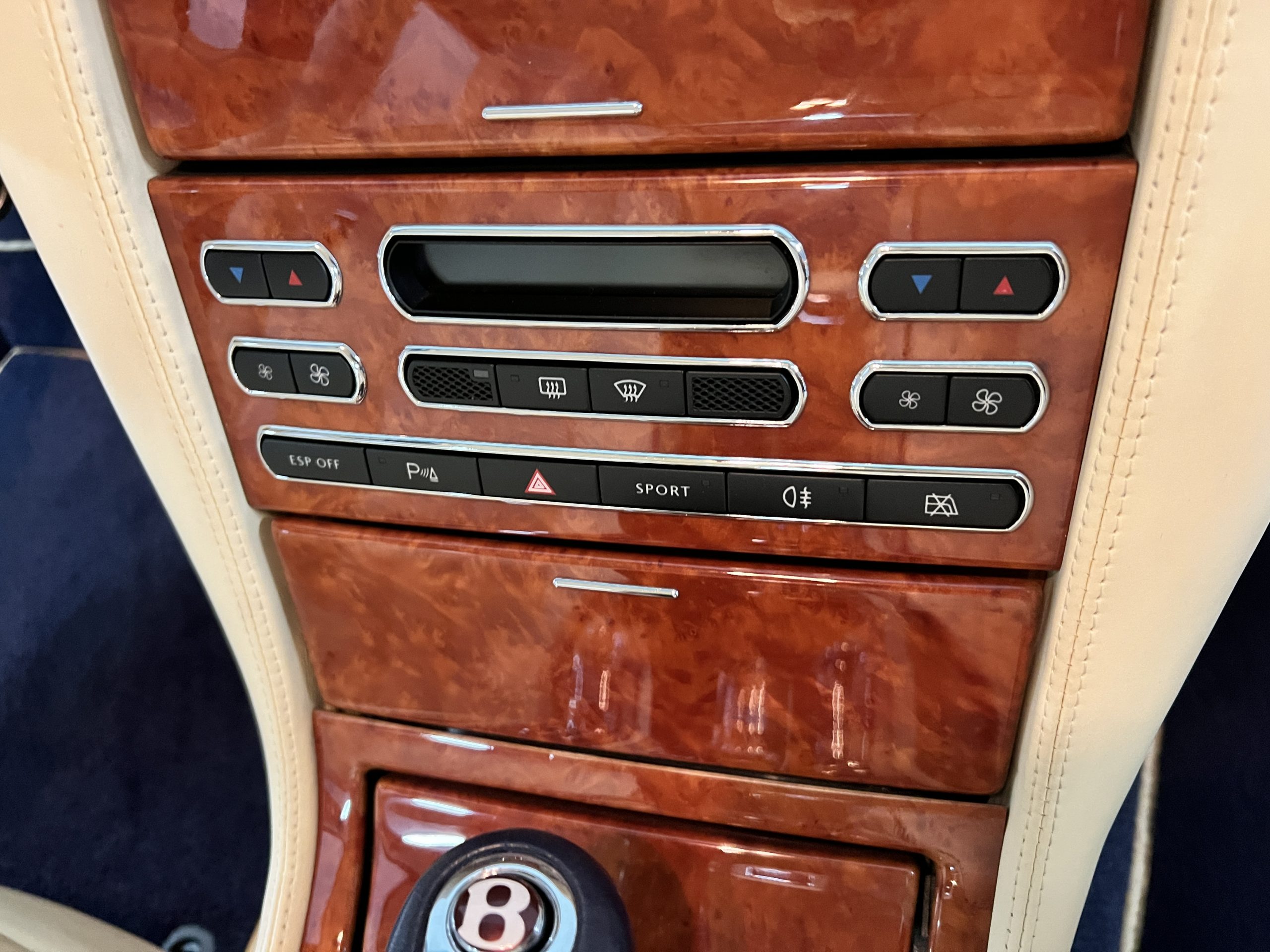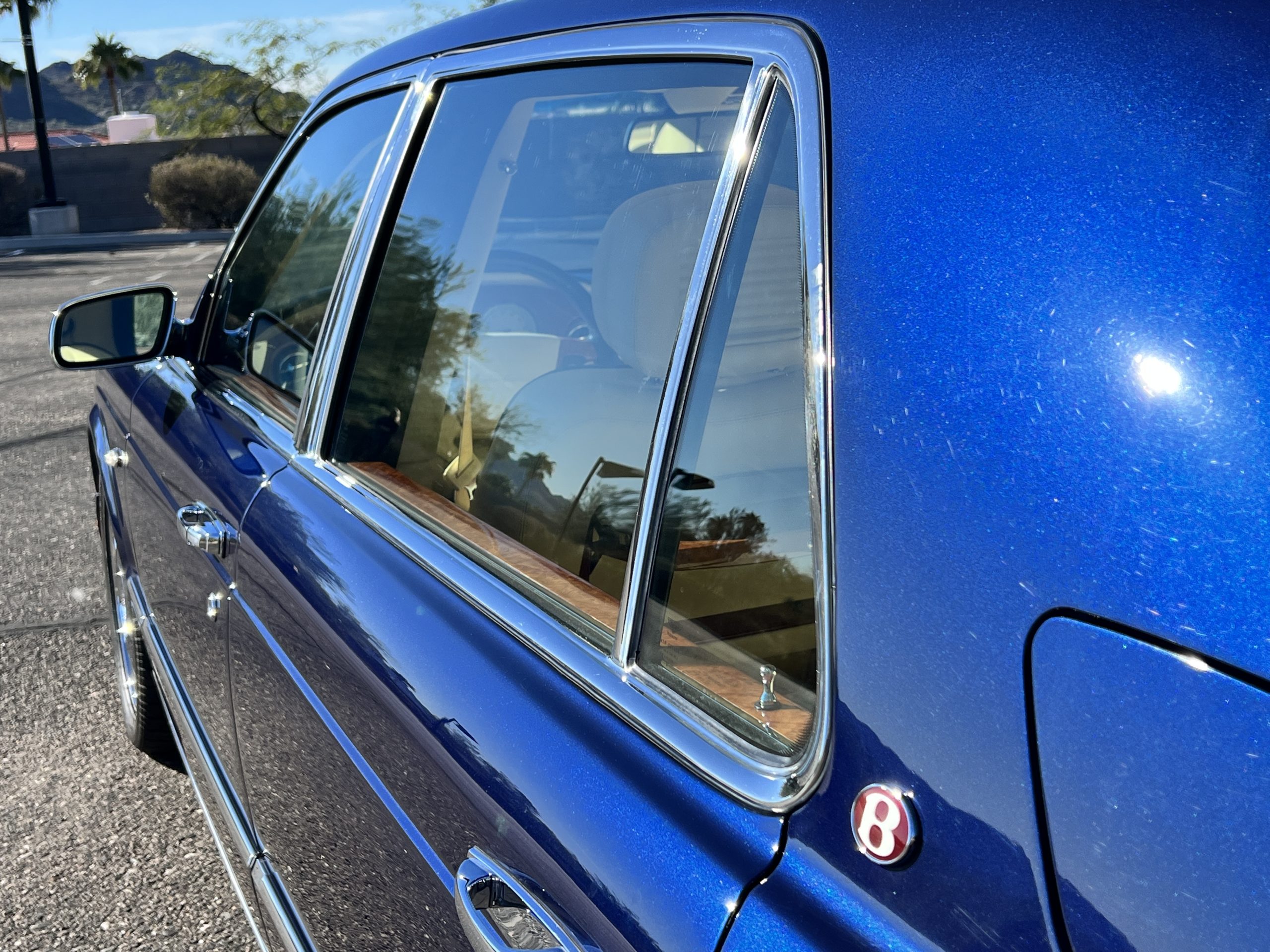 But the true magic of the RLs is its interior. The massive legroom in the rear is reminiscent of a Singapore Airlines first class cabin. Incredible legroom and crystal, Medrona wood veneer and mouton sheepskin overlays abound. The Magnolia leather (Trim Code SBT MA) seats are complimented with Peacock piping. There are picnic tables, writing tables, extra compartments for whatever one desires. The cap rails have imbedded Flying B logos and the headrests have embroidered Flying B’s sewn in. Dual umbrellas are stored in the trunk. Of course, there is an entertainment system and a premium Naim Auto system as well, featuring US TV and iPod interface. The wood veneer is perfect and only the driver’s seat shows slight wear, the rest of the interior is exceptional.