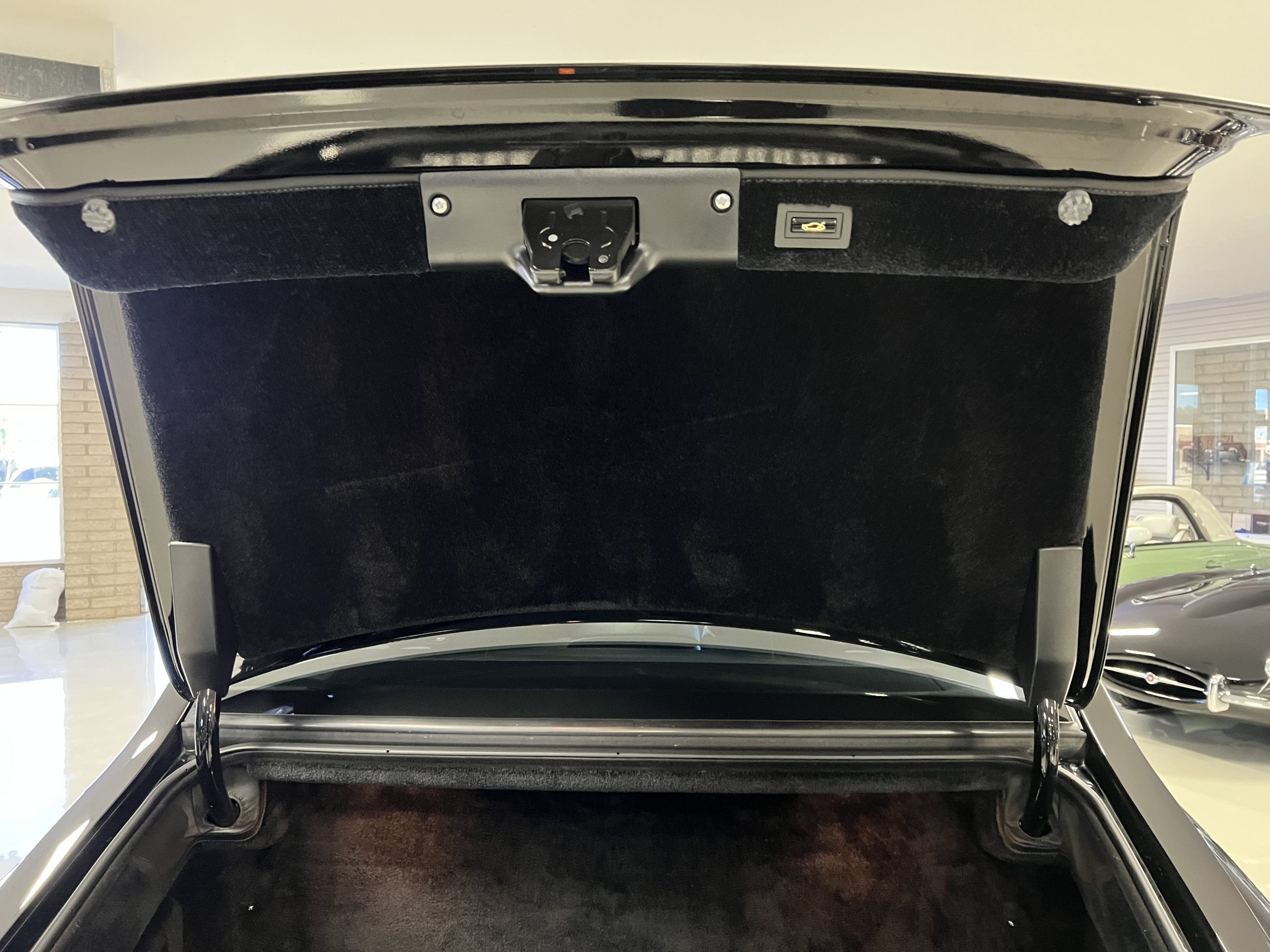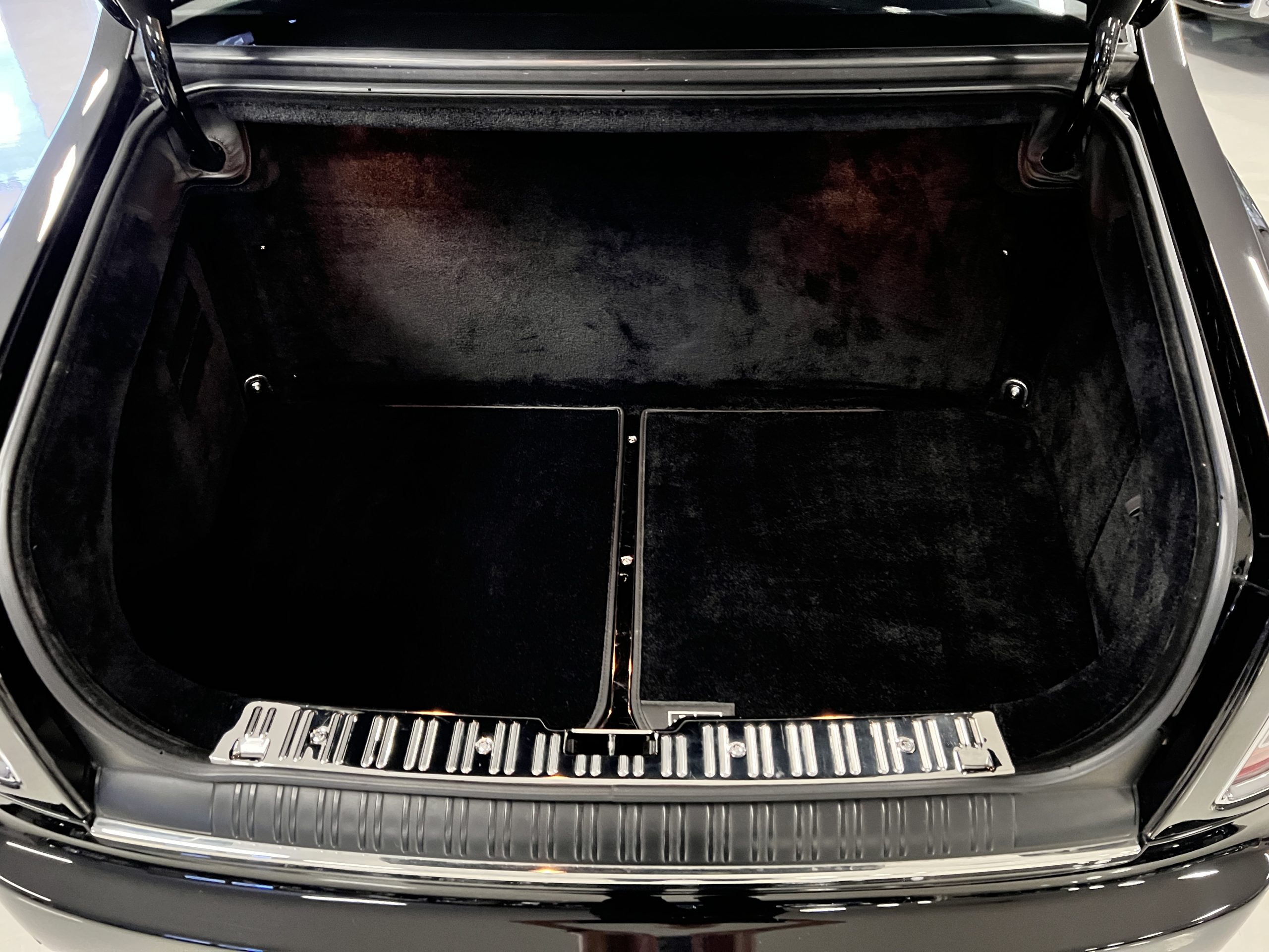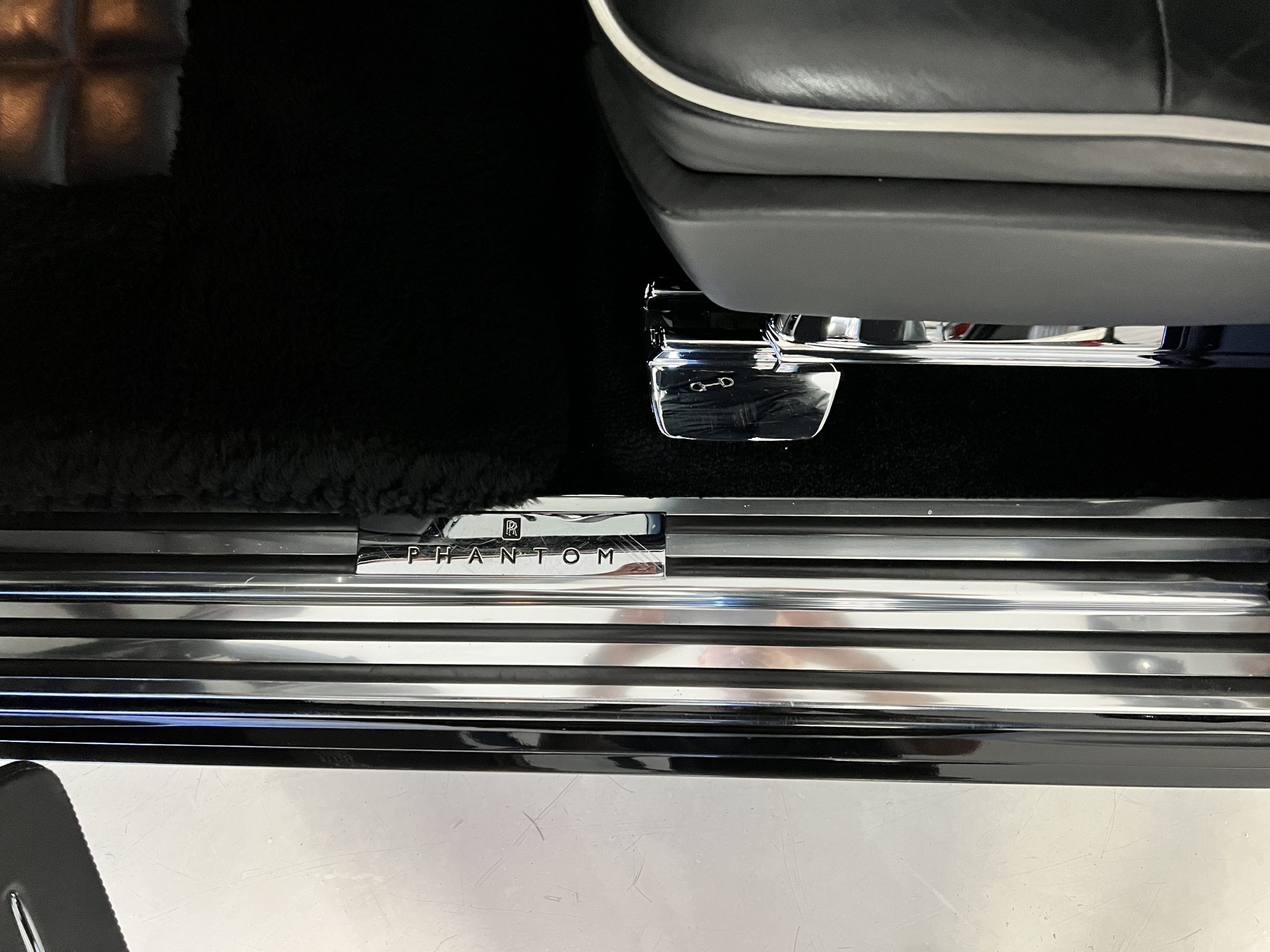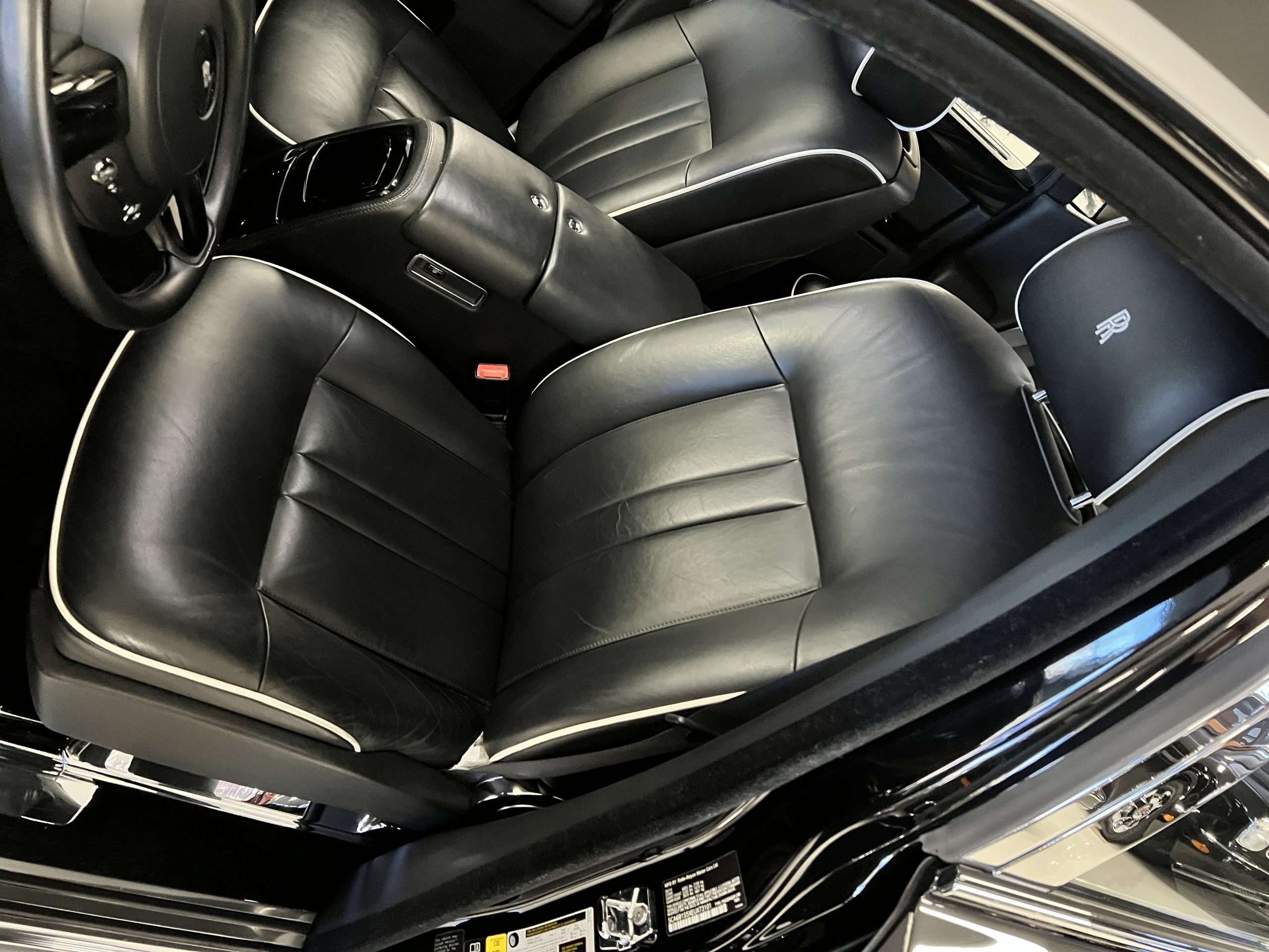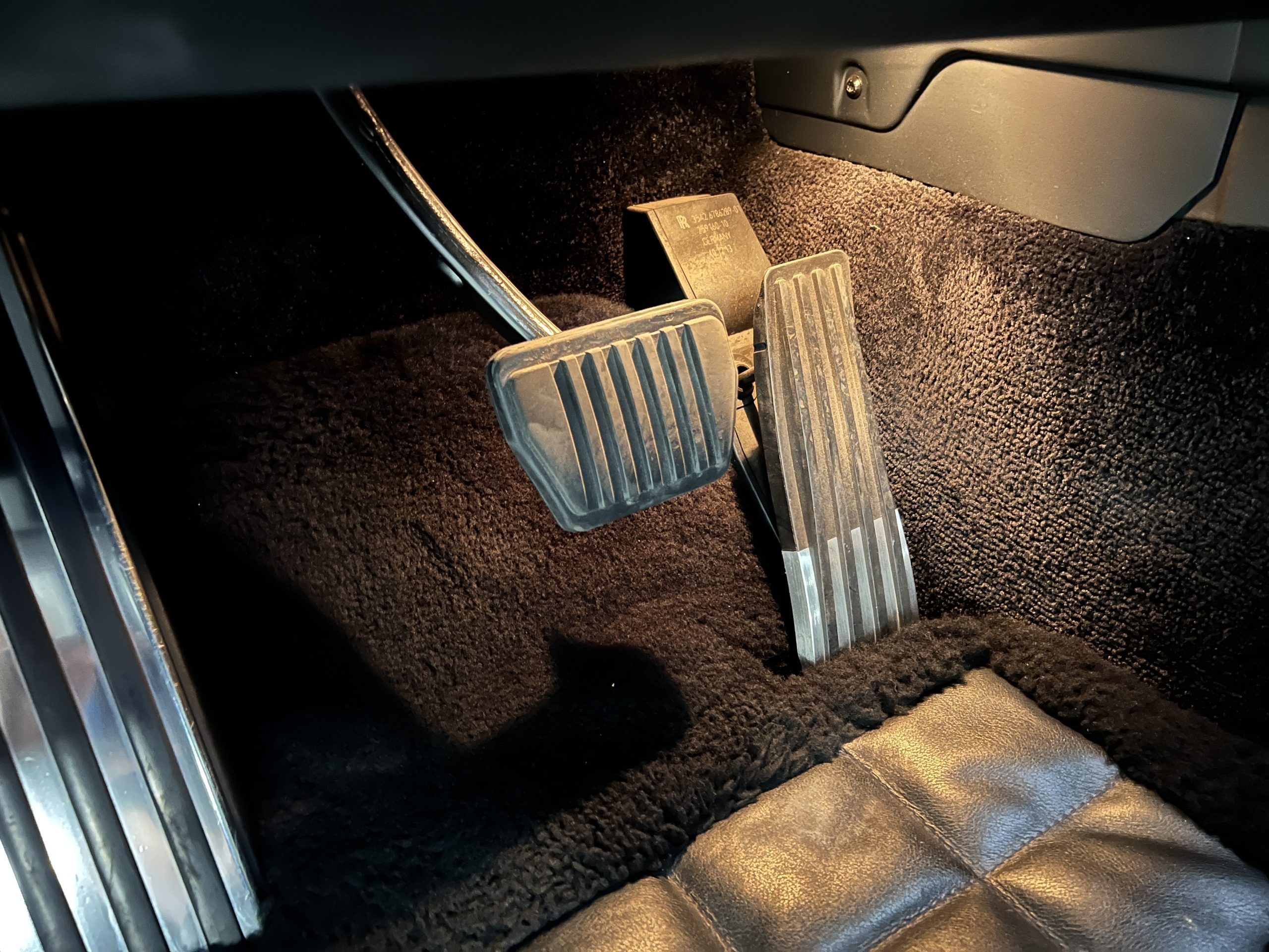 The interior is replete in black leather that shows no wear and is accented with an elegant and subtle gray piping. The highlight of the interior is the ebony black piano finished wood throughout. It is stupendous. The wood has inset “RR” logos in each of the cap rails on the doors. The only blemish is on the driver’s door, there is some minor cracking near the inlayed logo. The black Wilton wool carpeting is covered with black mouton sheepskin overlays.