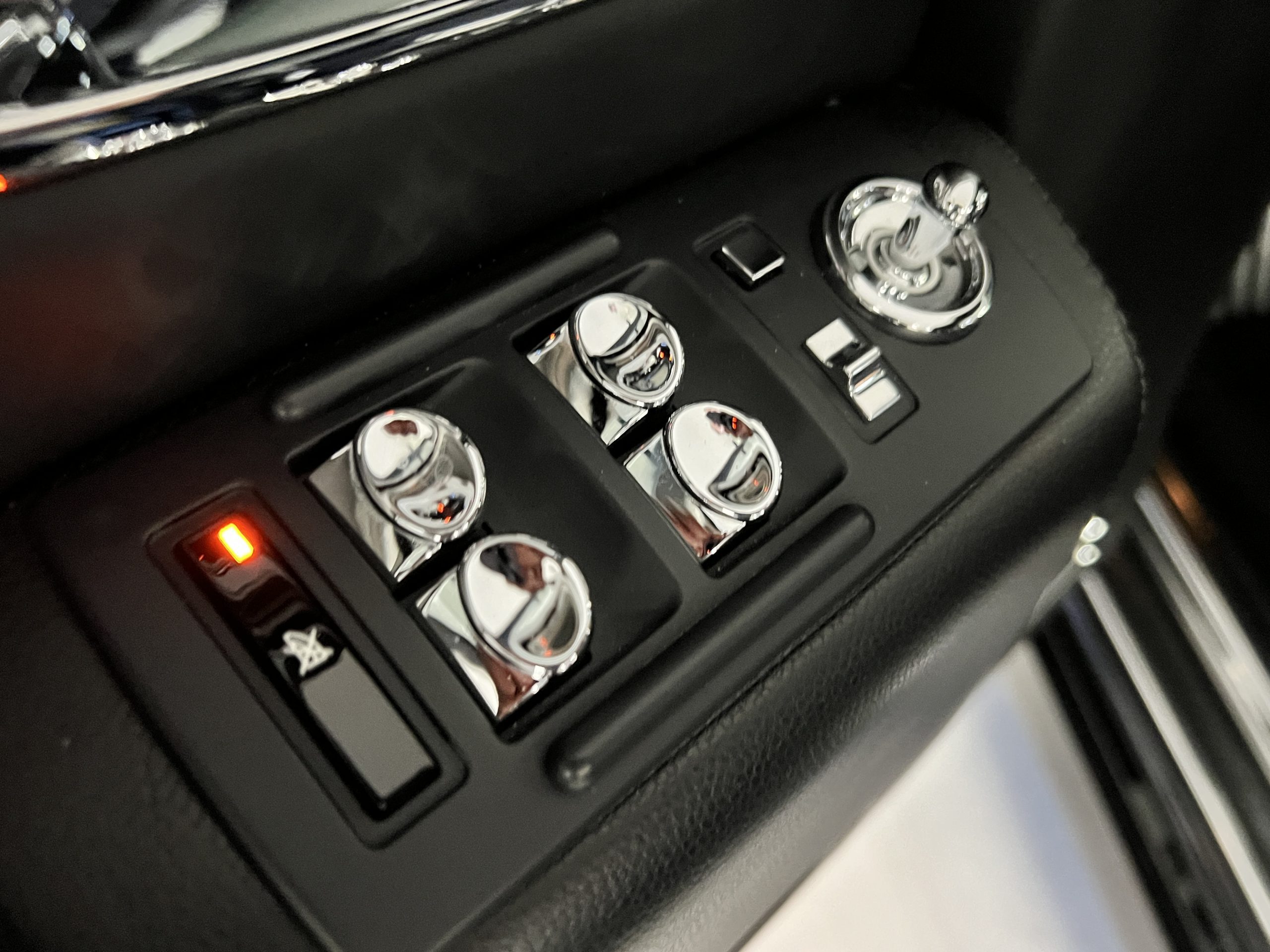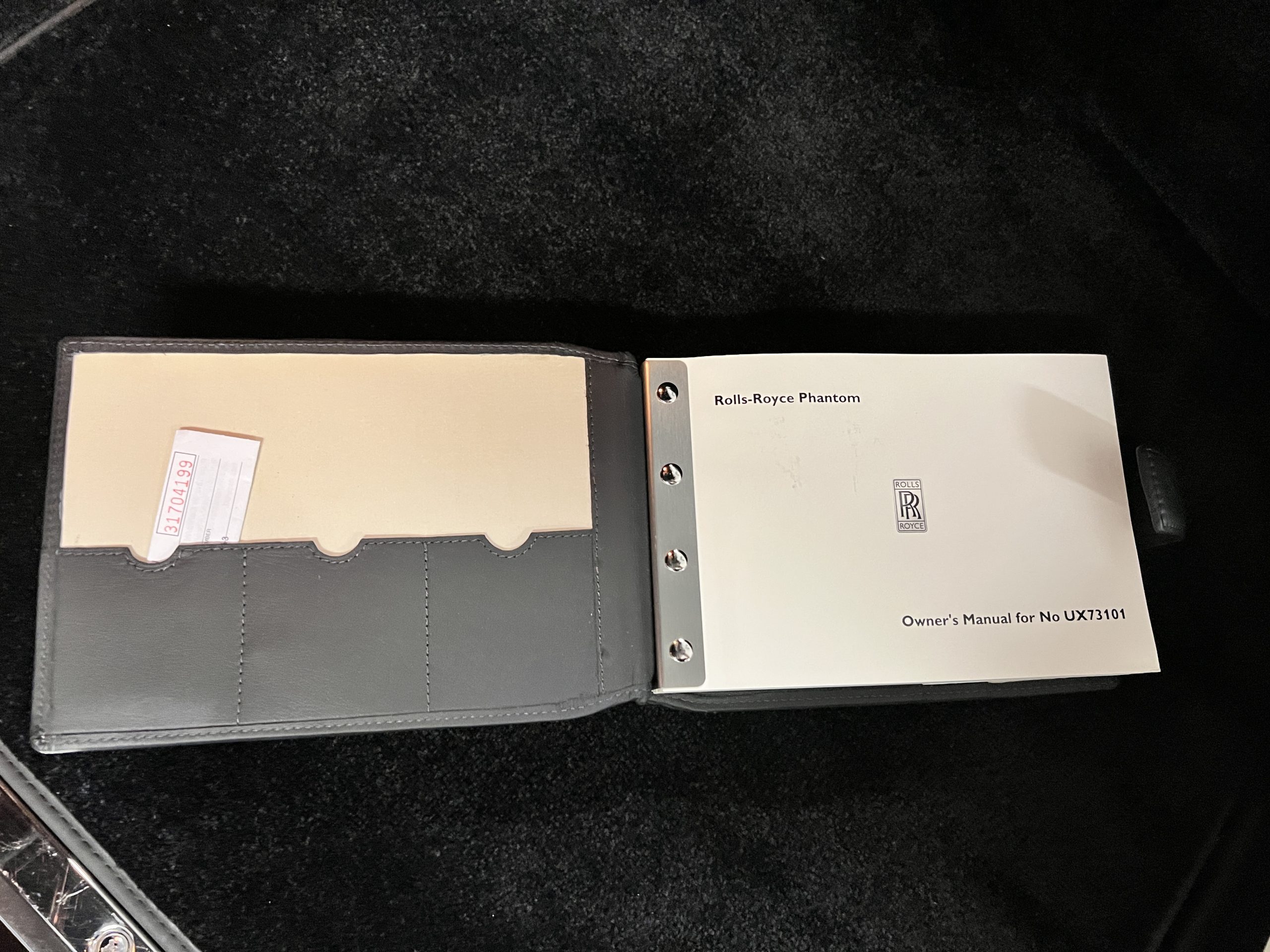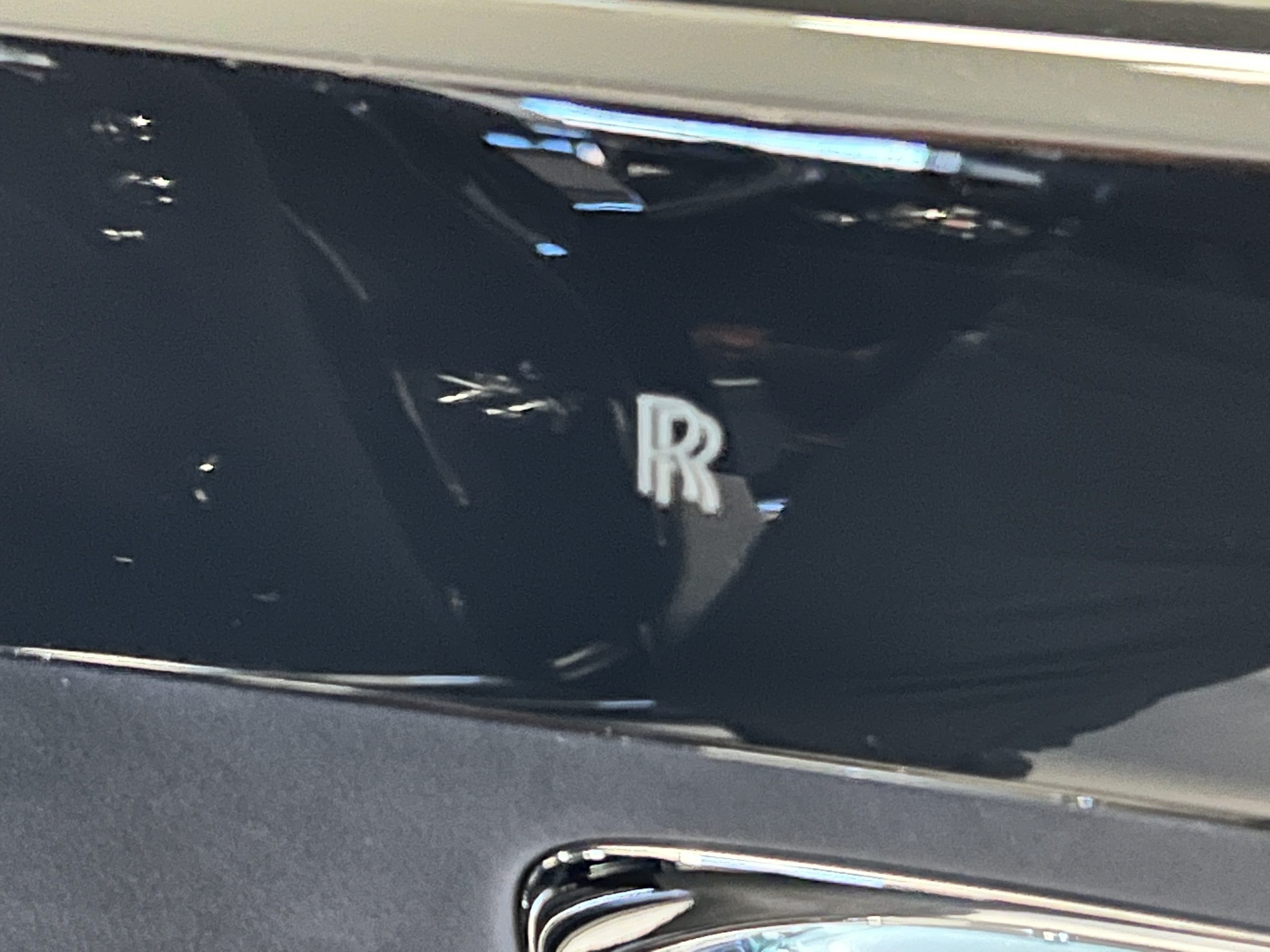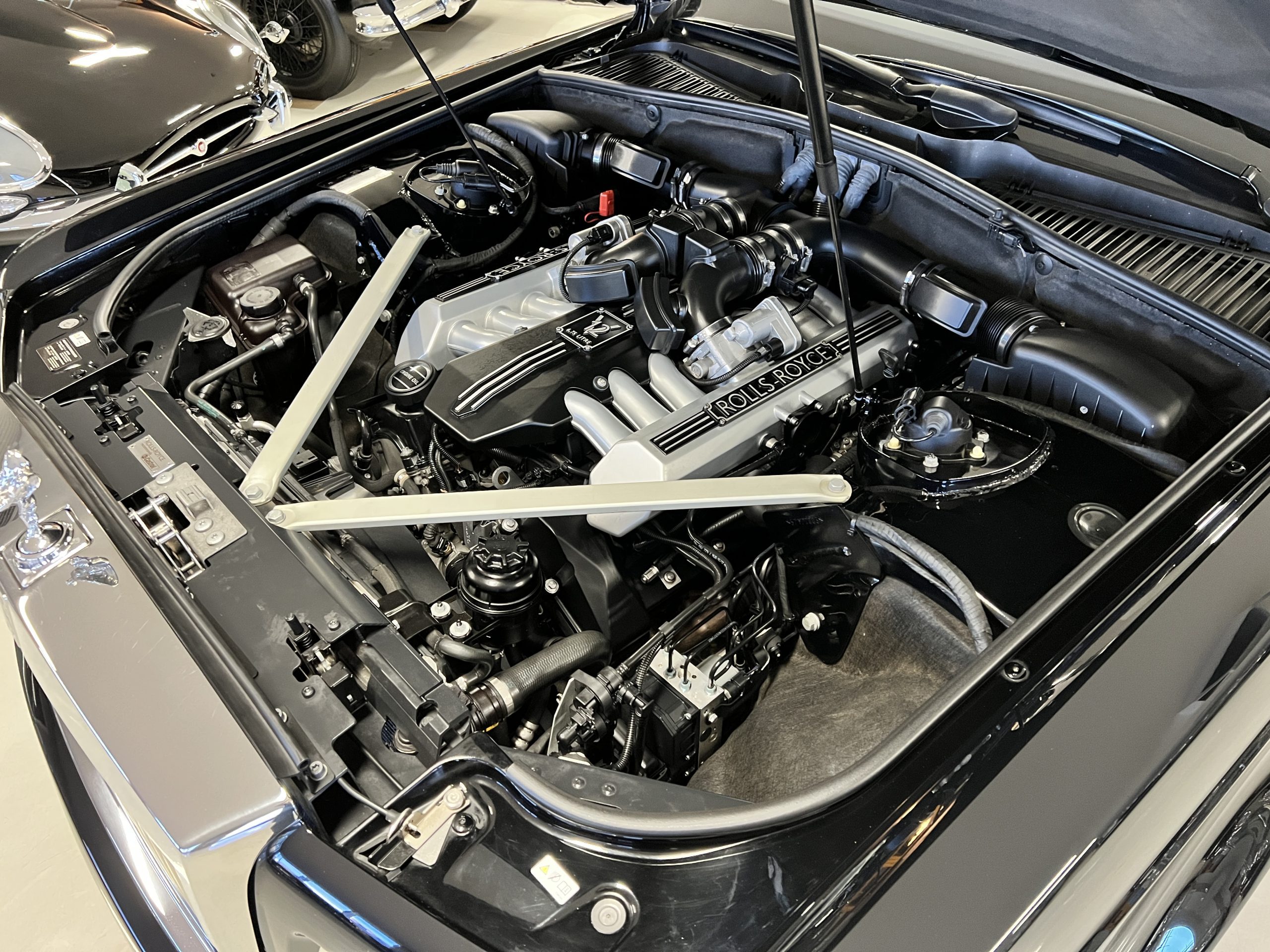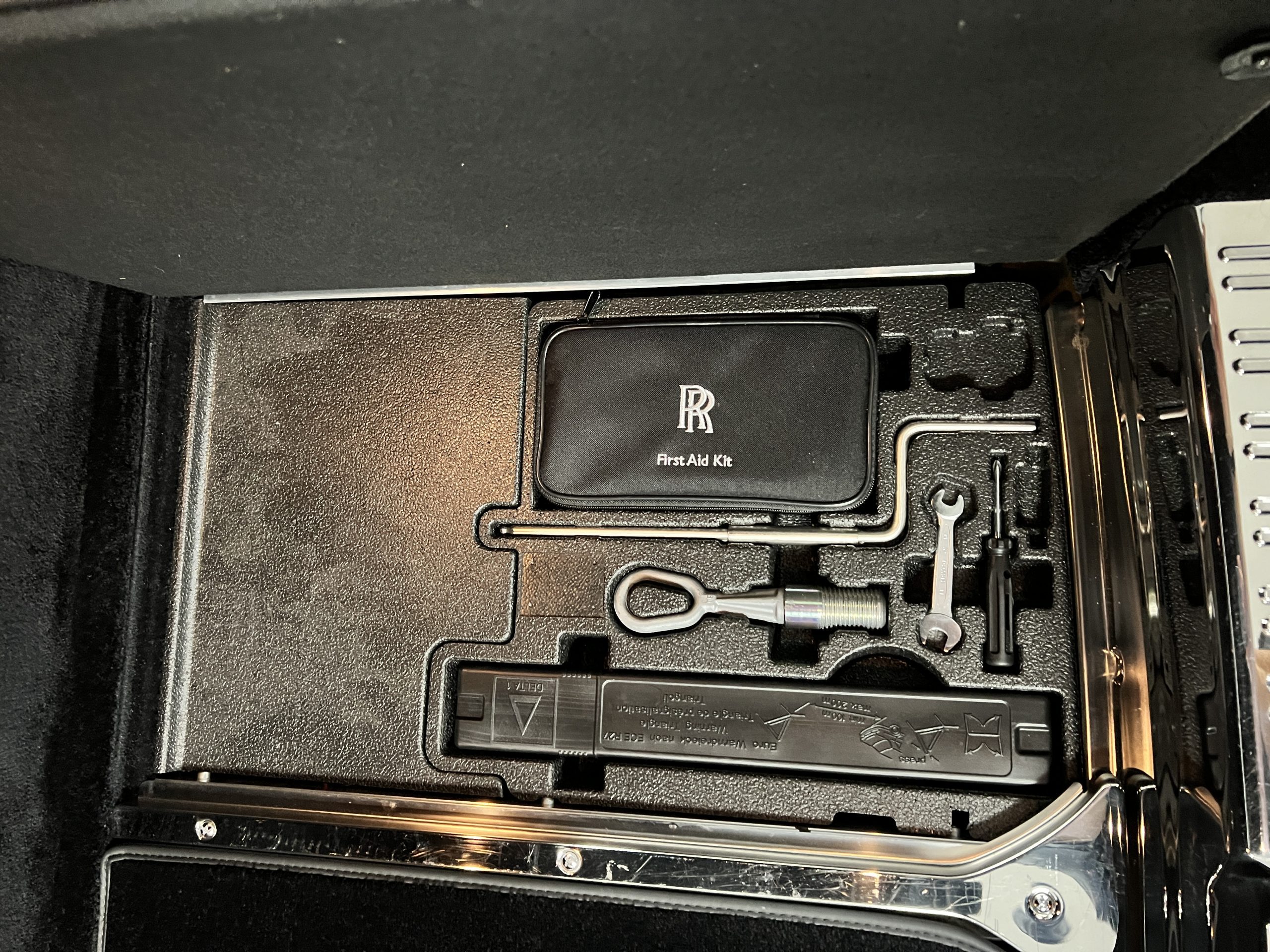The interior is replete in black leather that shows no wear and is accented with an elegant and subtle gray piping. The highlight of the interior is the ebony black piano finished wood throughout. It is stupendous. The wood has inset “RR” logos in each of the cap rails on the doors. The only blemish is on the driver’s door, there is some minor cracking near the inlayed logo. The black Wilton wool carpeting is covered with black mouton sheepskin overlays.