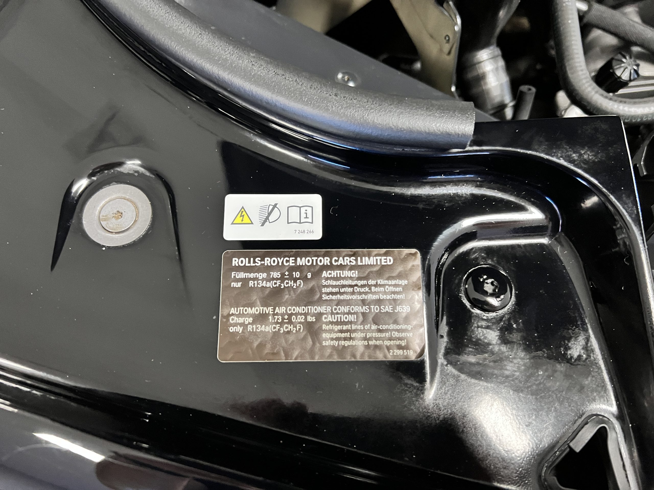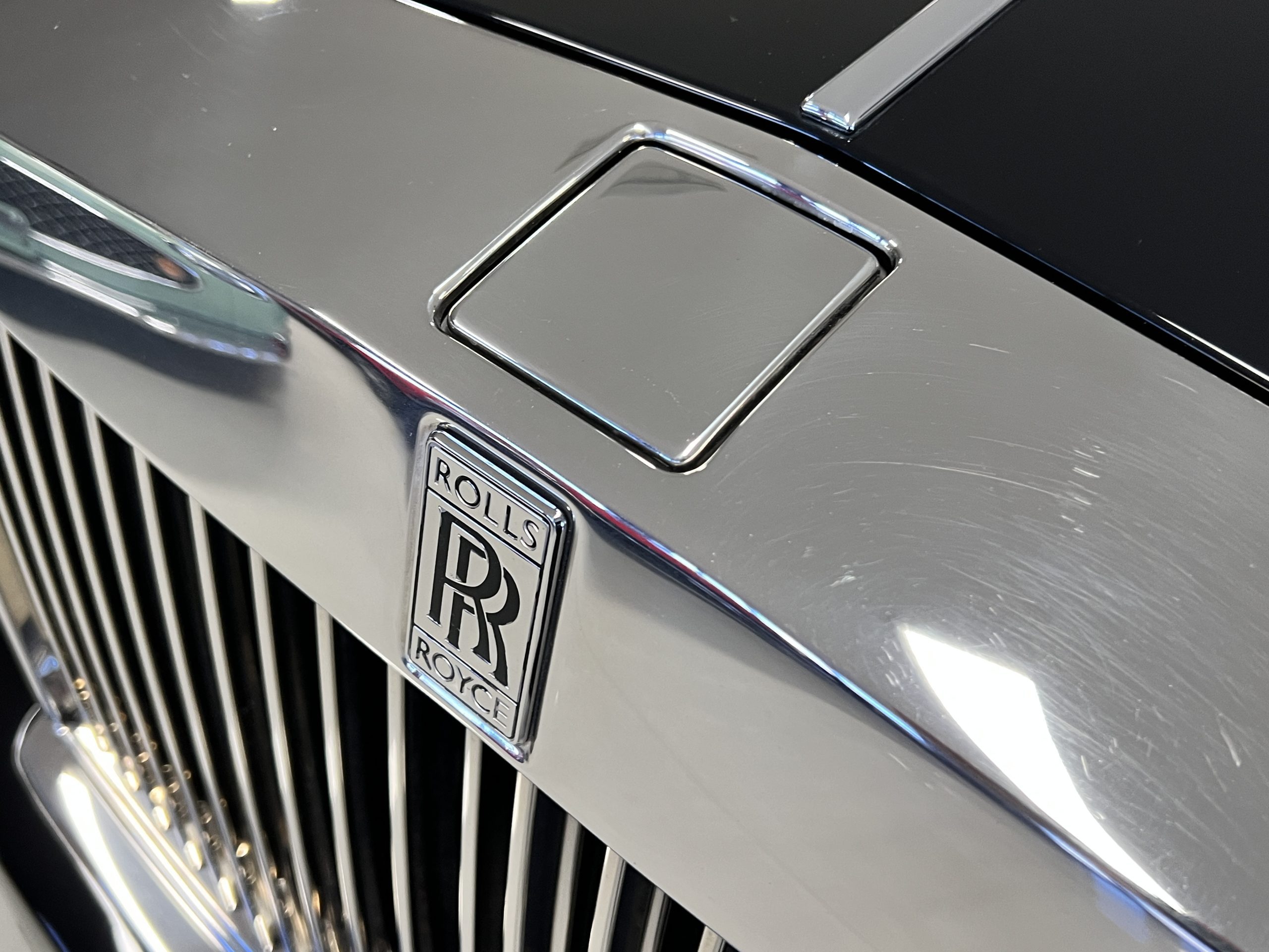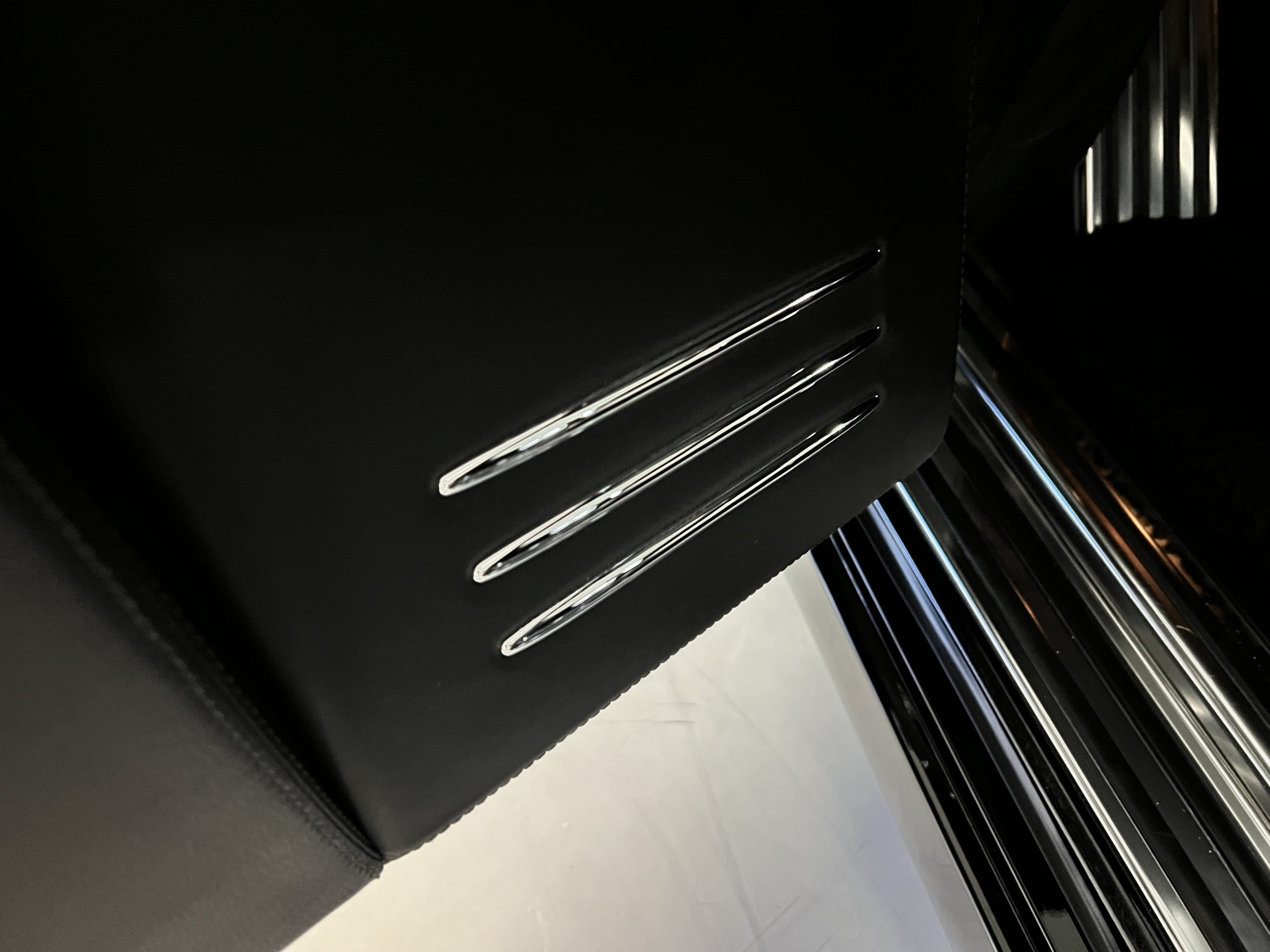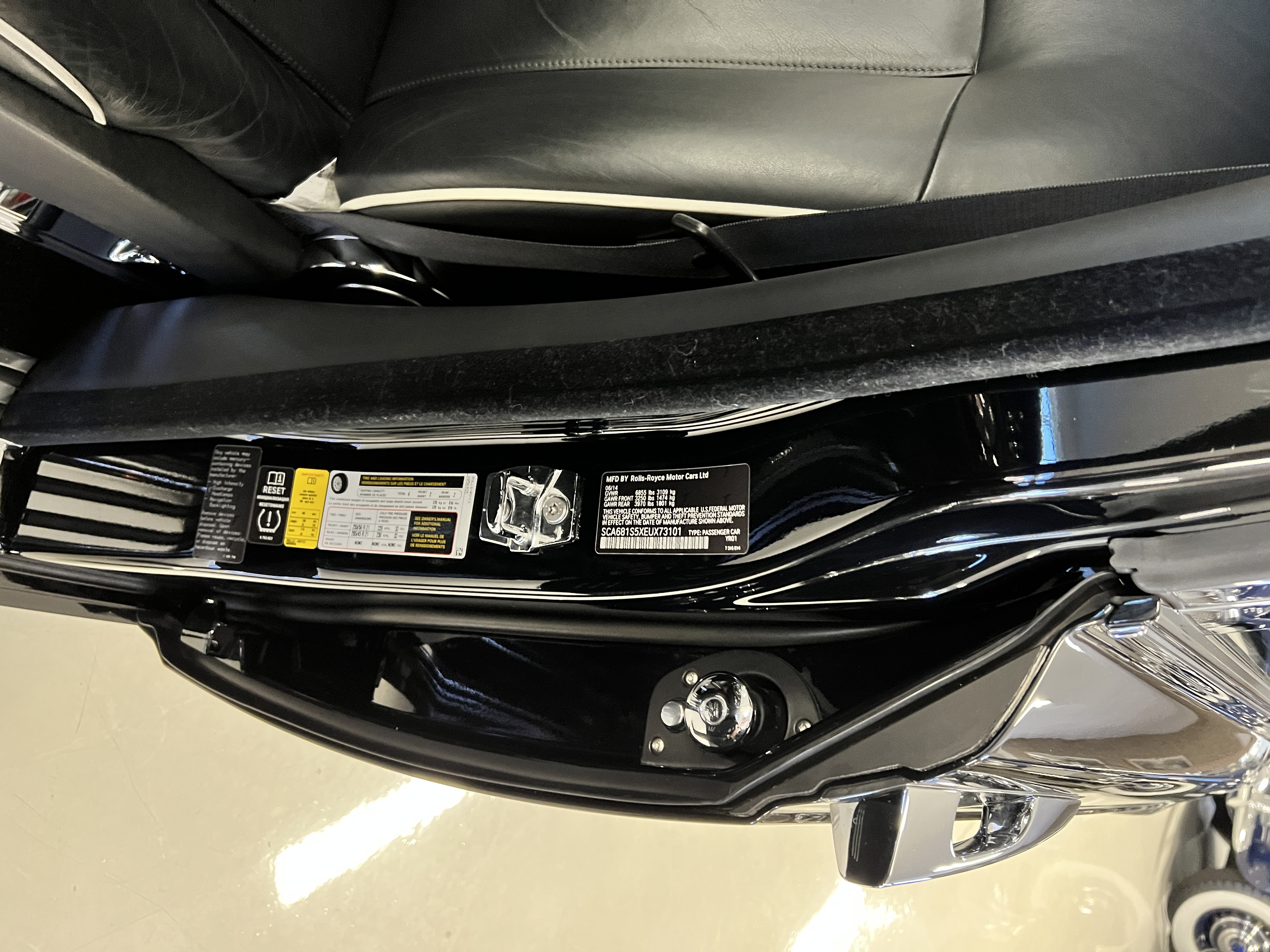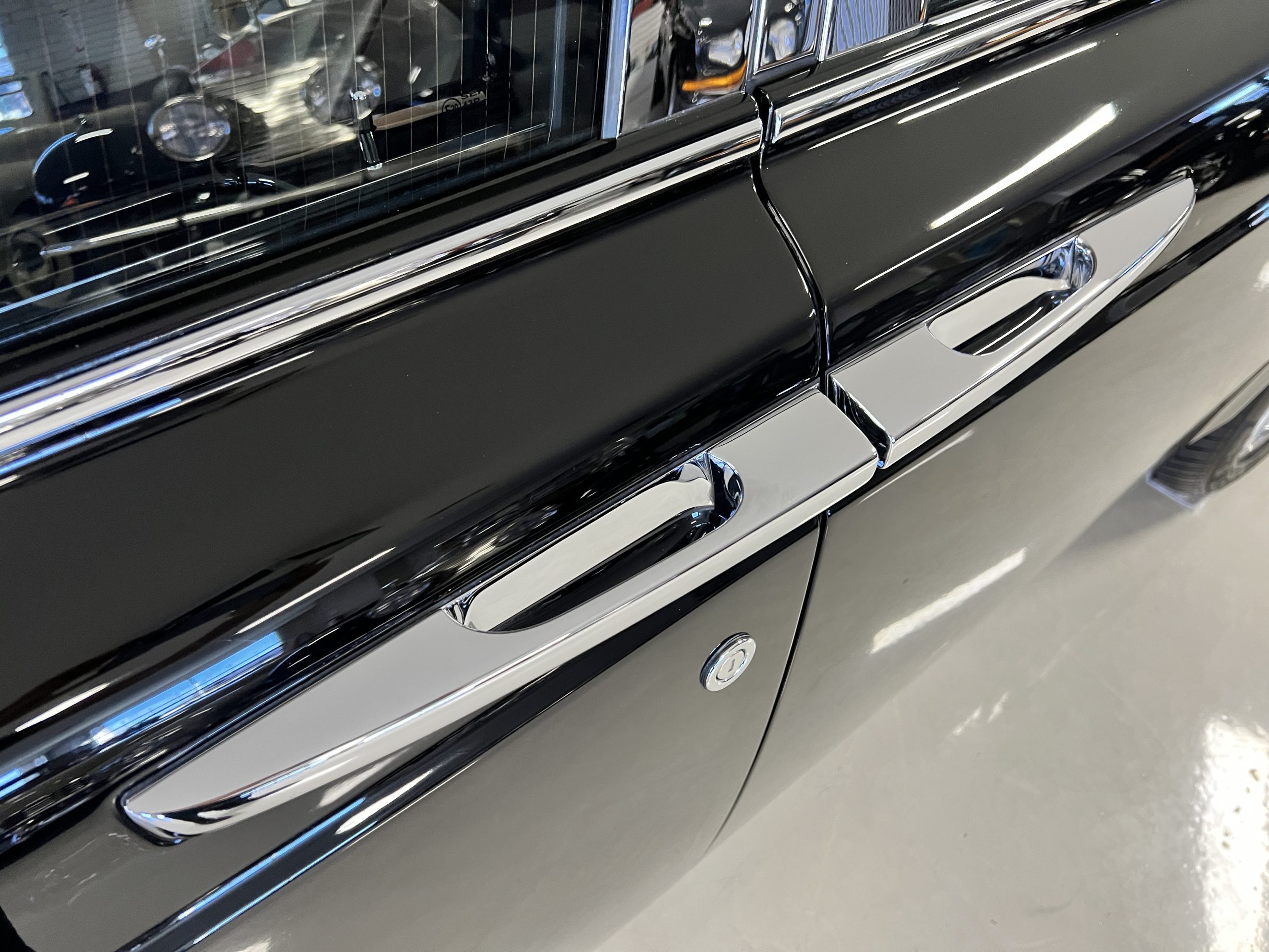 The interior is replete in black leather that shows no wear and is accented with an elegant and subtle gray piping. The highlight of the interior is the ebony black piano finished wood throughout. It is stupendous. The wood has inset “RR” logos in each of the cap rails on the doors. The only blemish is on the driver’s door, there is some minor cracking near the inlayed logo. The black Wilton wool carpeting is covered with black mouton sheepskin overlays.