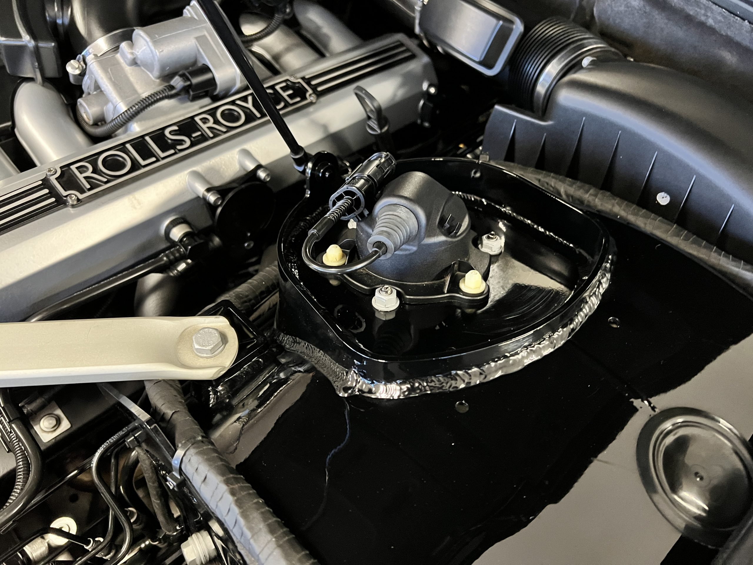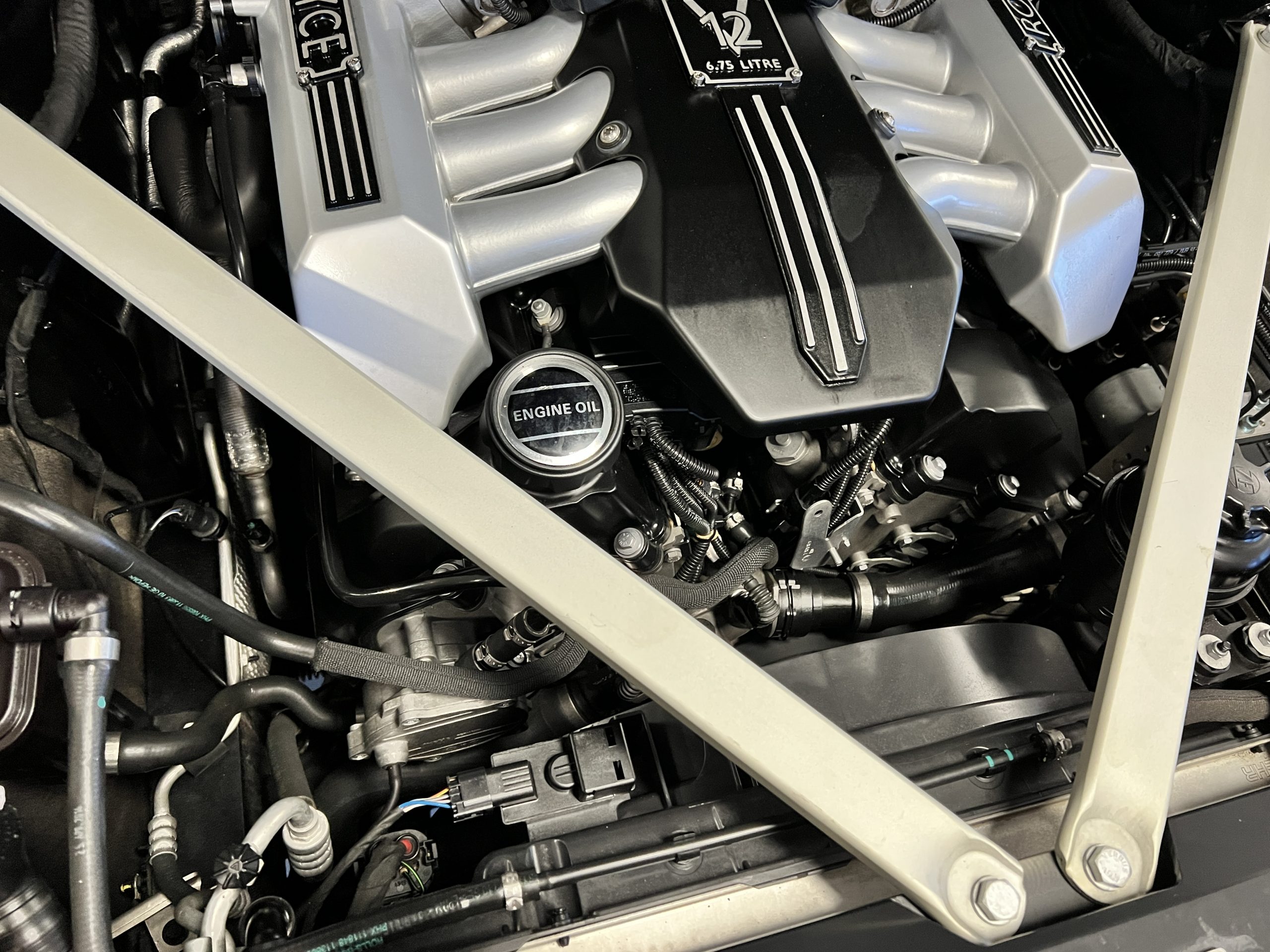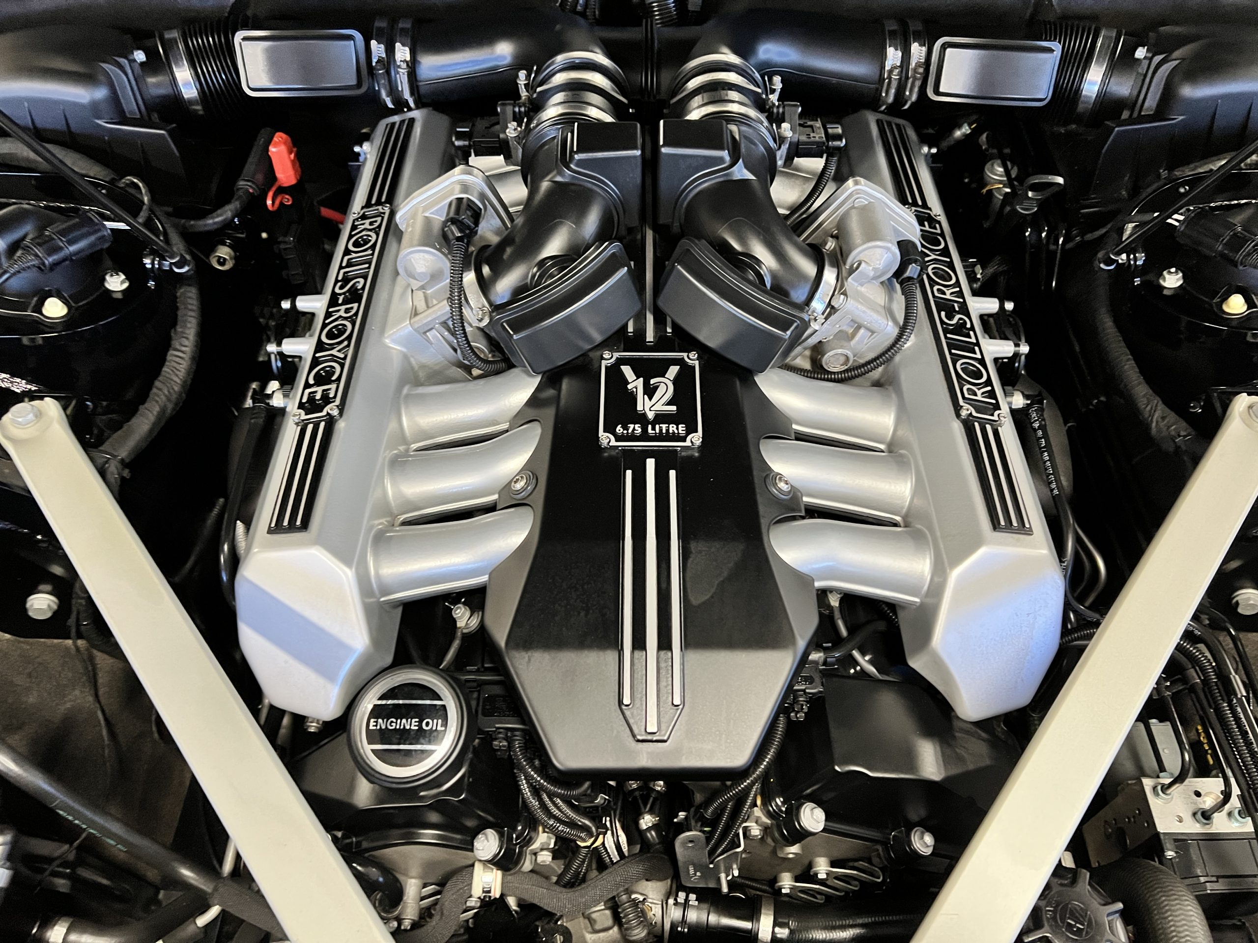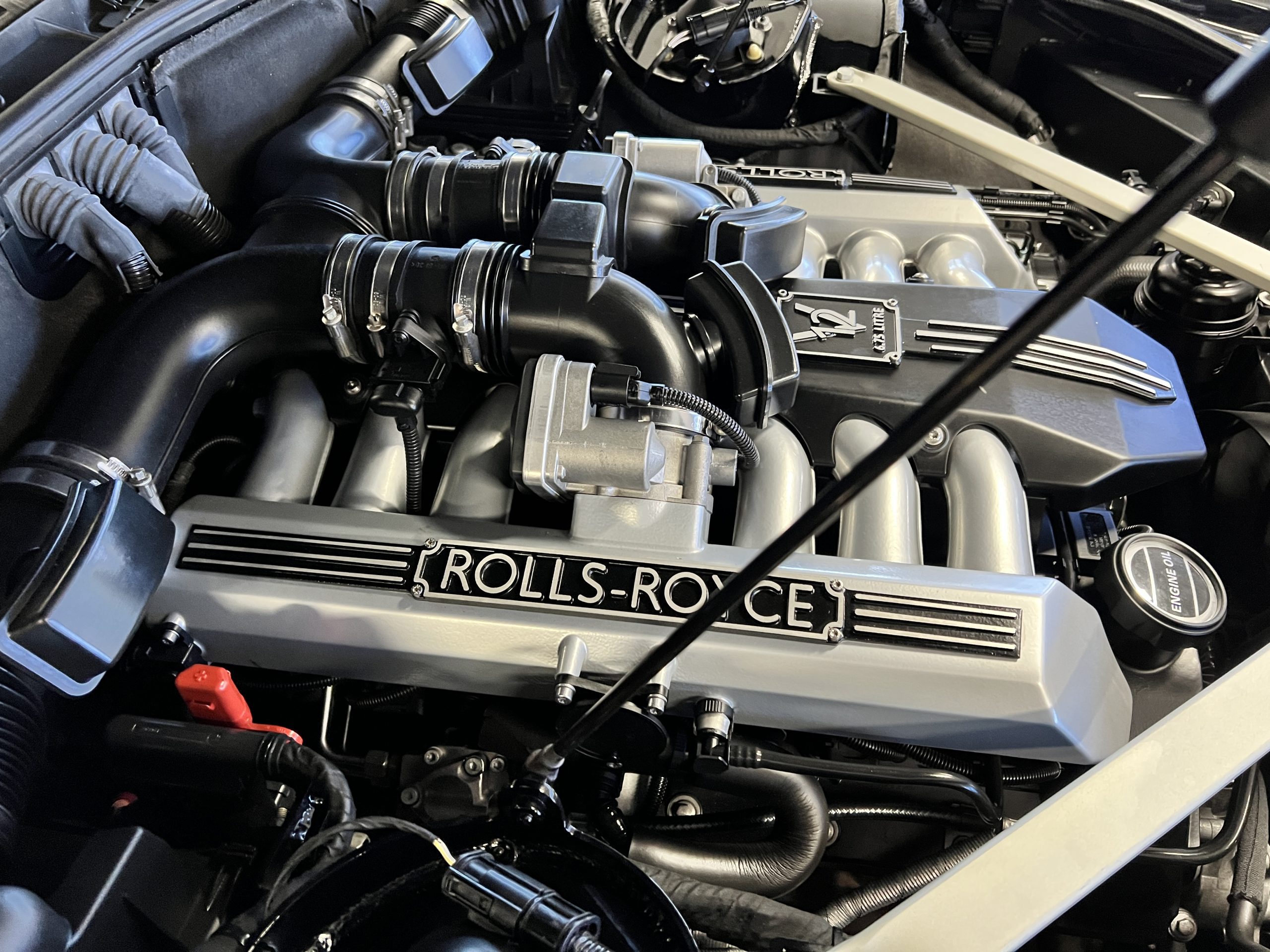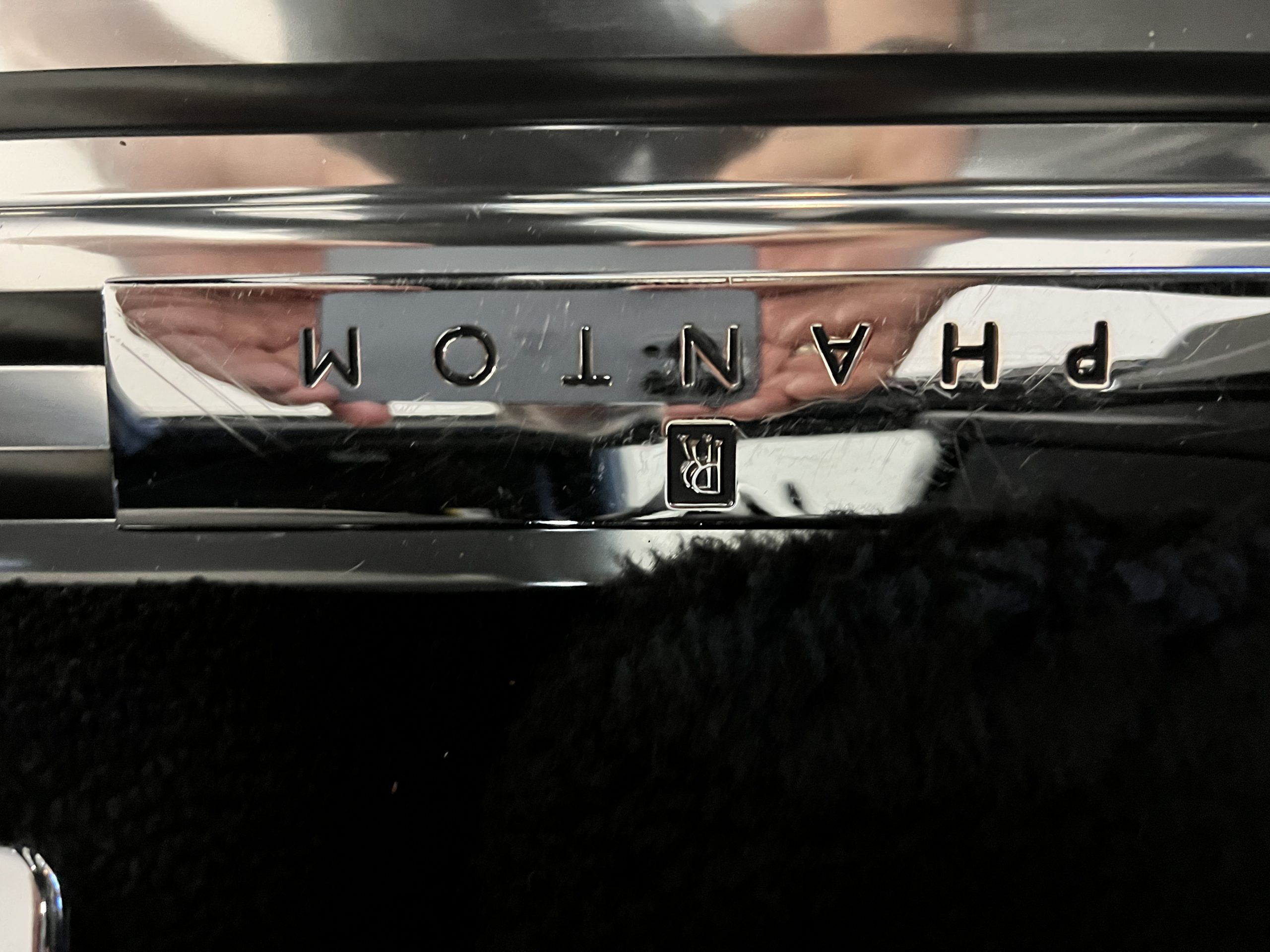 The interior is replete in black leather that shows no wear and is accented with an elegant and subtle gray piping. The highlight of the interior is the ebony black piano finished wood throughout. It is stupendous. The wood has inset “RR” logos in each of the cap rails on the doors. The only blemish is on the driver’s door, there is some minor cracking near the inlayed logo. The black Wilton wool carpeting is covered with black mouton sheepskin overlays.