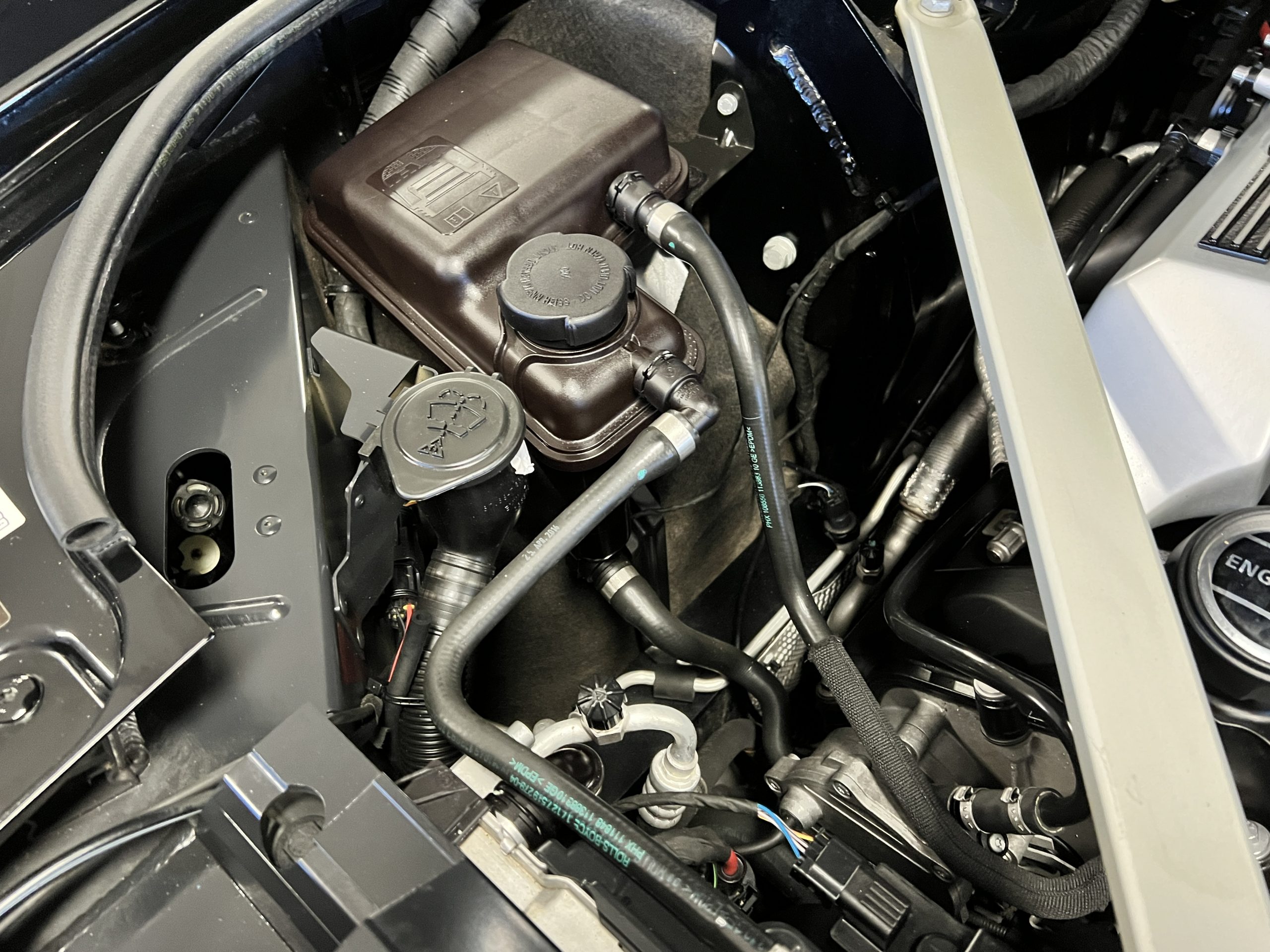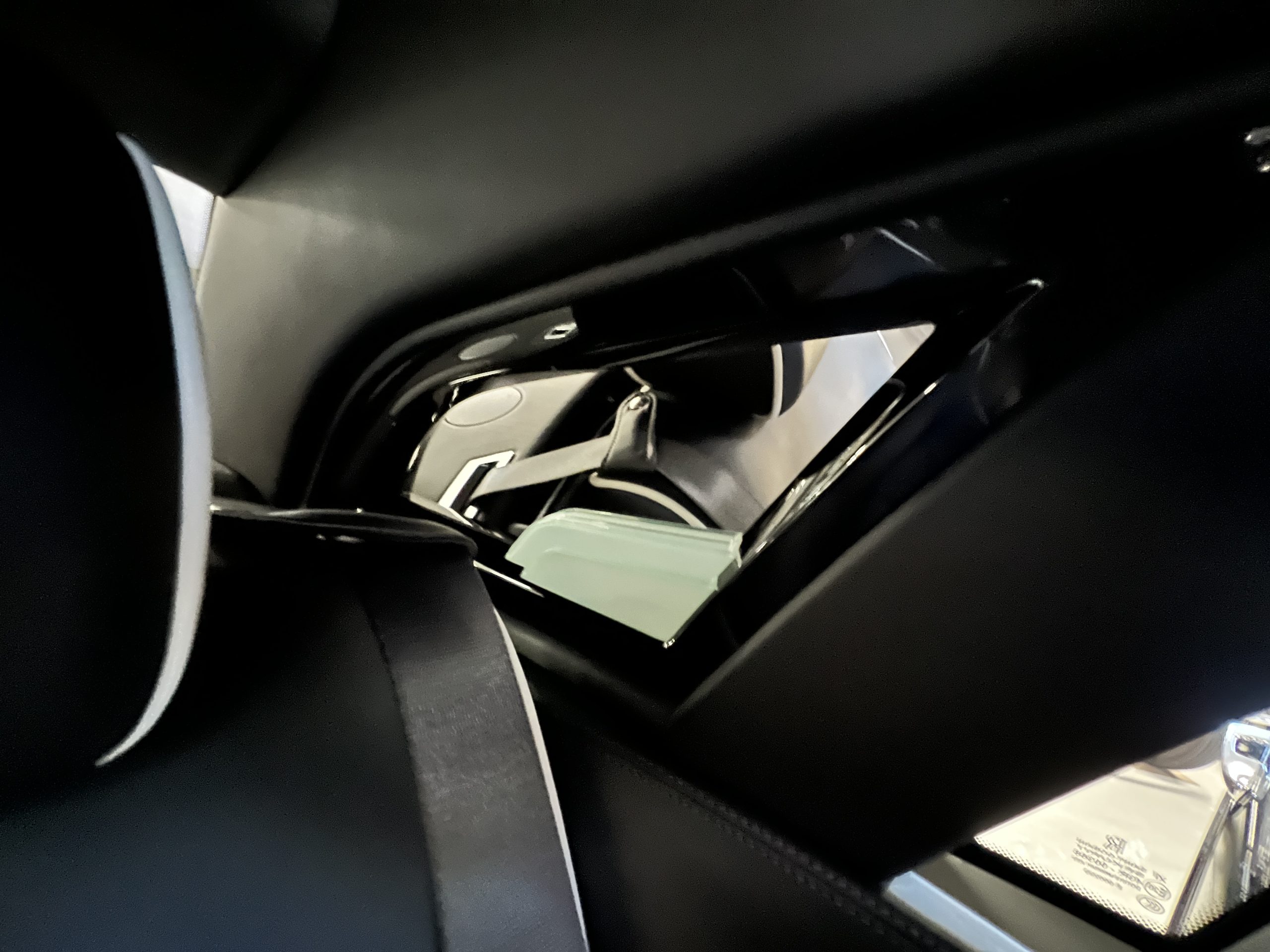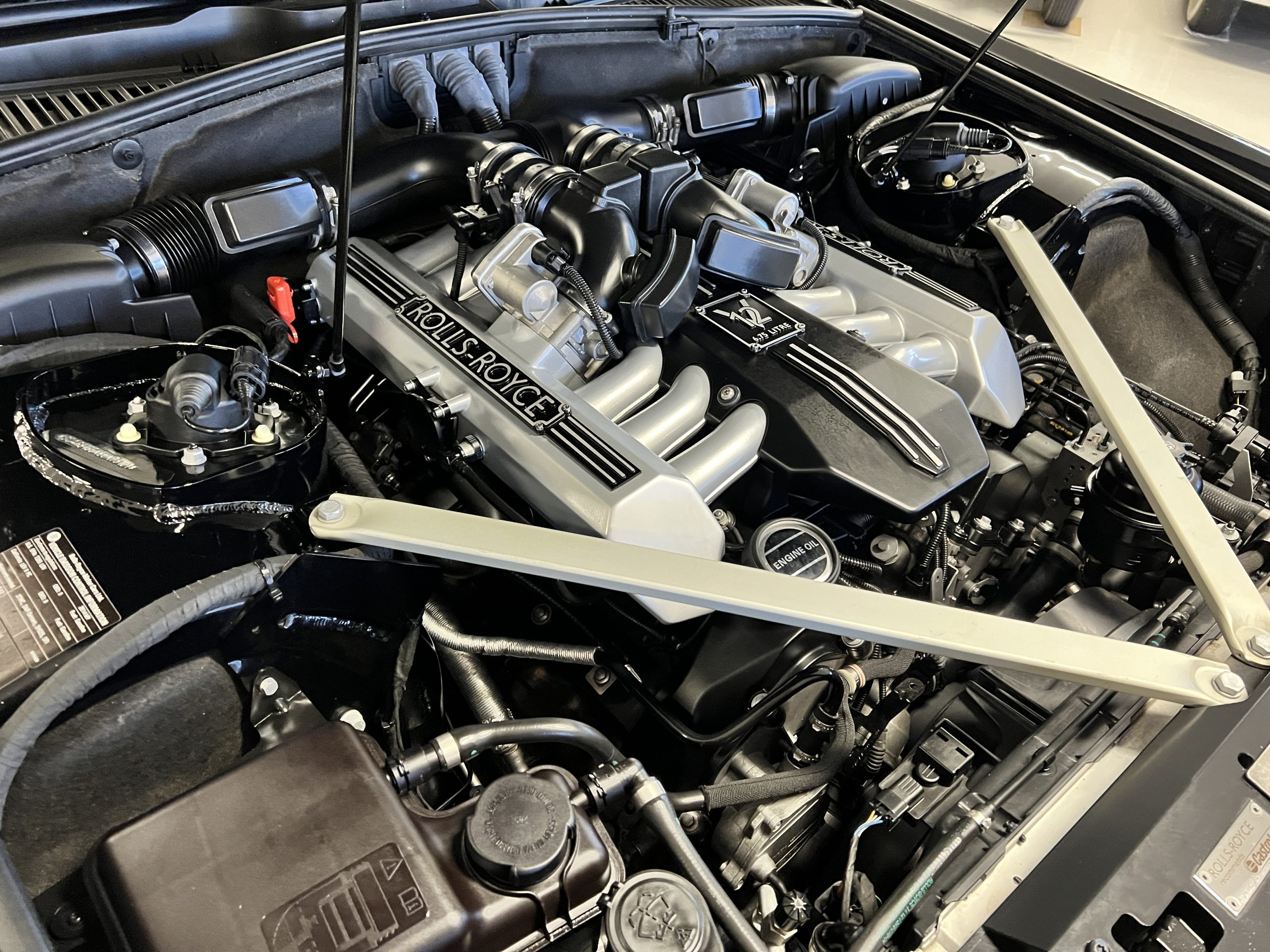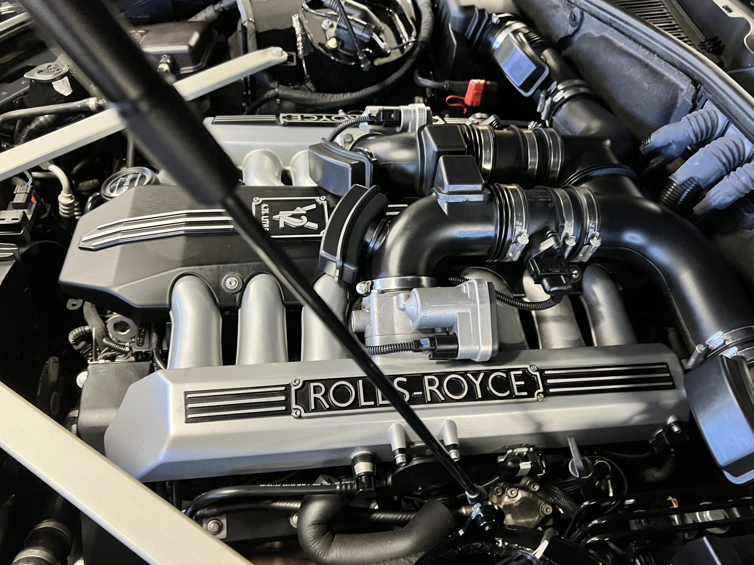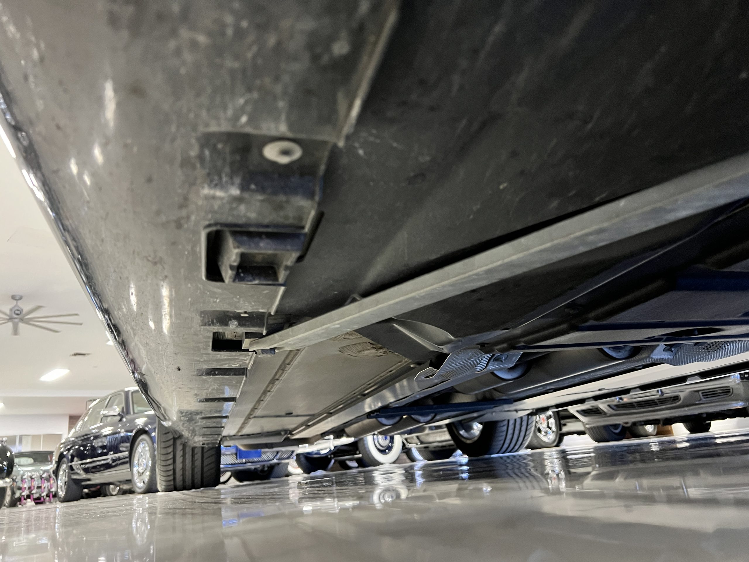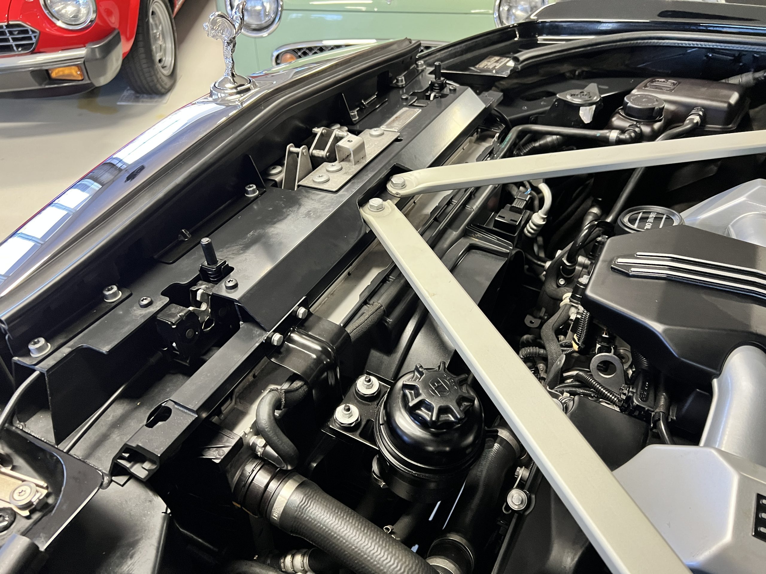 The interior is replete in black leather that shows no wear and is accented with an elegant and subtle gray piping. The highlight of the interior is the ebony black piano finished wood throughout. It is stupendous. The wood has inset “RR” logos in each of the cap rails on the doors. The only blemish is on the driver’s door, there is some minor cracking near the inlayed logo. The black Wilton wool carpeting is covered with black mouton sheepskin overlays.