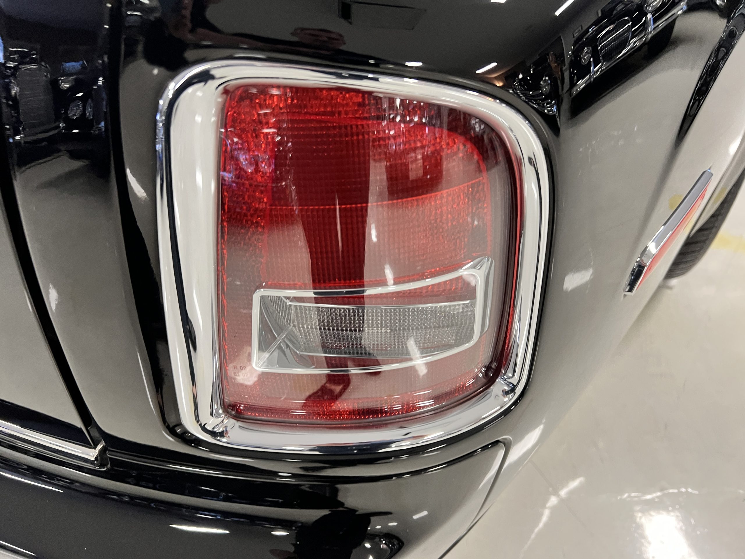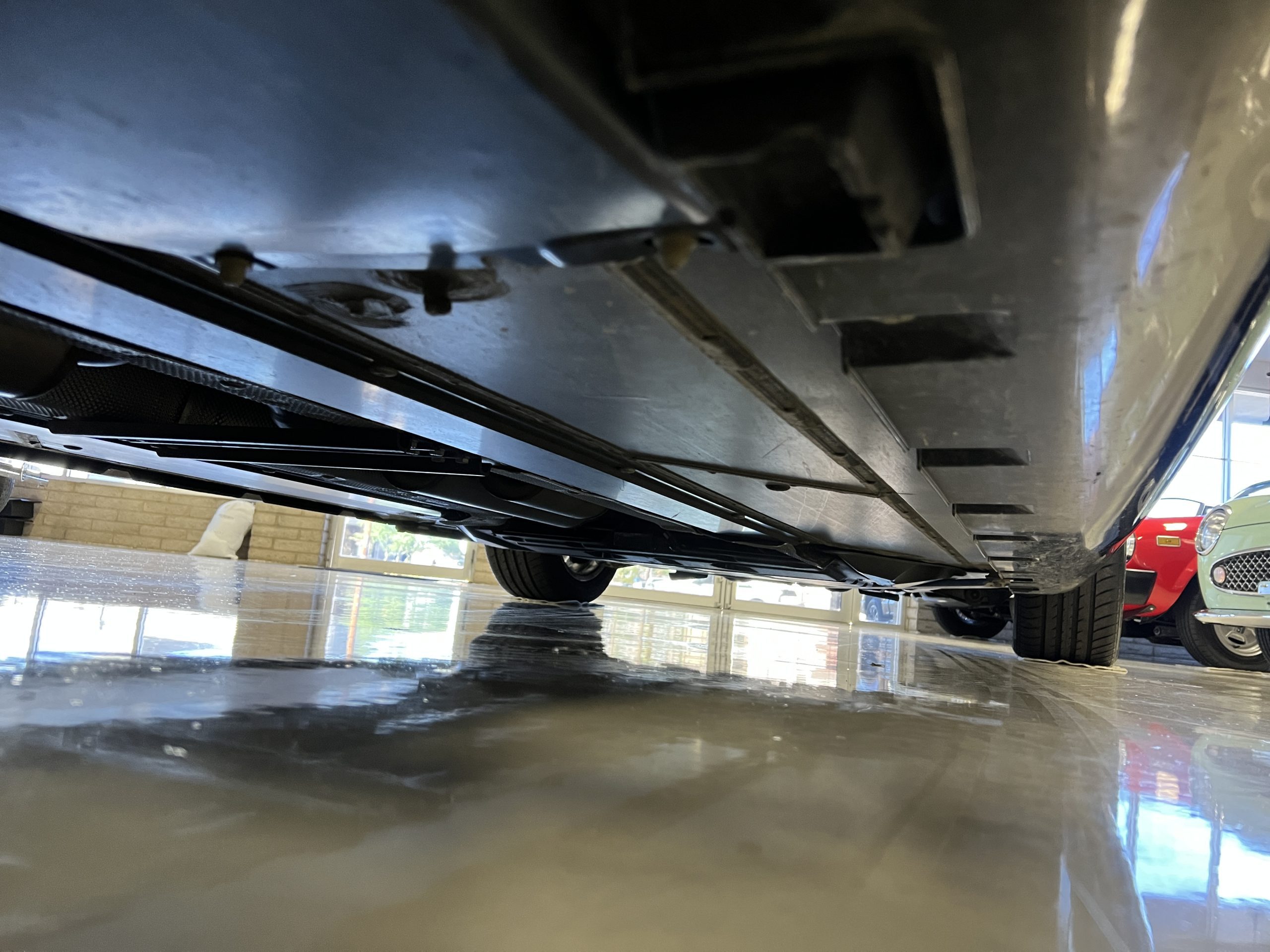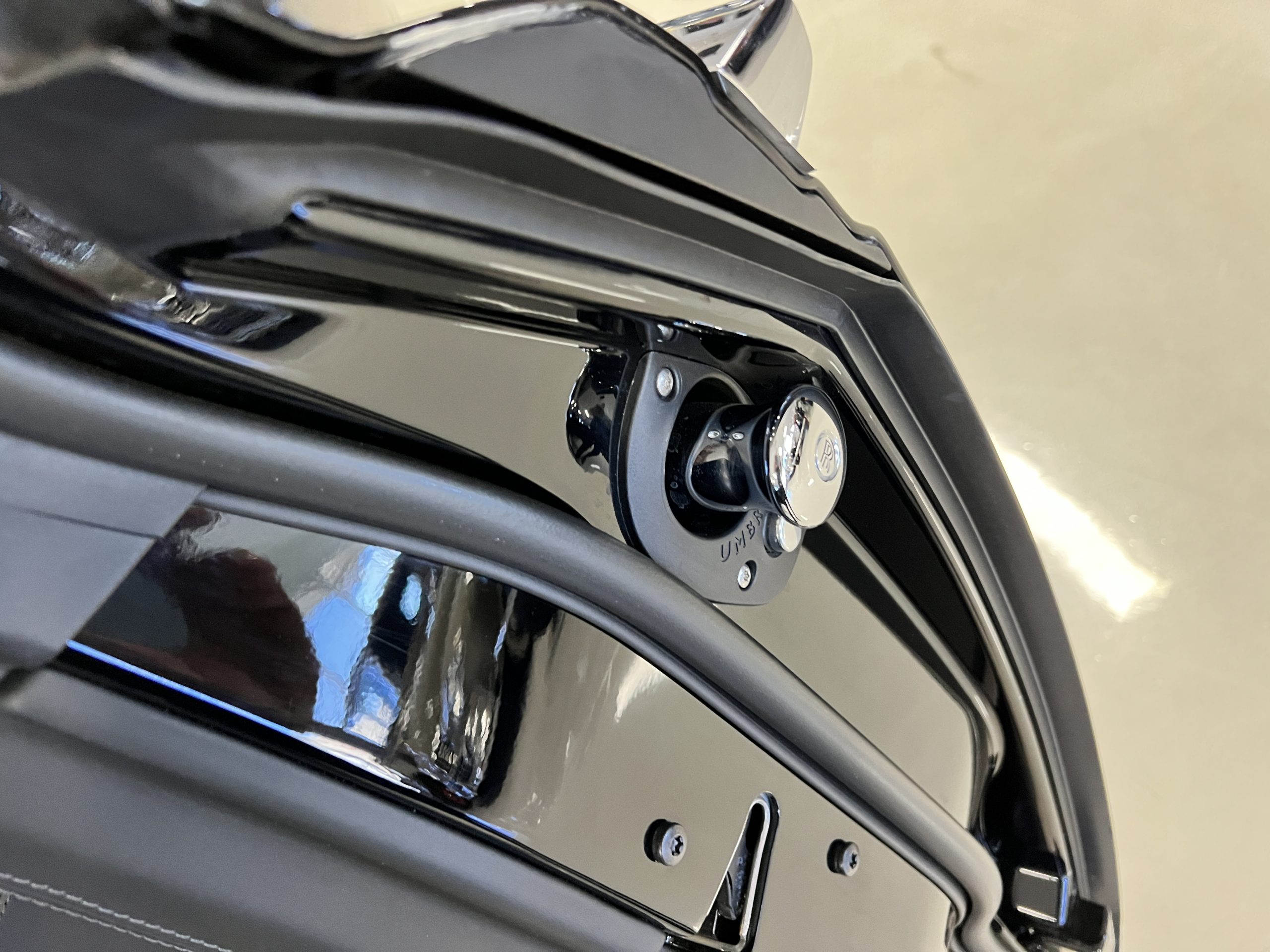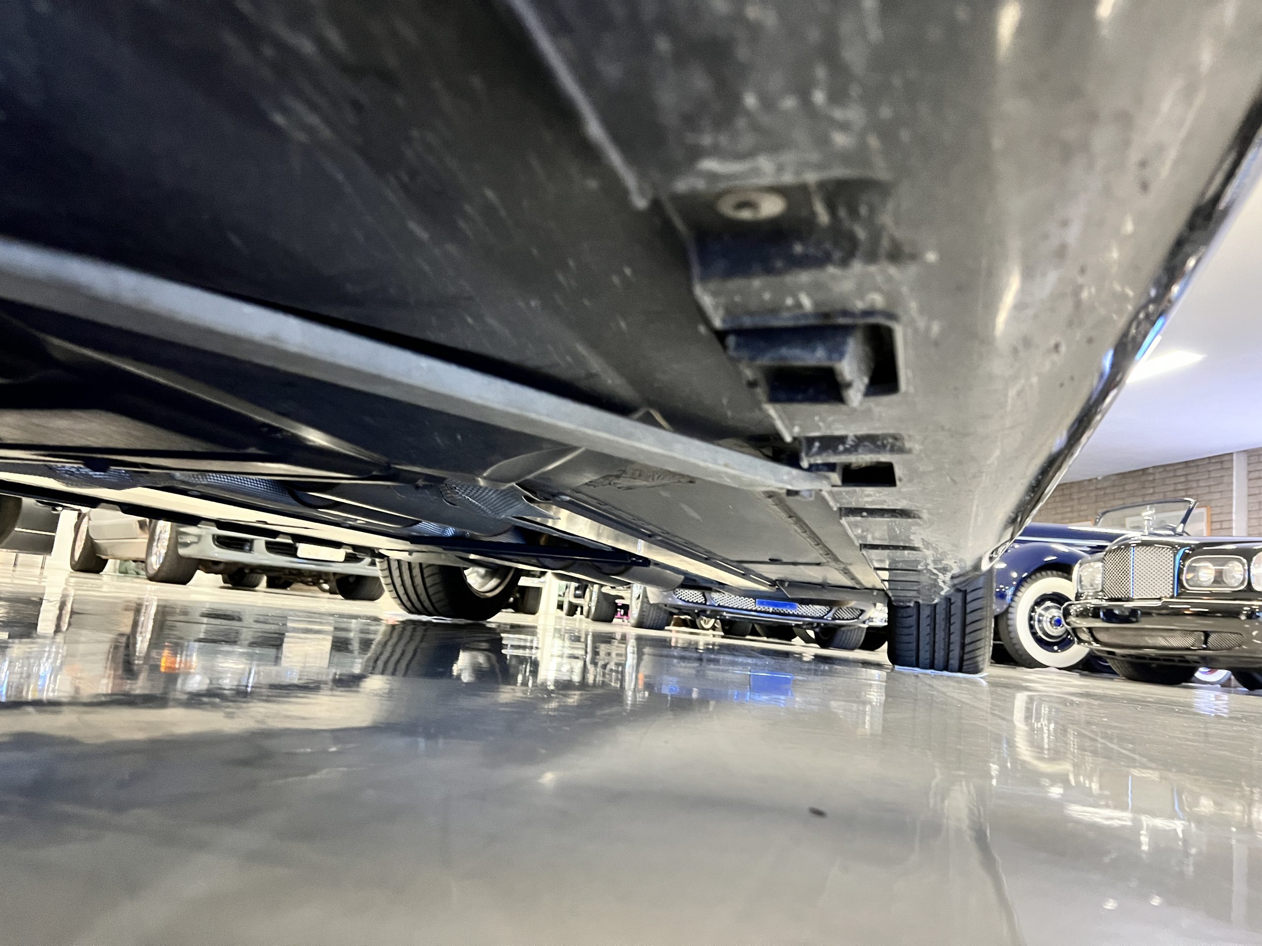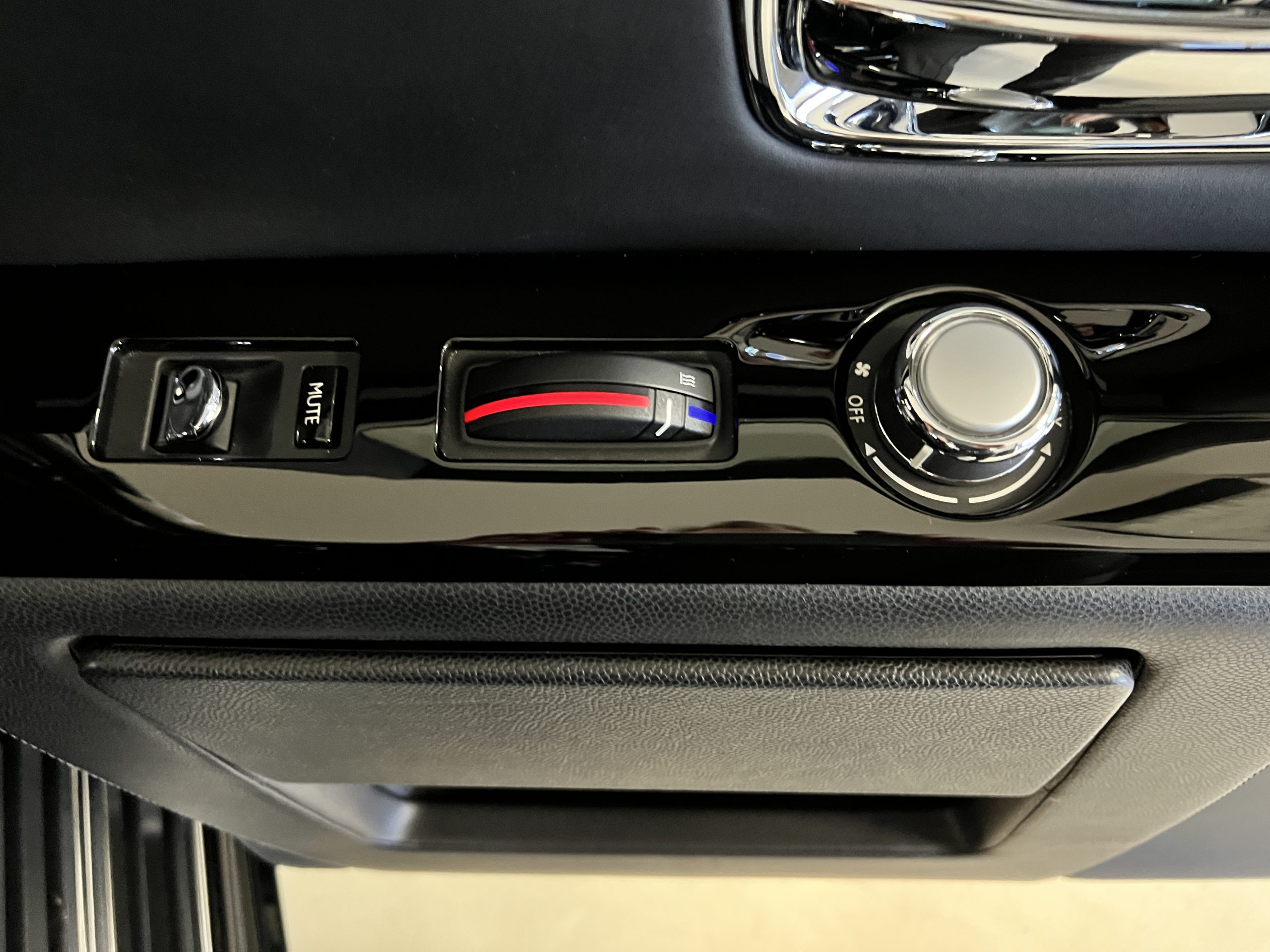 The interior is replete in black leather that shows no wear and is accented with an elegant and subtle gray piping. The highlight of the interior is the ebony black piano finished wood throughout. It is stupendous. The wood has inset “RR” logos in each of the cap rails on the doors. The only blemish is on the driver’s door, there is some minor cracking near the inlayed logo. The black Wilton wool carpeting is covered with black mouton sheepskin overlays.