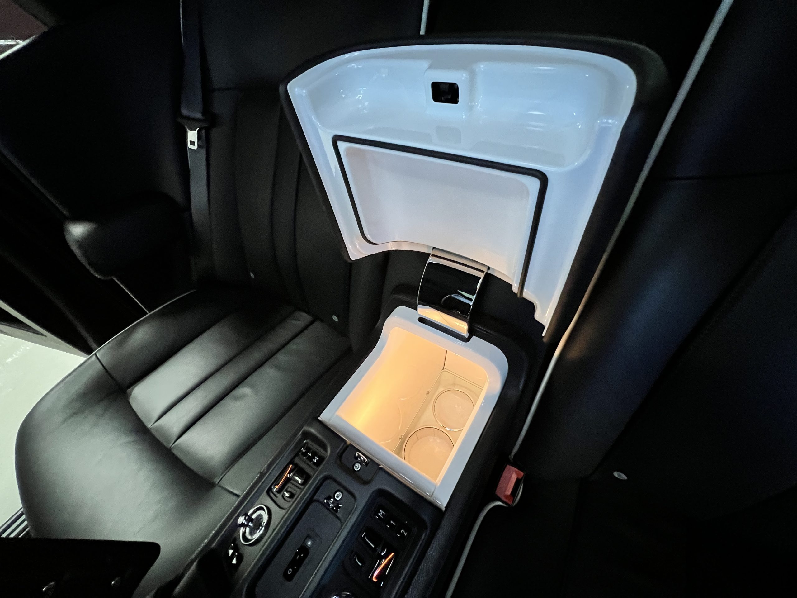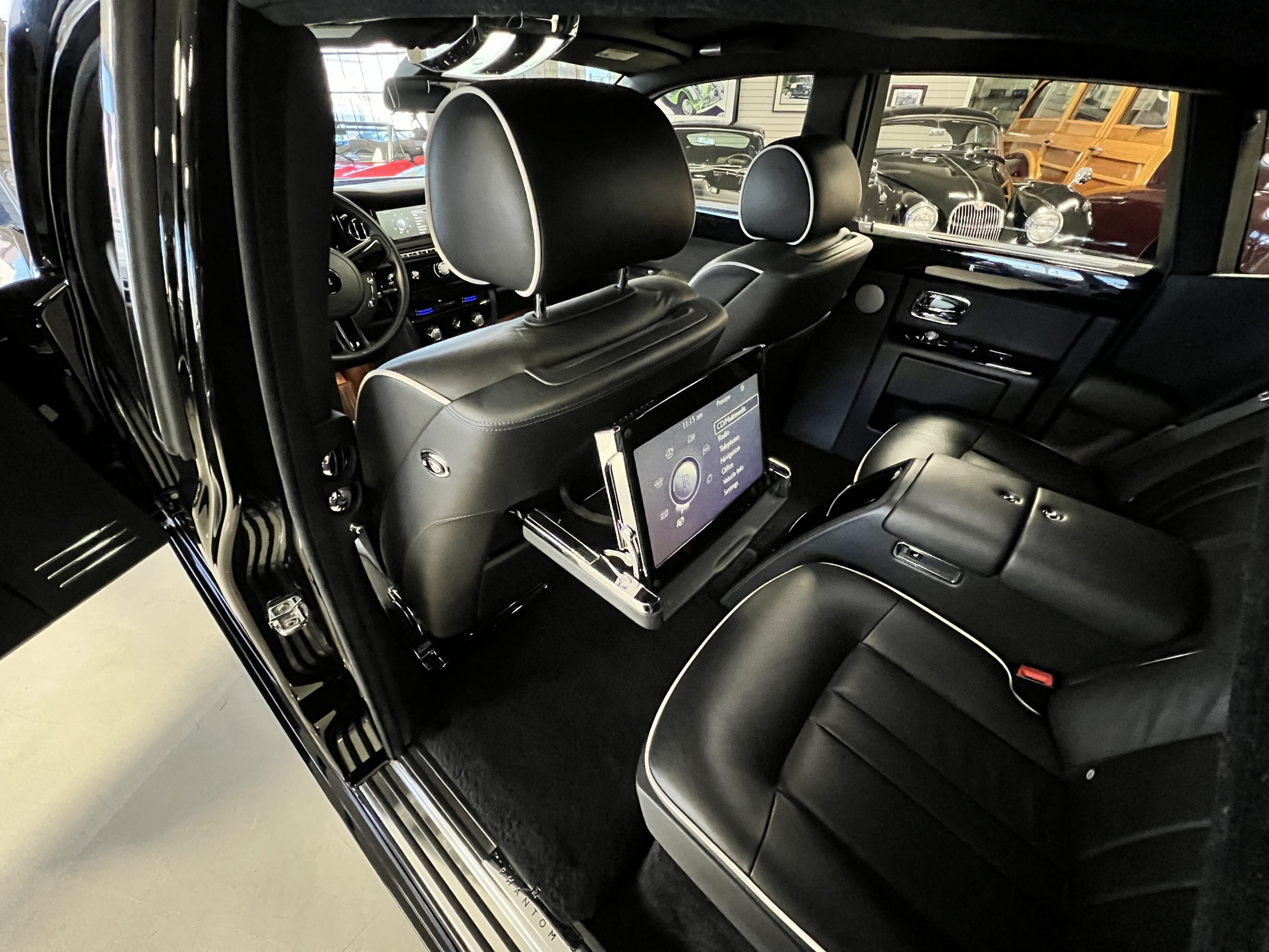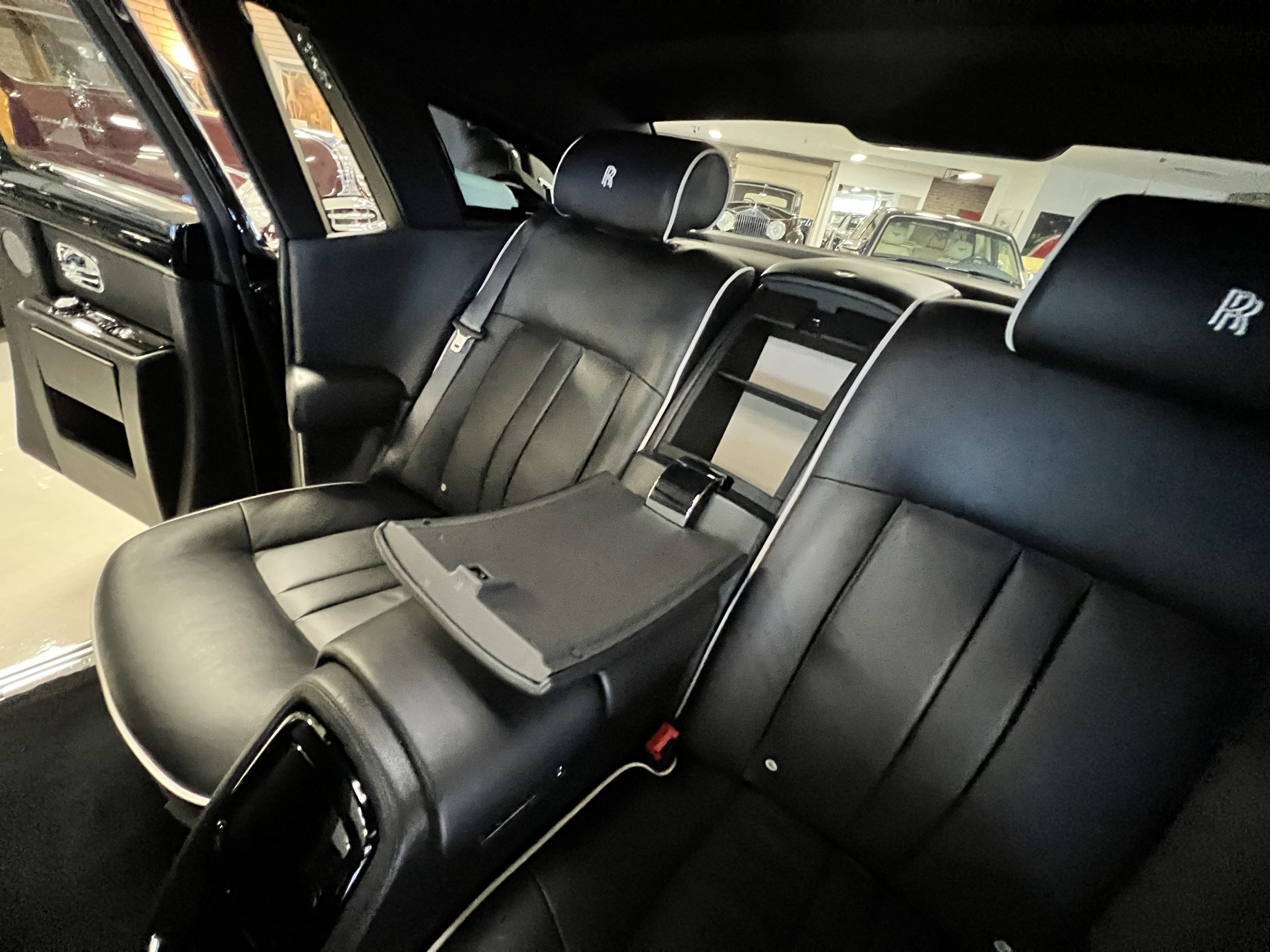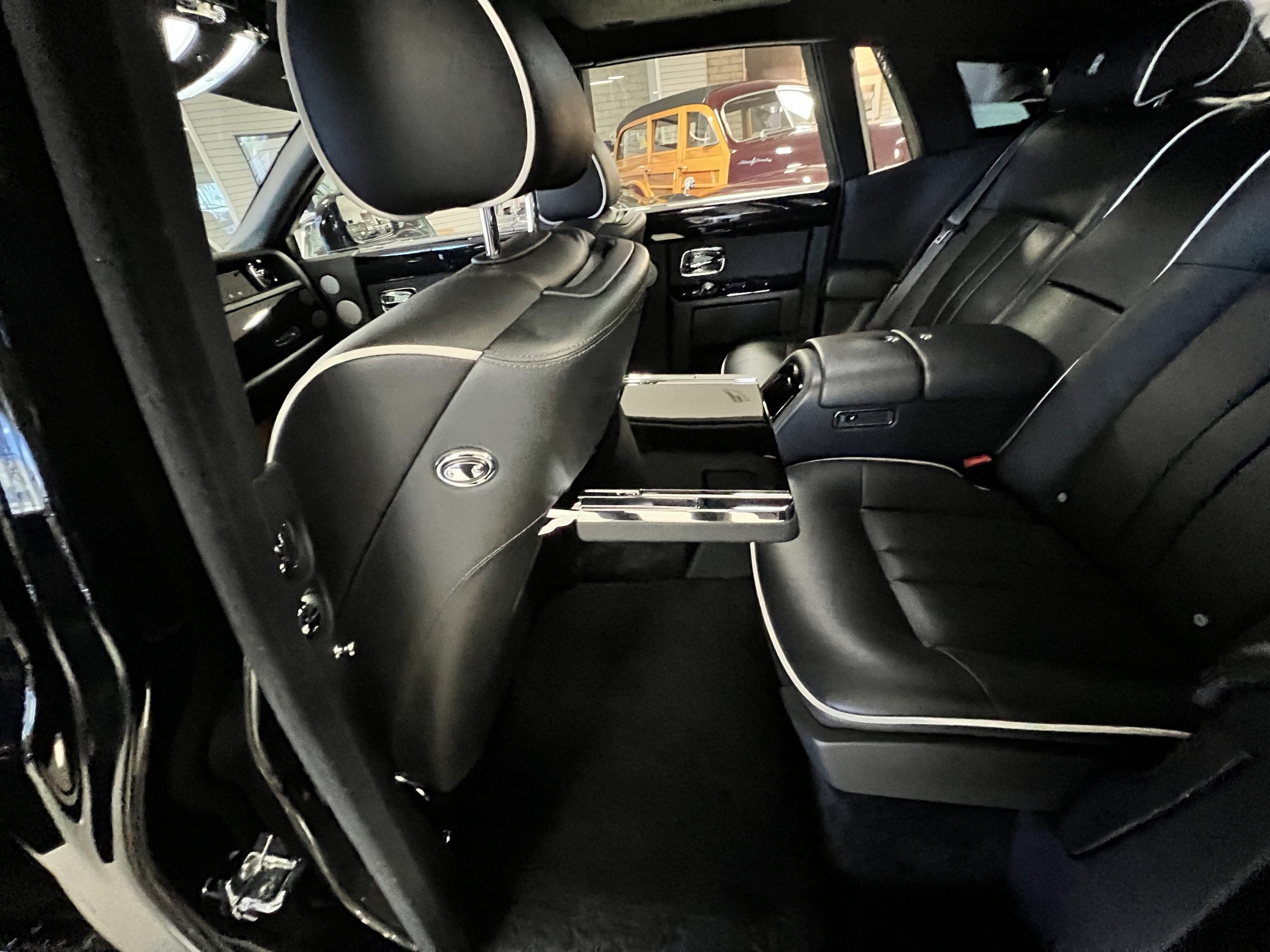 This Phantom features the rear seat theatre seating, where there is a center console equipped with the elegance of a first-class cabin on a 787 Dreamliner. This is not your basic Phantom specification. We love the entertainment centers integrated into the picnic tables in the rear as well as the refrigerator for the champagne stowed in the rear passenger compartment.