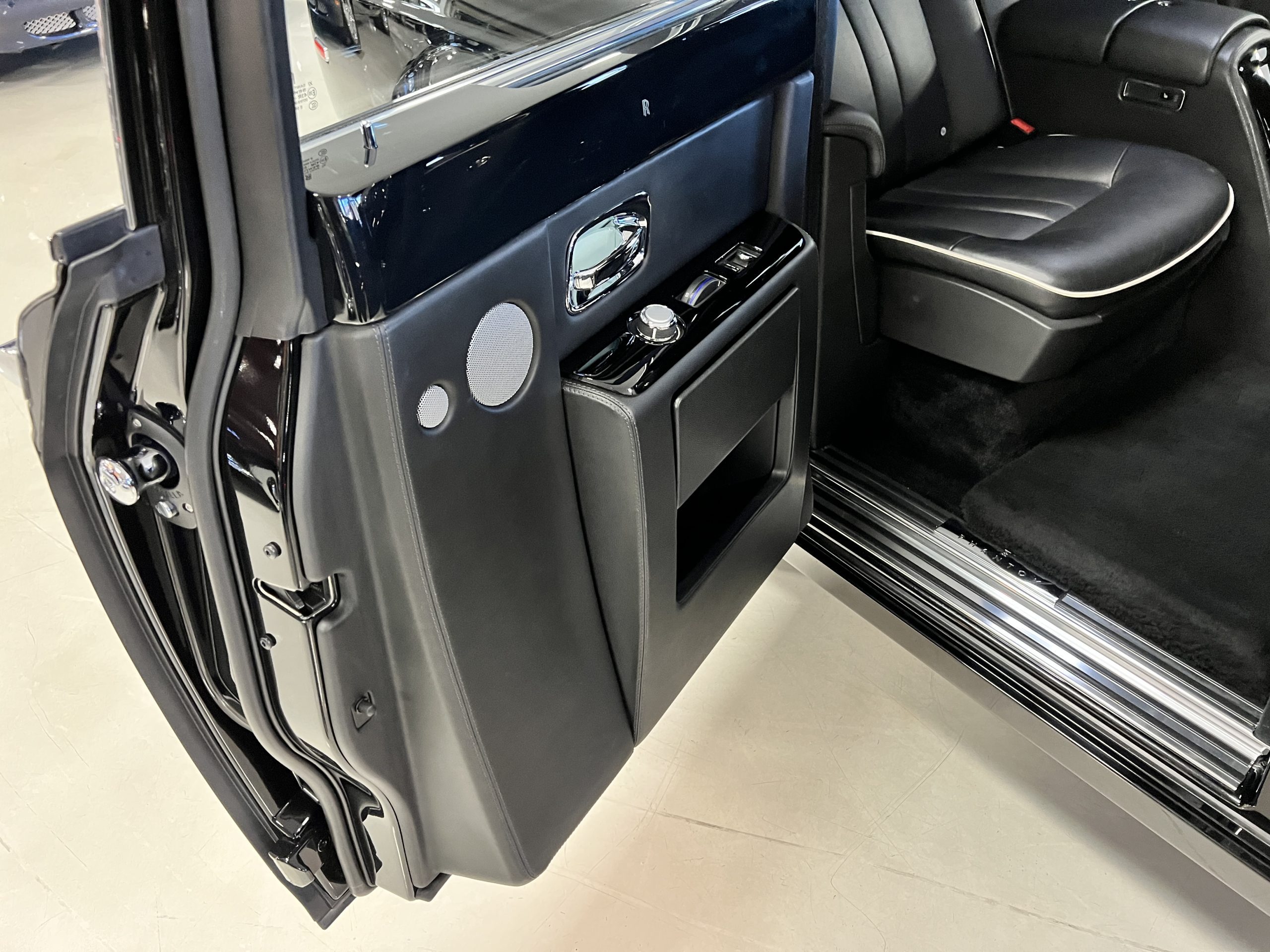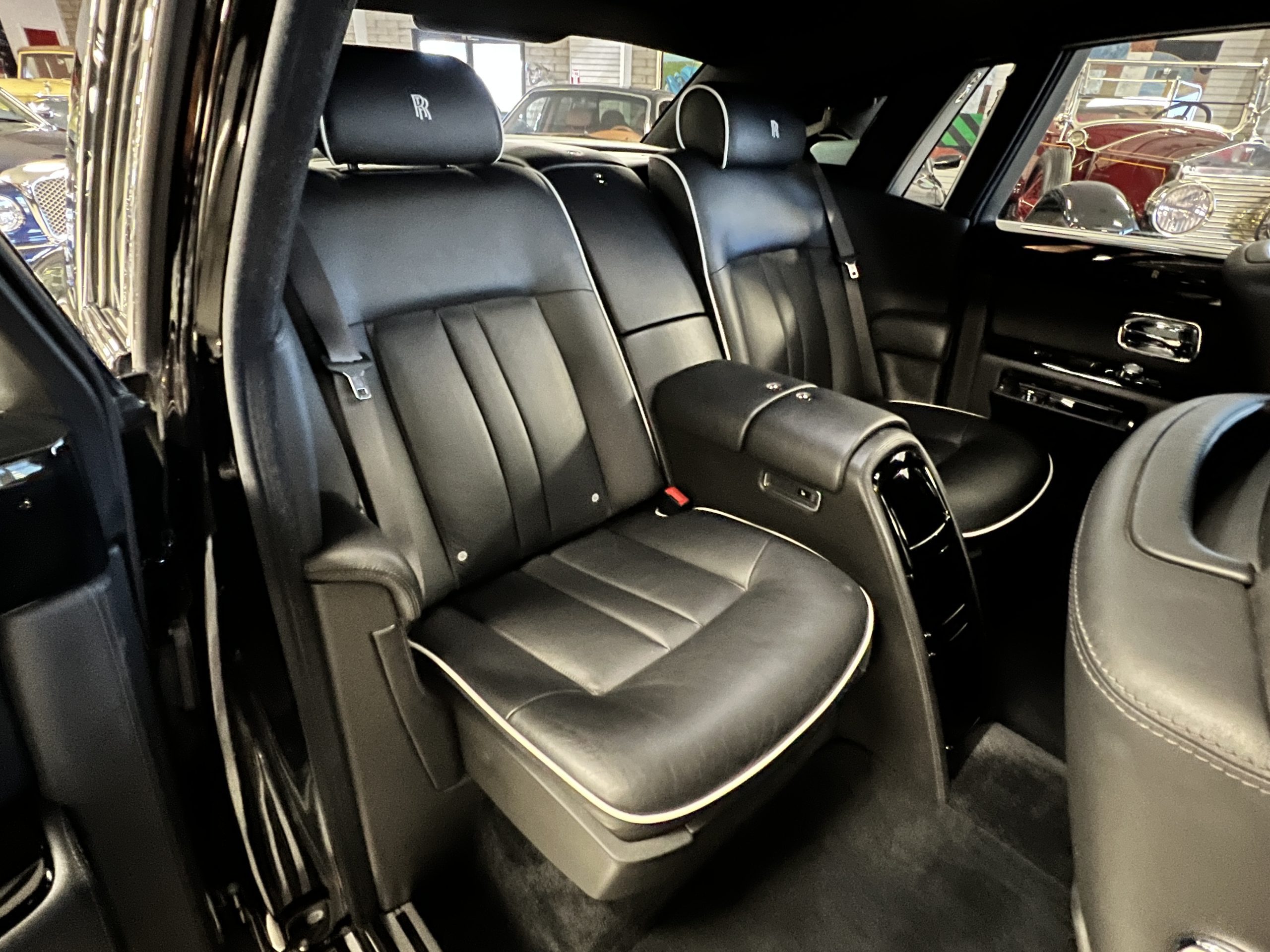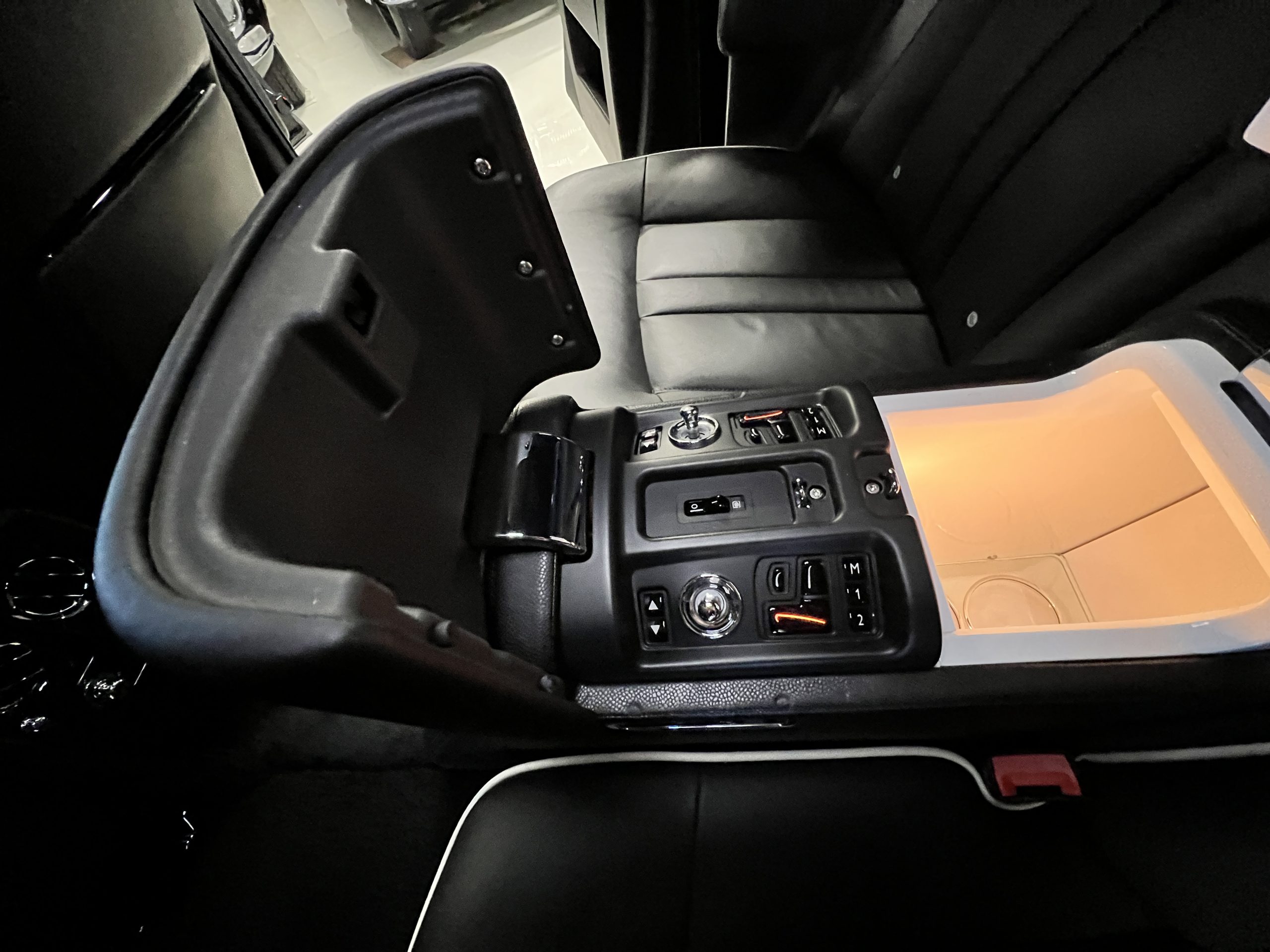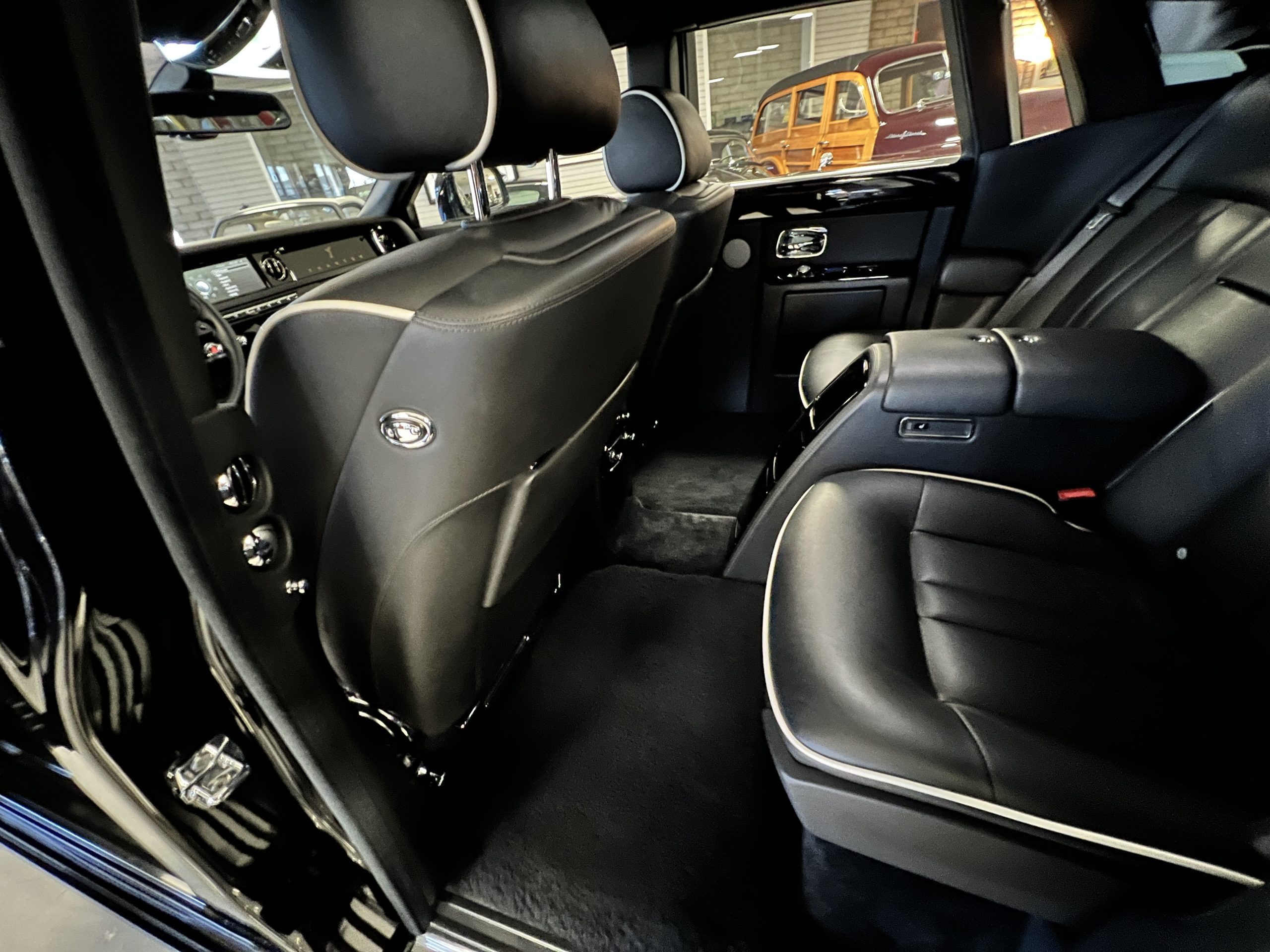 This Phantom features the rear seat theatre seating, where there is a center console equipped with the elegance of a first-class cabin on a 787 Dreamliner. This is not your basic Phantom specification. We love the entertainment centers integrated into the picnic tables in the rear as well as the refrigerator for the champagne stowed in the rear passenger compartment.
