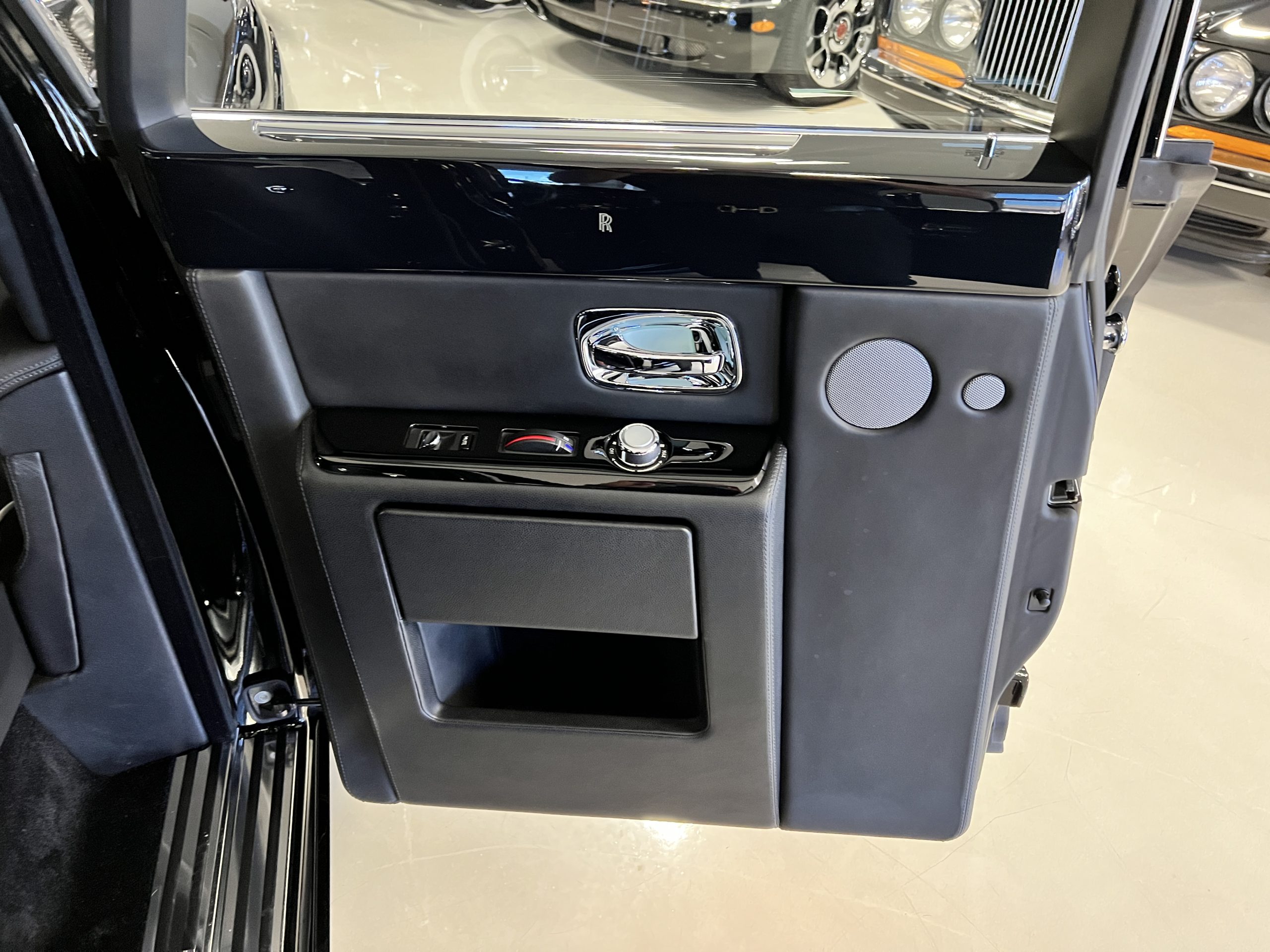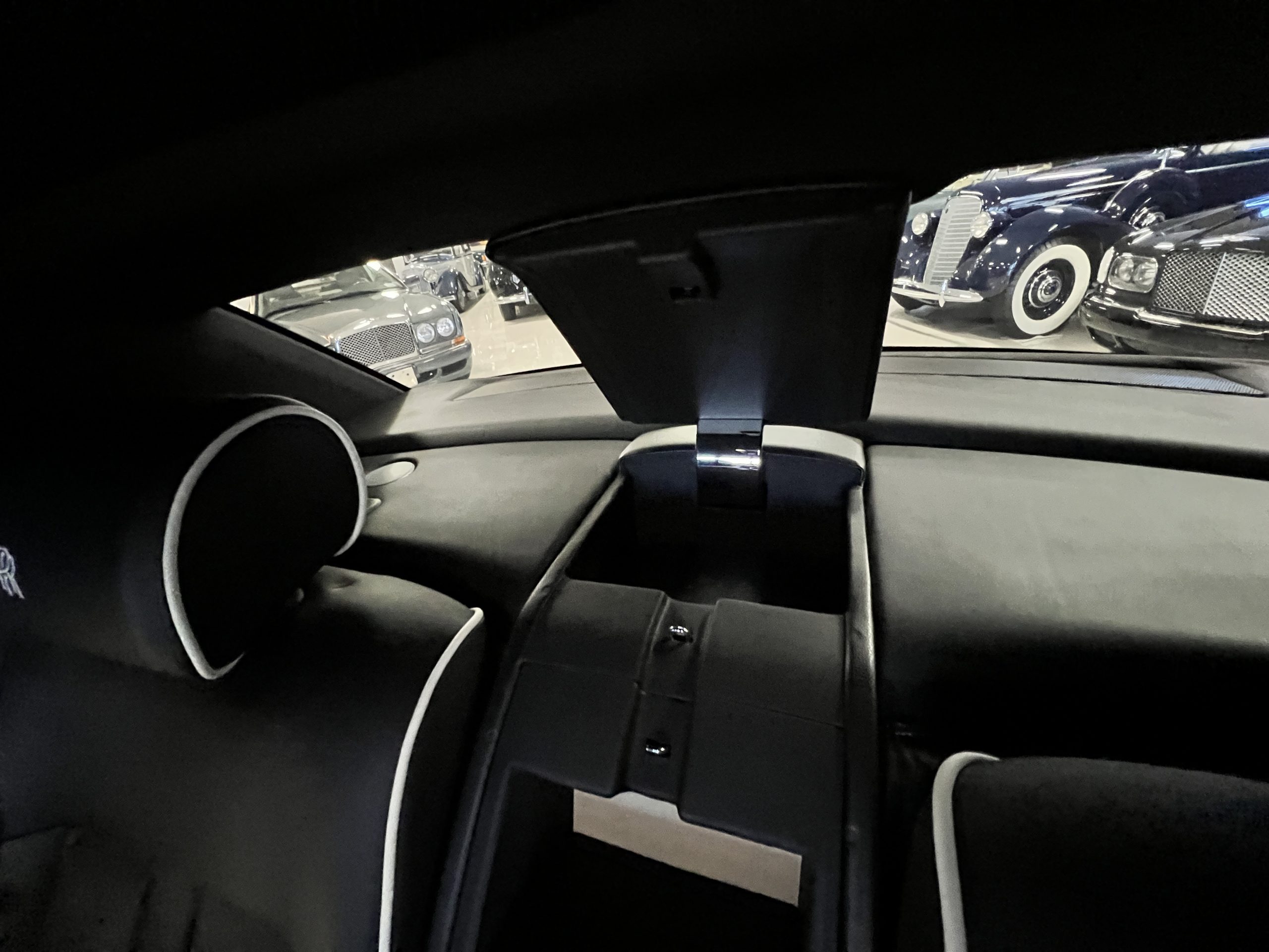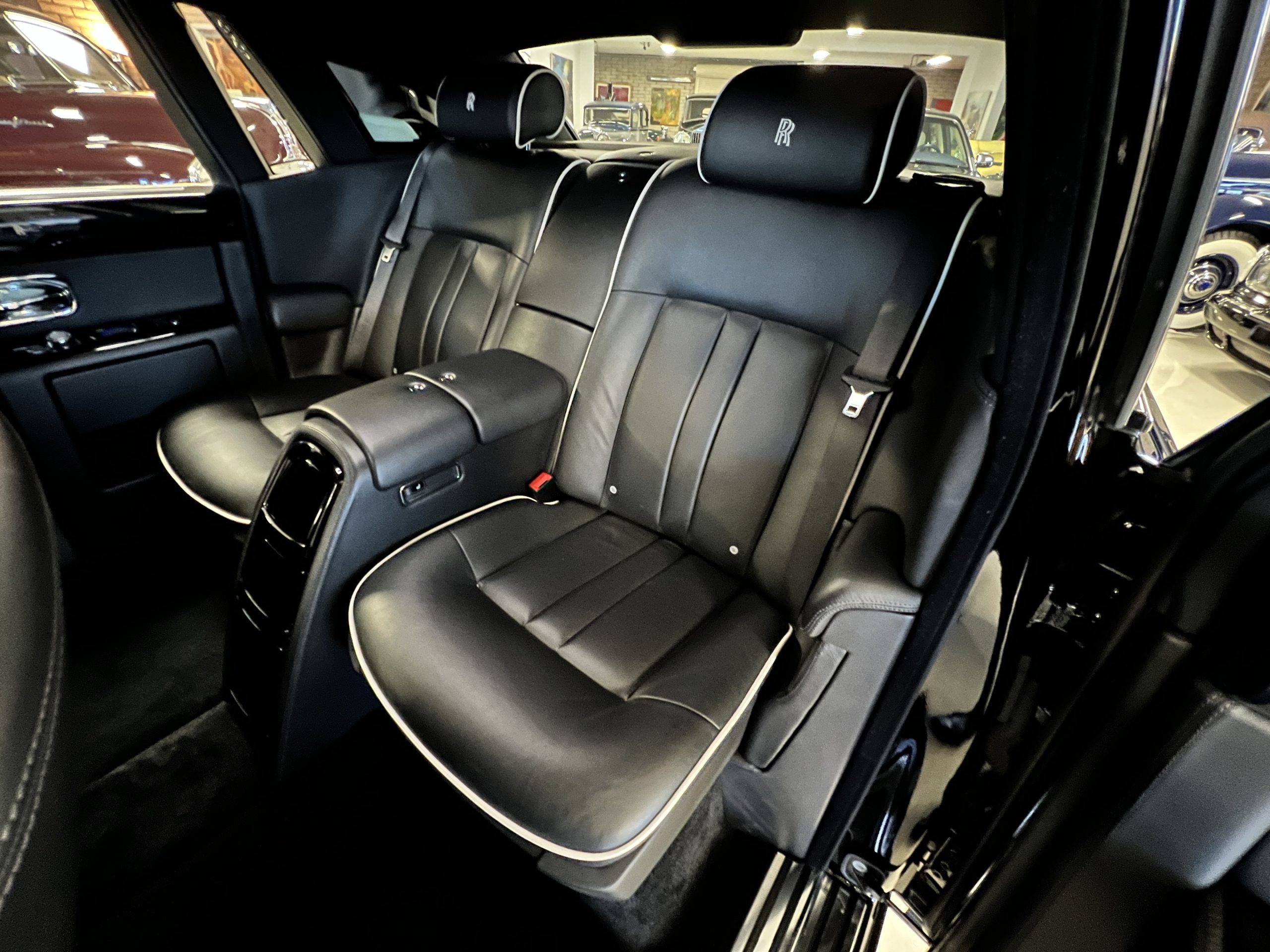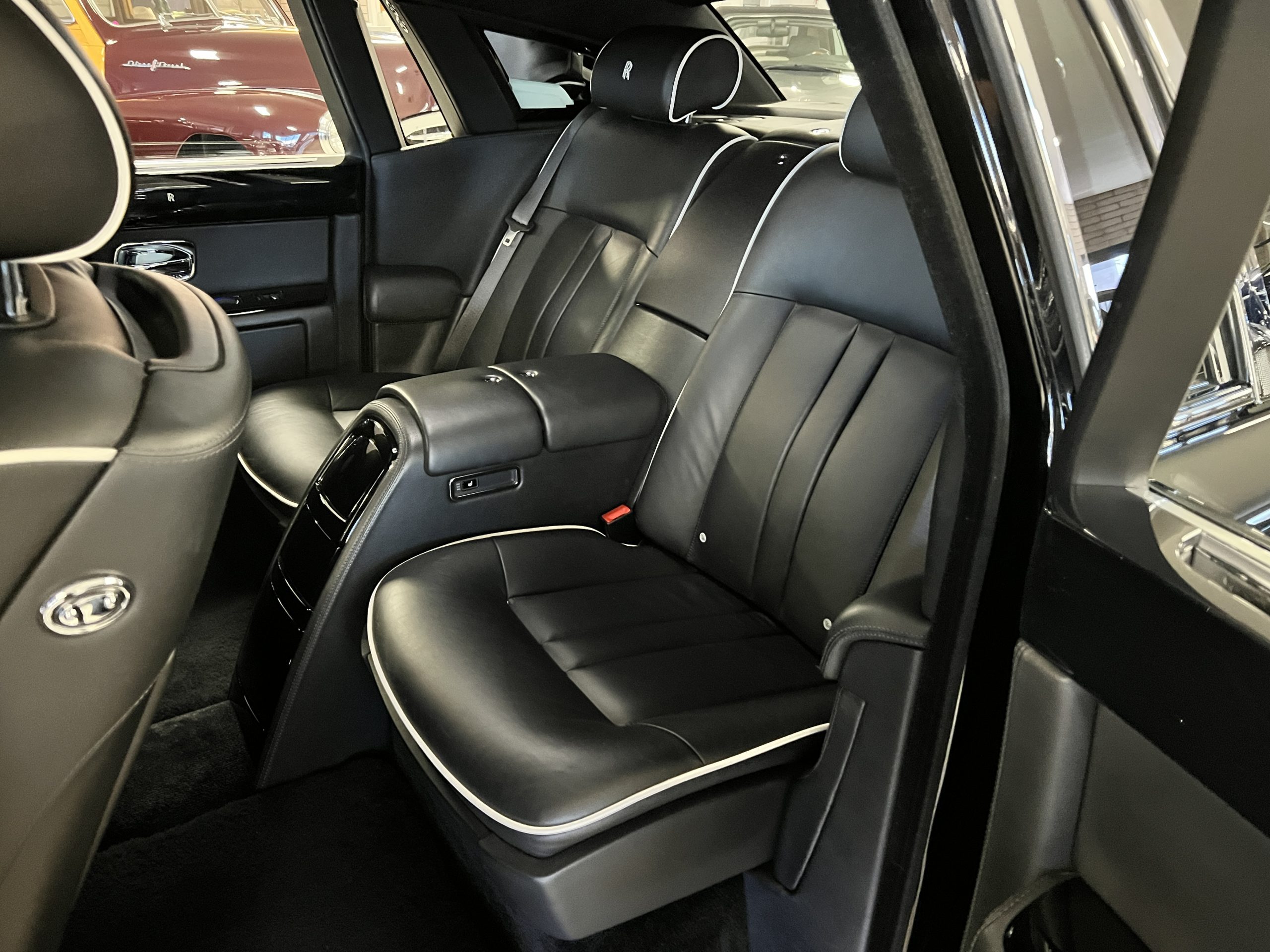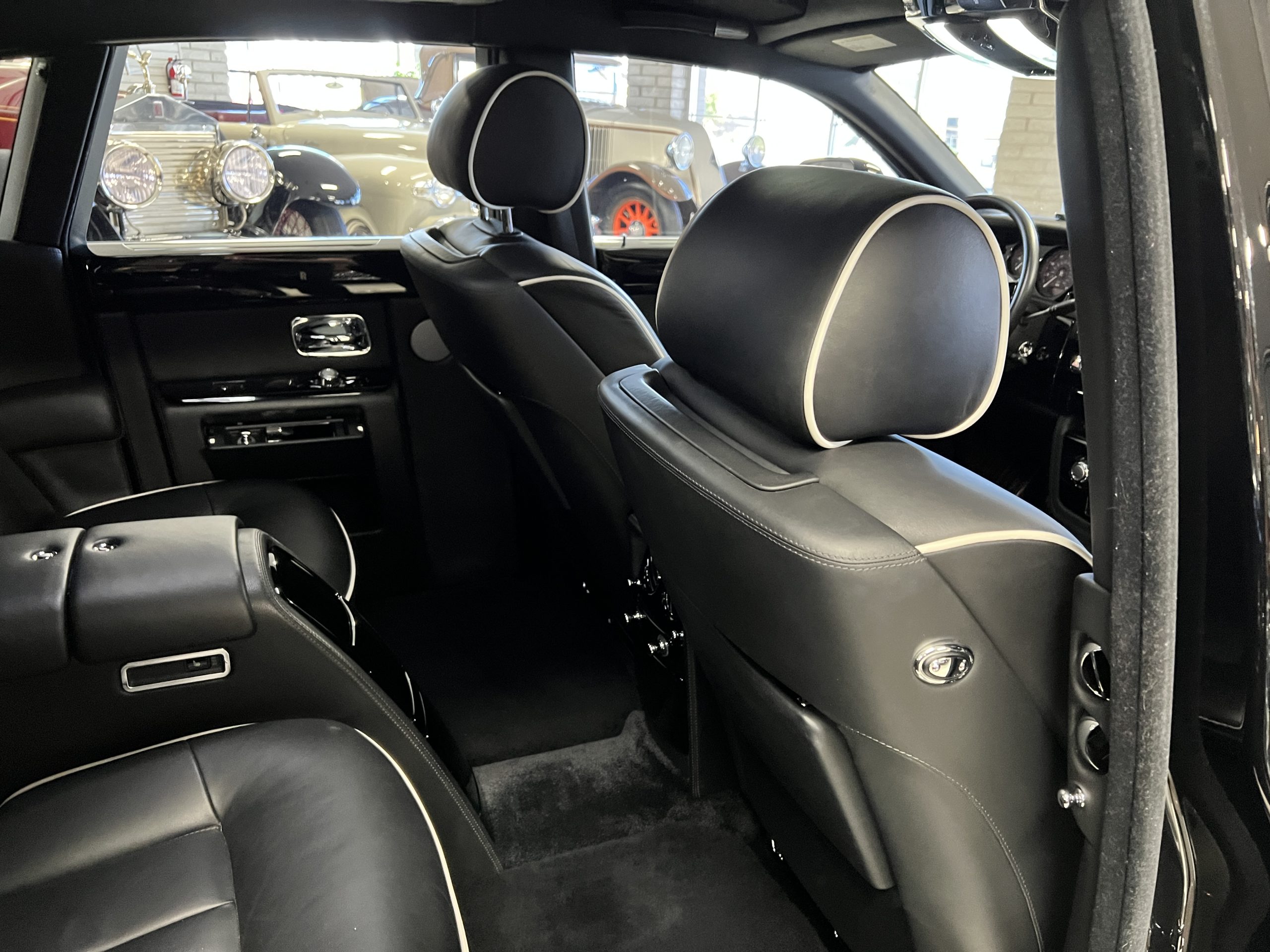 This Phantom features the rear seat theatre seating, where there is a center console equipped with the elegance of a first-class cabin on a 787 Dreamliner. This is not your basic Phantom specification. We love the entertainment centers integrated into the picnic tables in the rear as well as the refrigerator for the champagne stowed in the rear passenger compartment.