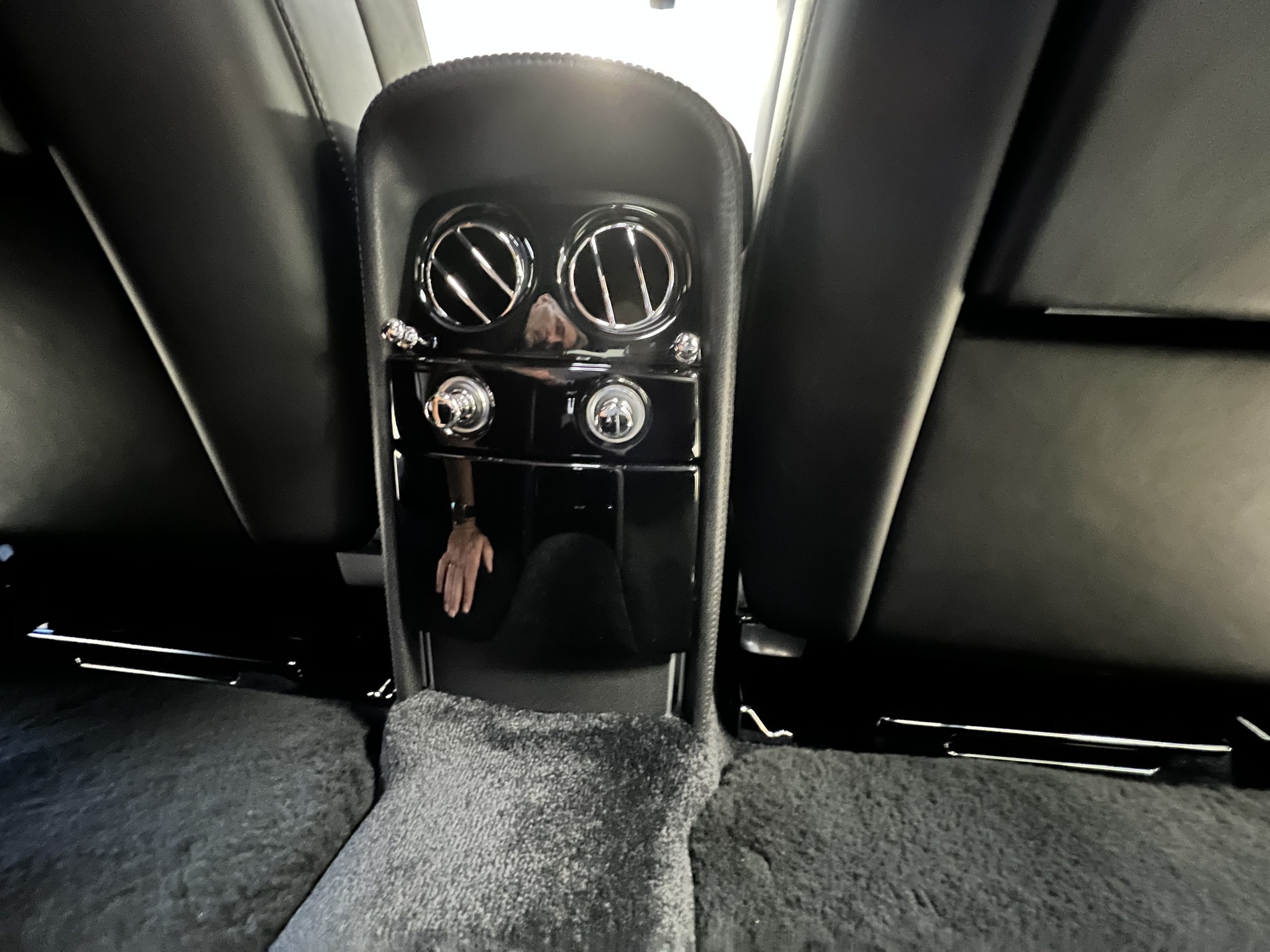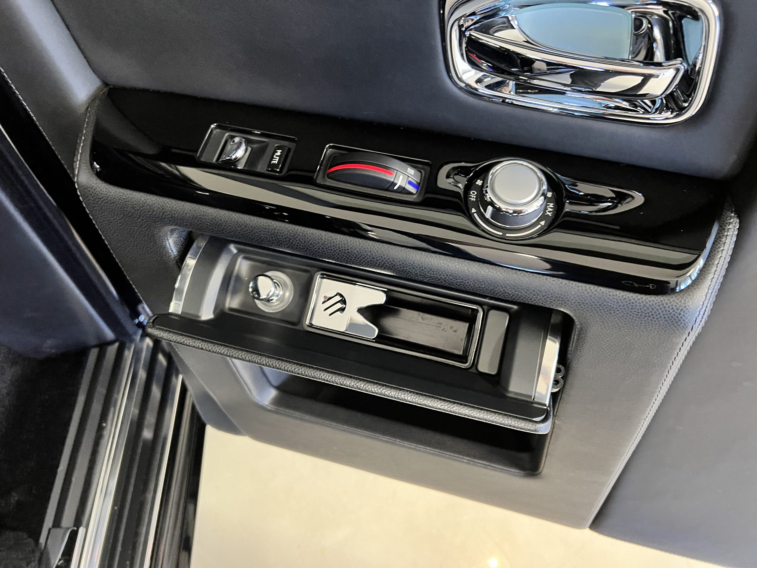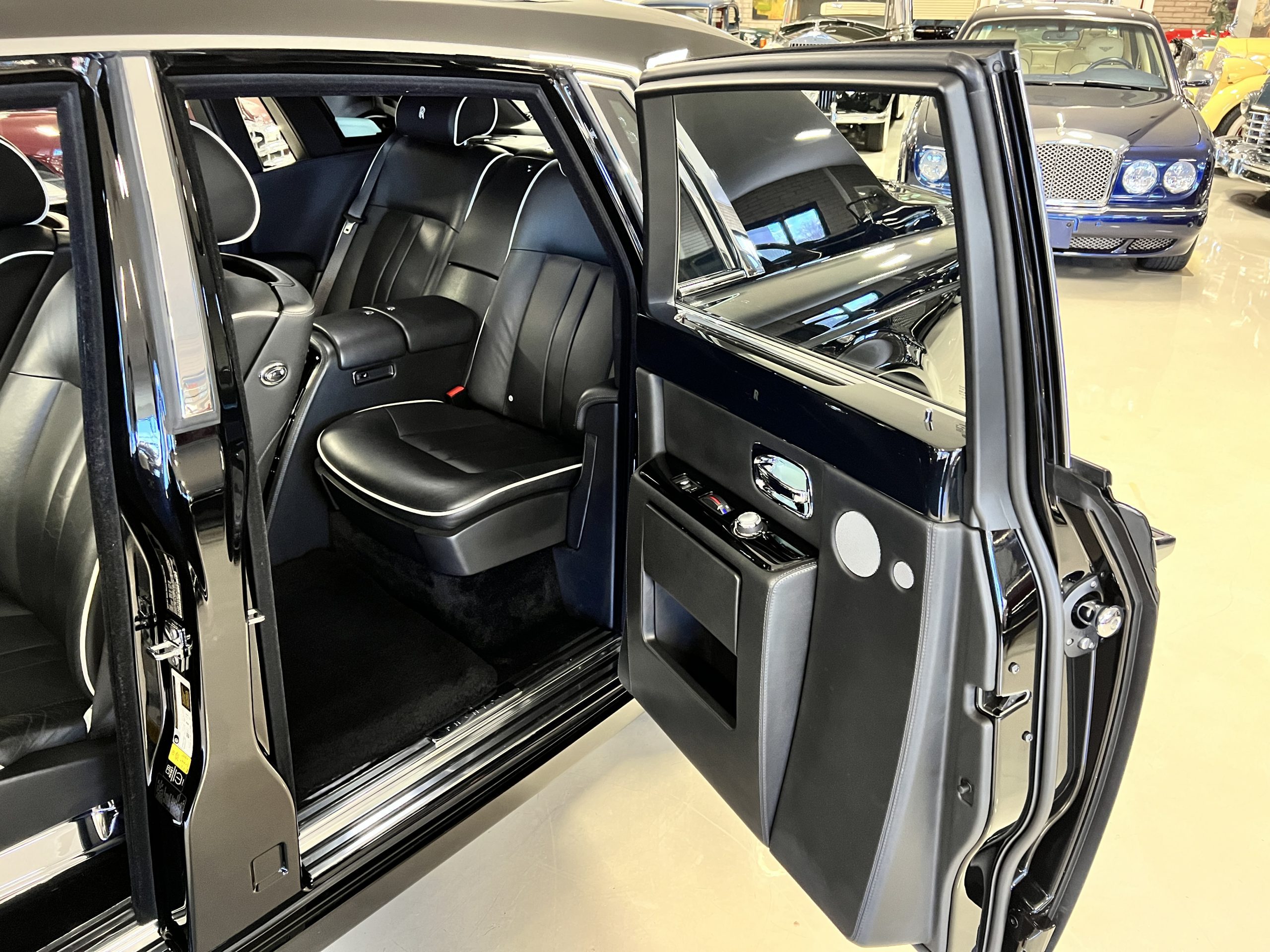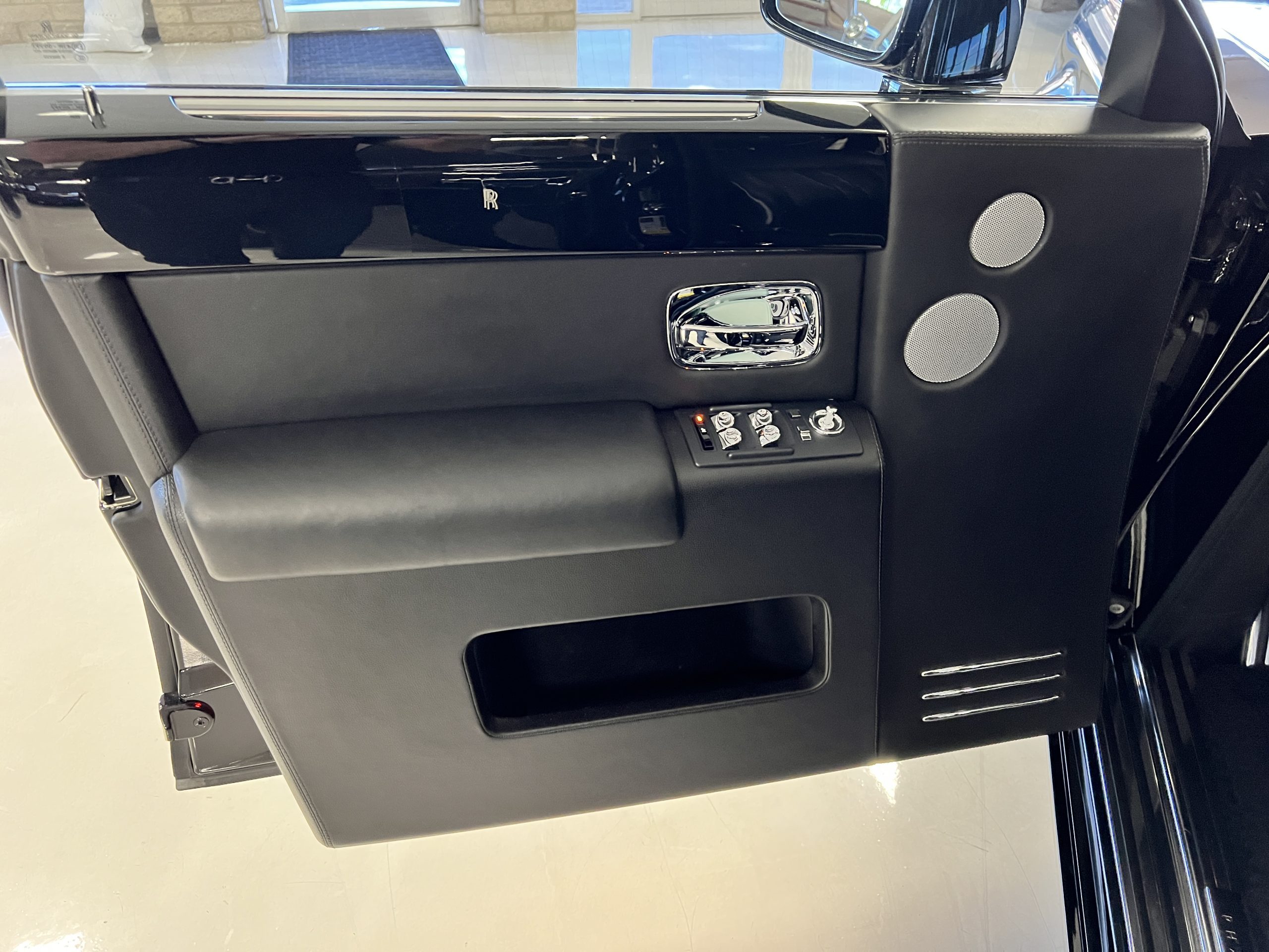 This Phantom features the rear seat theatre seating, where there is a center console equipped with the elegance of a first-class cabin on a 787 Dreamliner. This is not your basic Phantom specification. We love the entertainment centers integrated into the picnic tables in the rear as well as the refrigerator for the champagne stowed in the rear passenger compartment.