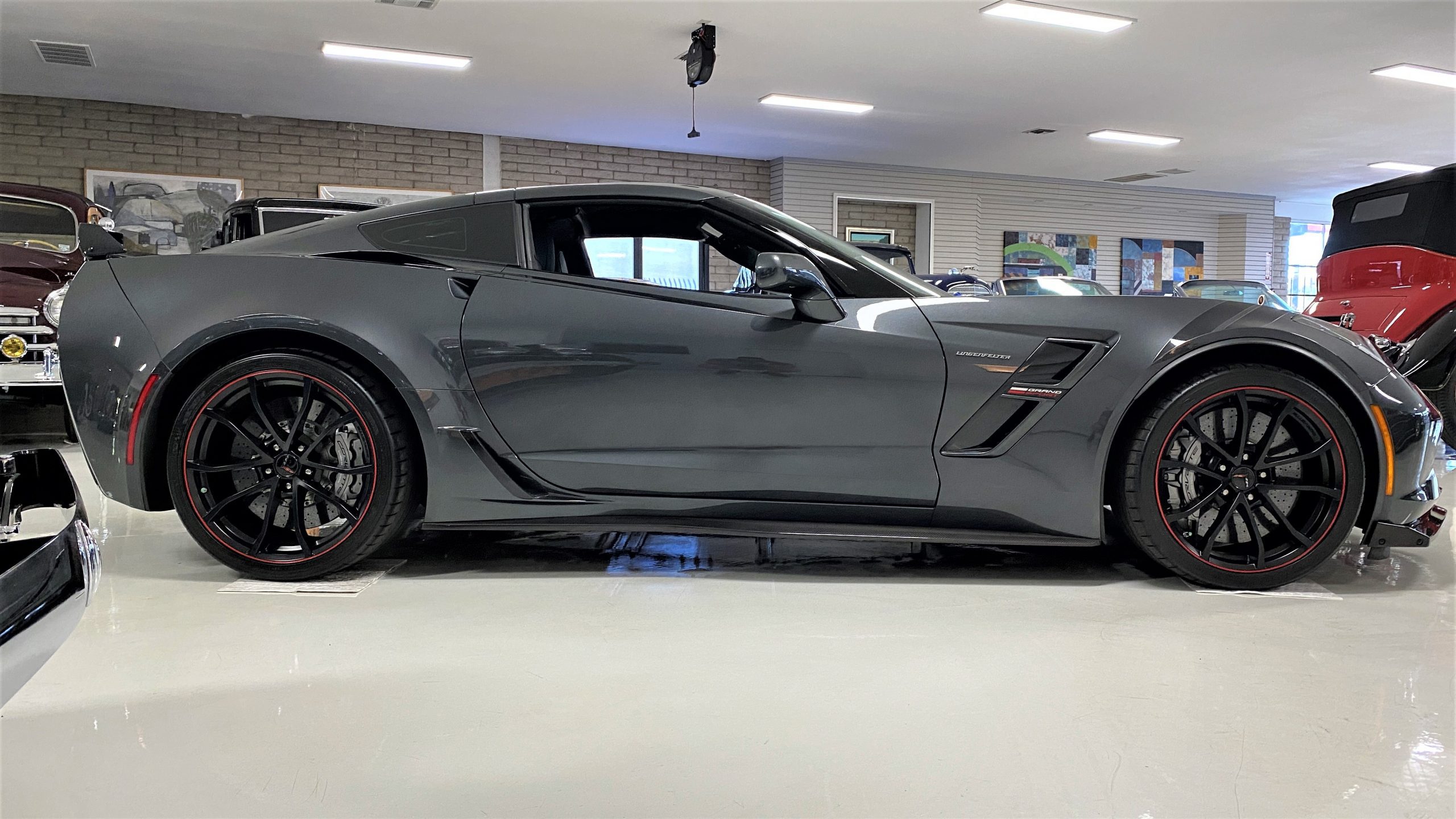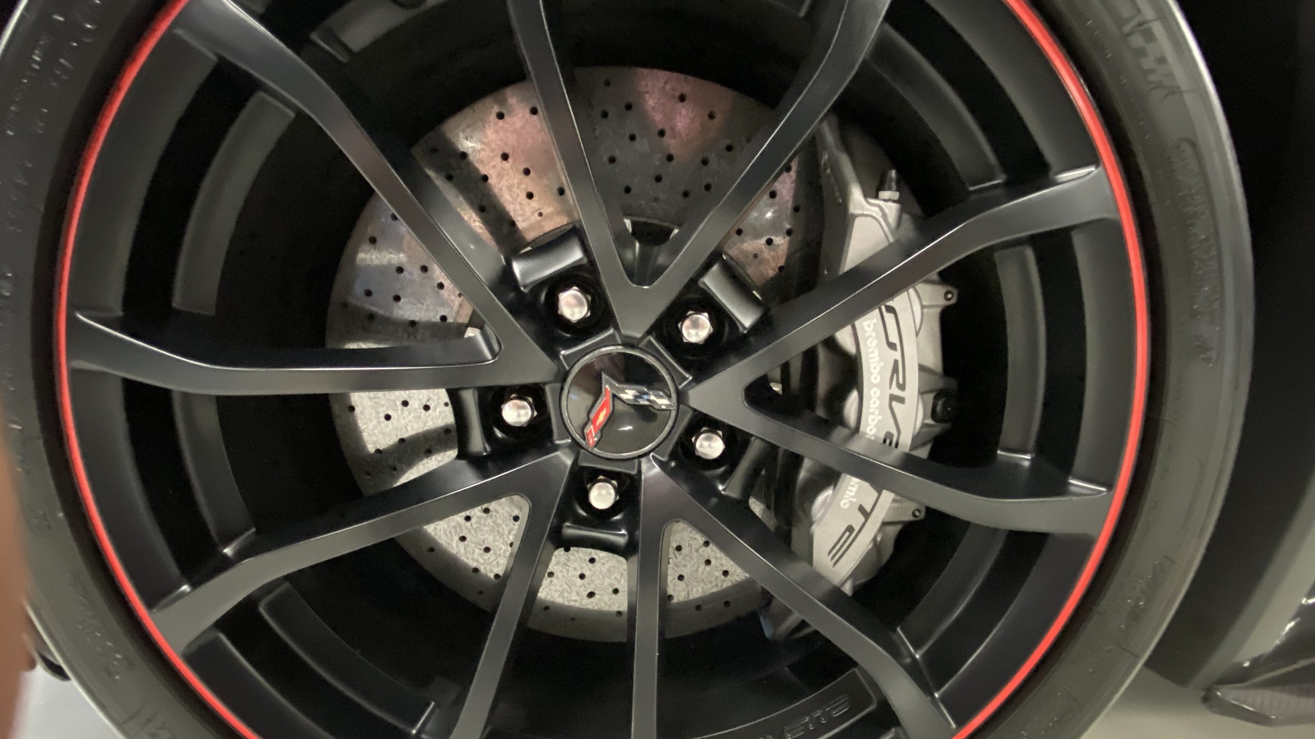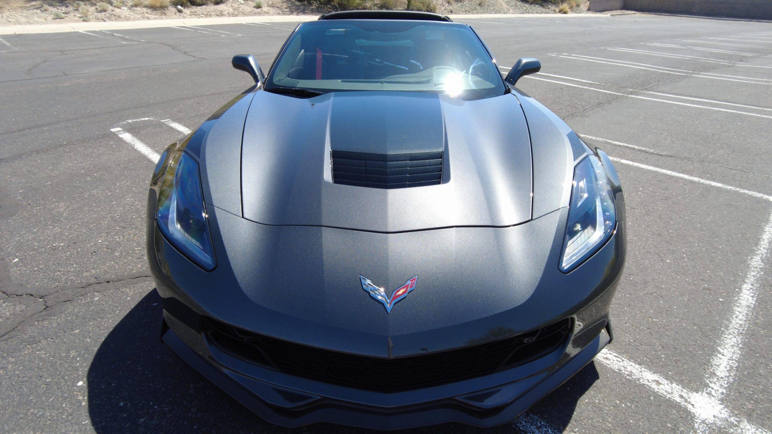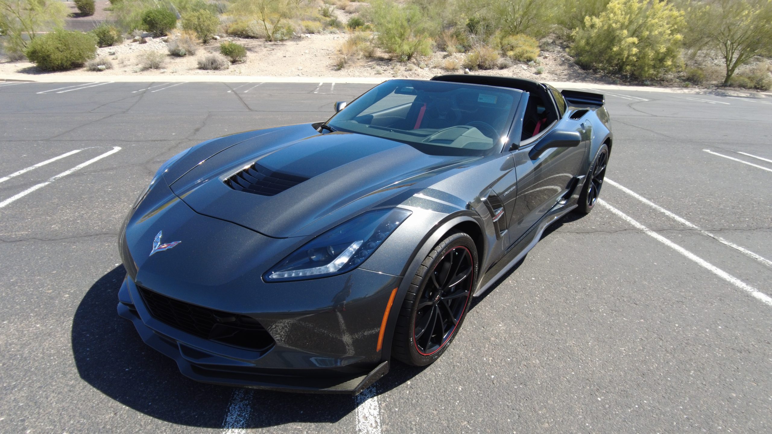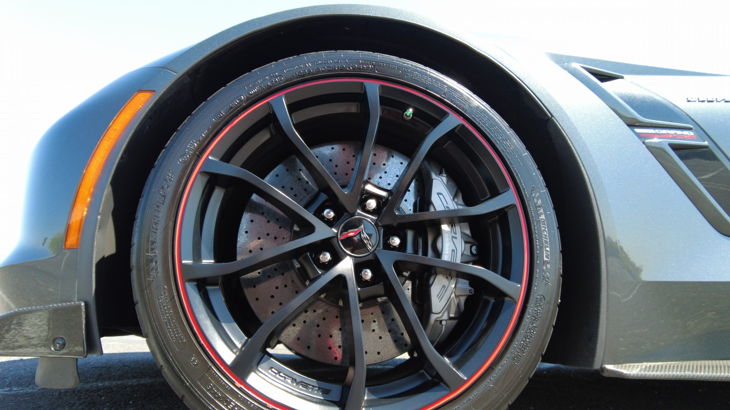 The Watkins Glen Gray Metallic Paint is accented with the subtle Carbon Flash colored fender hash stripes that have become synonymous with the Grand Sport Corvettes. A welcome addition to the body of this car is a high quality paint protection film that is only noticeable if you’re looking for it. This protects the paint from rock chips and scratches, without degrading the brilliance of the paint. The removable roof on this Grand Sport is made from lightweight carbon fiber with sueded microfiber headliner and is painted to match the exterior of the Corvette. Further setting this Vette apart from it’s lesser optioned models is a downforce adding carbon fiber front splitter, side rocker extensions, and stage three aero rear spoiler. Further supporting the level of care this Vette has received is the front splitter that is free from blemishes, despite it’s lower stance. The sinister theme continues with the black aluminum wheels with a thin red stripe, optional on the Grand Sport. On our inspection, we did notice one very small chip on the passenger side rear wheel.