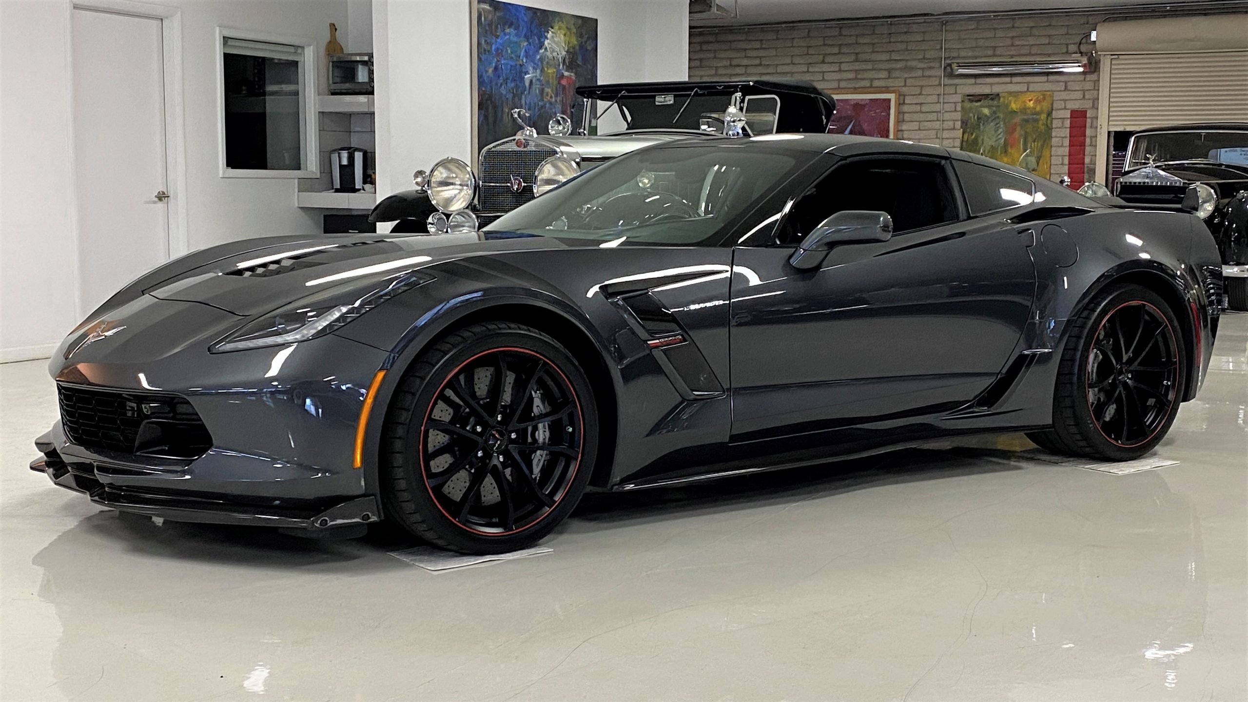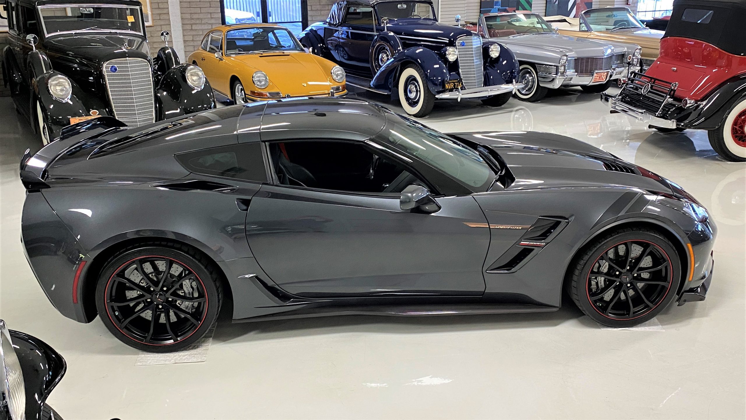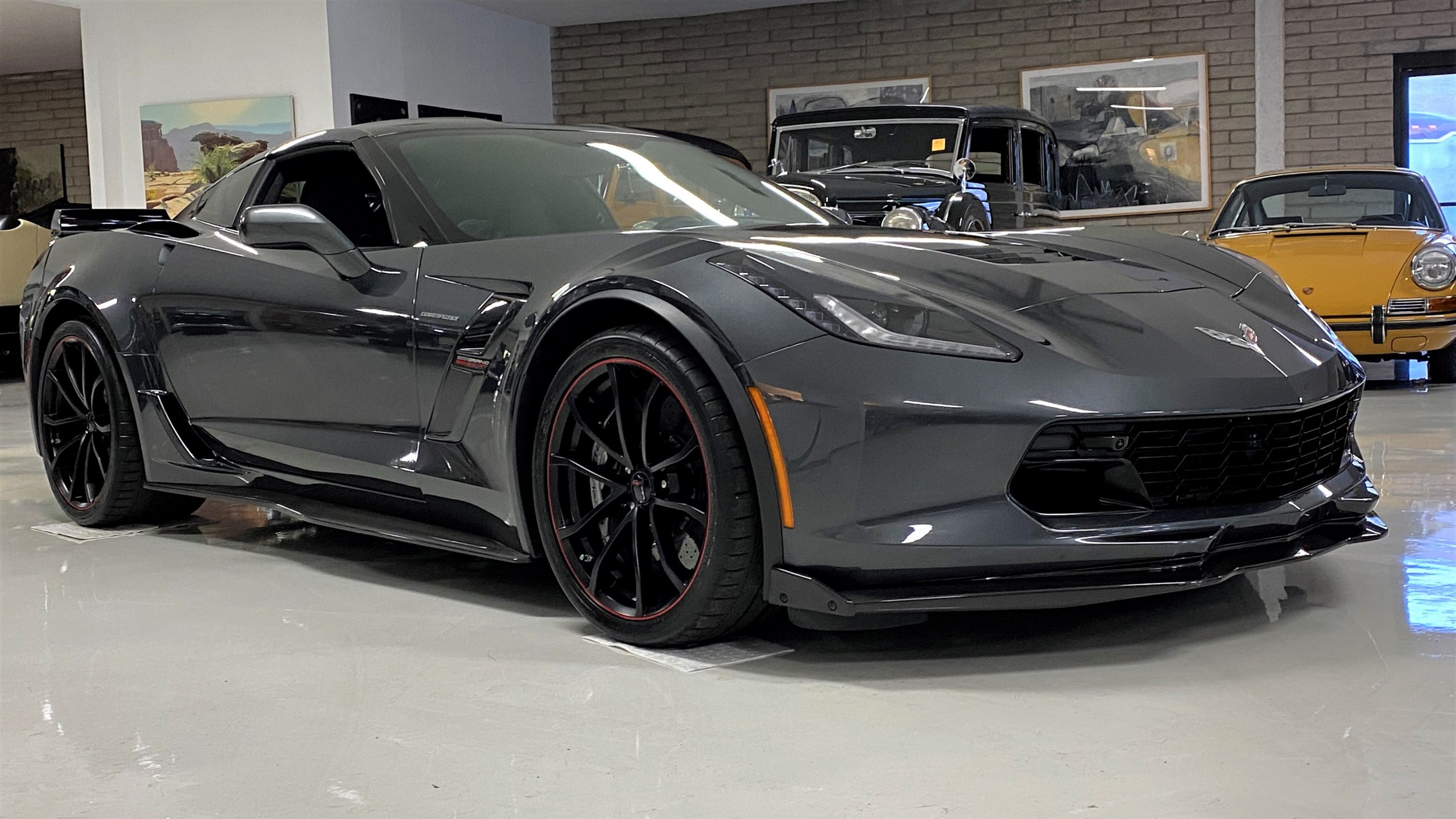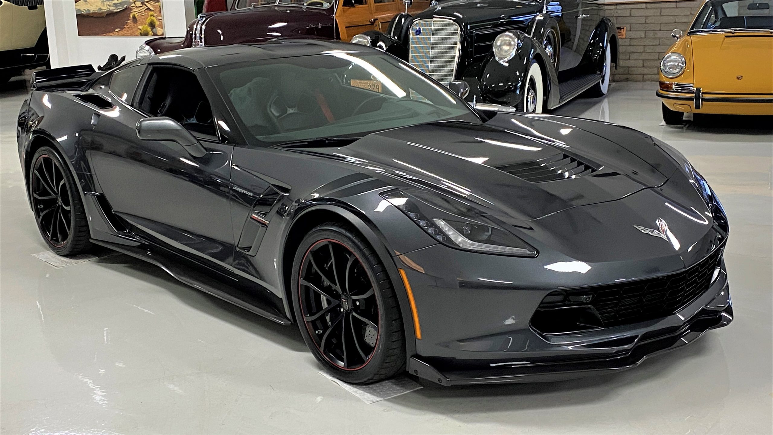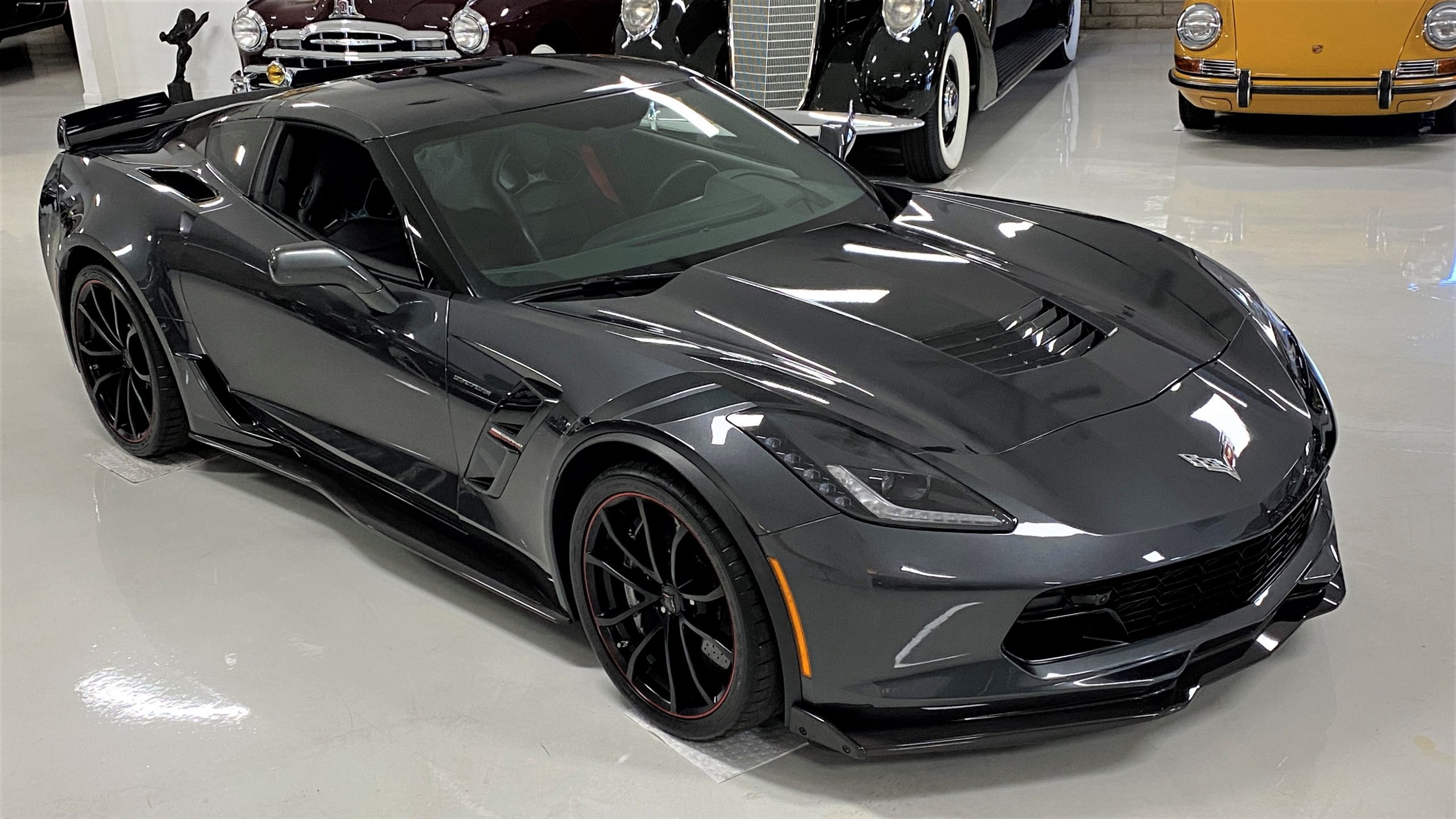 The Watkins Glen Gray Metallic Paint is accented with the subtle Carbon Flash colored fender hash stripes that have become synonymous with the Grand Sport Corvettes. A welcome addition to the body of this car is a high quality paint protection film that is only noticeable if you’re looking for it. This protects the paint from rock chips and scratches, without degrading the brilliance of the paint. The removable roof on this Grand Sport is made from lightweight carbon fiber with sueded microfiber headliner and is painted to match the exterior of the Corvette. Further setting this Vette apart from it’s lesser optioned models is a downforce adding carbon fiber front splitter, side rocker extensions, and stage three aero rear spoiler. Further supporting the level of care this Vette has received is the front splitter that is free from blemishes, despite it’s lower stance. The sinister theme continues with the black aluminum wheels with a thin red stripe, optional on the Grand Sport. On our inspection, we did notice one very small chip on the passenger side rear wheel.