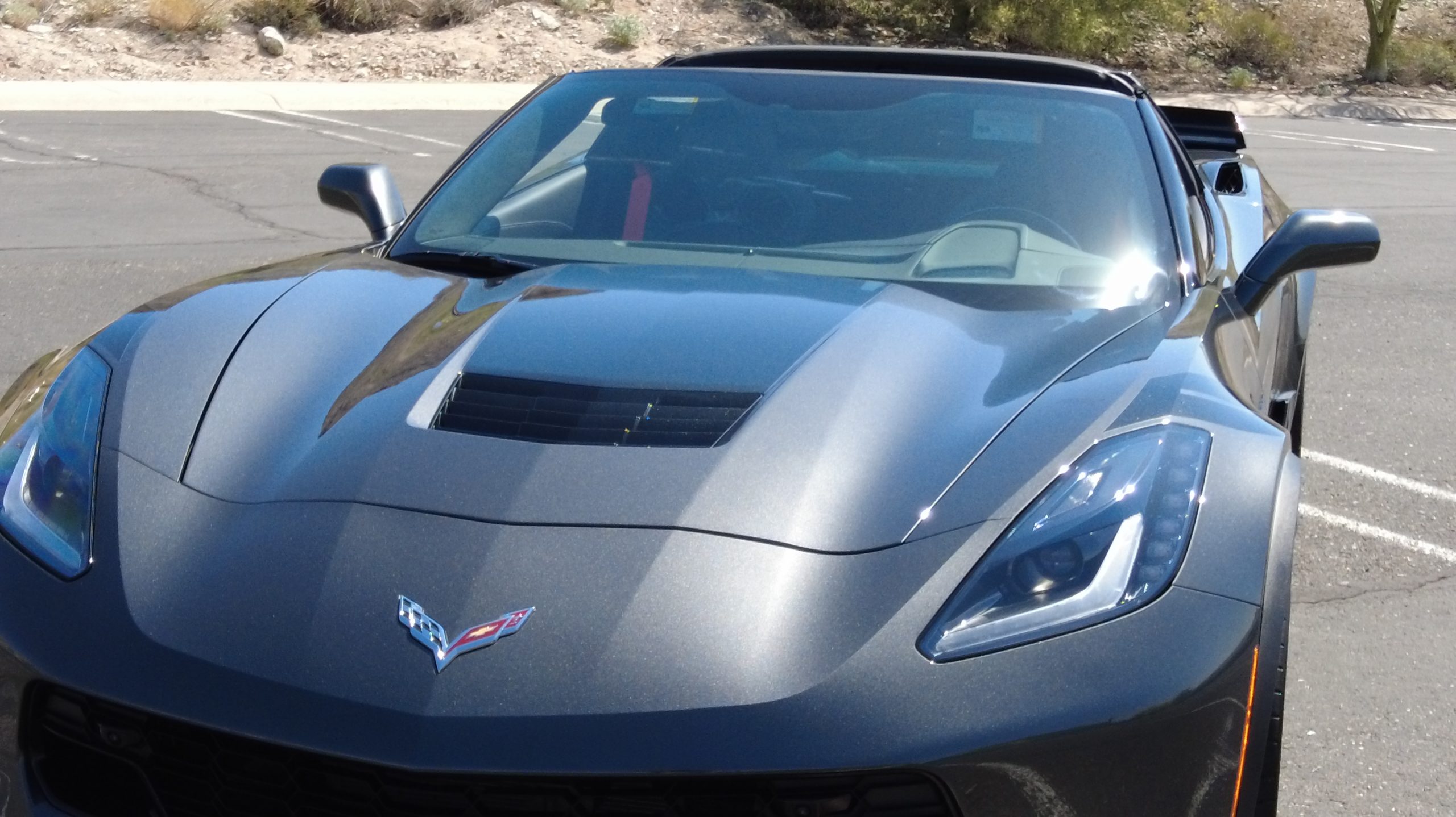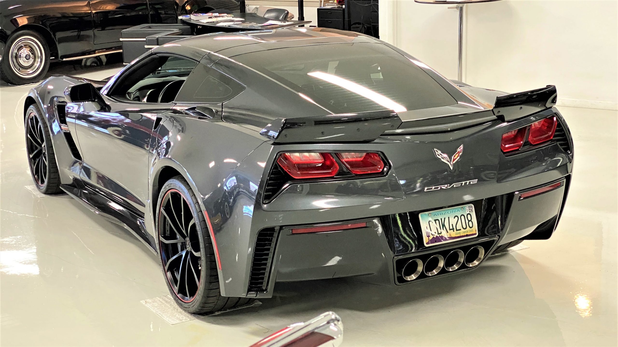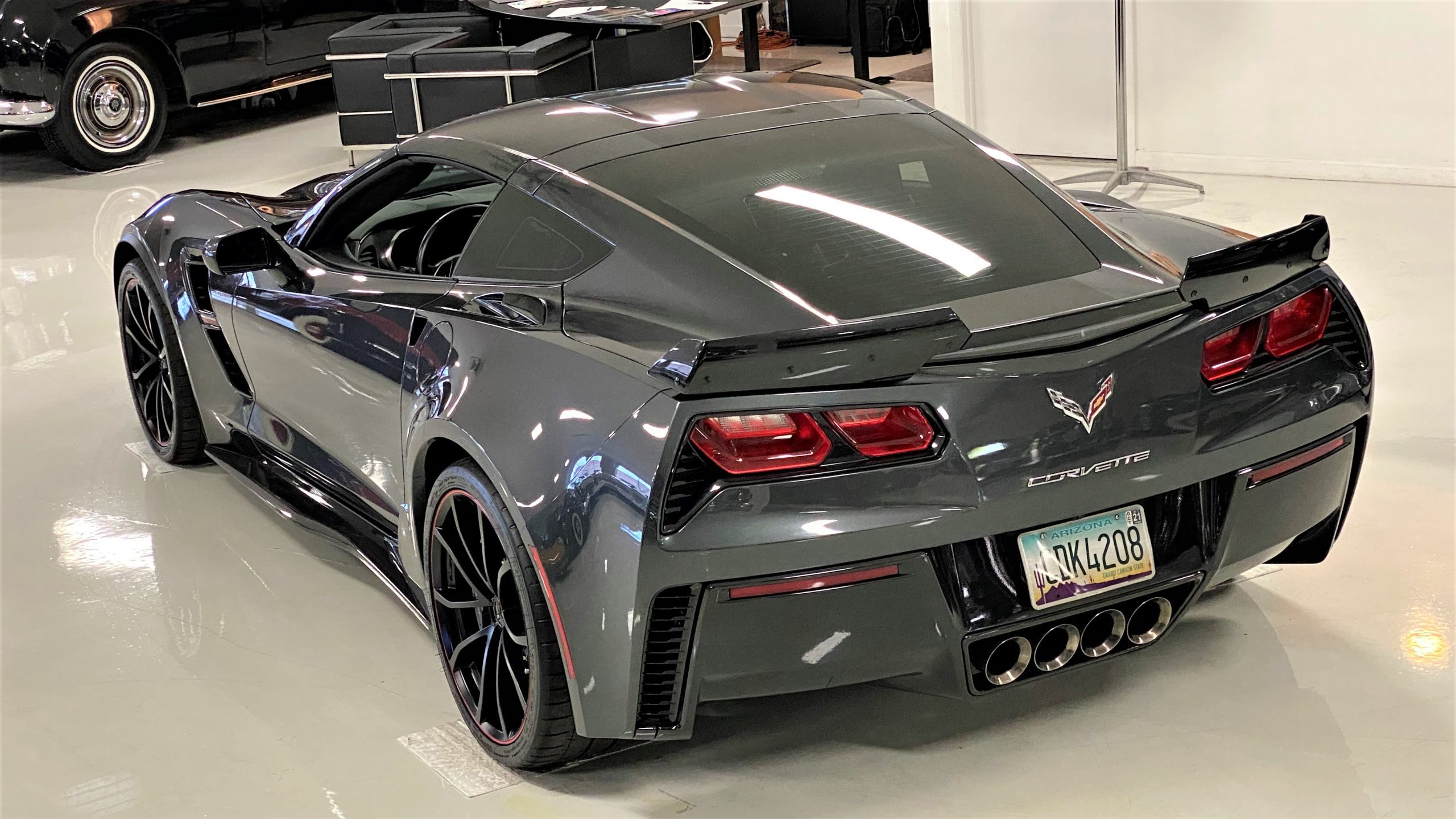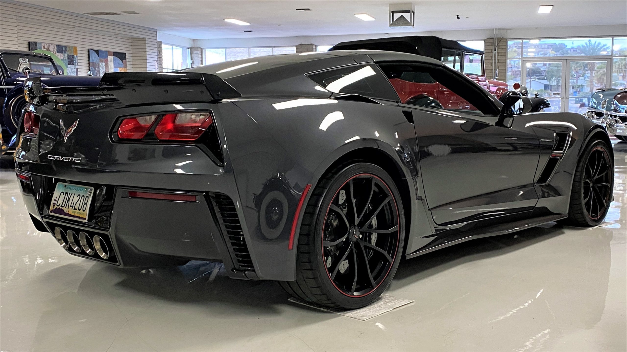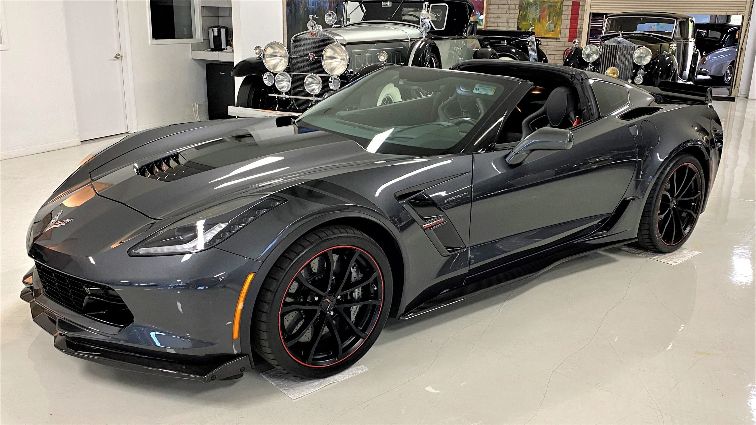 The Watkins Glen Gray Metallic Paint is accented with the subtle Carbon Flash colored fender hash stripes that have become synonymous with the Grand Sport Corvettes. A welcome addition to the body of this car is a high quality paint protection film that is only noticeable if you’re looking for it. This protects the paint from rock chips and scratches, without degrading the brilliance of the paint. The removable roof on this Grand Sport is made from lightweight carbon fiber with sueded microfiber headliner and is painted to match the exterior of the Corvette. Further setting this Vette apart from it’s lesser optioned models is a downforce adding carbon fiber front splitter, side rocker extensions, and stage three aero rear spoiler. Further supporting the level of care this Vette has received is the front splitter that is free from blemishes, despite it’s lower stance. The sinister theme continues with the black aluminum wheels with a thin red stripe, optional on the Grand Sport. On our inspection, we did notice one very small chip on the passenger side rear wheel.