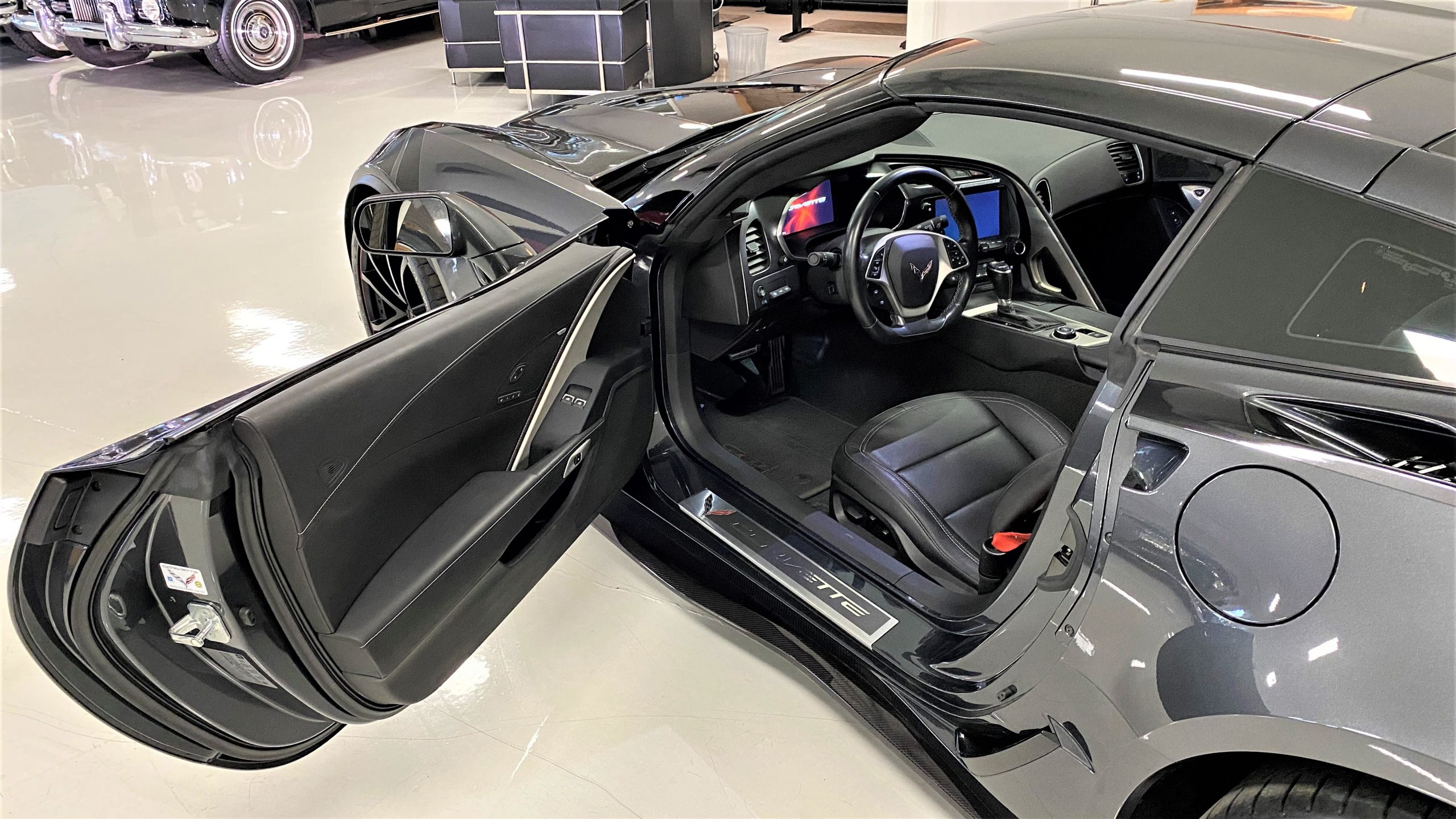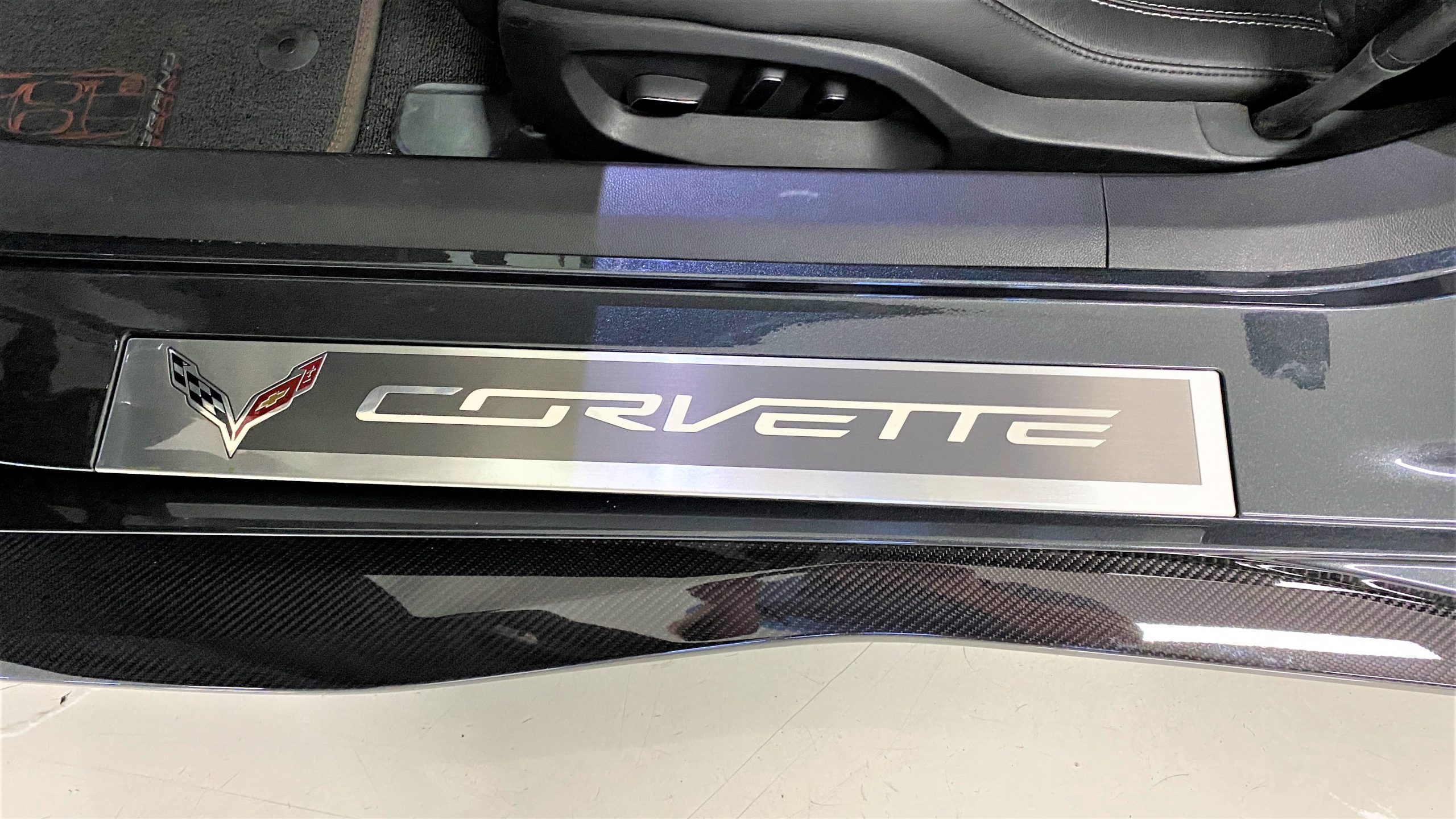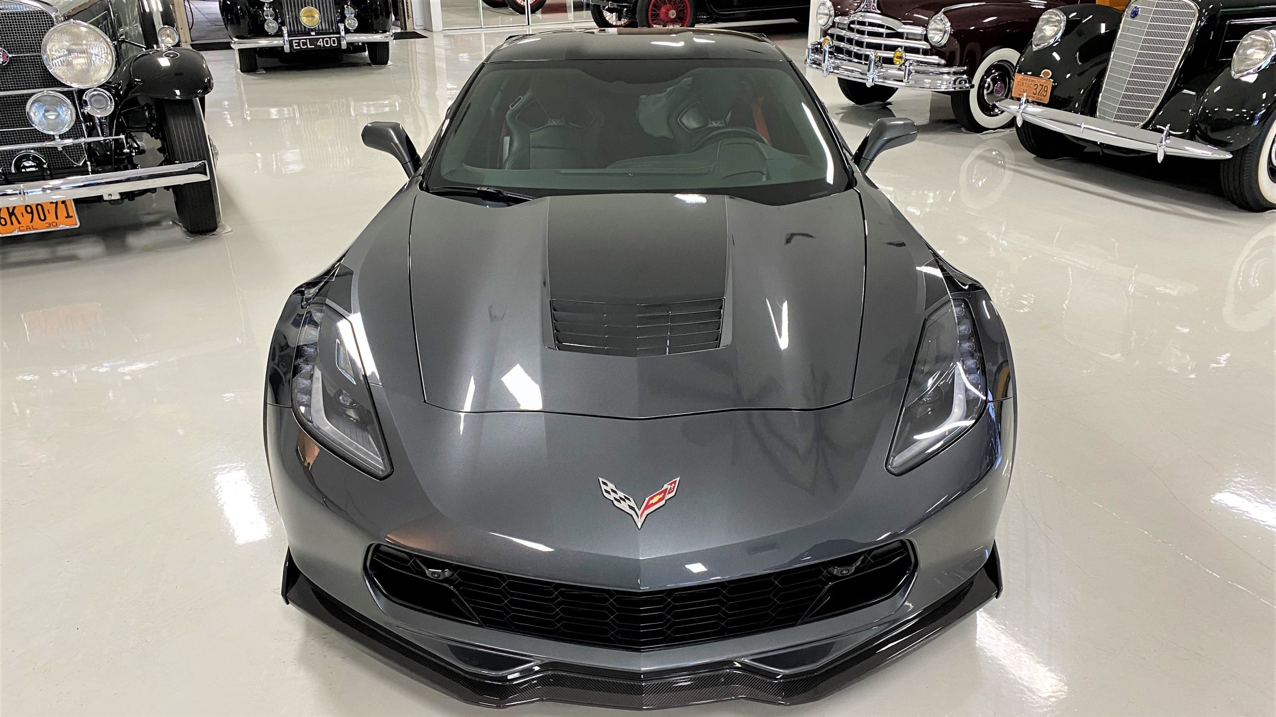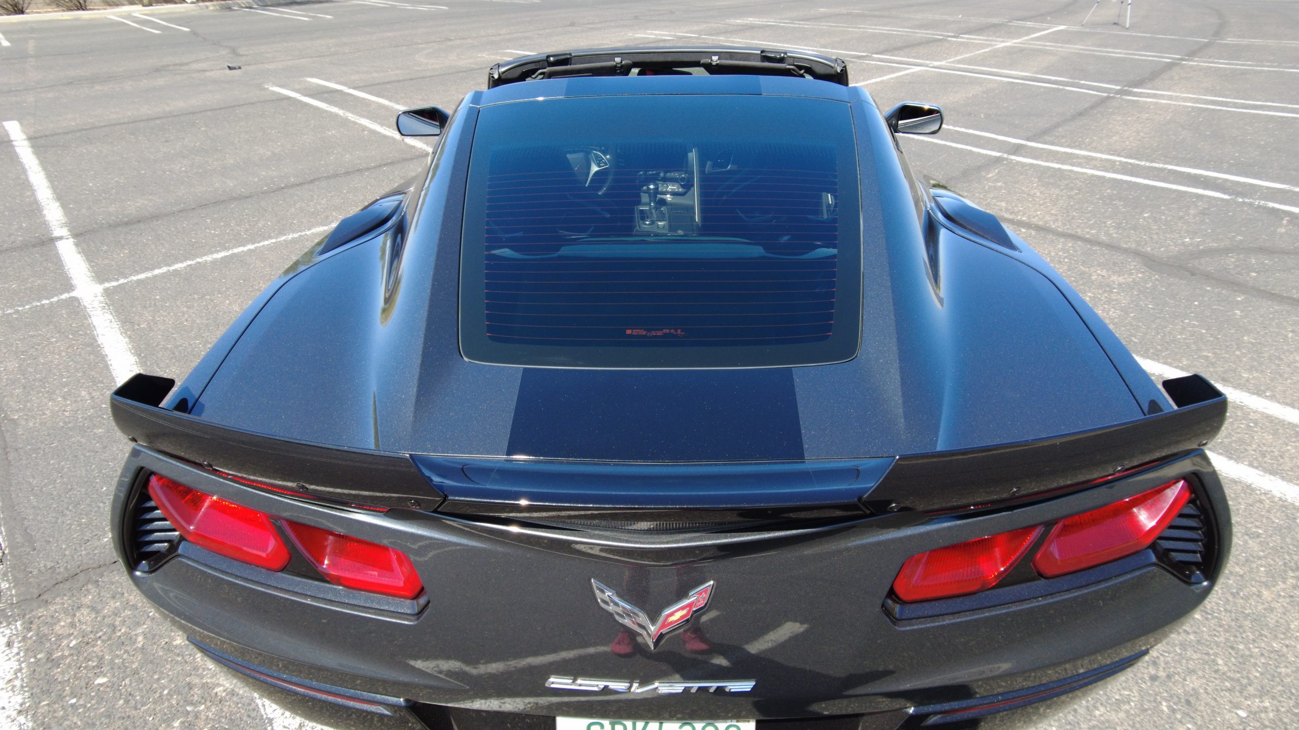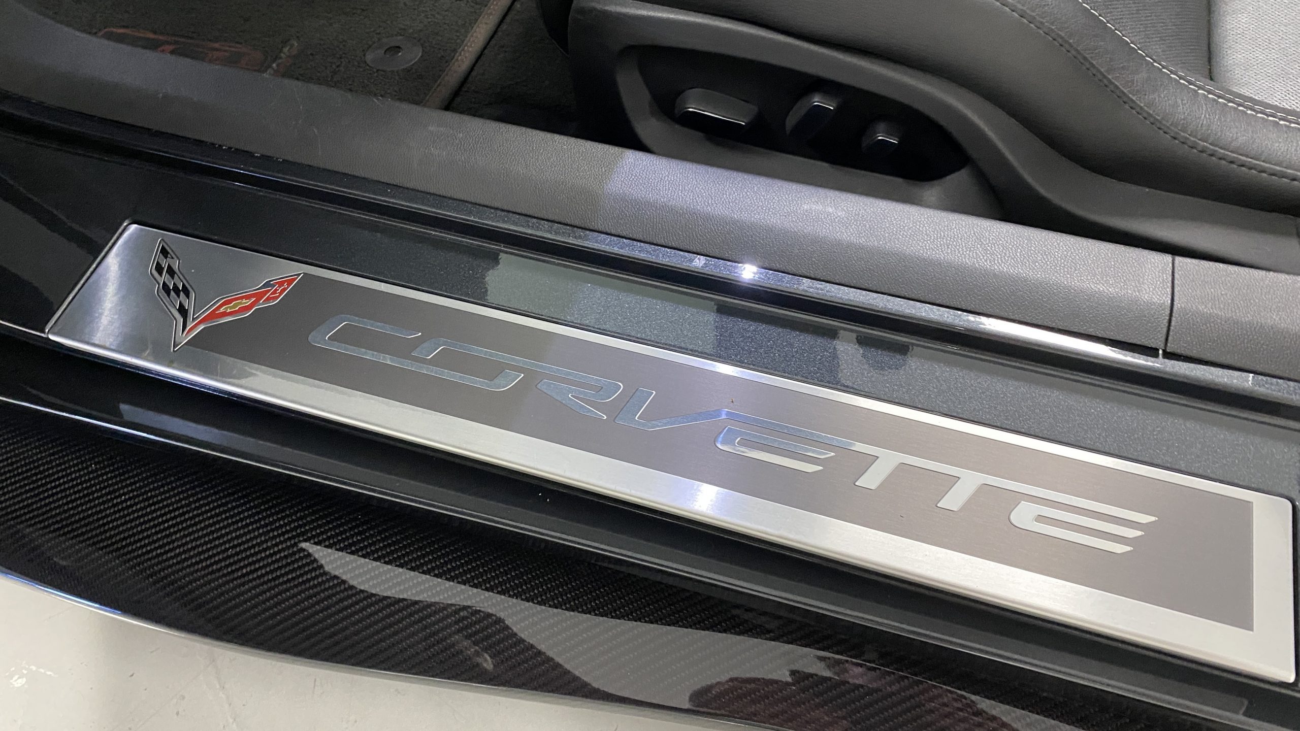 The Watkins Glen Gray Metallic Paint is accented with the subtle Carbon Flash colored fender hash stripes that have become synonymous with the Grand Sport Corvettes. A welcome addition to the body of this car is a high quality paint protection film that is only noticeable if you’re looking for it. This protects the paint from rock chips and scratches, without degrading the brilliance of the paint. The removable roof on this Grand Sport is made from lightweight carbon fiber with sueded microfiber headliner and is painted to match the exterior of the Corvette. Further setting this Vette apart from it’s lesser optioned models is a downforce adding carbon fiber front splitter, side rocker extensions, and stage three aero rear spoiler. Further supporting the level of care this Vette has received is the front splitter that is free from blemishes, despite it’s lower stance. The sinister theme continues with the black aluminum wheels with a thin red stripe, optional on the Grand Sport. On our inspection, we did notice one very small chip on the passenger side rear wheel.