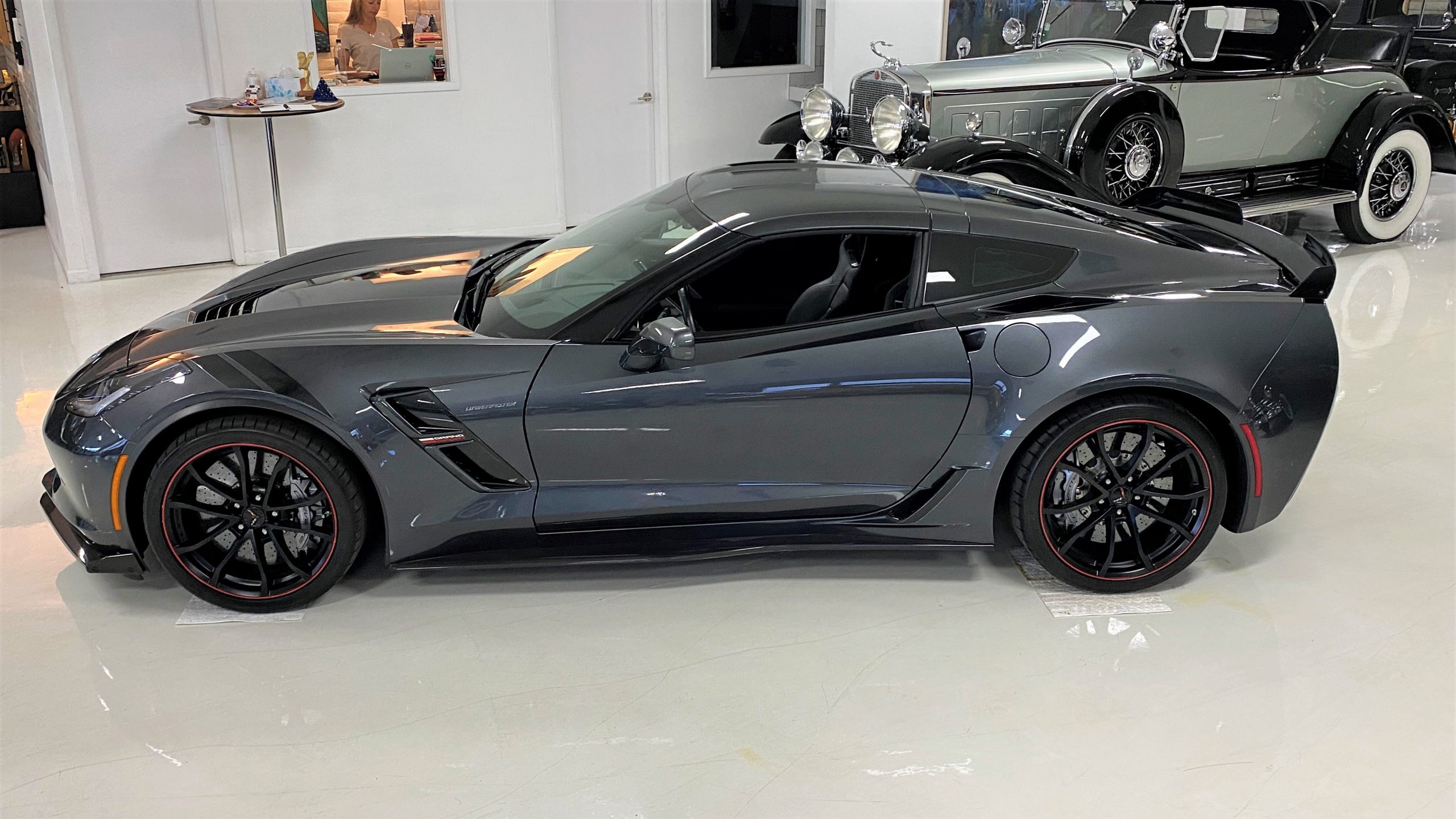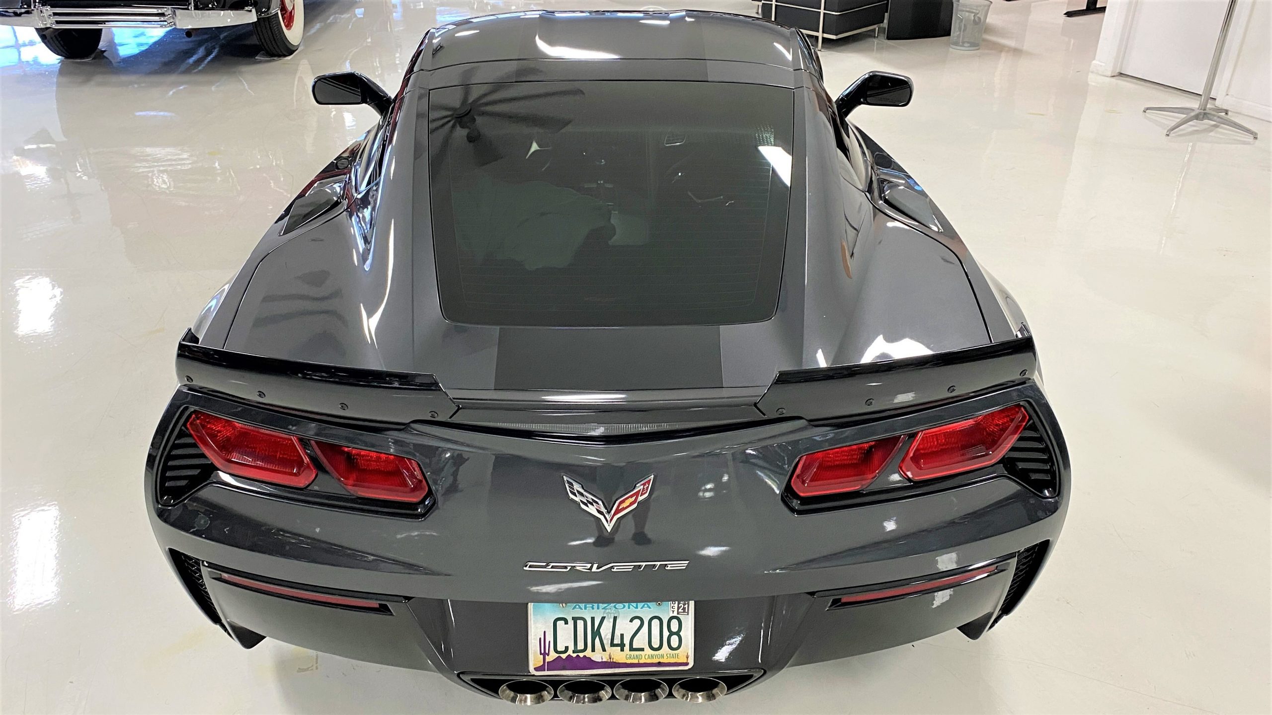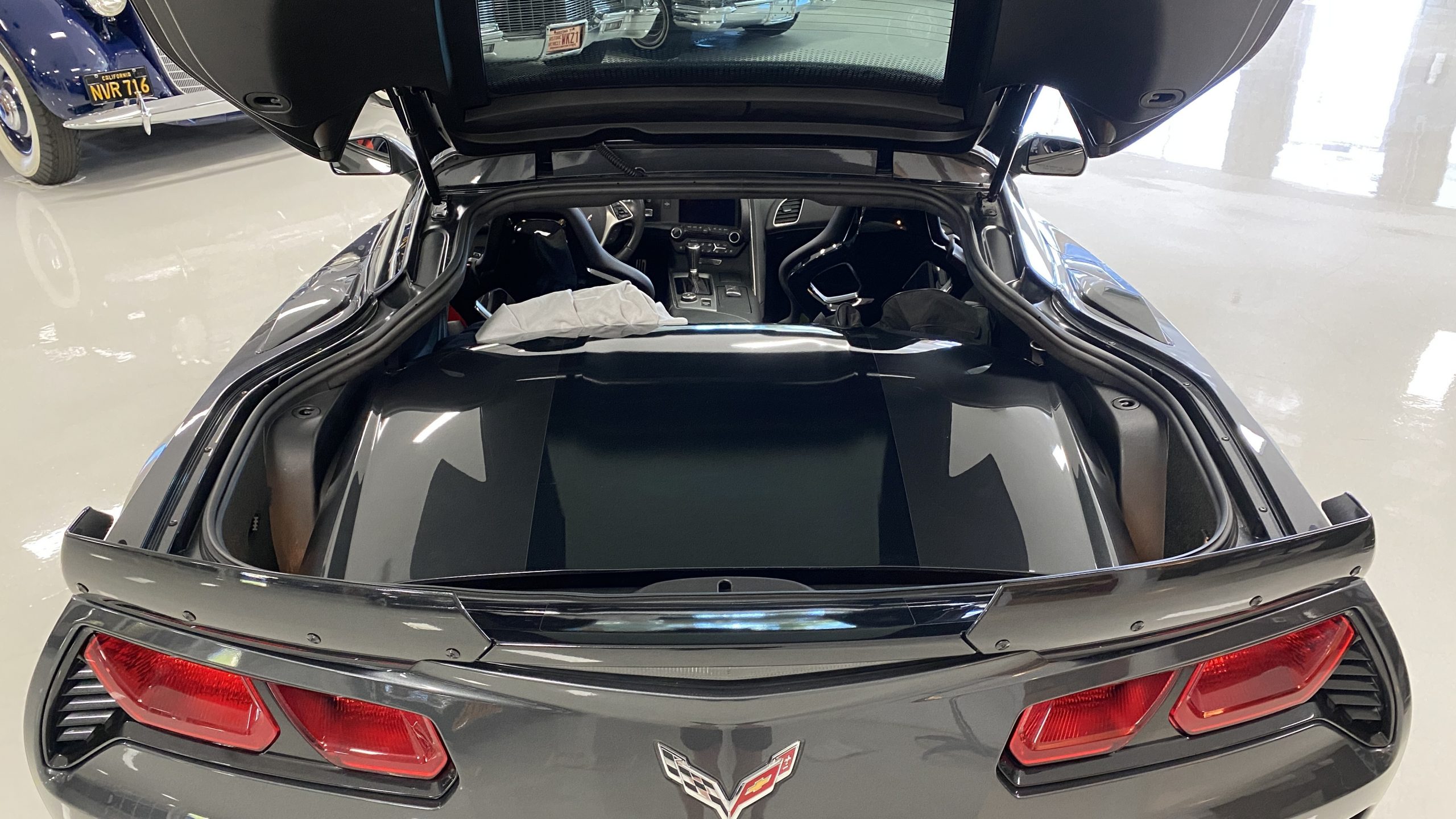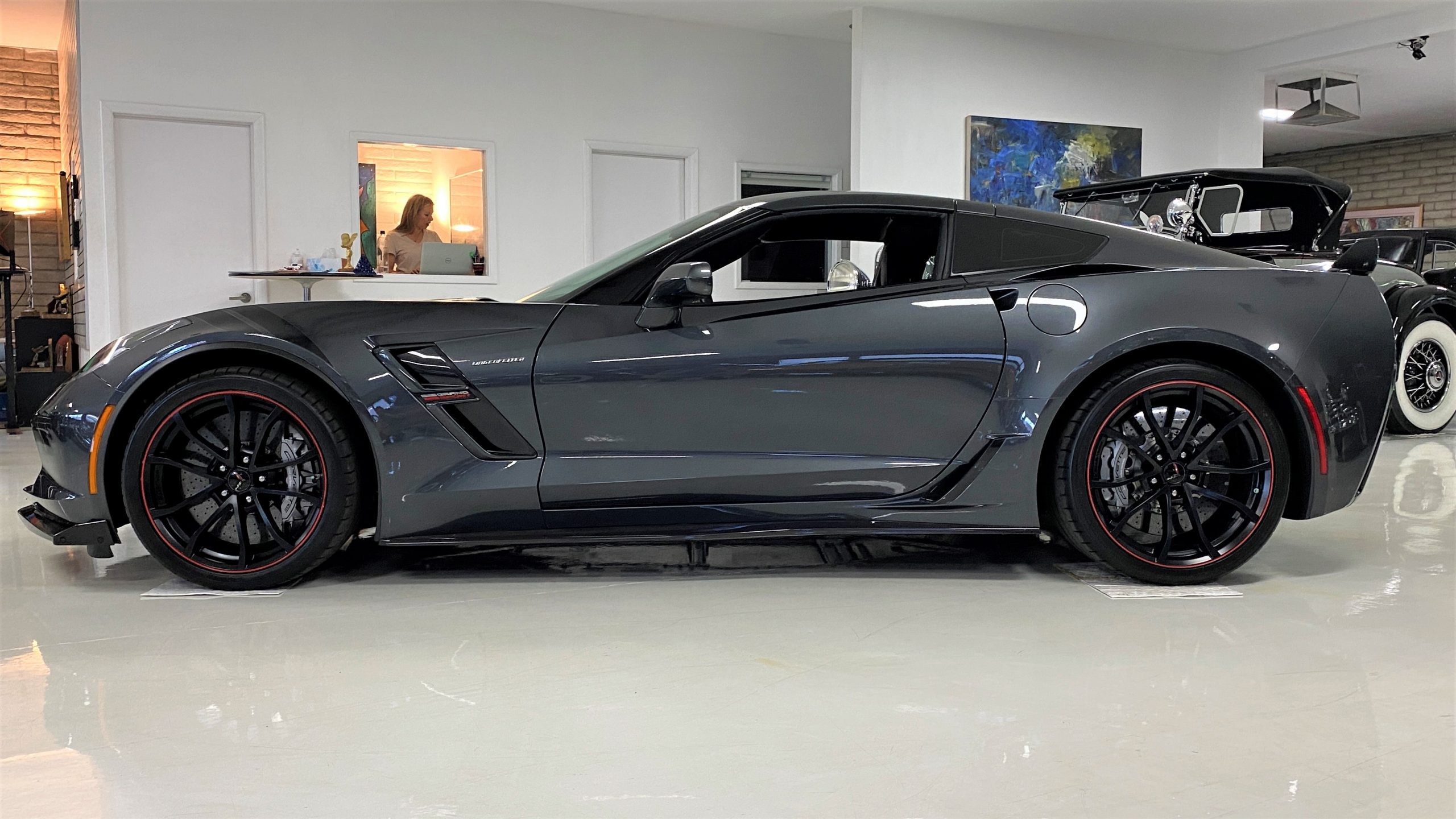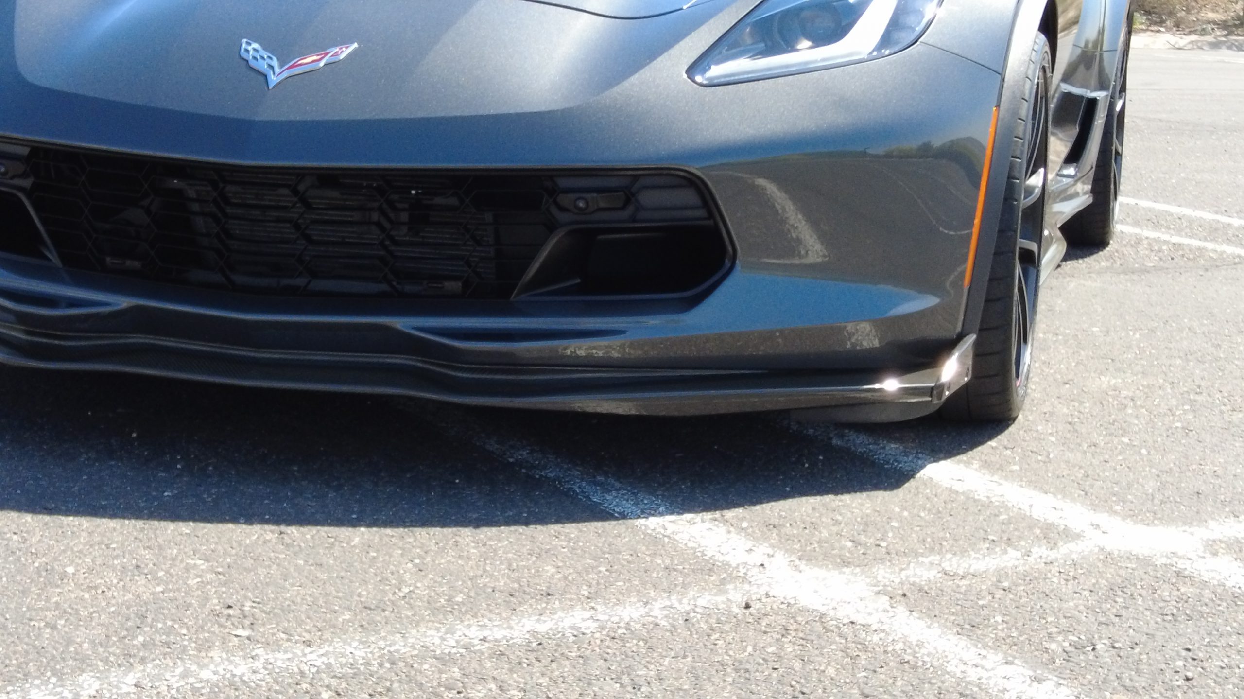 The Watkins Glen Gray Metallic Paint is accented with the subtle Carbon Flash colored fender hash stripes that have become synonymous with the Grand Sport Corvettes. A welcome addition to the body of this car is a high quality paint protection film that is only noticeable if you’re looking for it. This protects the paint from rock chips and scratches, without degrading the brilliance of the paint. The removable roof on this Grand Sport is made from lightweight carbon fiber with sueded microfiber headliner and is painted to match the exterior of the Corvette. Further setting this Vette apart from it’s lesser optioned models is a downforce adding carbon fiber front splitter, side rocker extensions, and stage three aero rear spoiler. Further supporting the level of care this Vette has received is the front splitter that is free from blemishes, despite it’s lower stance. The sinister theme continues with the black aluminum wheels with a thin red stripe, optional on the Grand Sport. On our inspection, we did notice one very small chip on the passenger side rear wheel.