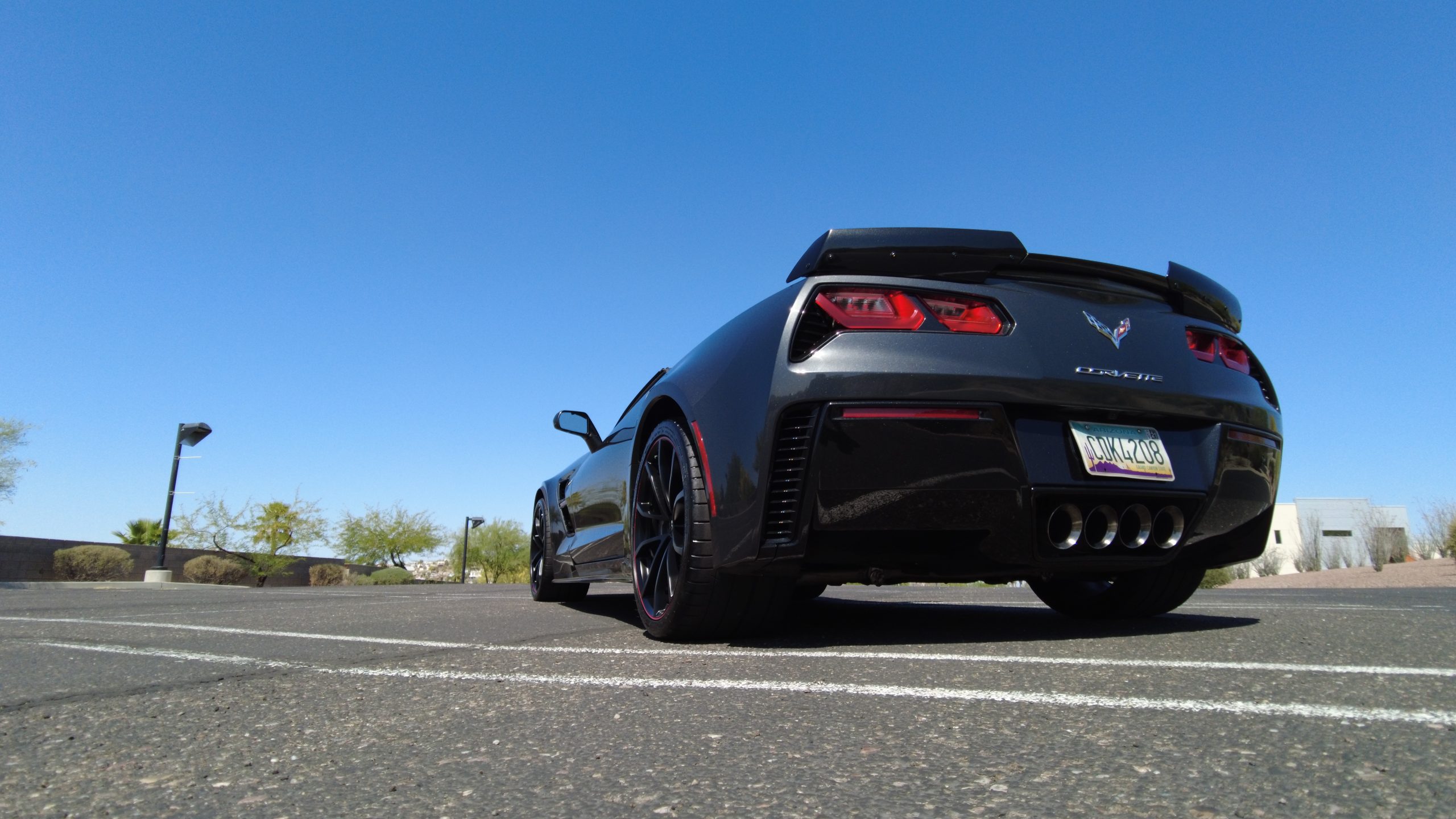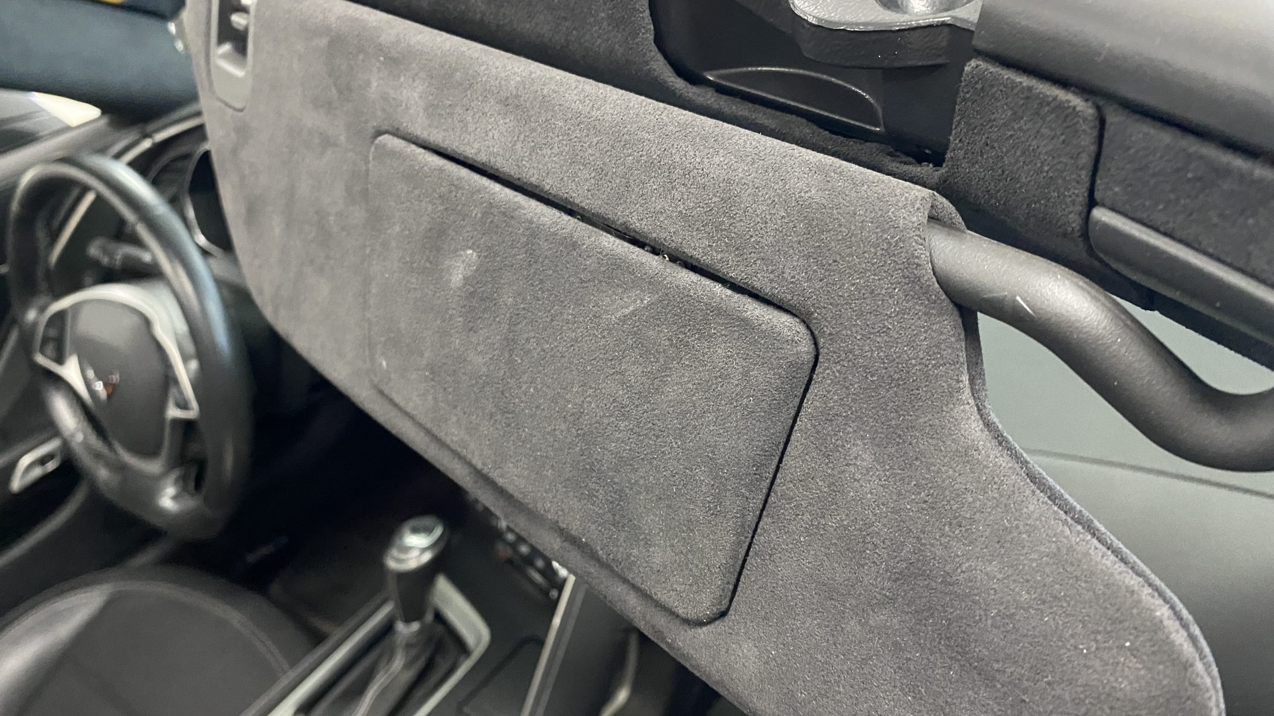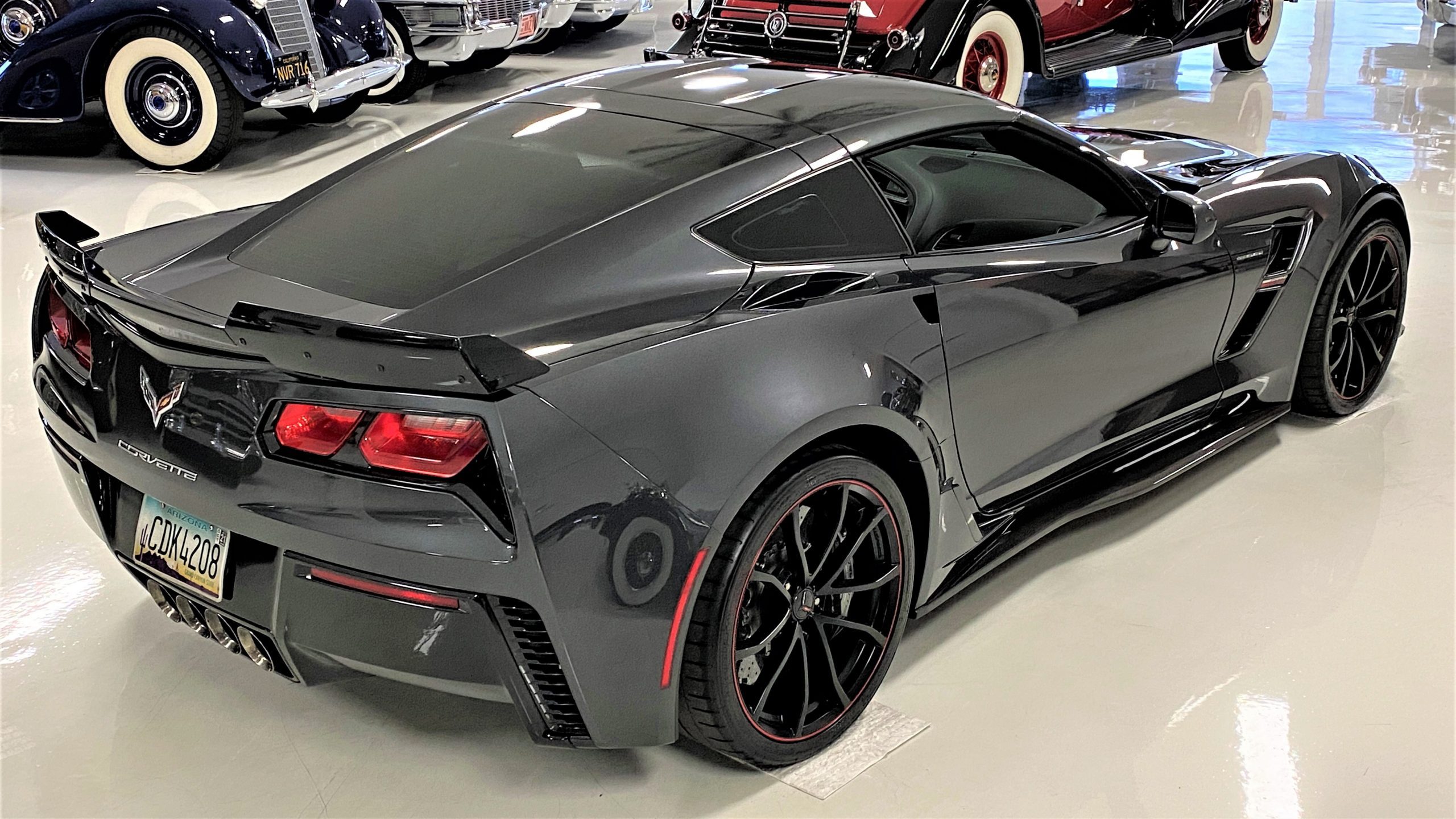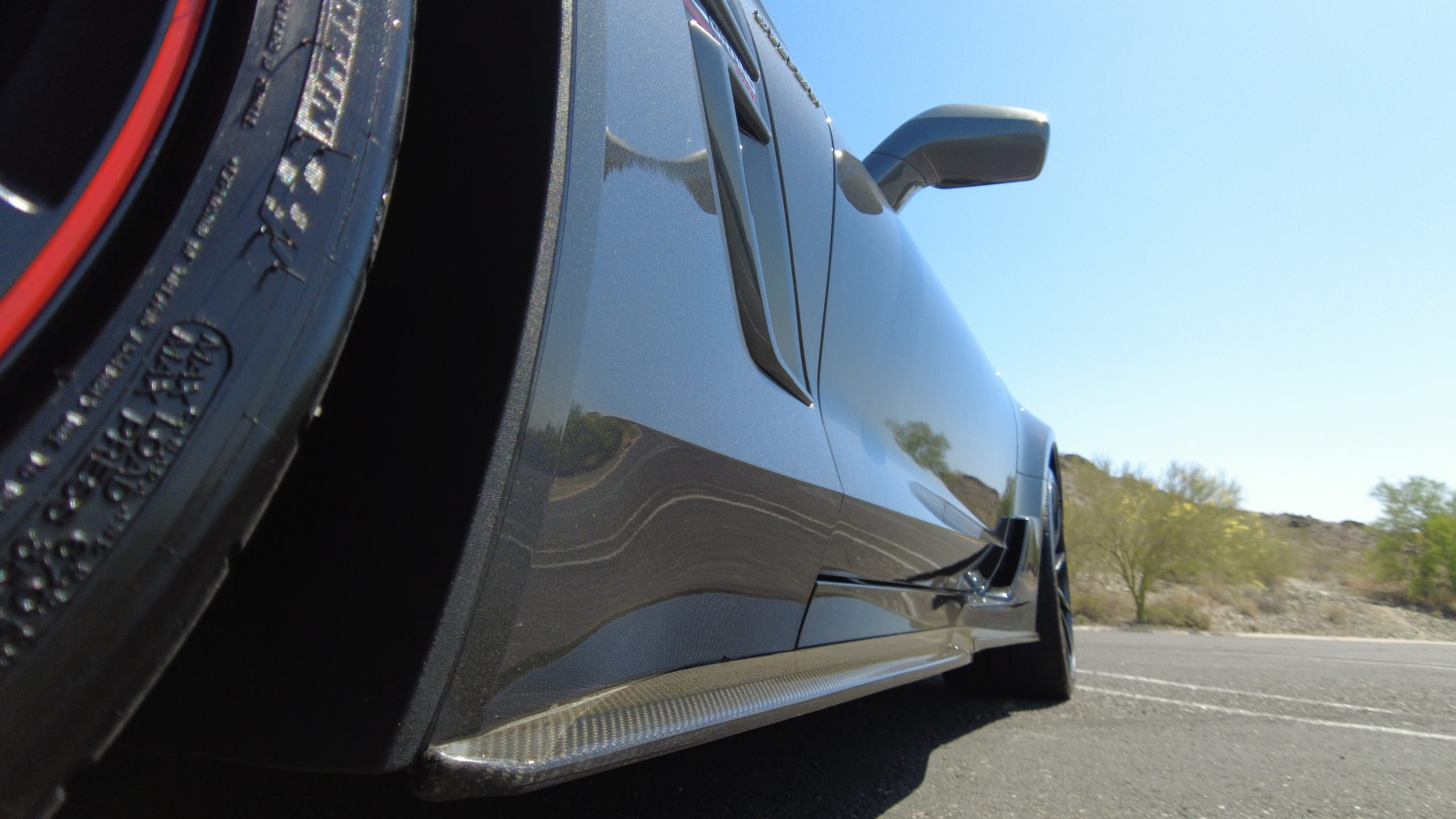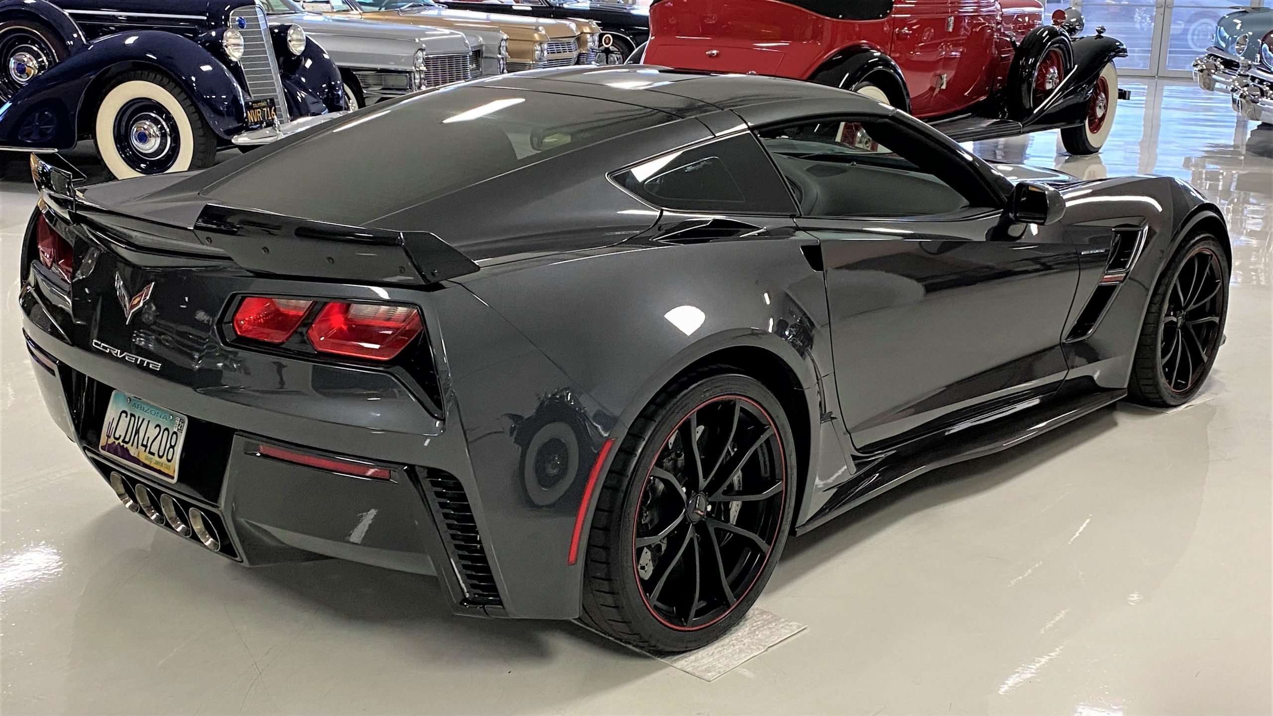 The Watkins Glen Gray Metallic Paint is accented with the subtle Carbon Flash colored fender hash stripes that have become synonymous with the Grand Sport Corvettes. A welcome addition to the body of this car is a high quality paint protection film that is only noticeable if you’re looking for it. This protects the paint from rock chips and scratches, without degrading the brilliance of the paint. The removable roof on this Grand Sport is made from lightweight carbon fiber with sueded microfiber headliner and is painted to match the exterior of the Corvette. Further setting this Vette apart from it’s lesser optioned models is a downforce adding carbon fiber front splitter, side rocker extensions, and stage three aero rear spoiler. Further supporting the level of care this Vette has received is the front splitter that is free from blemishes, despite it’s lower stance. The sinister theme continues with the black aluminum wheels with a thin red stripe, optional on the Grand Sport. On our inspection, we did notice one very small chip on the passenger side rear wheel.