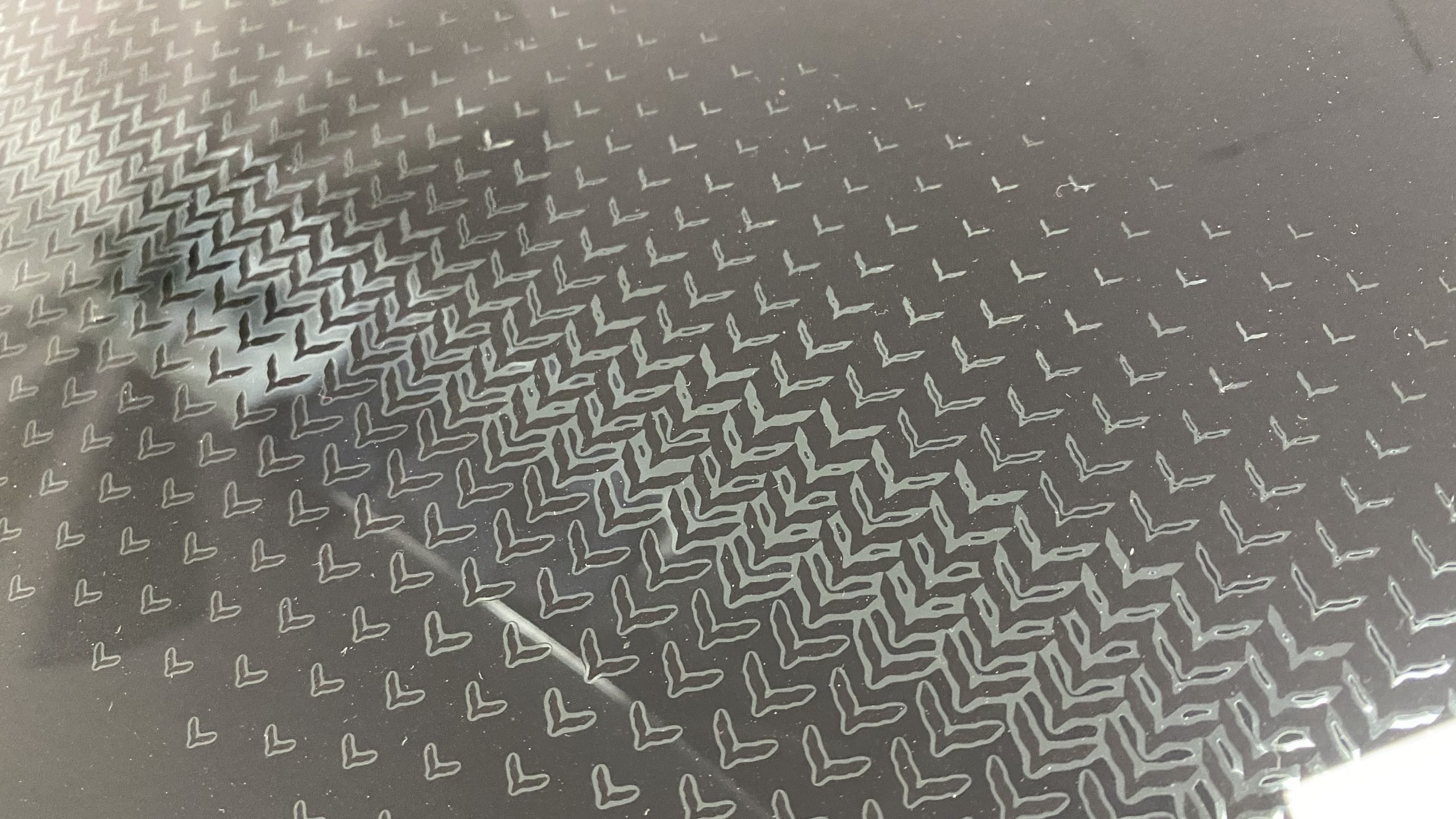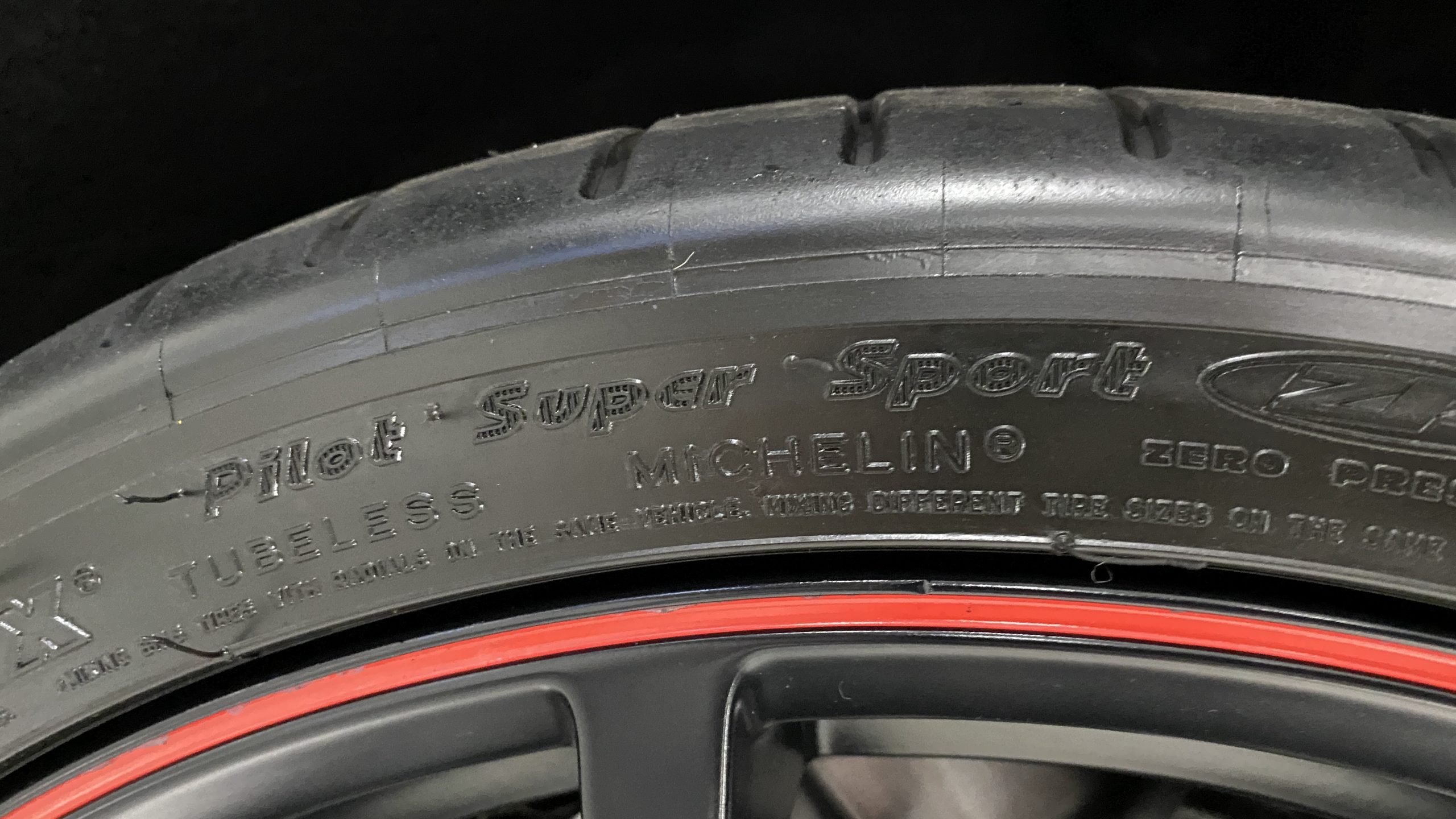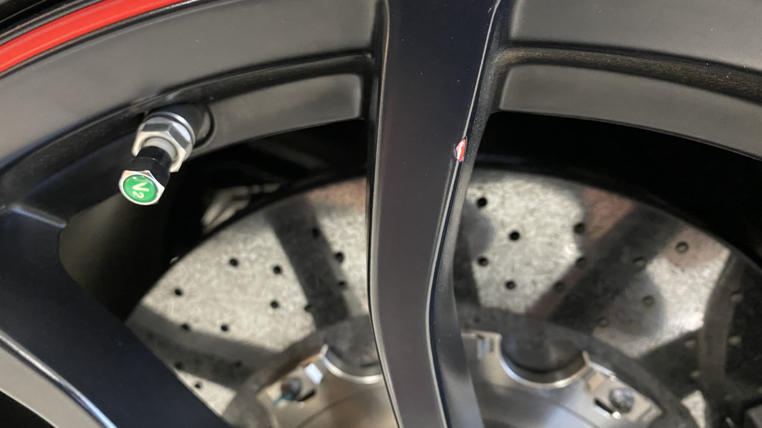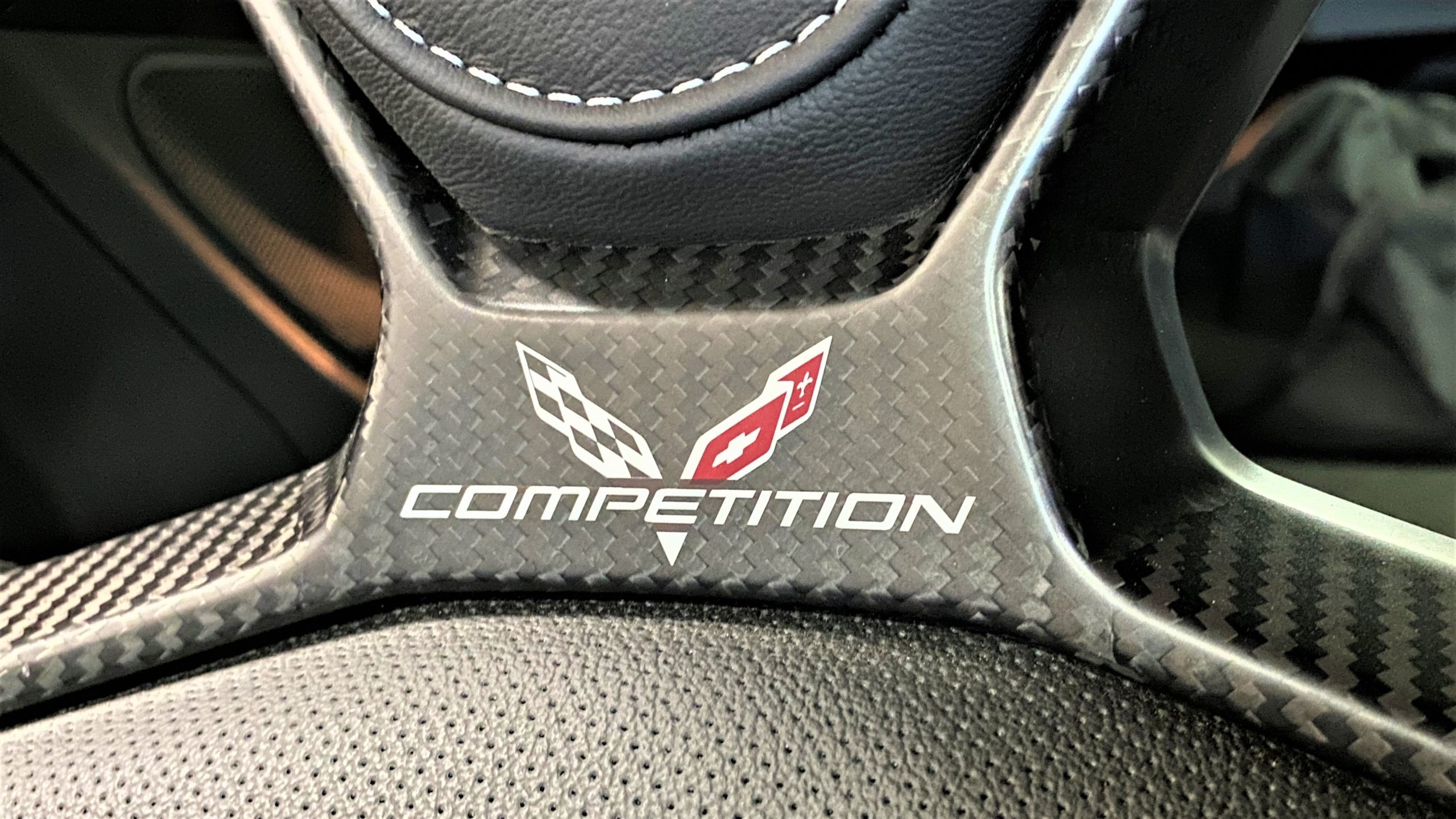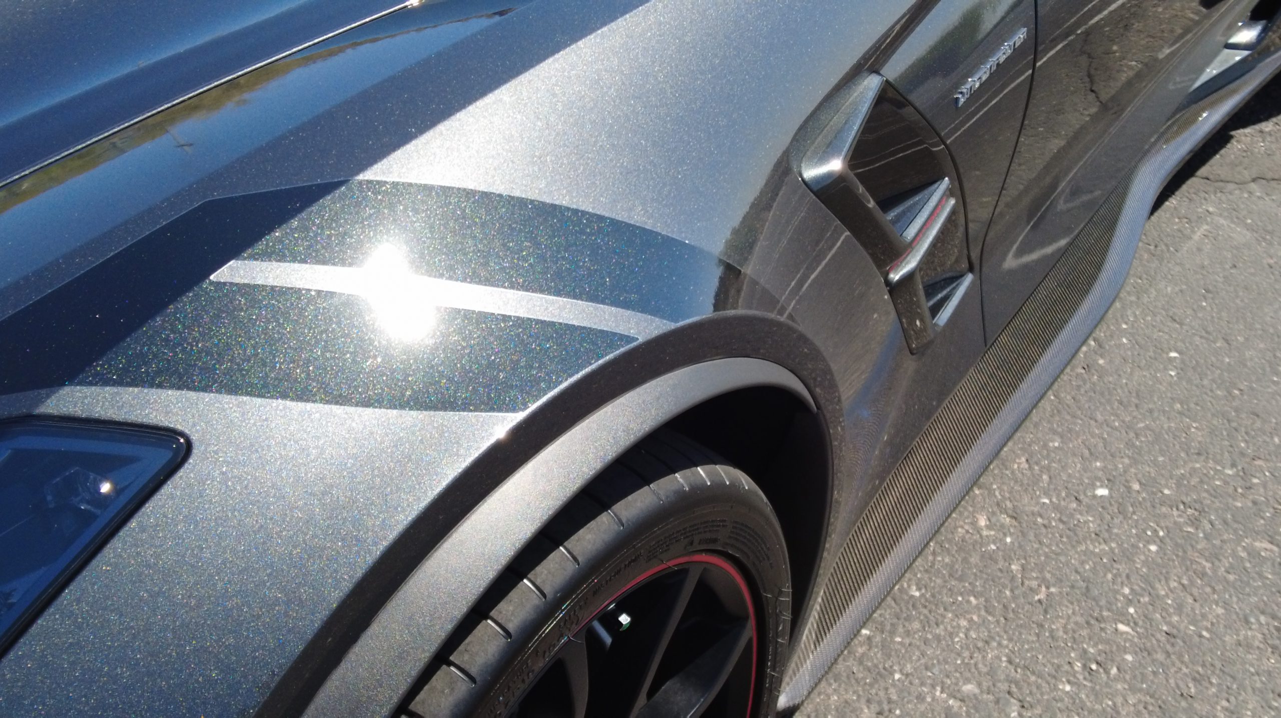 The Watkins Glen Gray Metallic Paint is accented with the subtle Carbon Flash colored fender hash stripes that have become synonymous with the Grand Sport Corvettes. A welcome addition to the body of this car is a high quality paint protection film that is only noticeable if you’re looking for it. This protects the paint from rock chips and scratches, without degrading the brilliance of the paint. The removable roof on this Grand Sport is made from lightweight carbon fiber with sueded microfiber headliner and is painted to match the exterior of the Corvette. Further setting this Vette apart from it’s lesser optioned models is a downforce adding carbon fiber front splitter, side rocker extensions, and stage three aero rear spoiler. Further supporting the level of care this Vette has received is the front splitter that is free from blemishes, despite it’s lower stance. The sinister theme continues with the black aluminum wheels with a thin red stripe, optional on the Grand Sport. On our inspection, we did notice one very small chip on the passenger side rear wheel.