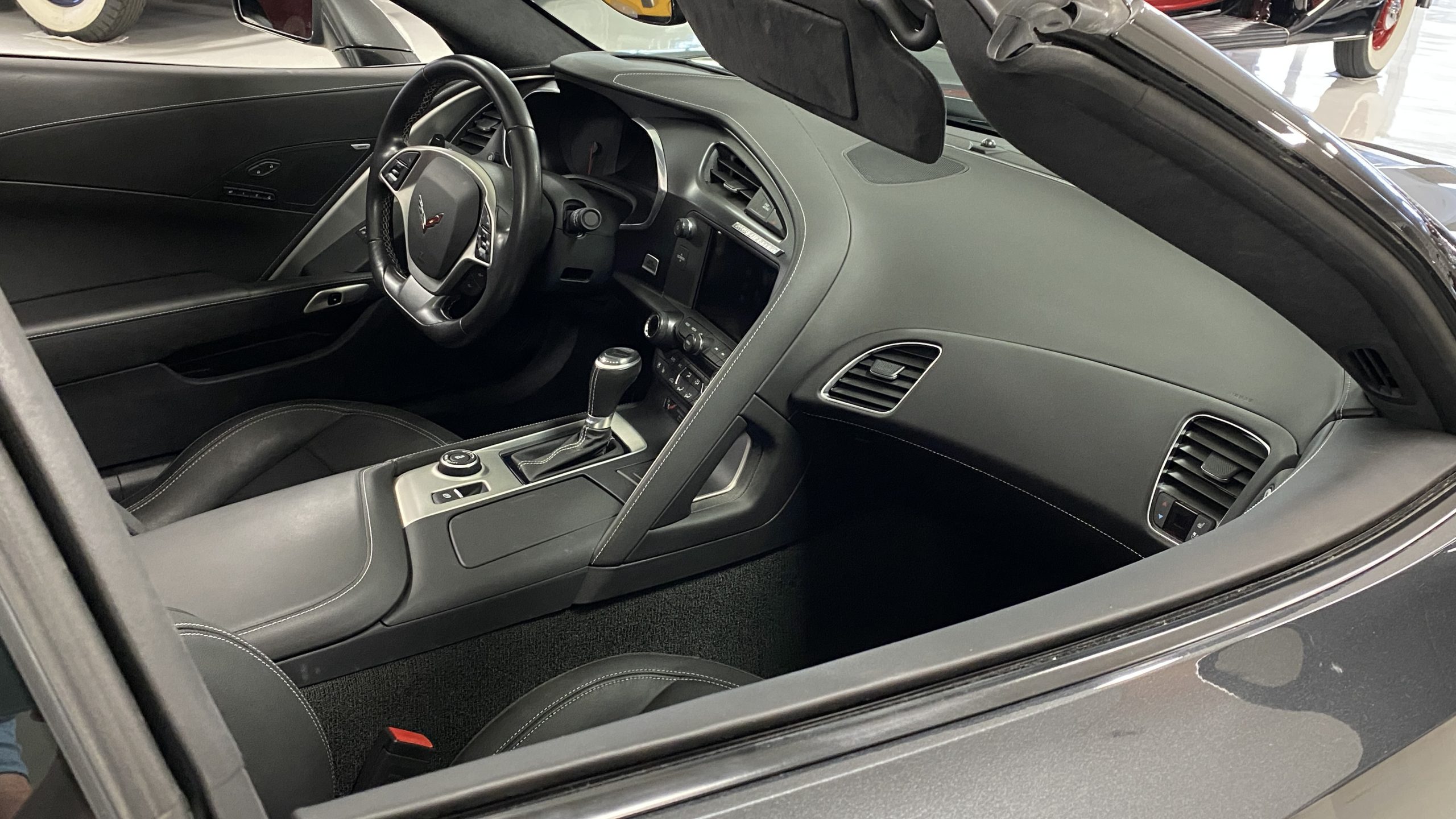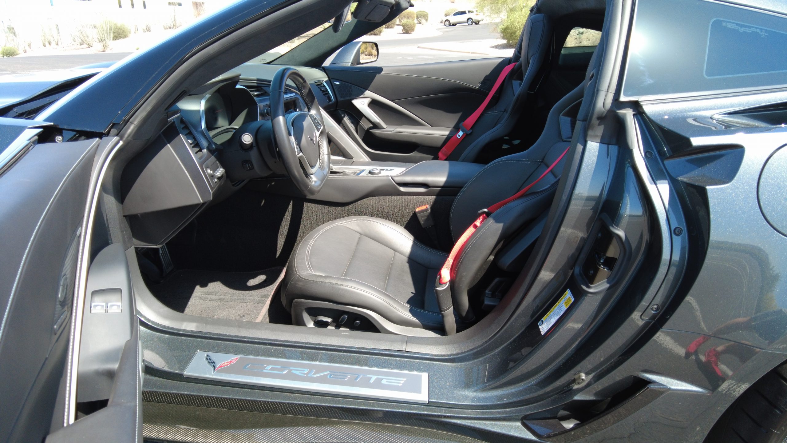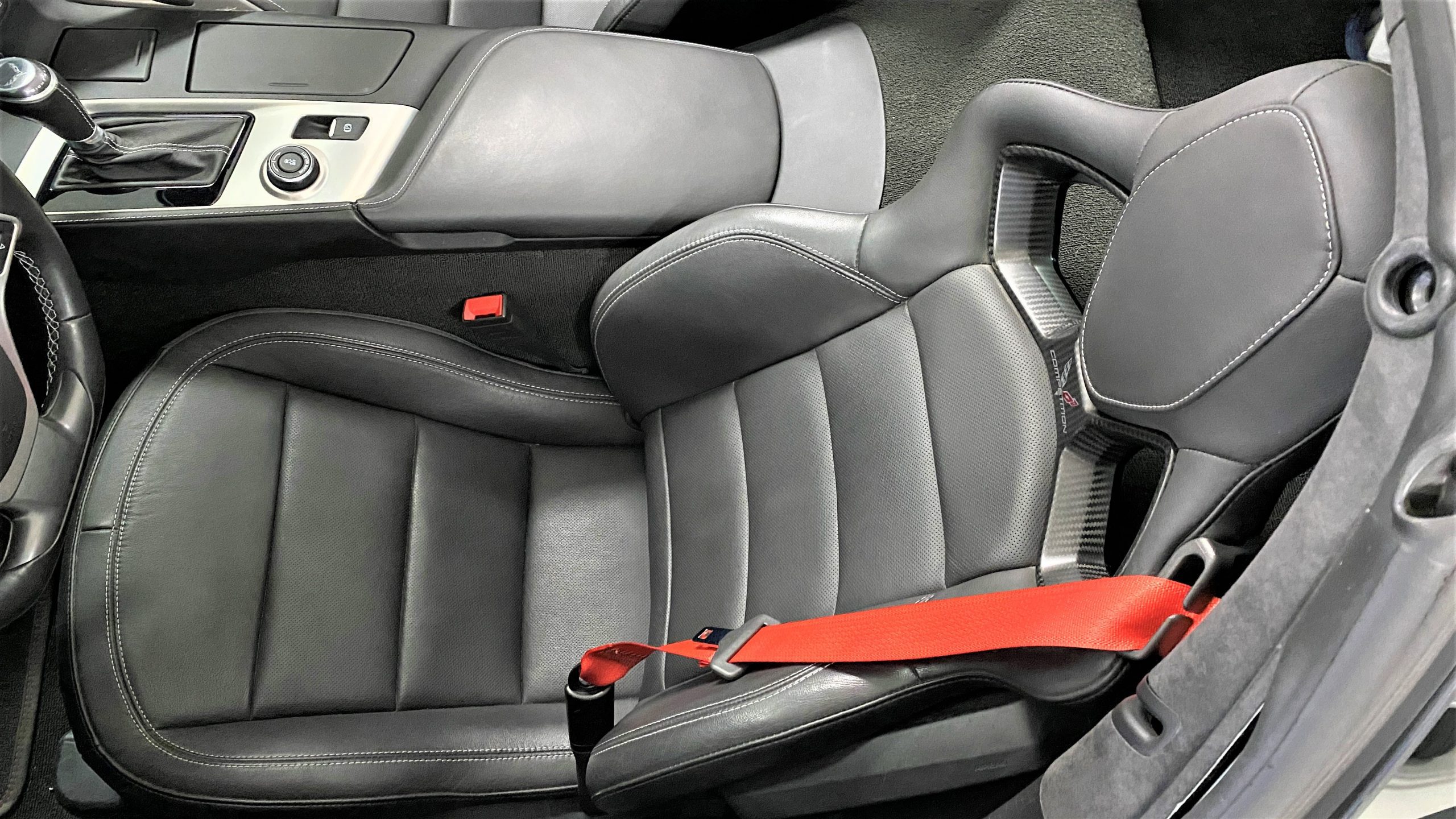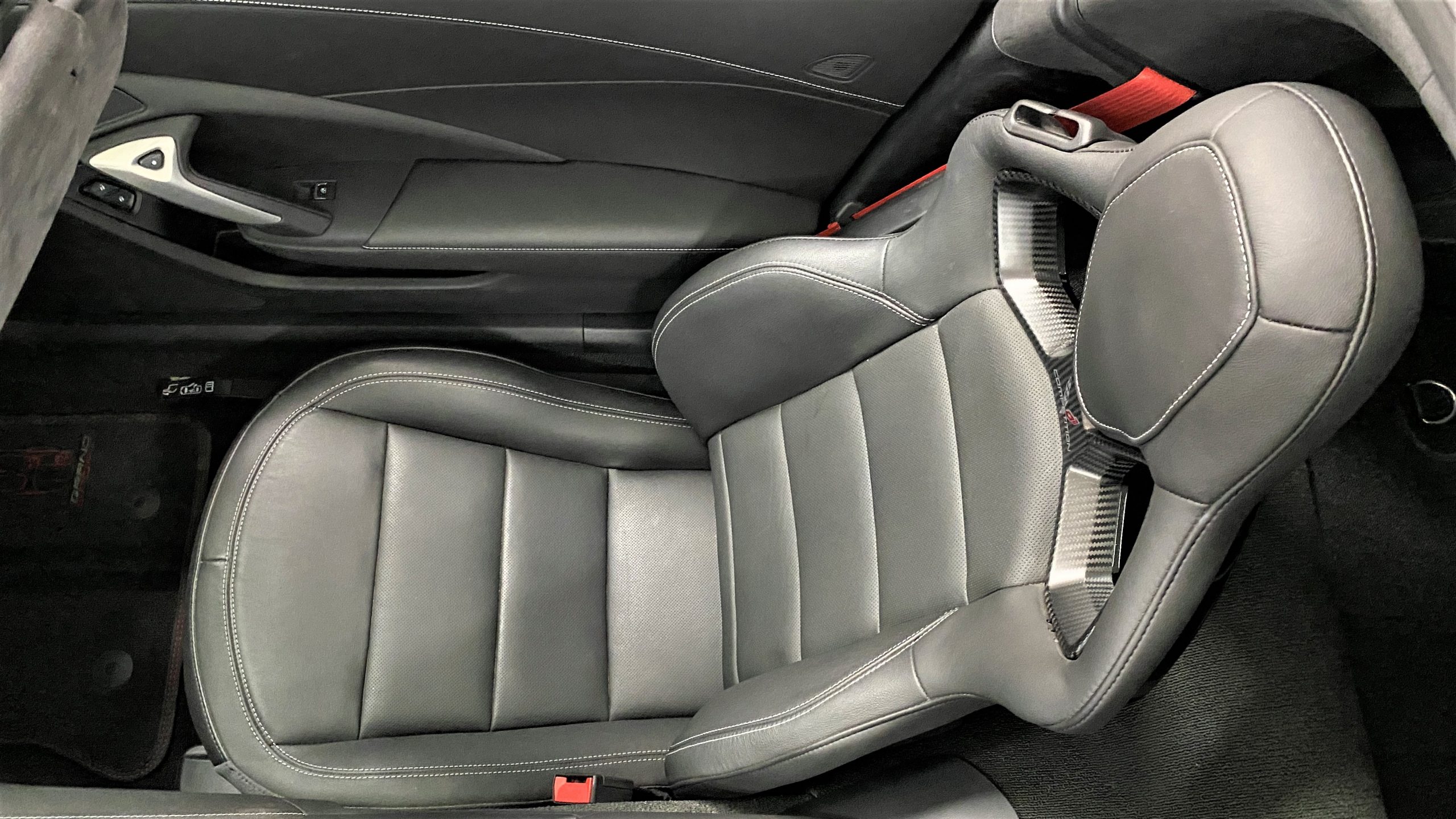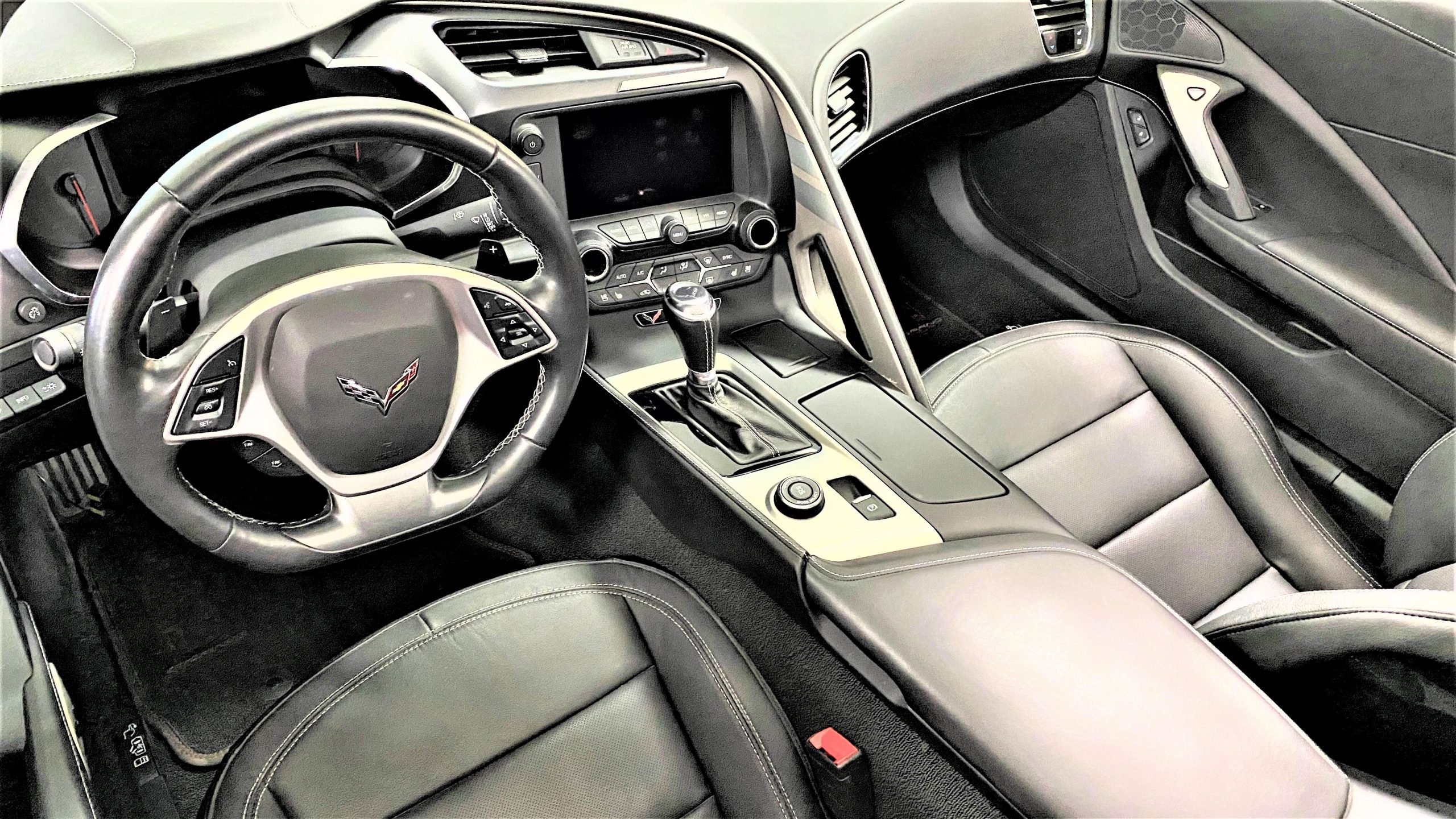 The optional Jet Black Napa leather perforated Competition Sport Seats ($1,995) offer thick bolstering and are contrasted with bright red seat belts, both designed to hold the occupants in place in any driving scenario.  The interior still has the new car smell and the leather still feels soft and supple, with no signs of wear.  Because this is a 3LT (the highest option for comfort and convenience offered on the Grand Sport), the occupants can enjoy heated and ventilated seats, a custom black leather wrapped dashboard, door panels and center console, and the black sueded microfiber upper trim package, among other welcome additions, detailed below. All of these options remain in showroom condition.