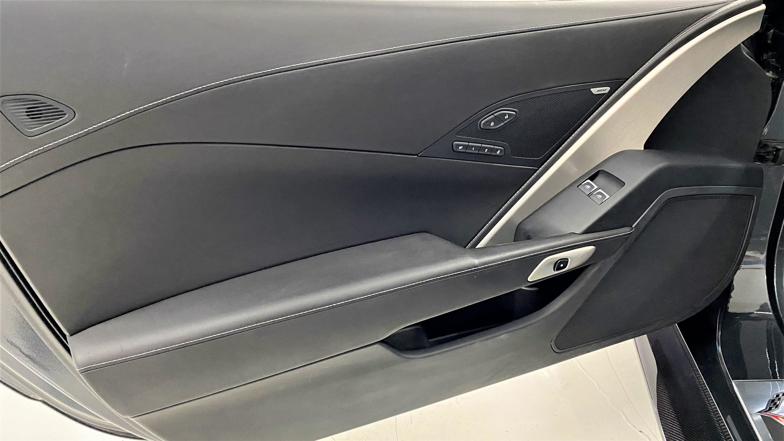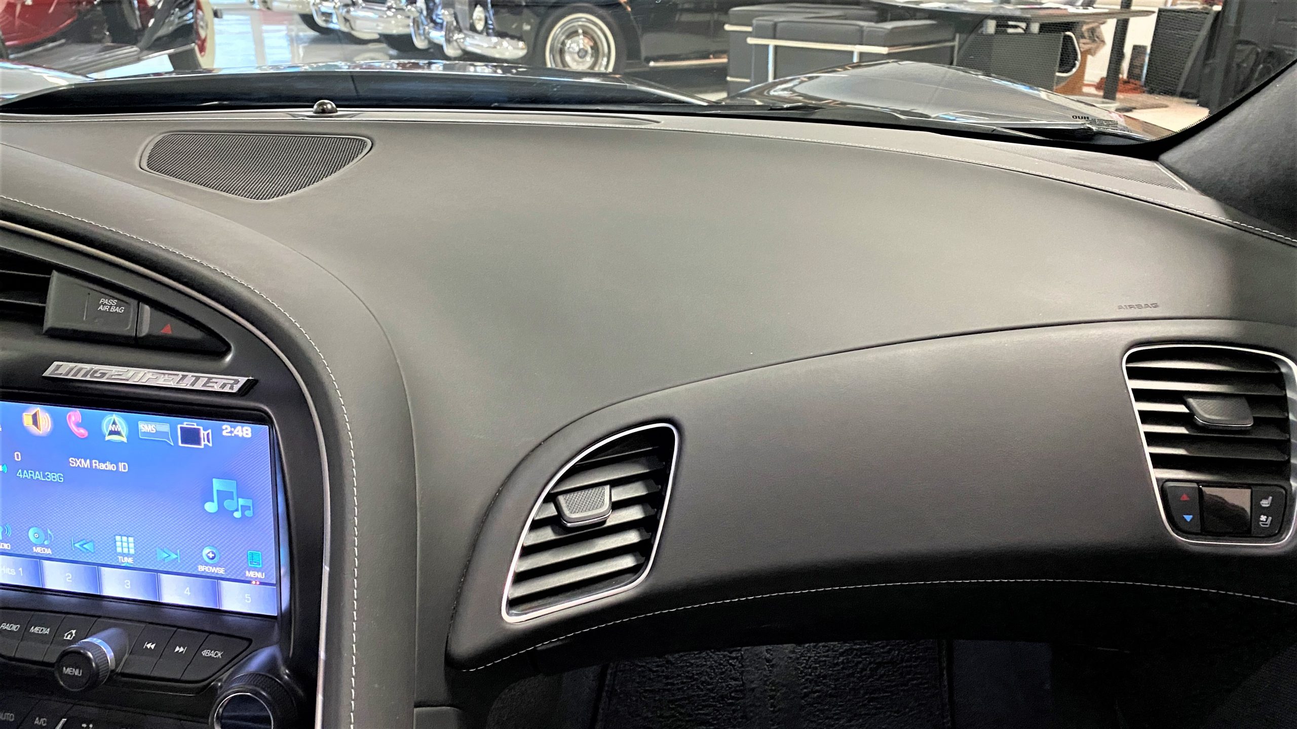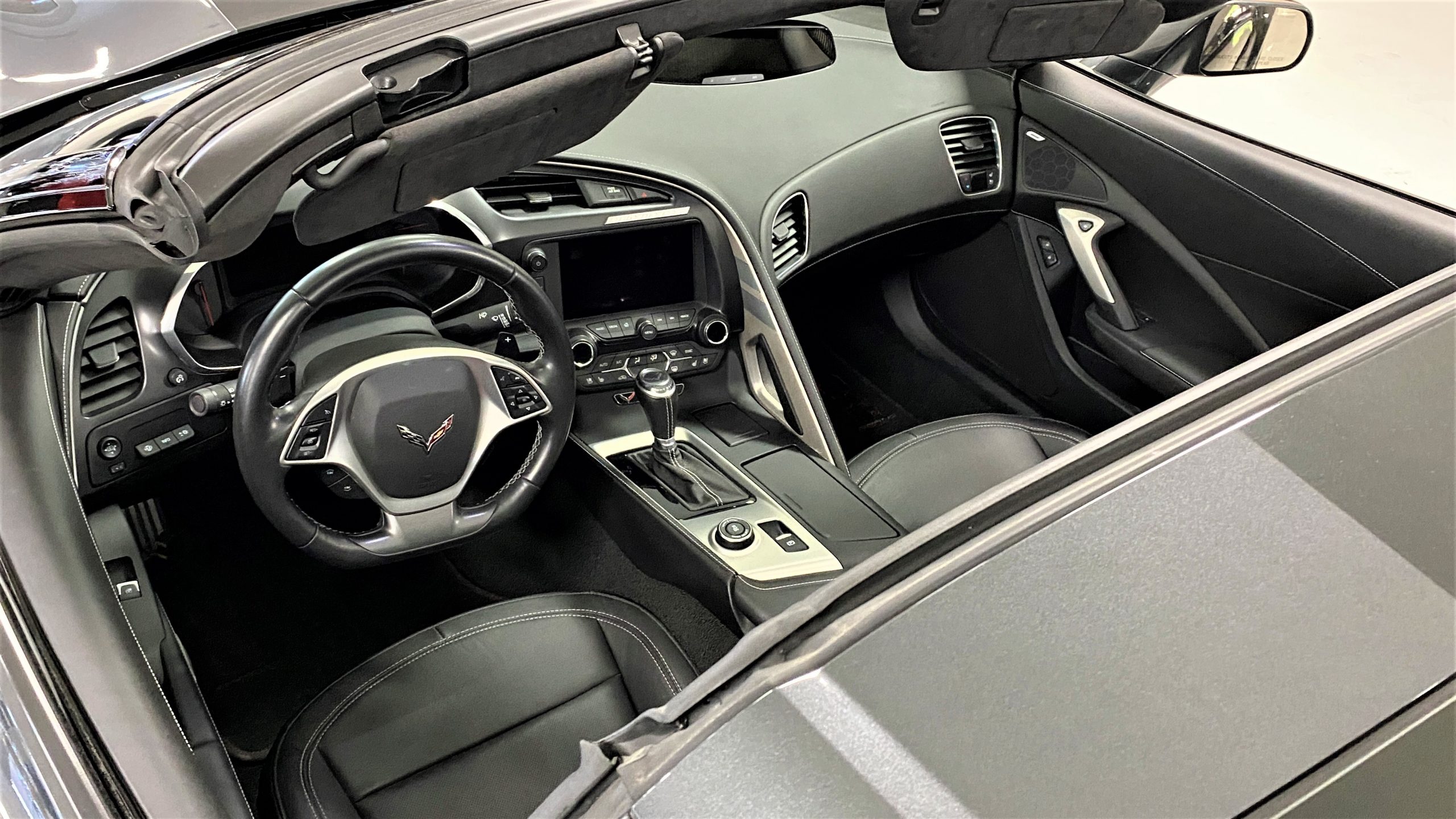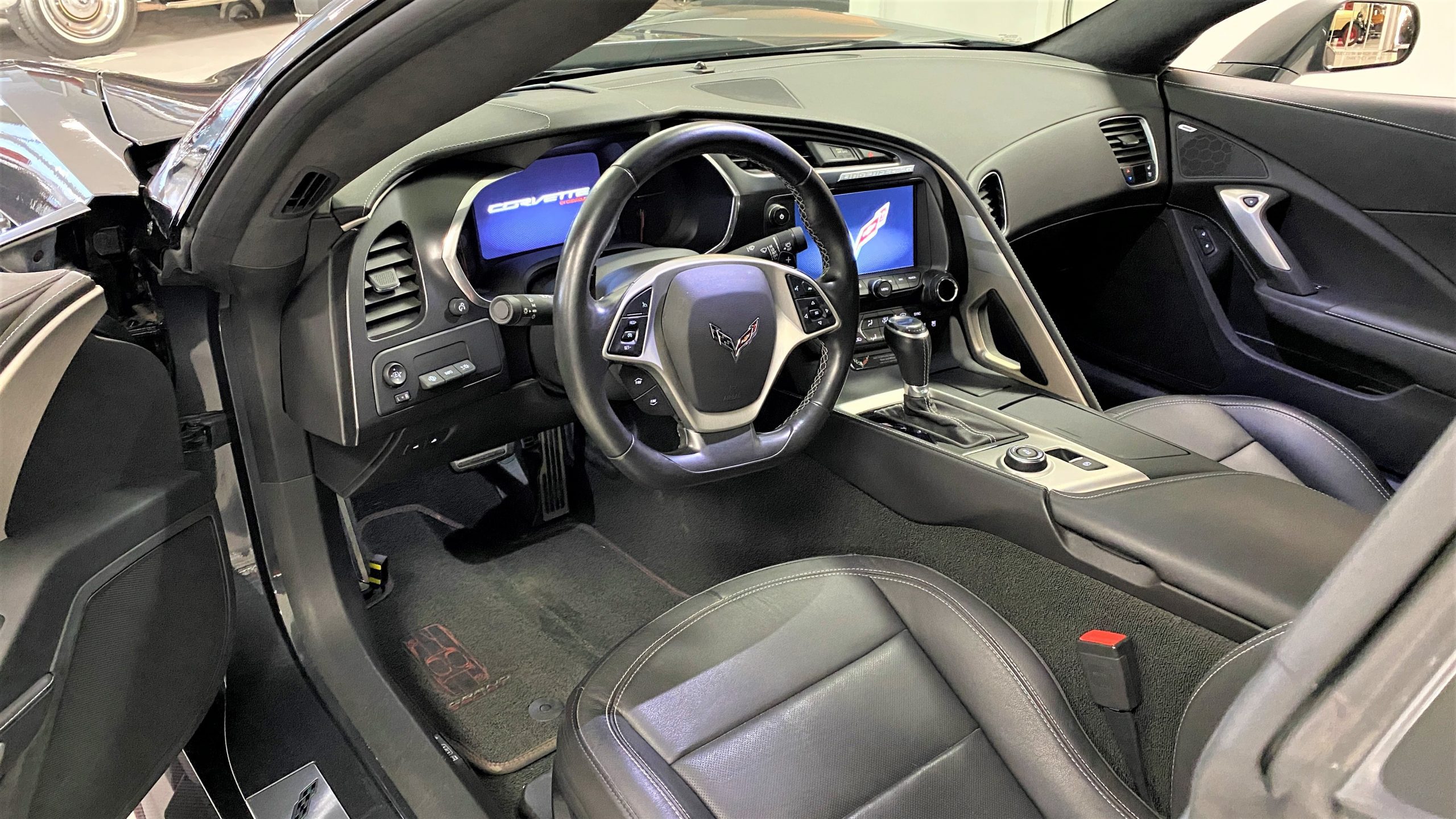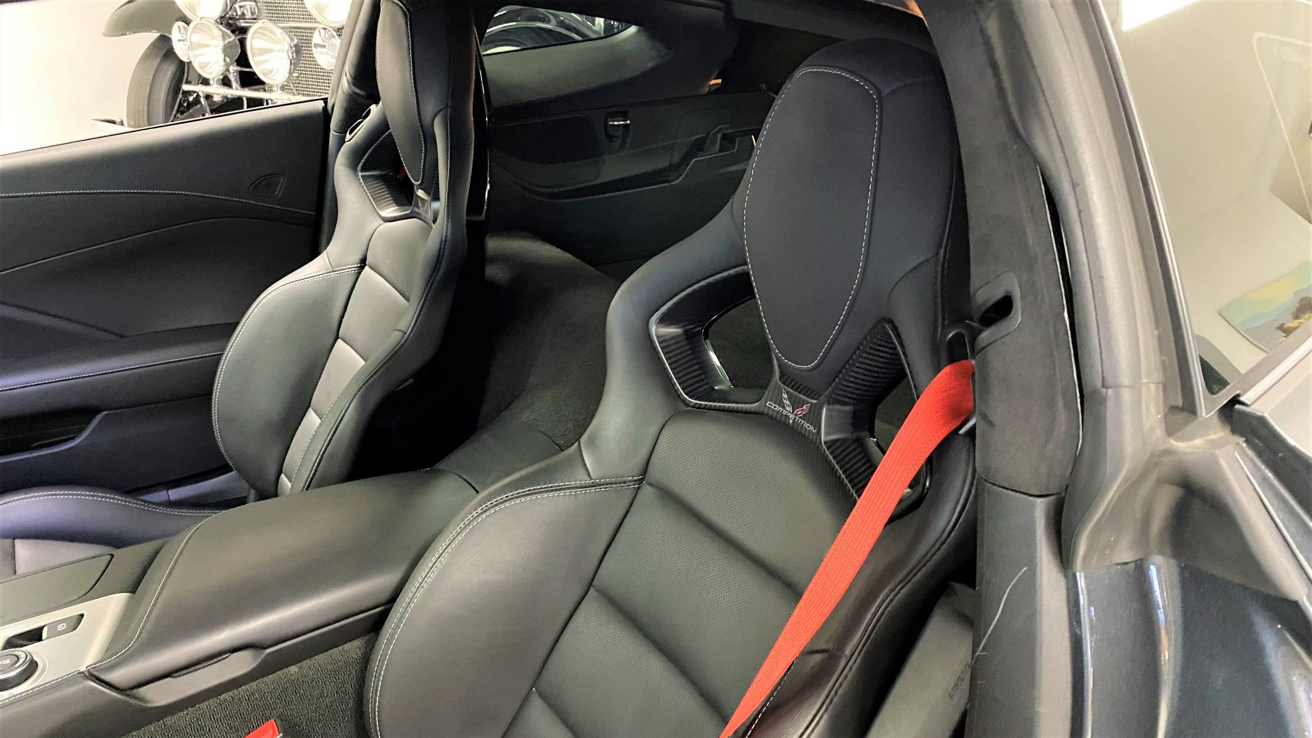 The optional Jet Black Napa leather perforated Competition Sport Seats ($1,995) offer thick bolstering and are contrasted with bright red seat belts, both designed to hold the occupants in place in any driving scenario.  The interior still has the new car smell and the leather still feels soft and supple, with no signs of wear.  Because this is a 3LT (the highest option for comfort and convenience offered on the Grand Sport), the occupants can enjoy heated and ventilated seats, a custom black leather wrapped dashboard, door panels and center console, and the black sueded microfiber upper trim package, among other welcome additions, detailed below. All of these options remain in showroom condition.