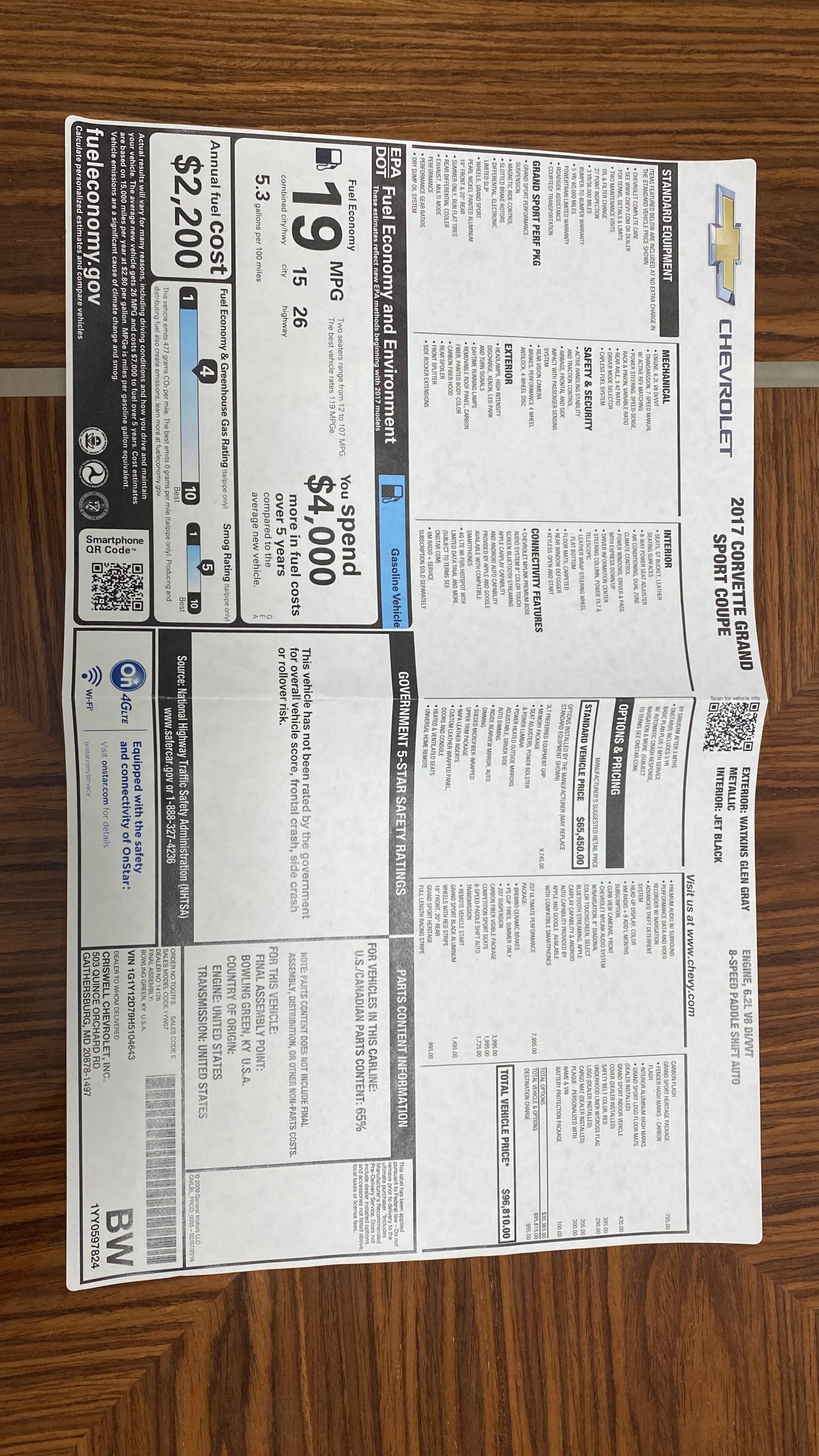 When we say that this Corvette is fully loaded, we aren’t just referring to the 3LT Equipment Group. Looking at the original window sticker, you’ll notice that this Grand Sport was also given the Z07 Performance Package. This was a $7,995 track-focused option package available only to the Grand Sport and Z06 Corvettes. Included in the Z07 Package are Brembo Carbon Ceramic brakes, Pilot Sport Cup Summer Tires, and the specially tuned Z07 Suspension. The current owner also added the aforementioned paint protection film, high quality window tints, and a K40 radar/laser detection and dispersion kit (with remote).